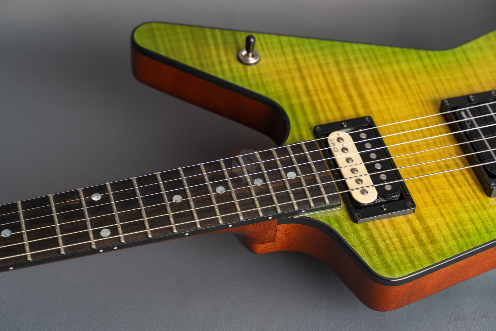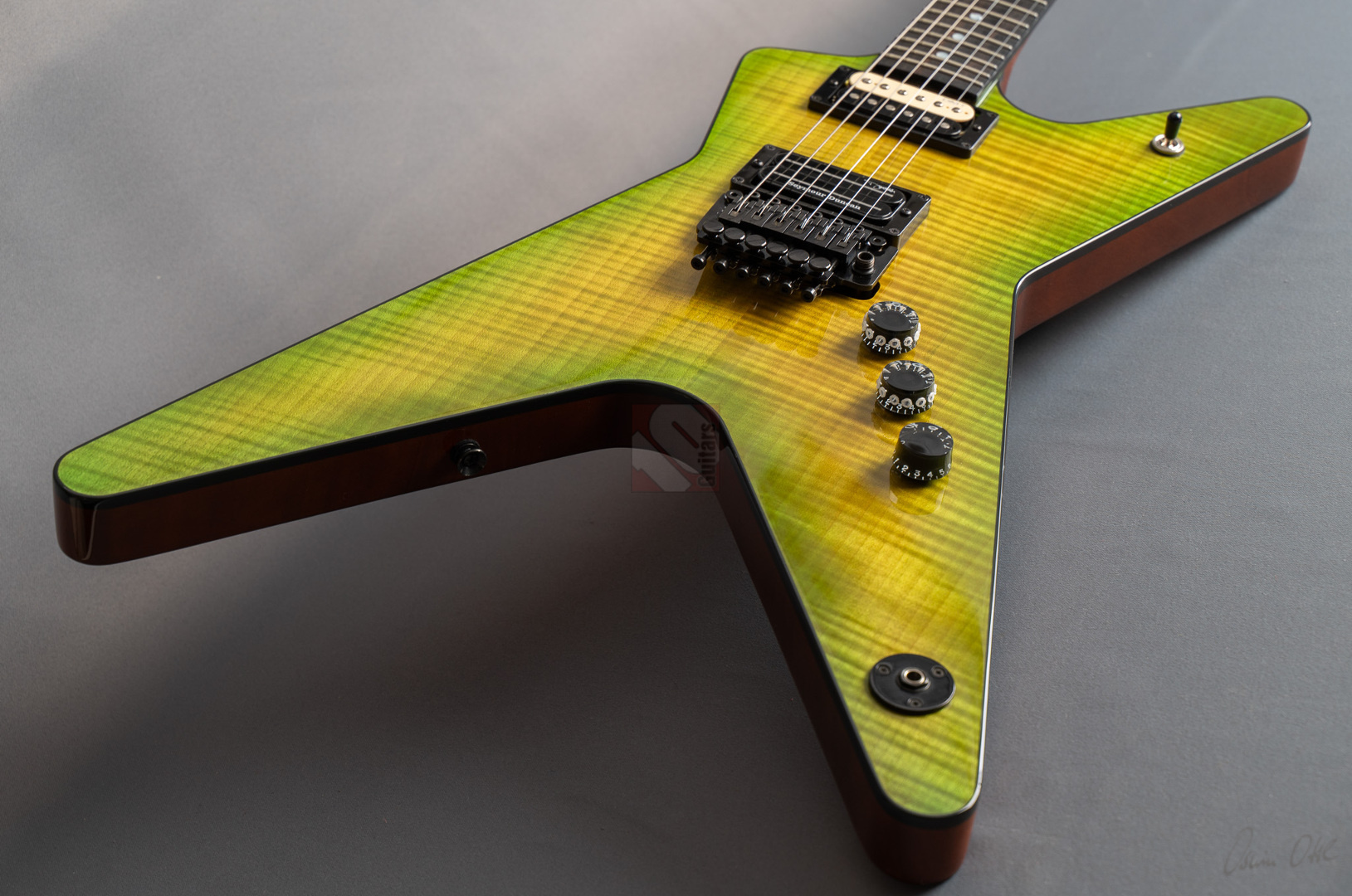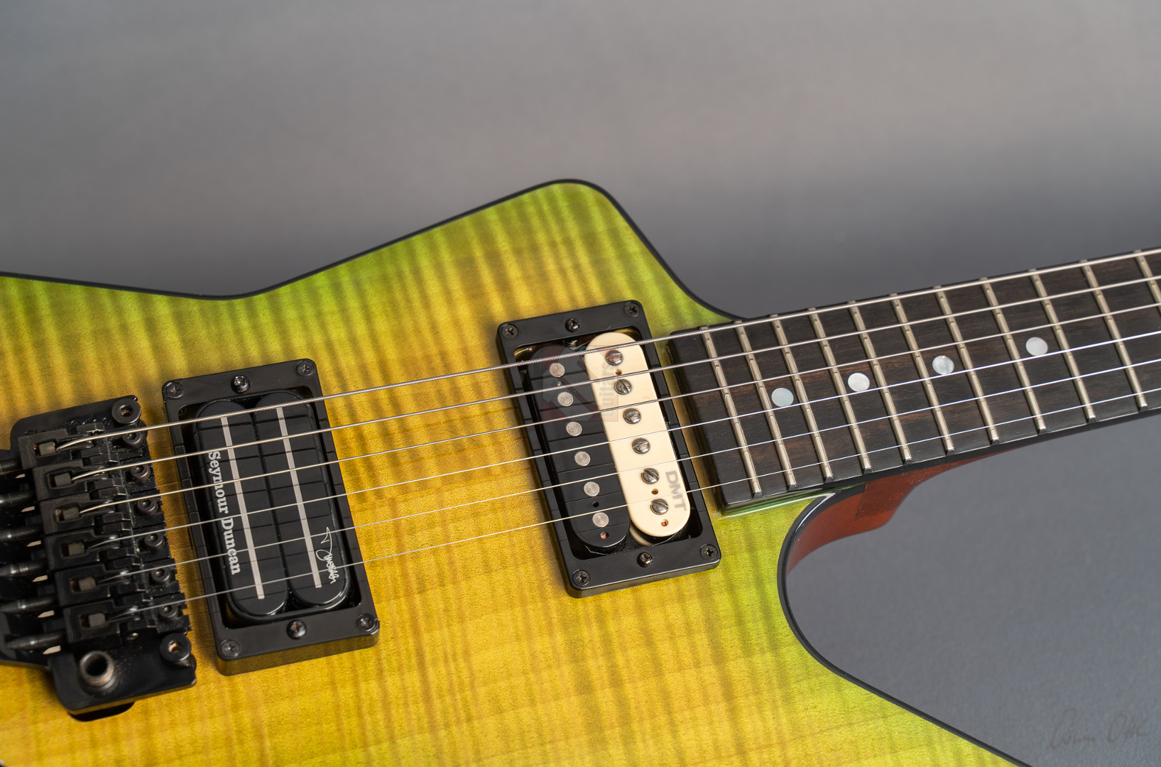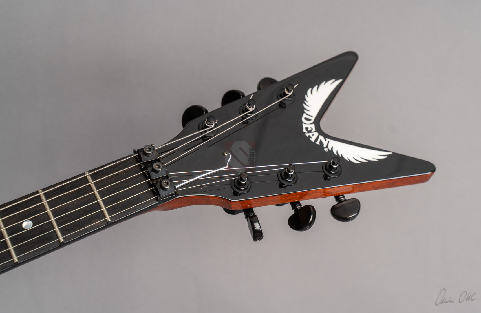 Die Dean USA Dime ML Dime Slime stellt eine Hommage an den legendären Pantera-Gitarristen Dimebag Darrell dar und fängt das Wesen und die rohe Kraft eines der meist verehrten Gitarristen des Heavy-Metal perfekt ein. Die aus hochwertigem Mahagoni gefertigte Gitarre verfügt dabei über einen eingeleimten Hals, der für richtig Sustain und Stabilität sorgt. Das unverwechselbare "Dime Slime"-Finish ist ein echter Hingucker und das edle Ebenholzgriffbrett mit traditionellen "Pearl Dot"-Inlays sorgt für ein geschmeidiges, schnelles Spielerlebnis, ergänzt durch ein erstklassiges und verstimmungsfreies Floyd-Rose-Tremolo. Somit bietet die Dime Slime für jeden Gitarrenspieler, der es härter braucht, alles, was man sich wünschen kann. Natürlich bekommt man hier mit einem "USA DMT DimeTime"-Pickup am Hals und einem Seymour Duncan "SH-13 Dimbucker" am Steg auch den messerscharfen Sound des Originals. Heftiger, leistungsstarker, kraftvoller Ton mit einem klaren und direkten Punch! Und durch die schnelle Ansprache der Tonabnehmer ist sie einfach ideal für Metal, Rock und insbesondere für ausgedehnte Soli geeignet. Das leichte V-Profil des Halses liegt hervorragend in der Hand und die bewährten Jumbo-Bünde liefern ordentlich Kontrolle beim Greifen, Sliden und bei Bendings. Optisch, haptisch und soundmäßig bekommt man hier den absoluten Metal-Traum und aufgrund der enormen Seltenheit dieser Gitarre, die wir Euch in Top-Zustand anbieten können, kann man sich darüber hinaus über allerbesten Werterhalt freuen.