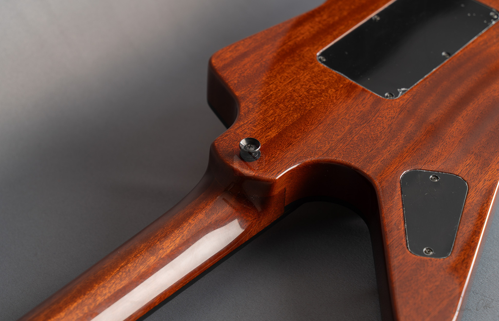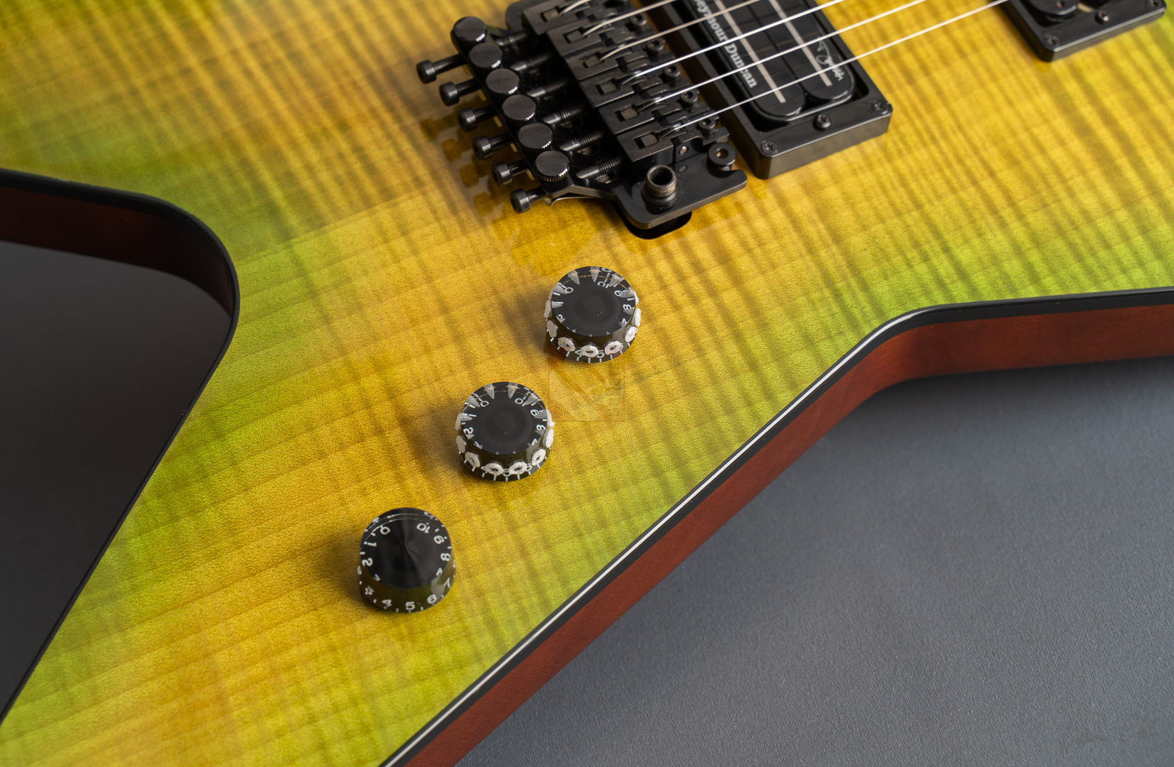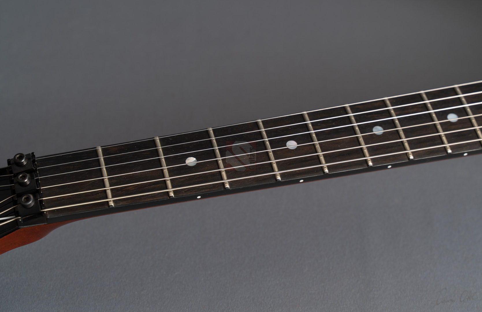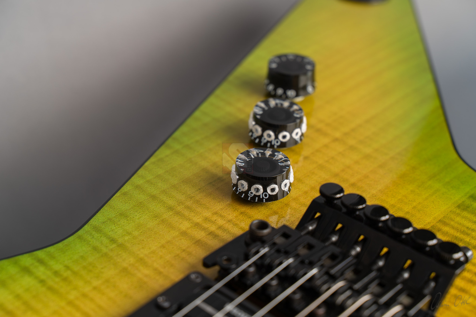 Die Dean USA Dime ML Dime Slime stellt eine Hommage an den legendären Pantera-Gitarristen Dimebag Darrell dar und fängt das Wesen und die rohe Kraft eines der meist verehrten Gitarristen des Heavy-Metal perfekt ein. Die aus hochwertigem Mahagoni gefertigte Gitarre verfügt dabei über einen eingeleimten Hals, der für richtig Sustain und Stabilität sorgt. Das unverwechselbare "Dime Slime"-Finish ist ein echter Hingucker und das edle Ebenholzgriffbrett mit traditionellen "Pearl Dot"-Inlays sorgt für ein geschmeidiges, schnelles Spielerlebnis, ergänzt durch ein erstklassiges und verstimmungsfreies Floyd-Rose-Tremolo. Somit bietet die Dime Slime für jeden Gitarrenspieler, der es härter braucht, alles, was man sich wünschen kann. Natürlich bekommt man hier mit einem "USA DMT DimeTime"-Pickup am Hals und einem Seymour Duncan "SH-13 Dimbucker" am Steg auch den messerscharfen Sound des Originals. Heftiger, leistungsstarker, kraftvoller Ton mit einem klaren und direkten Punch! Und durch die schnelle Ansprache der Tonabnehmer ist sie einfach ideal für Metal, Rock und insbesondere für ausgedehnte Soli geeignet. Das leichte V-Profil des Halses liegt hervorragend in der Hand und die bewährten Jumbo-Bünde liefern ordentlich Kontrolle beim Greifen, Sliden und bei Bendings. Optisch, haptisch und soundmäßig bekommt man hier den absoluten Metal-Traum und aufgrund der enormen Seltenheit dieser Gitarre, die wir Euch in Top-Zustand anbieten können, kann man sich darüber hinaus über allerbesten Werterhalt freuen.