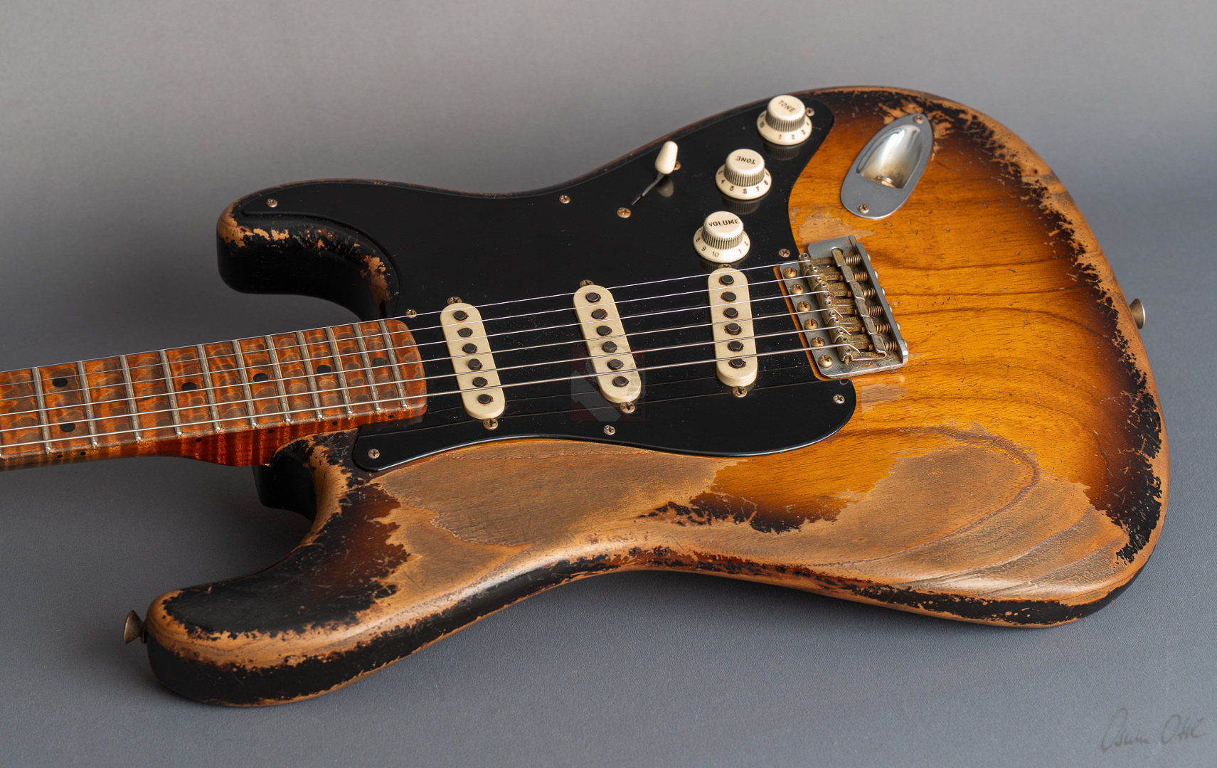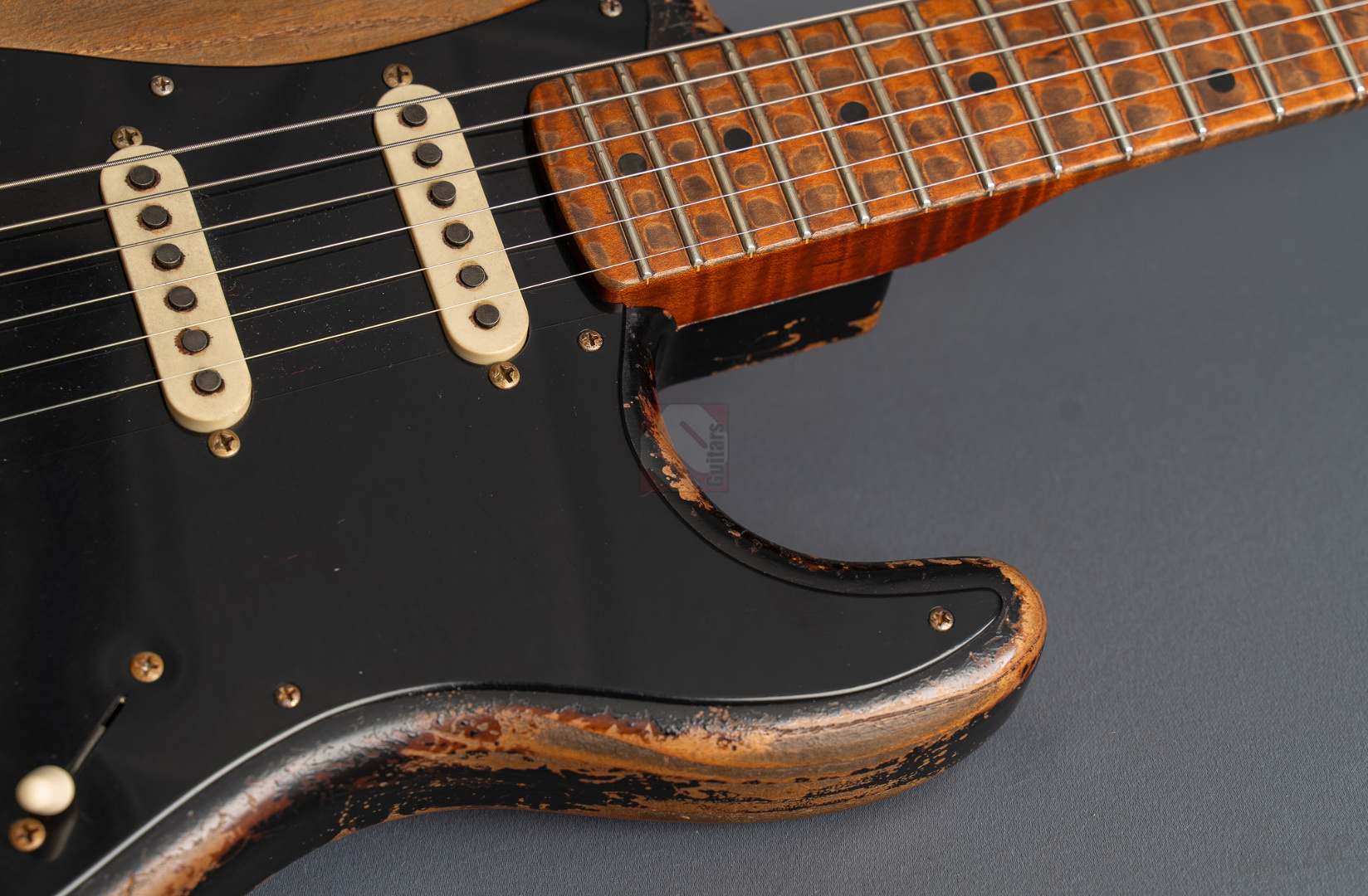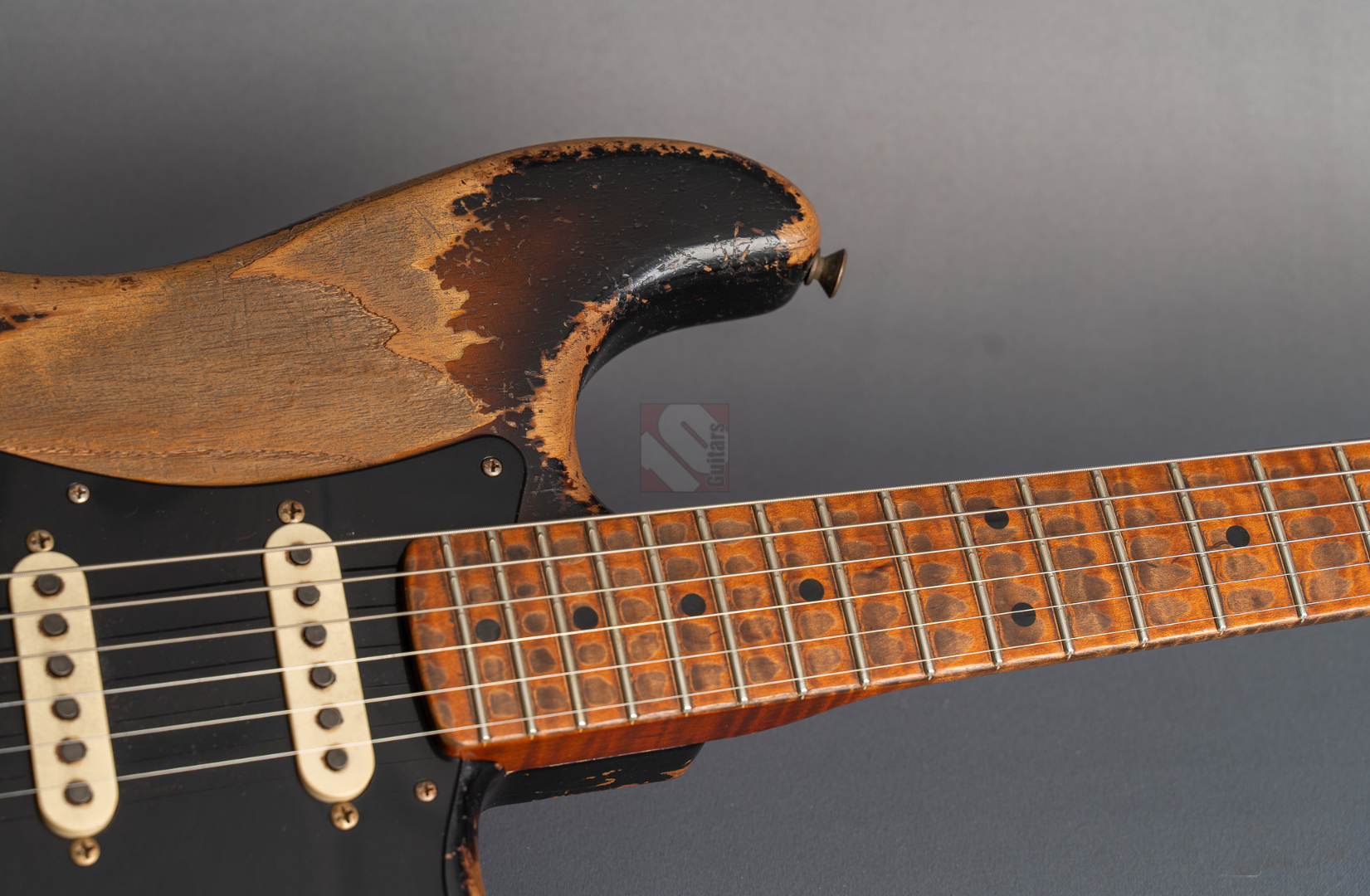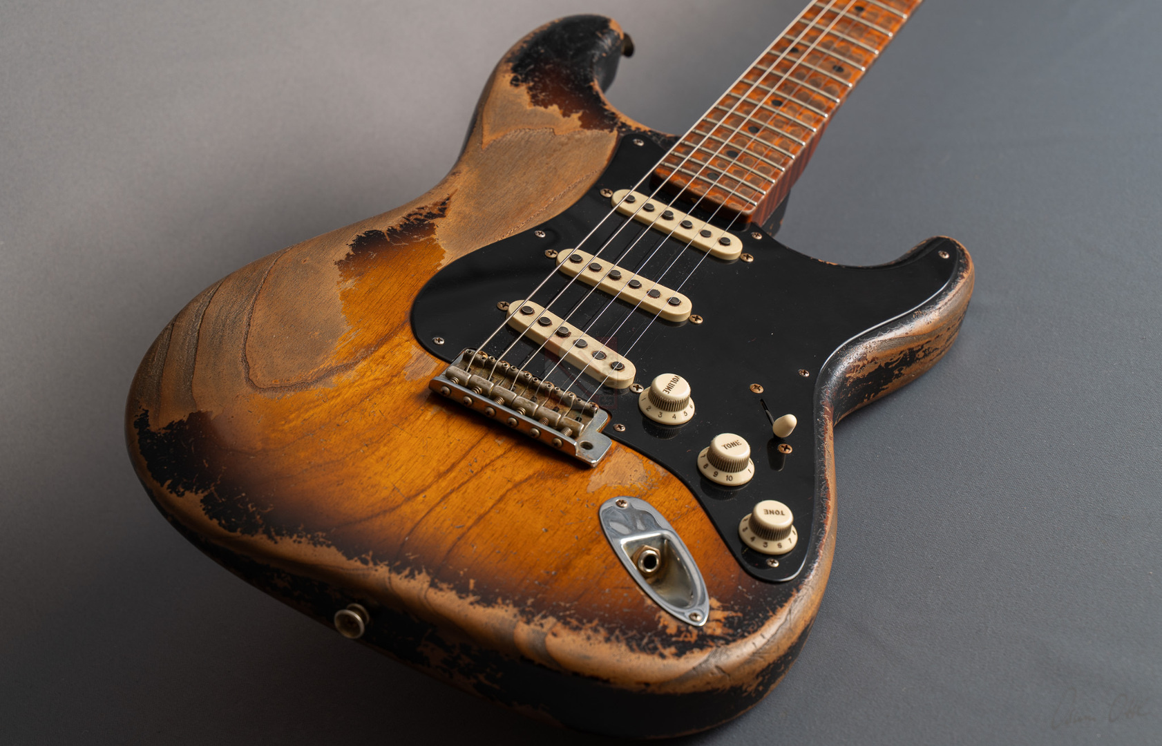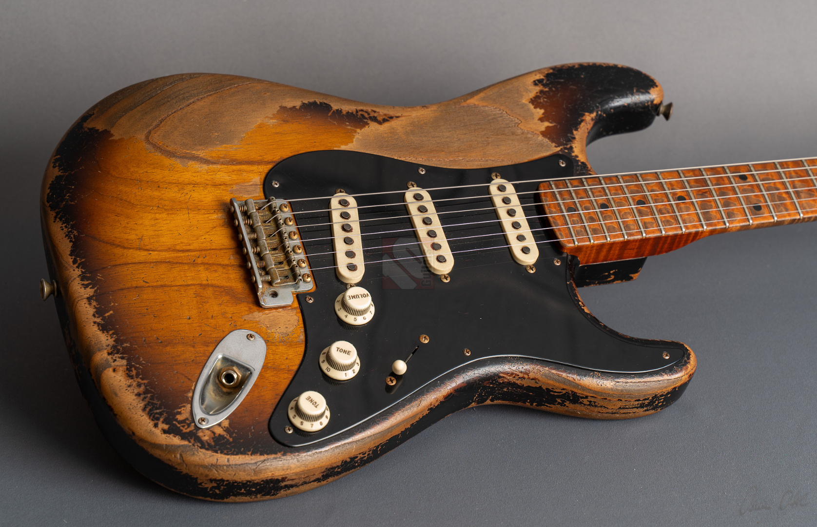 Was für eine unglaubliche Zahl hat uns hier die Waage angezeigt: eine Tremolo-Strat mit lediglich 2970 Gramm! Da war es natürlich kein Wunder, das hier Masterbuilder Dale Wilson seine Expertenfinger im Spiel hat. Wenn es um die Selektion optimaler Hölzer und die perfekte Abstimmung von Holz und Elektronik geht, dann ist Dale sicherlich einer der Besten! Es handelt sich hier um ein ganz besonderes Highlite für alle Freunde der klassischen 50er Mapleneck-Strats: eine '55 Heavy-Relic-Strat mit super glockigen "Handwound 55"-Pickups, enorm leichtem "Roasted Ash"-Korpus, Killer-Look und dem für Dale Wilson typischen, authentischen Aging in äußerst gelungenem "2-Tone Sunburst". Toller, etwas kräftigerer "57 Style Soft V"-Neck, moderner 9,5''-Griffbrettradius und die schnellen Medium/Jumbo-Bünde. Das Resultat sind perfekte Playereigenschaften, der Hals liegt großartig in der Hand und spielt sich in Verbindung mit genanntem Traumgewicht fantastisch. Schon trocken angespielt kann man sich an der sagenhaften Resonanz erfreuen.. Am Amp kommen dann die "Handwound 55s" zum Einsatz mit ihren hölzernen, perligen und glockigen Tönen. Wunderbar ausgewogen mit ausreichend Mitten! Genauso muß eine spitzenmäßige 50er Strat klingen! Besonders gelungen sind auch die Zwischenstellungen, super Bell-Tone. Hier zeigt Dale Wilson mal wieder ganz deutlich, warum man auf seine Instrumente mittlerweile mehr als zehn Jahre warten muss und seine Order-Books randvoll sind. Dieses Prachtstück, an dem wirklich jedes optische, haptische und tonale Detail große Freude bereitet, können wir Euch in Top-Zustand anbieten.