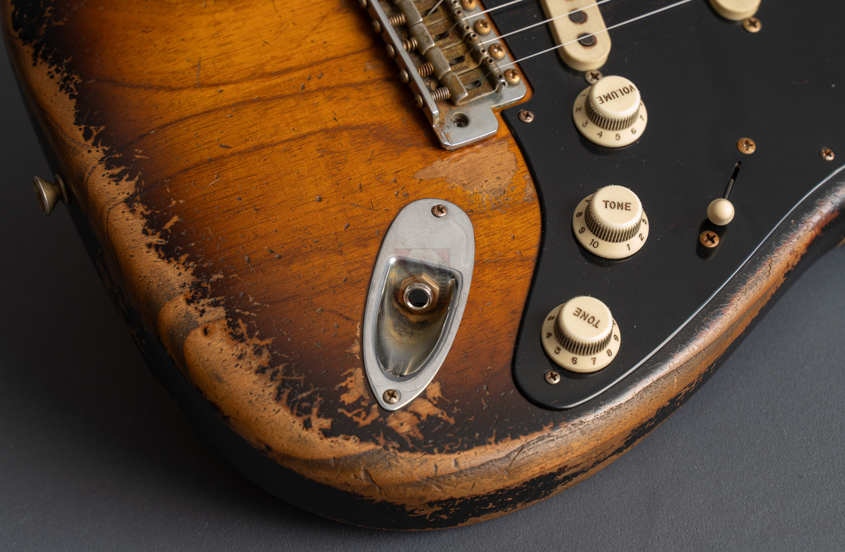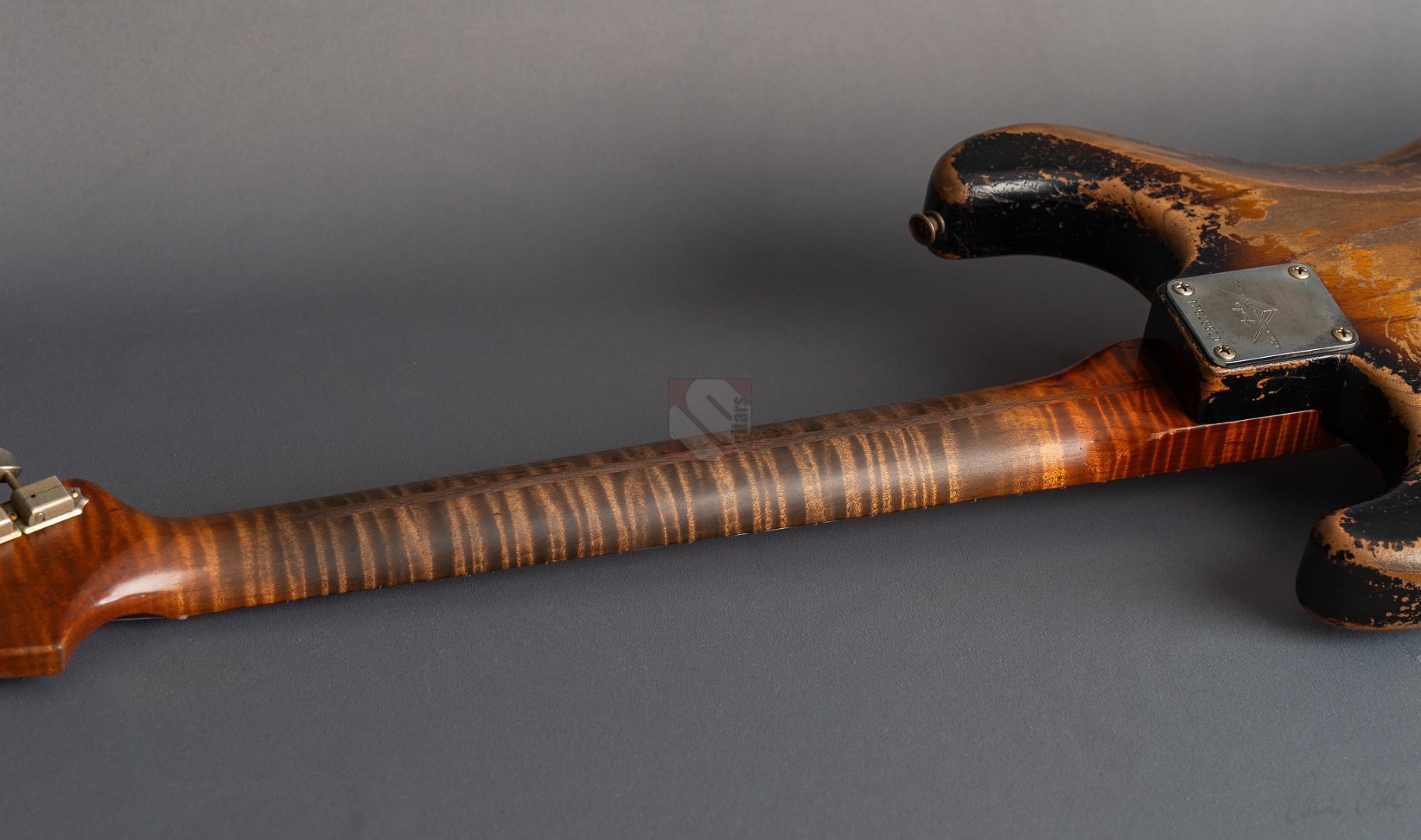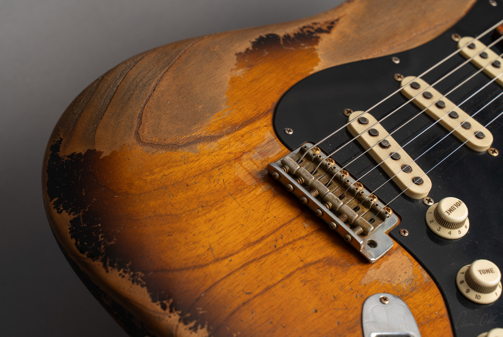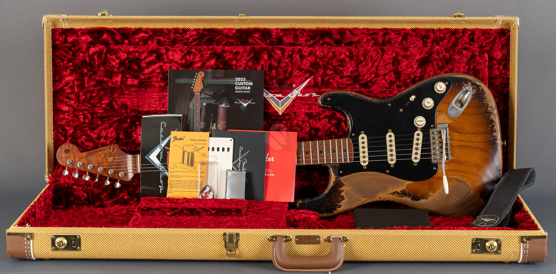 Was für eine unglaubliche Zahl hat uns hier die Waage angezeigt: eine Tremolo-Strat mit lediglich 2970 Gramm! Da war es natürlich kein Wunder, das hier Masterbuilder Dale Wilson seine Expertenfinger im Spiel hat. Wenn es um die Selektion optimaler Hölzer und die perfekte Abstimmung von Holz und Elektronik geht, dann ist Dale sicherlich einer der Besten! Es handelt sich hier um ein ganz besonderes Highlite für alle Freunde der klassischen 50er Mapleneck-Strats: eine '55 Heavy-Relic-Strat mit super glockigen "Handwound 55"-Pickups, enorm leichtem "Roasted Ash"-Korpus, Killer-Look und dem für Dale Wilson typischen, authentischen Aging in äußerst gelungenem "2-Tone Sunburst". Toller, etwas kräftigerer "57 Style Soft V"-Neck, moderner 9,5''-Griffbrettradius und die schnellen Medium/Jumbo-Bünde. Das Resultat sind perfekte Playereigenschaften, der Hals liegt großartig in der Hand und spielt sich in Verbindung mit genanntem Traumgewicht fantastisch. Schon trocken angespielt kann man sich an der sagenhaften Resonanz erfreuen.. Am Amp kommen dann die "Handwound 55s" zum Einsatz mit ihren hölzernen, perligen und glockigen Tönen. Wunderbar ausgewogen mit ausreichend Mitten! Genauso muß eine spitzenmäßige 50er Strat klingen! Besonders gelungen sind auch die Zwischenstellungen, super Bell-Tone. Hier zeigt Dale Wilson mal wieder ganz deutlich, warum man auf seine Instrumente mittlerweile mehr als zehn Jahre warten muss und seine Order-Books randvoll sind. Dieses Prachtstück, an dem wirklich jedes optische, haptische und tonale Detail große Freude bereitet, können wir Euch in Top-Zustand anbieten.