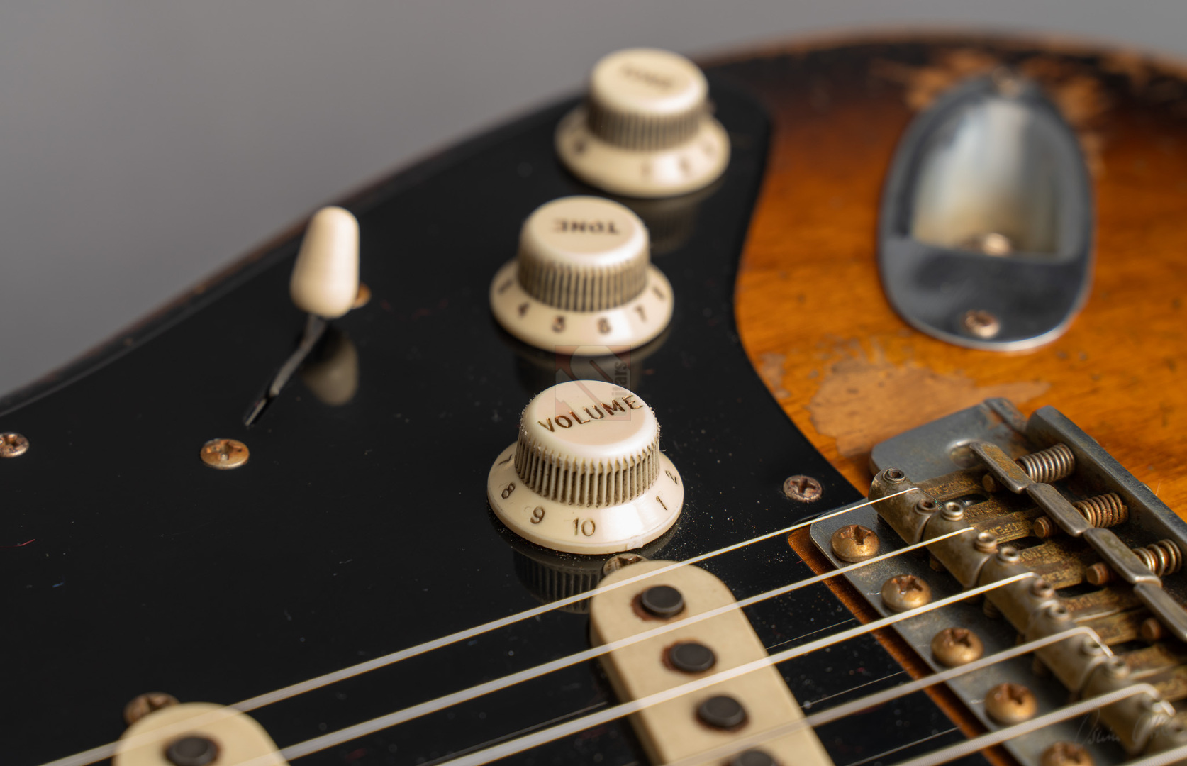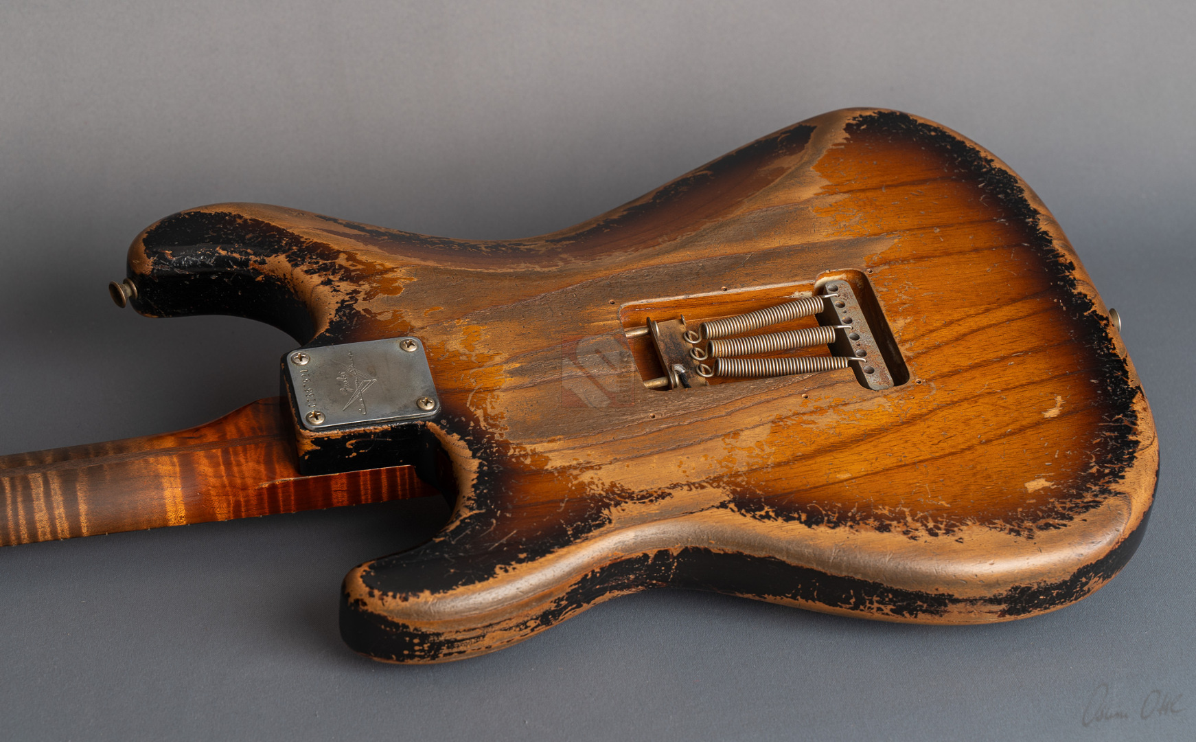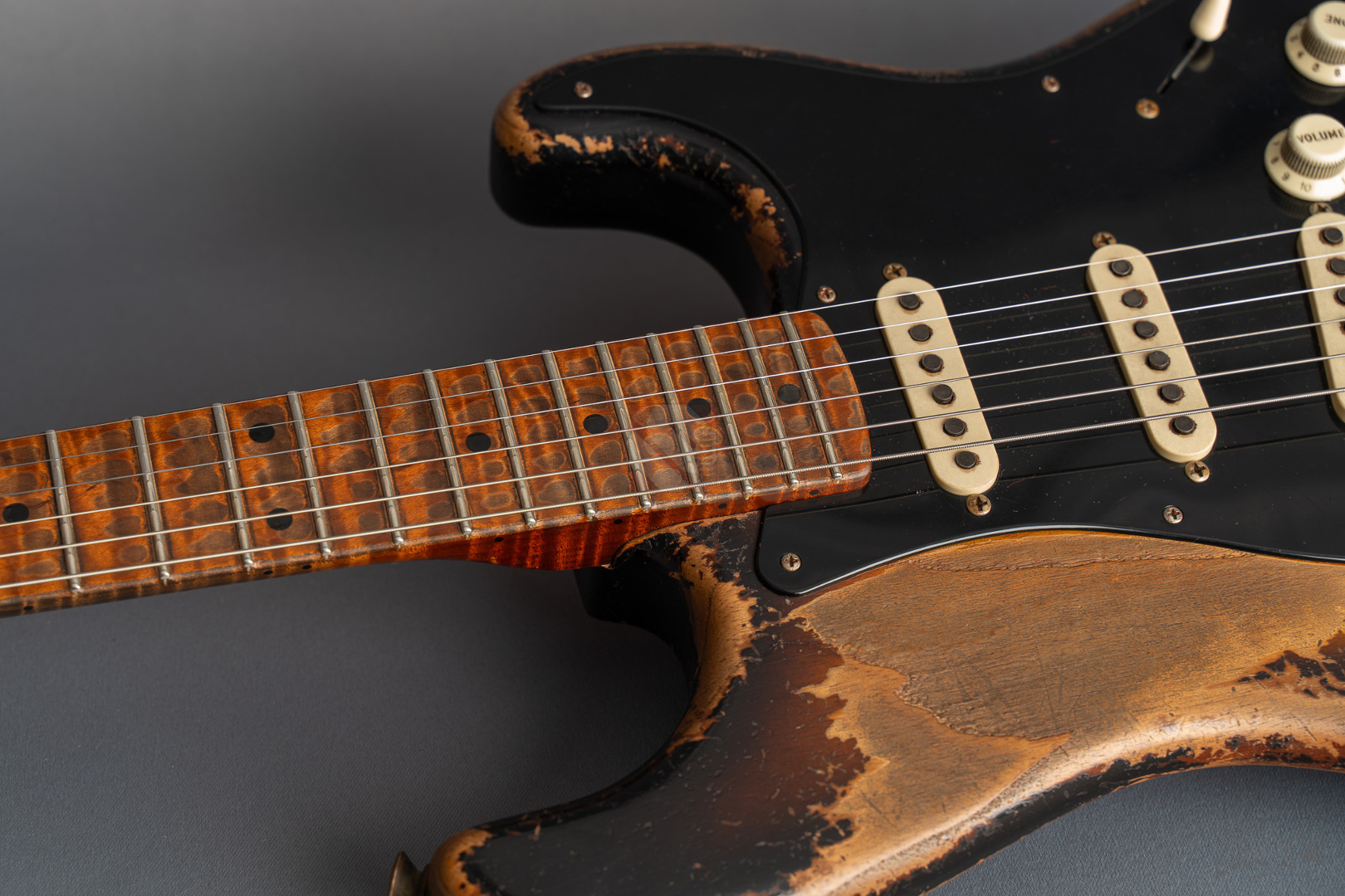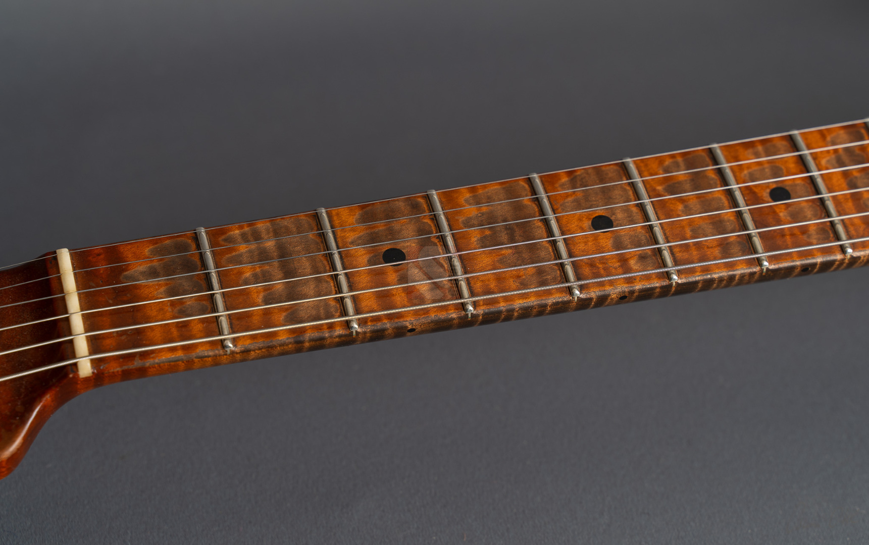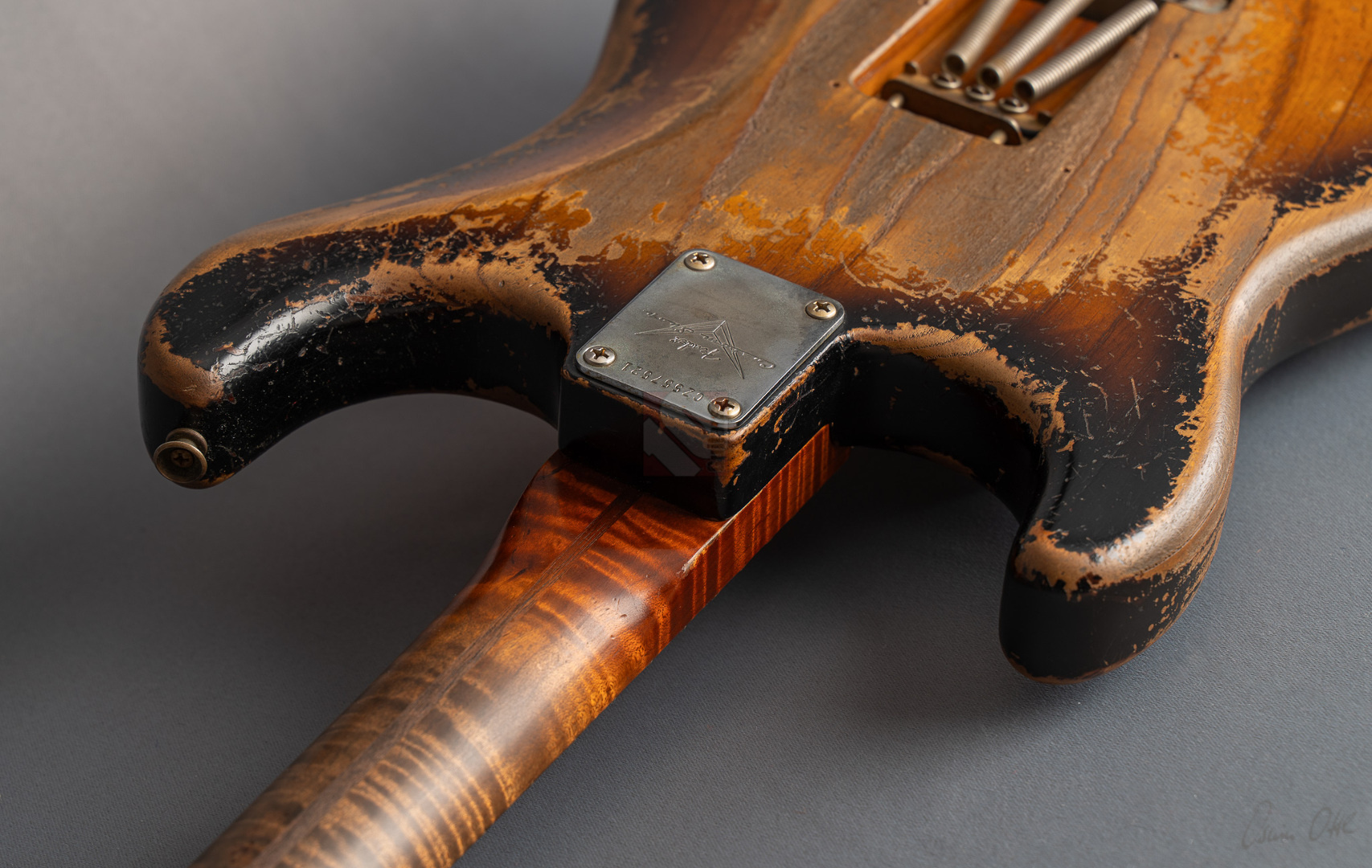Was für eine unglaubliche Zahl hat uns hier die Waage angezeigt: eine Tremolo-Strat mit lediglich 2970 Gramm! Da war es natürlich kein Wunder, das hier Masterbuilder Dale Wilson seine Expertenfinger im Spiel hat. Wenn es um die Selektion optimaler Hölzer und die perfekte Abstimmung von Holz und Elektronik geht, dann ist Dale sicherlich einer der Besten! Es handelt sich hier um ein ganz besonderes Highlite für alle Freunde der klassischen 50er Mapleneck-Strats: eine '55 Heavy-Relic-Strat mit super glockigen "Handwound 55"-Pickups, enorm leichtem "Roasted Ash"-Korpus, Killer-Look und dem für Dale Wilson typischen, authentischen Aging in äußerst gelungenem "2-Tone Sunburst". Toller, etwas kräftigerer "57 Style Soft V"-Neck, moderner 9,5''-Griffbrettradius und die schnellen Medium/Jumbo-Bünde. Das Resultat sind perfekte Playereigenschaften, der Hals liegt großartig in der Hand und spielt sich in Verbindung mit genanntem Traumgewicht fantastisch. Schon trocken angespielt kann man sich an der sagenhaften Resonanz erfreuen.. Am Amp kommen dann die "Handwound 55s" zum Einsatz mit ihren hölzernen, perligen und glockigen Tönen. Wunderbar ausgewogen mit ausreichend Mitten! Genauso muß eine spitzenmäßige 50er Strat klingen! Besonders gelungen sind auch die Zwischenstellungen, super Bell-Tone. Hier zeigt Dale Wilson mal wieder ganz deutlich, warum man auf seine Instrumente mittlerweile mehr als zehn Jahre warten muss und seine Order-Books randvoll sind. Dieses Prachtstück, an dem wirklich jedes optische, haptische und tonale Detail große Freude bereitet, können wir Euch in Top-Zustand anbieten.