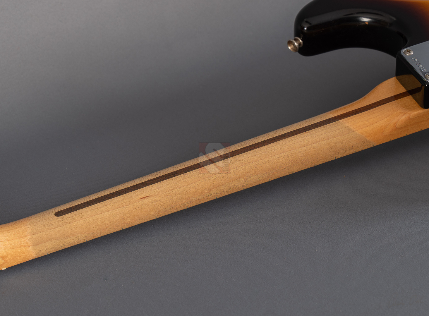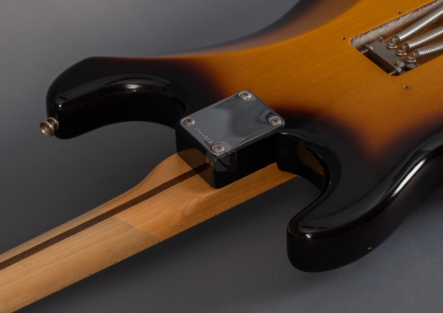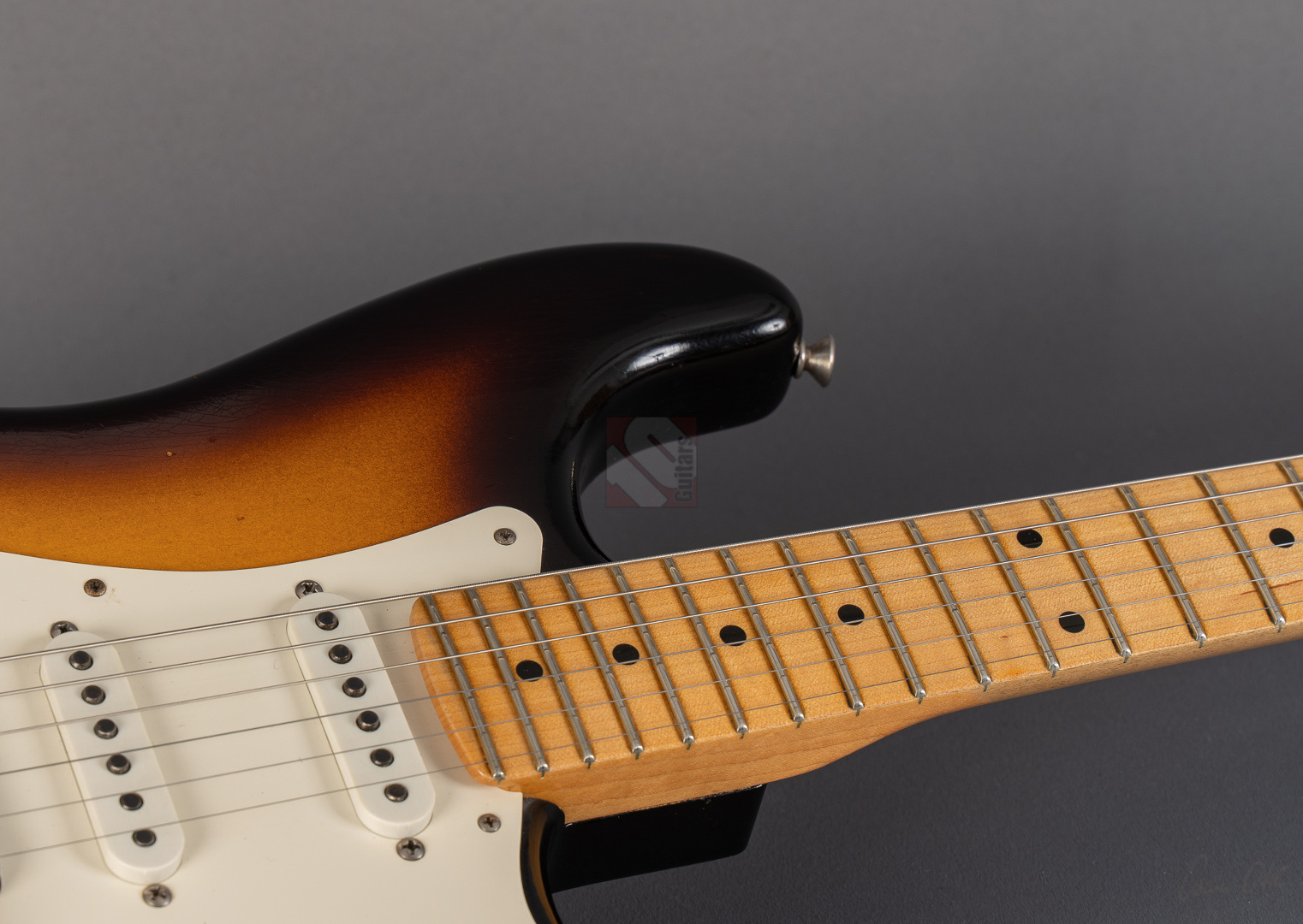 Wer eine soundmächtige Super-Strat sucht, bei der die wirklich geilsten Upgrades vorgenommen wurden, wird an dieser Gitarre definitiv nicht vorbeikommen. Bei der vorliegenden 59er Stratocaster HSS Journeyman wurde das Konzept einer "Hot Rod Super Strat" konsequent durchgezogen, aber eben mit äußerst exklusiven Upgrades, die der Vorbesitzer vorgenommen hat. Werkseitig wurde hier der Quartersawn-Mapleneck mit einem modernen 9,5-12''-Compound-Radius versehen und spielt sich in Verbindung mit dem komfortablen "10/56 V"-Profil und den perfekt abgerichteten 6100-Jumbo-Bünden super flitzig. Darüber hinaus hat man es mit einer "2-Tone Sunburst"-Beauty zu tun, deren subtiles Journeyman-Relicing einen enorm authentischen Look zur Folge hat. Soundmäßig trifft man hier auf eine famose Kombination der besten Pickups aus dem Hause Kloppmann, bestehend aus zwei "Real 65 Strat"-Singlecoils am Hals und in der Mitte sowie einem "F-Spaced Errorhead"-Humbucker an der Bridgemit einem Gesamtwert von EUR 645,-. Allerdings wurden hier nicht lediglich einzelne Tonabnehmer getauscht, sondern vielmehr wurde das gesamte Pickguard samt allen Tonabnehmer und der Elektronik von Kloppmann fachmännisch vormontiert und in Gänze ausgewechselt (Originalteile nicht beiliegend). Die "Real 65 Strats" klingen vergleichsweise etwas fetter im Grundton, keinesfalls höhenlastig mit einer enormen Glockigkeit, und der "Errorhead" liefert erwartungsgemäß satte Rockbretter sowie singende Leadsounds mit ausreichend Sustain. Von klassischem Heavy-Rock über Blues bis hin zu puren Clean-Sounds, alles wird hier in allerbester Manier geliefert. Tonvielfalt par excellence! Und egal in welcher Stellung, ...die Kloppmanss überzeugen immer zu 100%: von glasig, perlig und klar bis hin zu warm, fett und bluesig-rockig! So freuen wir uns, Euch dieses perfekte Allround-Instrument bis auf minimale Spiel- und Gebrauchsspuren in Top-Zustand anbieten zu können.