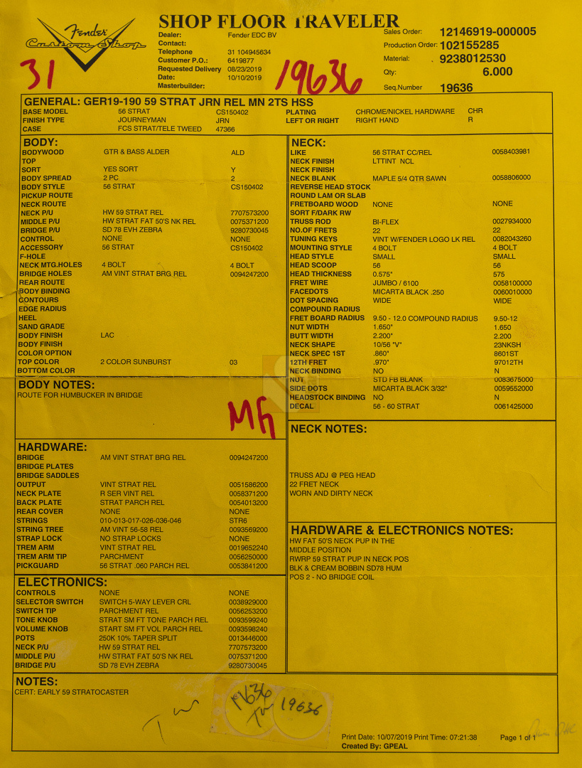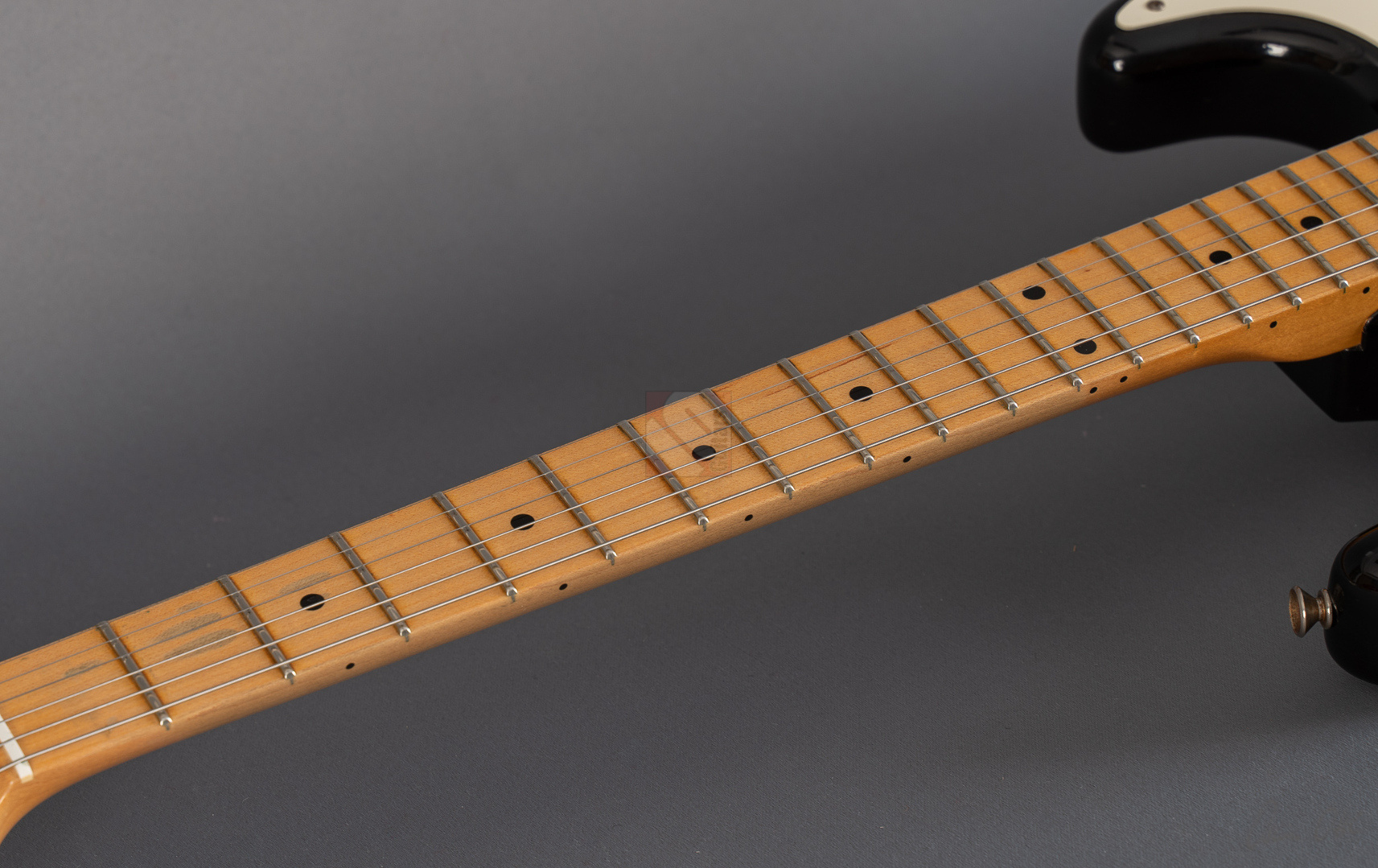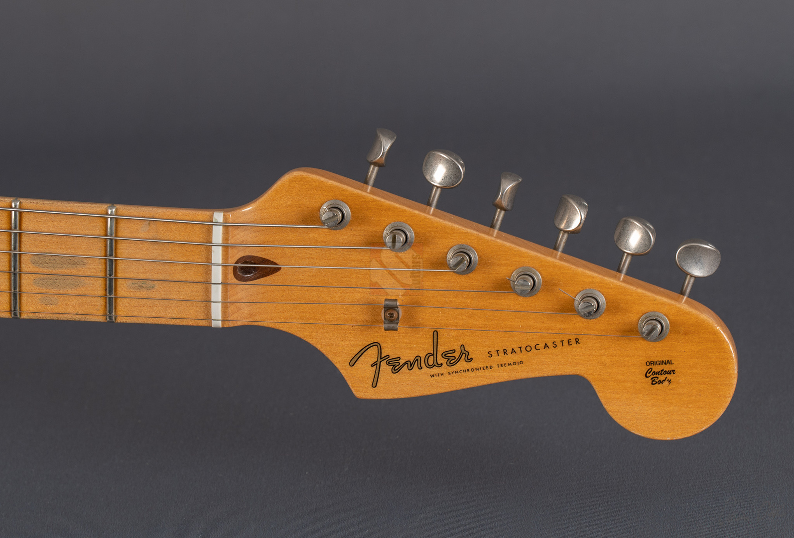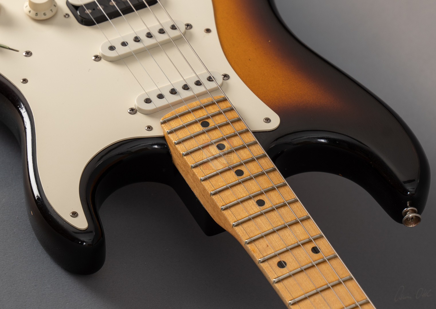 Wer eine soundmächtige Super-Strat sucht, bei der die wirklich geilsten Upgrades vorgenommen wurden, wird an dieser Gitarre definitiv nicht vorbeikommen. Bei der vorliegenden 59er Stratocaster HSS Journeyman wurde das Konzept einer "Hot Rod Super Strat" konsequent durchgezogen, aber eben mit äußerst exklusiven Upgrades, die der Vorbesitzer vorgenommen hat. Werkseitig wurde hier der Quartersawn-Mapleneck mit einem modernen 9,5-12''-Compound-Radius versehen und spielt sich in Verbindung mit dem komfortablen "10/56 V"-Profil und den perfekt abgerichteten 6100-Jumbo-Bünden super flitzig. Darüber hinaus hat man es mit einer "2-Tone Sunburst"-Beauty zu tun, deren subtiles Journeyman-Relicing einen enorm authentischen Look zur Folge hat. Soundmäßig trifft man hier auf eine famose Kombination der besten Pickups aus dem Hause Kloppmann, bestehend aus zwei "Real 65 Strat"-Singlecoils am Hals und in der Mitte sowie einem "F-Spaced Errorhead"-Humbucker an der Bridgemit einem Gesamtwert von EUR 645,-. Allerdings wurden hier nicht lediglich einzelne Tonabnehmer getauscht, sondern vielmehr wurde das gesamte Pickguard samt allen Tonabnehmer und der Elektronik von Kloppmann fachmännisch vormontiert und in Gänze ausgewechselt (Originalteile nicht beiliegend). Die "Real 65 Strats" klingen vergleichsweise etwas fetter im Grundton, keinesfalls höhenlastig mit einer enormen Glockigkeit, und der "Errorhead" liefert erwartungsgemäß satte Rockbretter sowie singende Leadsounds mit ausreichend Sustain. Von klassischem Heavy-Rock über Blues bis hin zu puren Clean-Sounds, alles wird hier in allerbester Manier geliefert. Tonvielfalt par excellence! Und egal in welcher Stellung, ...die Kloppmanss überzeugen immer zu 100%: von glasig, perlig und klar bis hin zu warm, fett und bluesig-rockig! So freuen wir uns, Euch dieses perfekte Allround-Instrument bis auf minimale Spiel- und Gebrauchsspuren in Top-Zustand anbieten zu können.