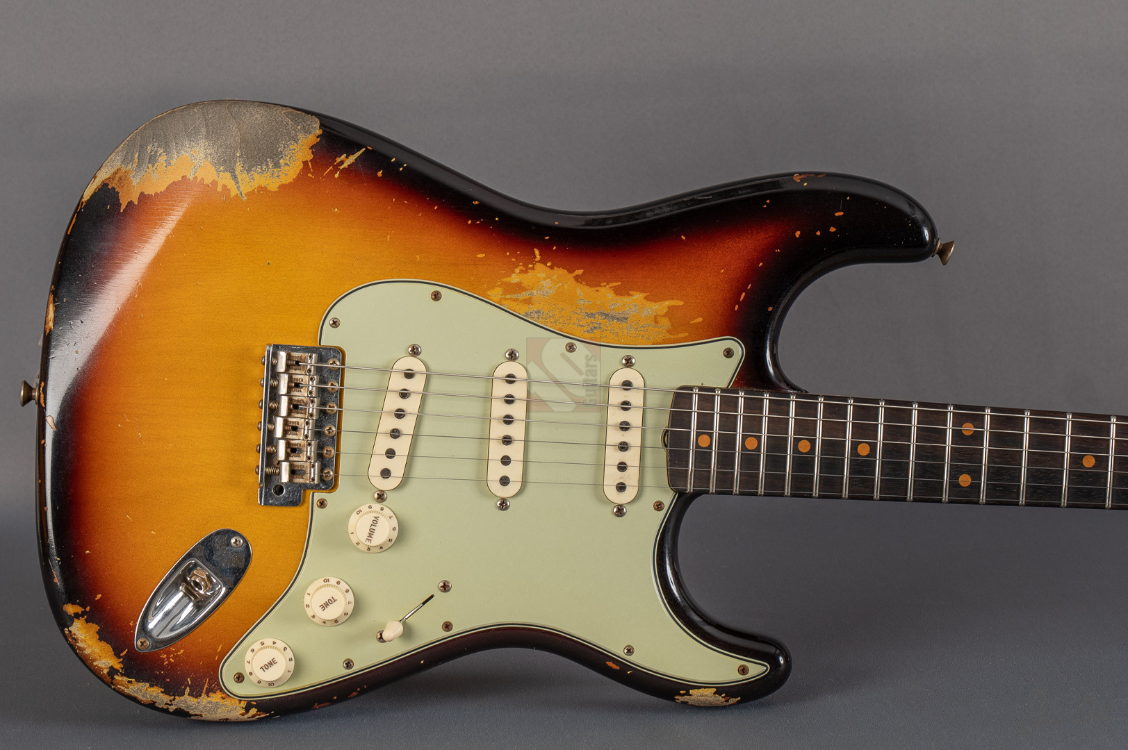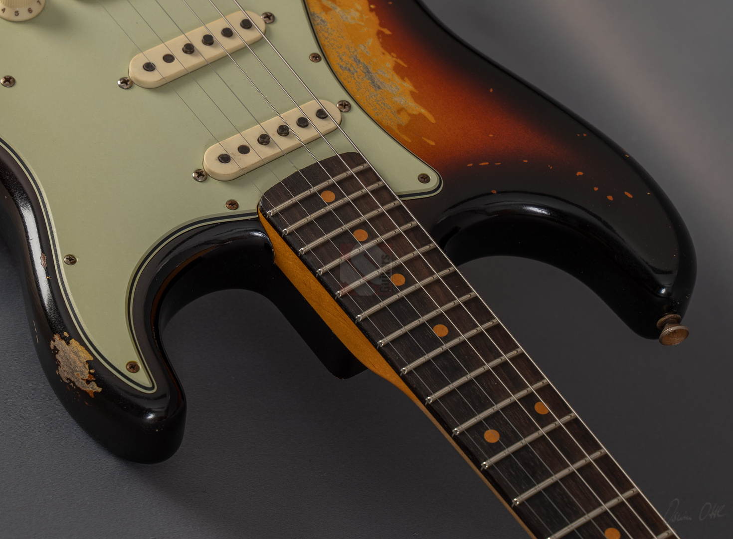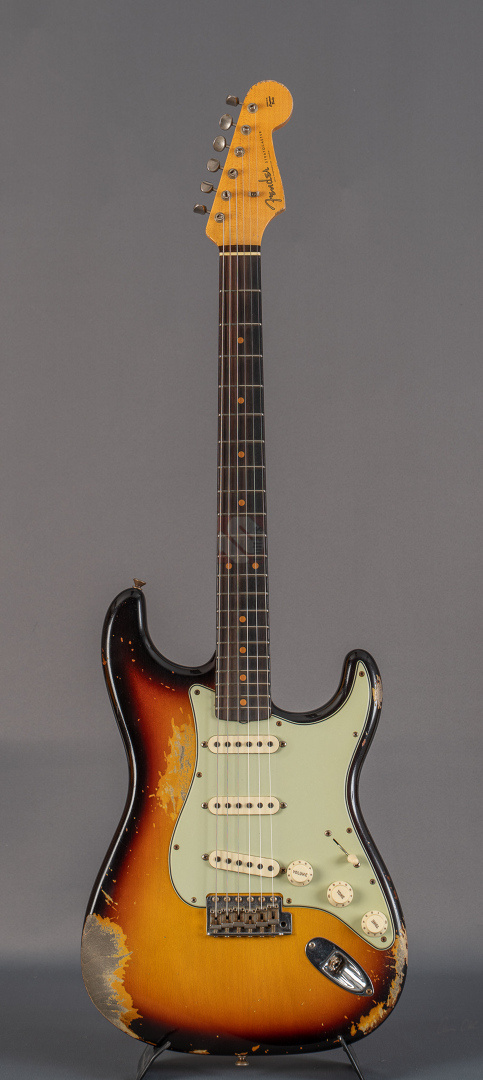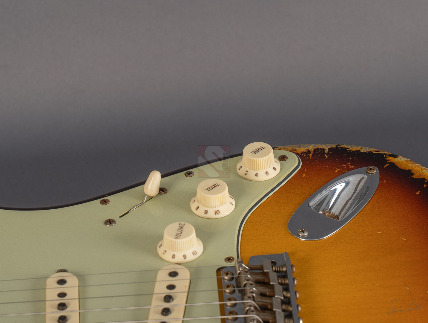 Hier haben wir wieder einmal eine absolute Granaten-Strat für alle, die ein geiles Sunburst, ein etwas stärkeres Aging und einen absoluten Spitzensound schätzen. Das tolle Heavy-Relicing zeigt sich hier in Form von unzähligen Haarrissen, vielfältigen Macken und lackfreien Bereichen an den signifikanten Stellen. Das Finish in "Faded/Aged 3-Tone Sunburst" ist wunderbar verwittert mit einer super authentischen Vintage-Patina. Passend dazu das tiefdunkle Palisandergriffbrett und das äragerechte Greenguard, wodurch man natürlich sofort an John Frusciantes Lieblingsgitarre erinnert wird. Und auch klanglich kann diese Stratocaster voll und ganz überzeugen. Die drei "Handwound Texas Special"-Pickups liefern in Verbindung mit dem grandiosen Schwingungsverhalten der Gitarre einen absoluten Spitzensound. Schmatzende, glockig-rockige Klänge á la Stevie Ray Vaughan oder Philip Sayce, super dynamisch, klasse Resonanz, schön perlig und strahlend mit genügend Wärme und Offenheit. Hier will man wirklich jeden Ton auskosten! Der Hals weist mit seinem "60 Style C"-Profil, 9,5"-Griffbrettradius und den beliebten Narrow/Tall-Bünden beste Player-Spezifikationen auf, sodass auch in Sachen Spielkomfort keinerlei Wünsche offen bleiben. Mit dieser Gitarre, die wir Euch in Top-Zustand anbieten können, bekommt man ein Spitzenpaket mit allerbestem Preis/Leistungs-Verhältnis. Hier braucht man nicht zweimal überlegen...