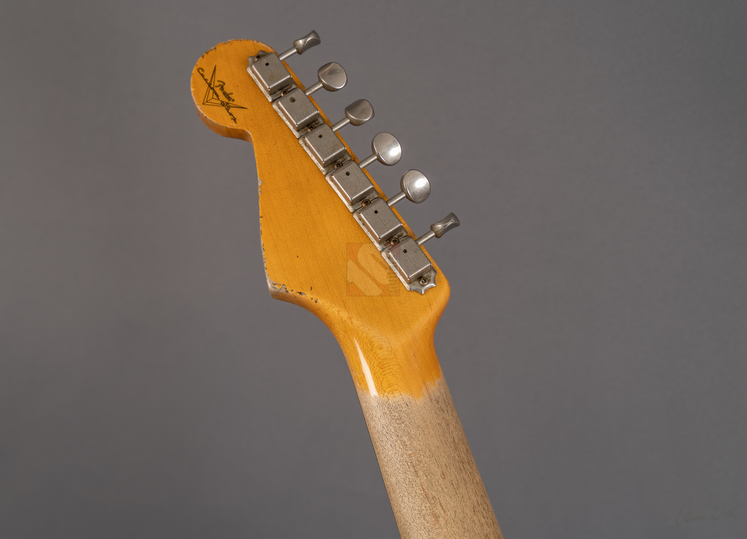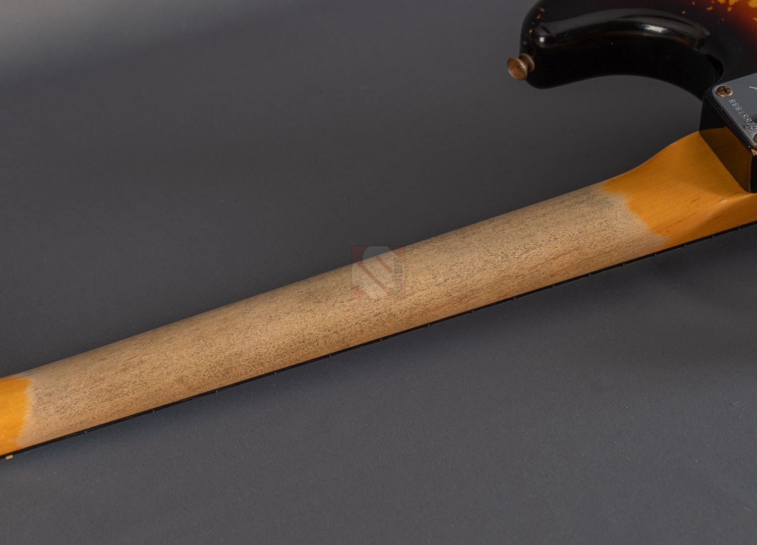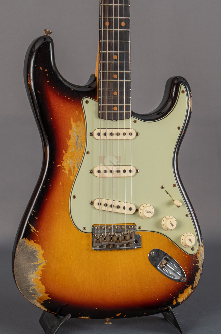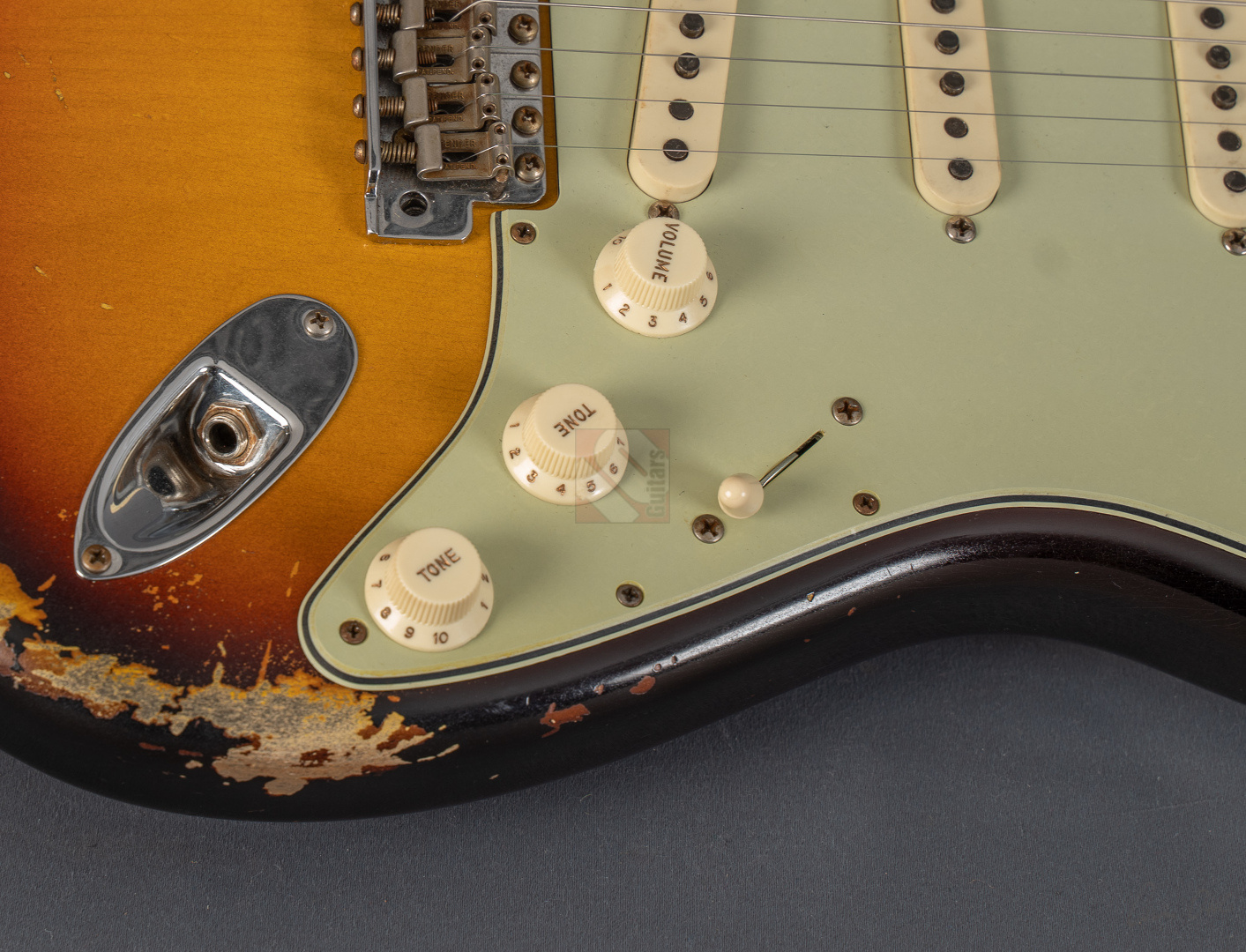 Hier haben wir wieder einmal eine absolute Granaten-Strat für alle, die ein geiles Sunburst, ein etwas stärkeres Aging und einen absoluten Spitzensound schätzen. Das tolle Heavy-Relicing zeigt sich hier in Form von unzähligen Haarrissen, vielfältigen Macken und lackfreien Bereichen an den signifikanten Stellen. Das Finish in "Faded/Aged 3-Tone Sunburst" ist wunderbar verwittert mit einer super authentischen Vintage-Patina. Passend dazu das tiefdunkle Palisandergriffbrett und das äragerechte Greenguard, wodurch man natürlich sofort an John Frusciantes Lieblingsgitarre erinnert wird. Und auch klanglich kann diese Stratocaster voll und ganz überzeugen. Die drei "Handwound Texas Special"-Pickups liefern in Verbindung mit dem grandiosen Schwingungsverhalten der Gitarre einen absoluten Spitzensound. Schmatzende, glockig-rockige Klänge á la Stevie Ray Vaughan oder Philip Sayce, super dynamisch, klasse Resonanz, schön perlig und strahlend mit genügend Wärme und Offenheit. Hier will man wirklich jeden Ton auskosten! Der Hals weist mit seinem "60 Style C"-Profil, 9,5"-Griffbrettradius und den beliebten Narrow/Tall-Bünden beste Player-Spezifikationen auf, sodass auch in Sachen Spielkomfort keinerlei Wünsche offen bleiben. Mit dieser Gitarre, die wir Euch in Top-Zustand anbieten können, bekommt man ein Spitzenpaket mit allerbestem Preis/Leistungs-Verhältnis. Hier braucht man nicht zweimal überlegen...