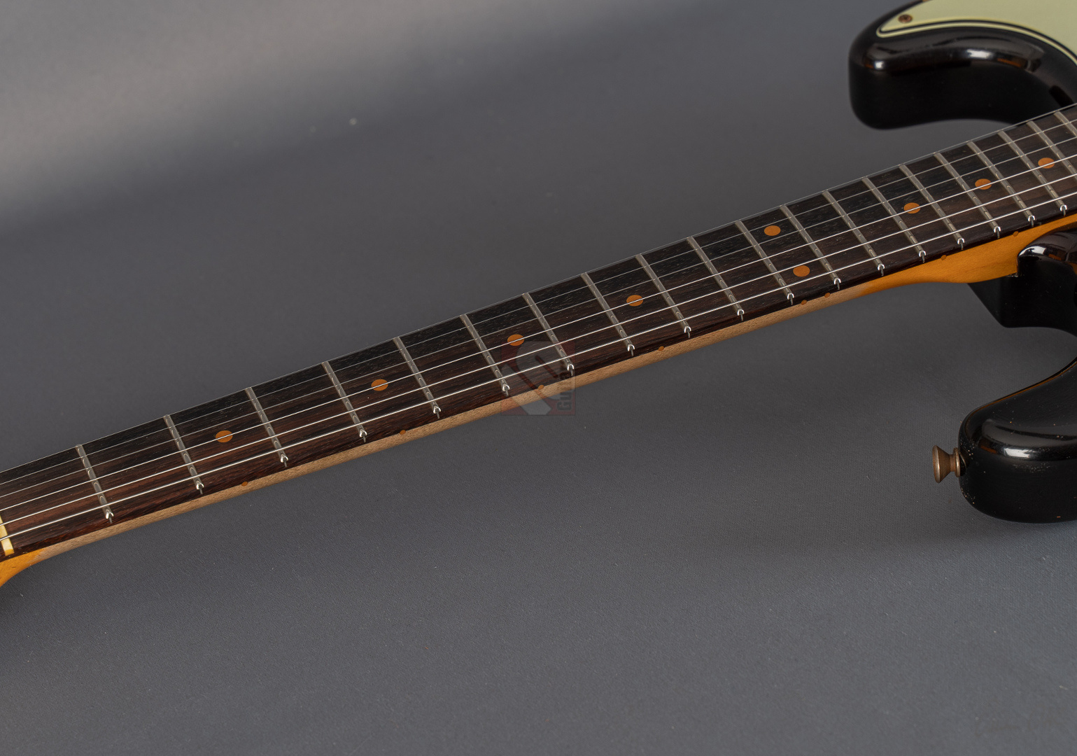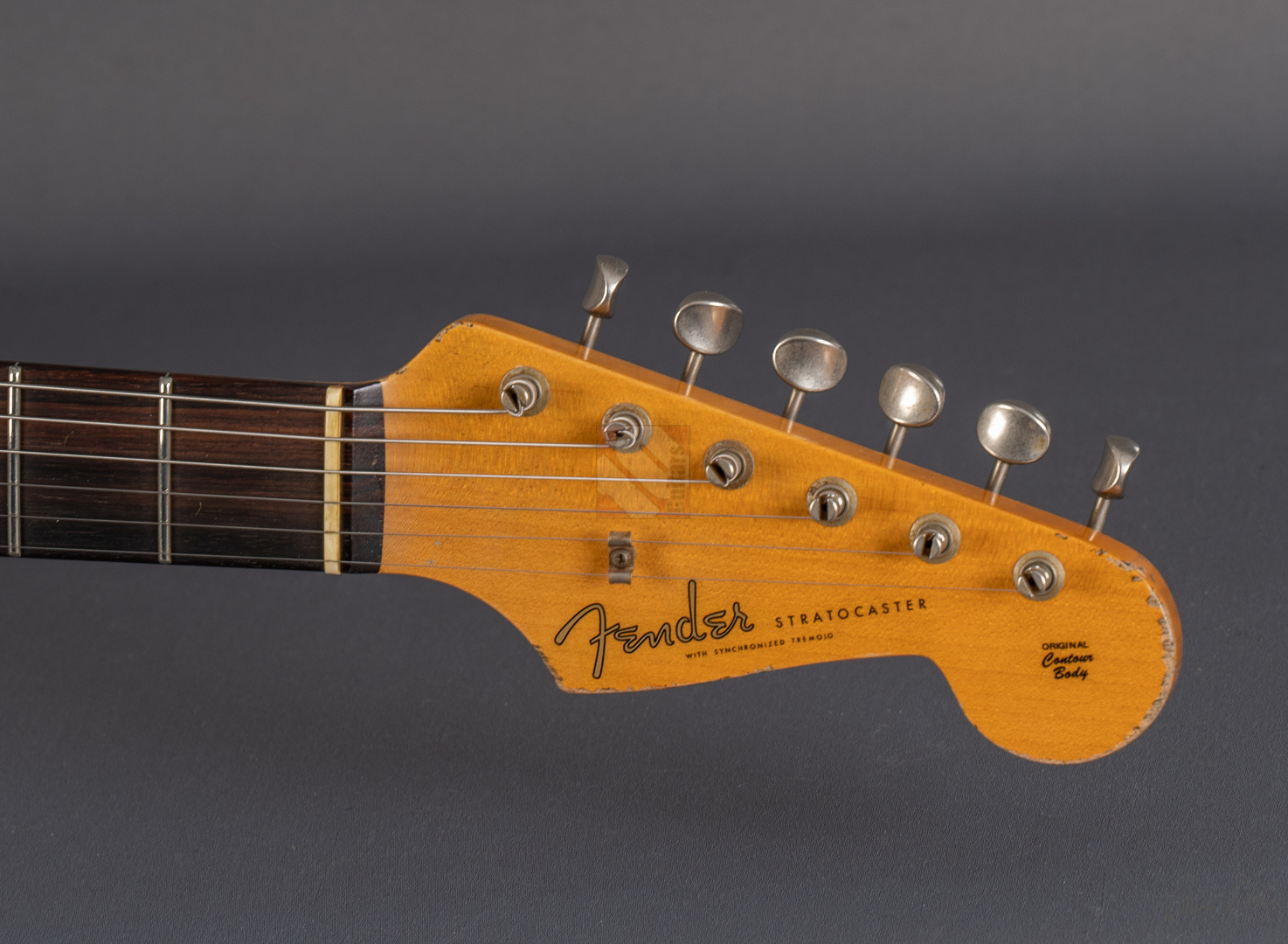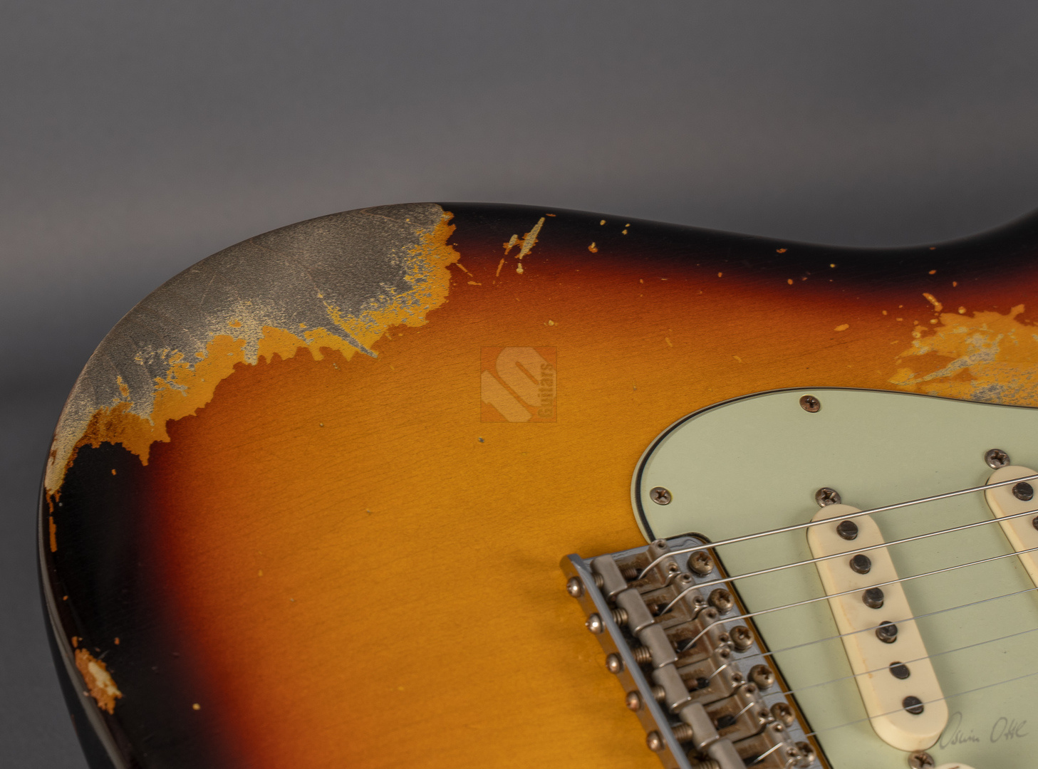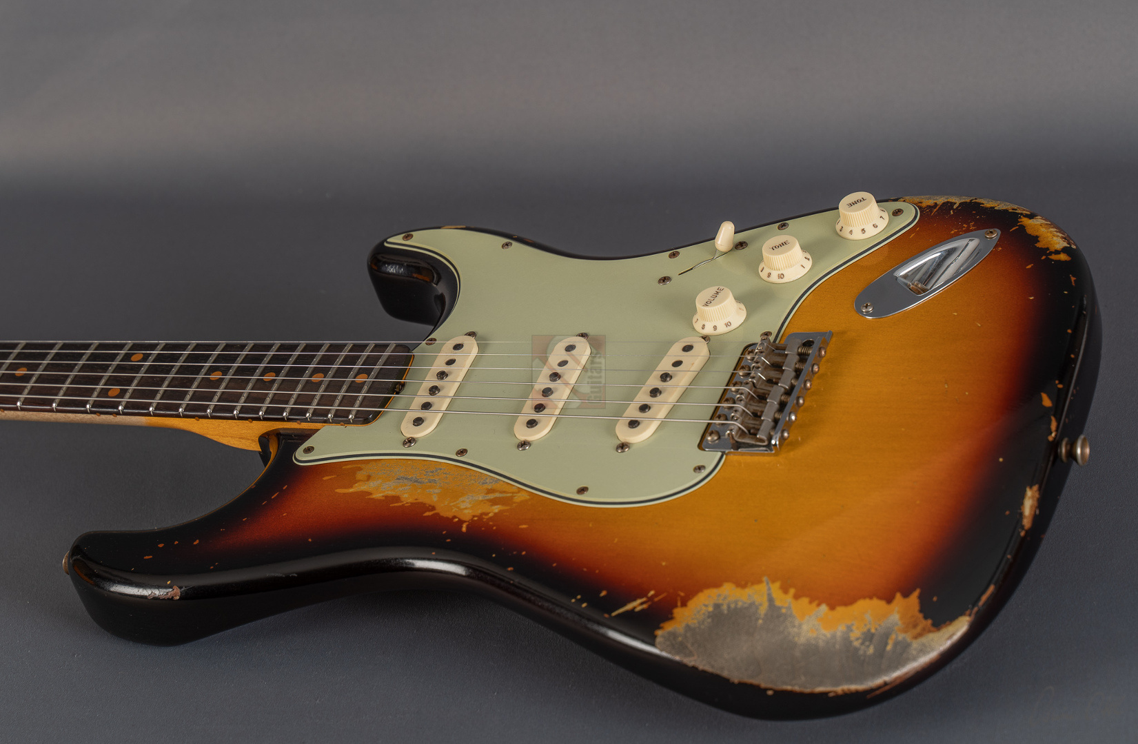 Hier haben wir wieder einmal eine absolute Granaten-Strat für alle, die ein geiles Sunburst, ein etwas stärkeres Aging und einen absoluten Spitzensound schätzen. Das tolle Heavy-Relicing zeigt sich hier in Form von unzähligen Haarrissen, vielfältigen Macken und lackfreien Bereichen an den signifikanten Stellen. Das Finish in "Faded/Aged 3-Tone Sunburst" ist wunderbar verwittert mit einer super authentischen Vintage-Patina. Passend dazu das tiefdunkle Palisandergriffbrett und das äragerechte Greenguard, wodurch man natürlich sofort an John Frusciantes Lieblingsgitarre erinnert wird. Und auch klanglich kann diese Stratocaster voll und ganz überzeugen. Die drei "Handwound Texas Special"-Pickups liefern in Verbindung mit dem grandiosen Schwingungsverhalten der Gitarre einen absoluten Spitzensound. Schmatzende, glockig-rockige Klänge á la Stevie Ray Vaughan oder Philip Sayce, super dynamisch, klasse Resonanz, schön perlig und strahlend mit genügend Wärme und Offenheit. Hier will man wirklich jeden Ton auskosten! Der Hals weist mit seinem "60 Style C"-Profil, 9,5"-Griffbrettradius und den beliebten Narrow/Tall-Bünden beste Player-Spezifikationen auf, sodass auch in Sachen Spielkomfort keinerlei Wünsche offen bleiben. Mit dieser Gitarre, die wir Euch in Top-Zustand anbieten können, bekommt man ein Spitzenpaket mit allerbestem Preis/Leistungs-Verhältnis. Hier braucht man nicht zweimal überlegen...