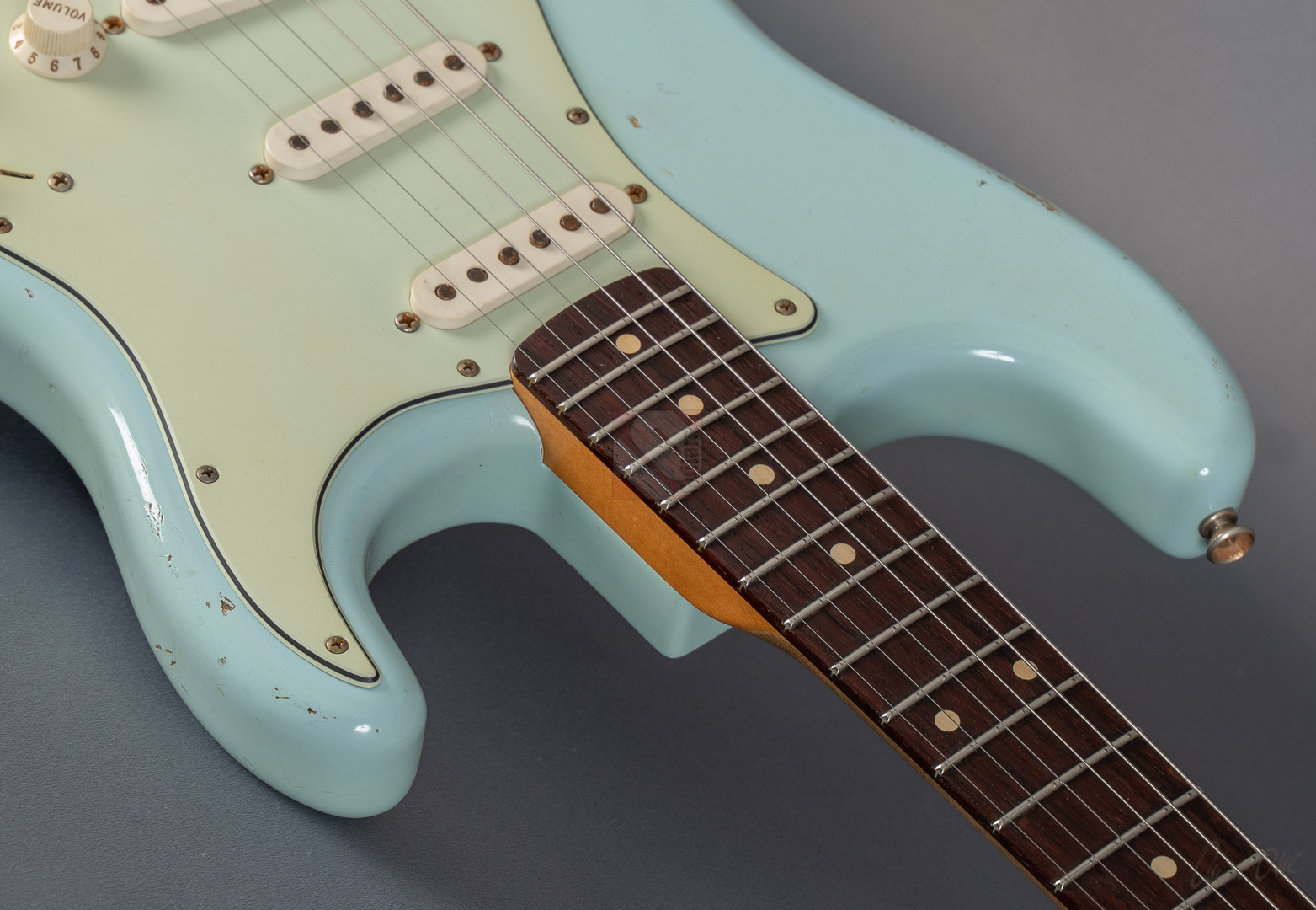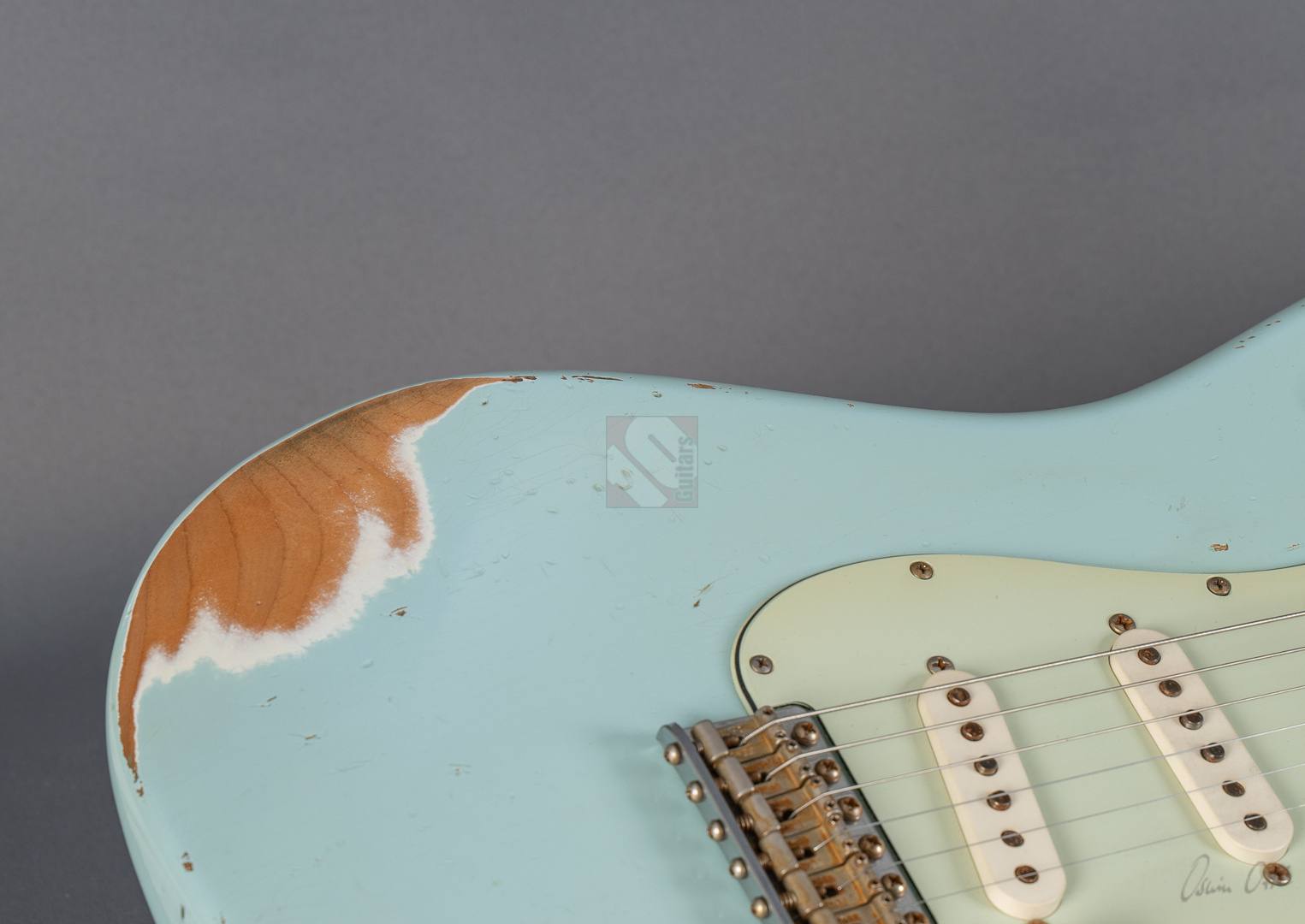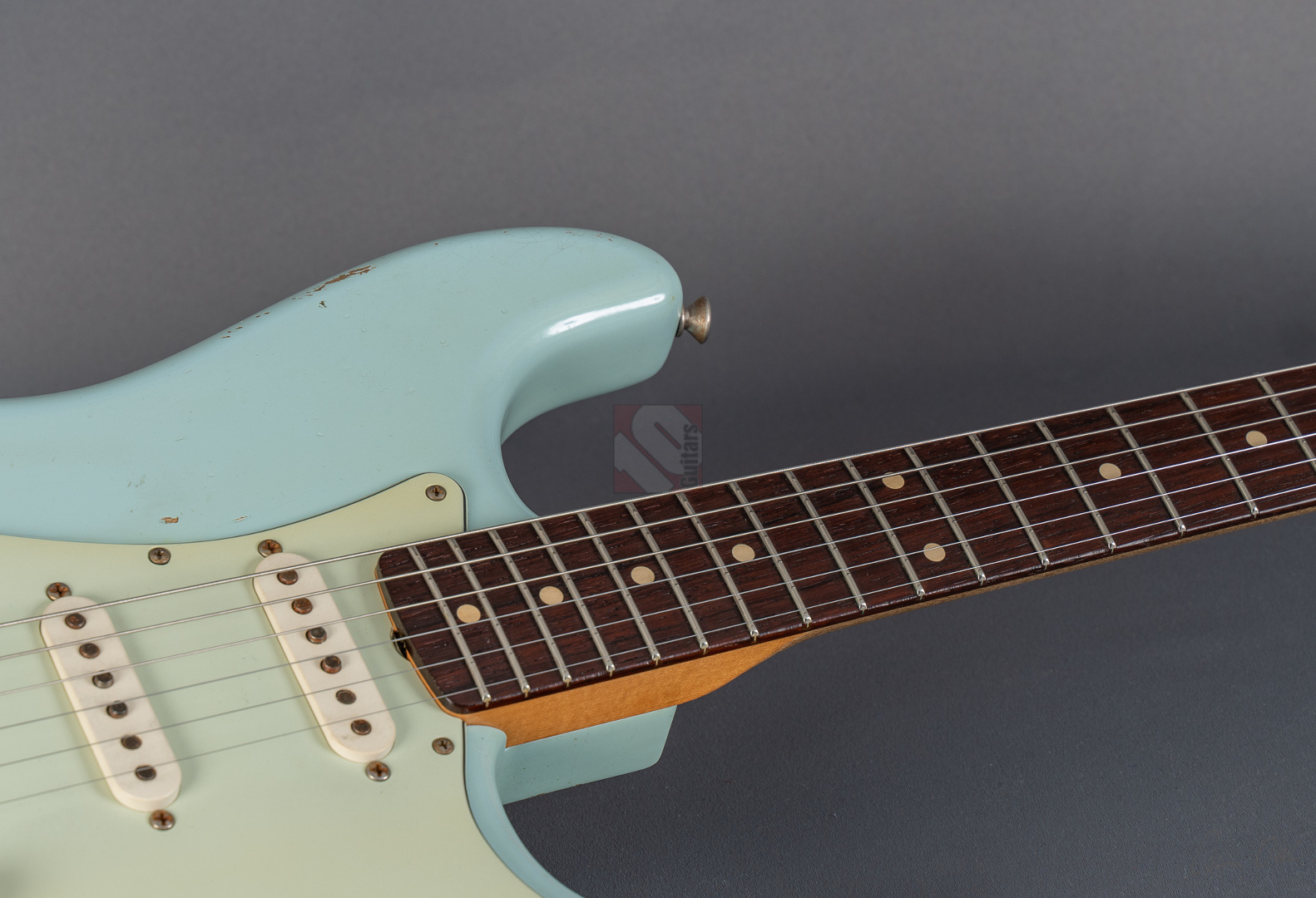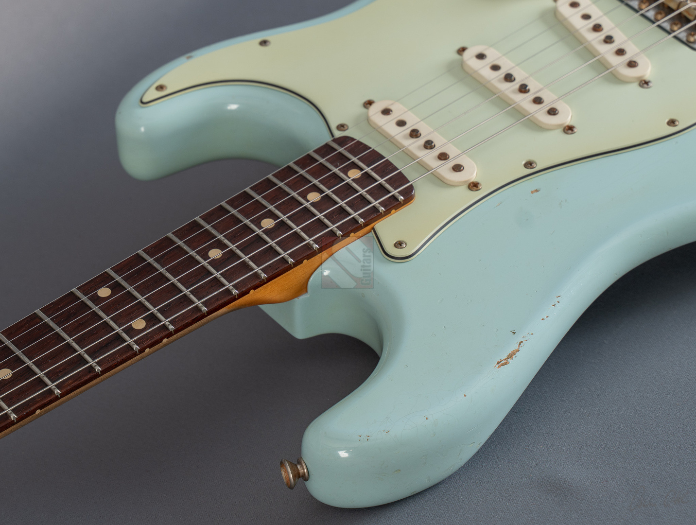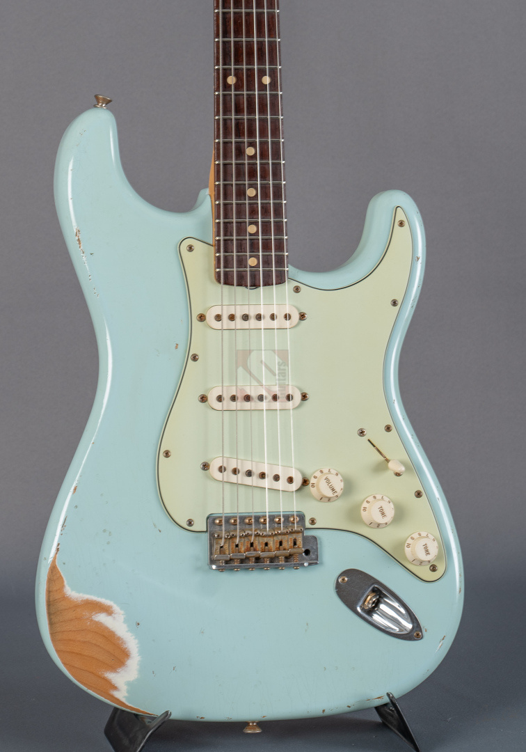 Es gibt Gitarren, die nimmt man in die Hand, fühlt sich sofort wohl und will nicht mehr aufhören zu spielen. Diese 60er Strat mit einem super authentischen "Heavy Relic"-Finish in der exklusiven Candy-Color "Sonic Blue" gehört genau zu dieser Art von Gitarren. Der Hals mit seinem komfortablen "60 Style Oval C"-Profil (.850-.930''), den bewährten 6105-Bünden und einem 9,5"-Griffbrettradius liegt hervorragend in der Hand und fühlt sich mit seiner lackfreien Rückseite an, wie schon 20 Jahre gespielt. Grundsätzlich muss man hier sagen, dass die gesamte Haptik dieser Gitarre einer echten alten Strat doch sehr nahe kommt. Verstärkt wird dieser Eindruck natürlich noch durch die perfekte Optik. Sehr schönes, ausgeblichenes und super geagtes Sonic-Blue. Und auch im Sound setzt sich der Eindruck einer echten alten Vintage-Strat fort. Mit ausreichend Schwungmasse ausgestattet wird der Klang dieser super resonanten Stratocaster von den "Fat 50s"-Pickups (Inklusive RWRP zur Unterdrückung von Störgeräuschen) in bester Manier an den Amp übertragen. Schön glockig und perlig sowie mit einer unglaublichen Wärme. Äußerst kernig und mittig, perfekt für Blues und Rock. Am Steg fett, schmatzend und dank ausgezeichneter Perkussivität und Knackigkeit auch meisterhaft für funky Singlenotes und Akkorde in den Zwischenstellungen mit einer Extraportion Durchsetzungsstärke. Die Gitarre befindet sich inklusive den Bünden in Top-Zustand. Dieses fantastische Instrument, bei dem Sound, Bespielbarkeit und Look eine grandiose Symbiose eingehen, sollte man sich vor allem als Player keineswegs entgehen lassen.