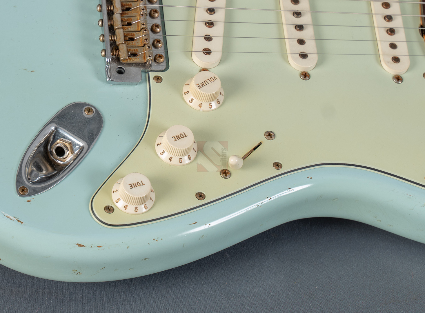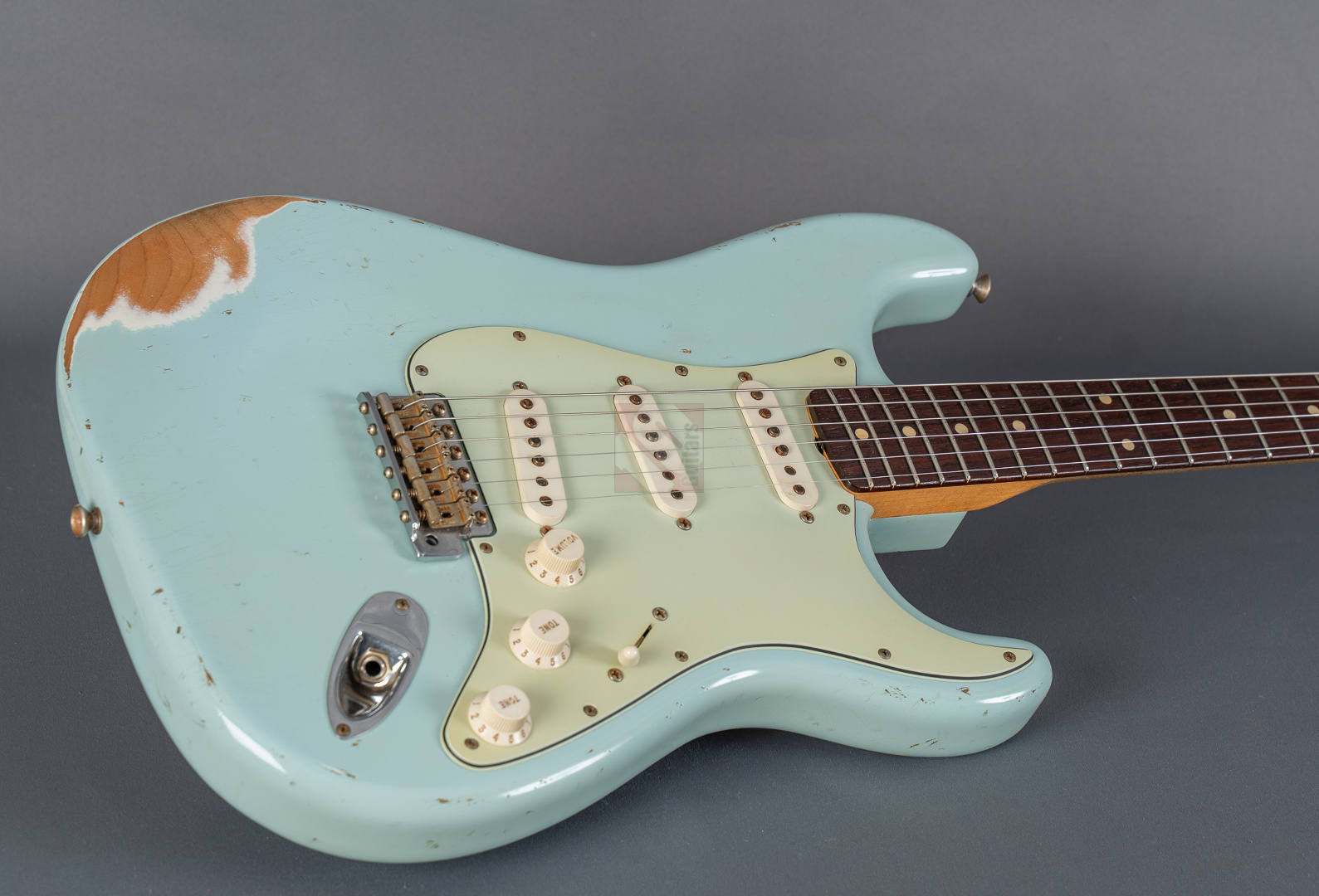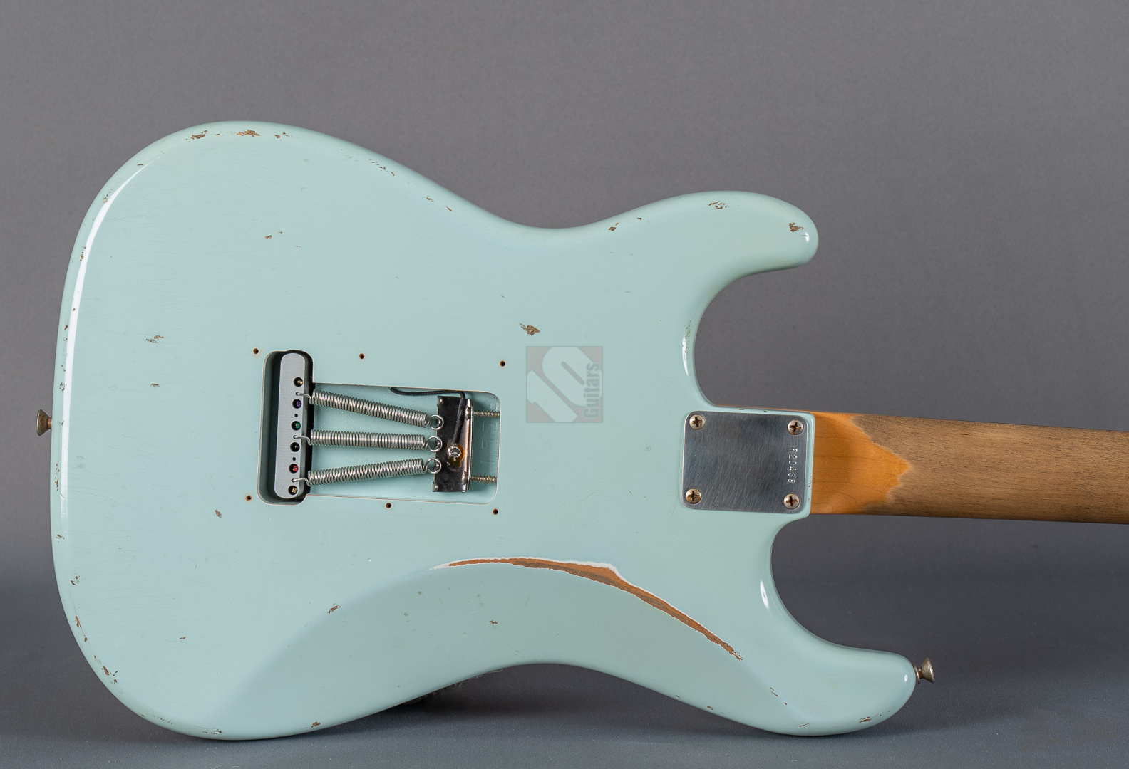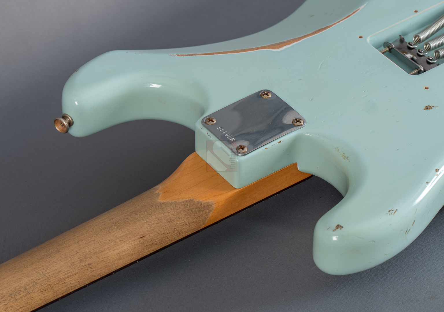 Es gibt Gitarren, die nimmt man in die Hand, fühlt sich sofort wohl und will nicht mehr aufhören zu spielen. Diese 60er Strat mit einem super authentischen "Heavy Relic"-Finish in der exklusiven Candy-Color "Sonic Blue" gehört genau zu dieser Art von Gitarren. Der Hals mit seinem komfortablen "60 Style Oval C"-Profil (.850-.930''), den bewährten 6105-Bünden und einem 9,5"-Griffbrettradius liegt hervorragend in der Hand und fühlt sich mit seiner lackfreien Rückseite an, wie schon 20 Jahre gespielt. Grundsätzlich muss man hier sagen, dass die gesamte Haptik dieser Gitarre einer echten alten Strat doch sehr nahe kommt. Verstärkt wird dieser Eindruck natürlich noch durch die perfekte Optik. Sehr schönes, ausgeblichenes und super geagtes Sonic-Blue. Und auch im Sound setzt sich der Eindruck einer echten alten Vintage-Strat fort. Mit ausreichend Schwungmasse ausgestattet wird der Klang dieser super resonanten Stratocaster von den "Fat 50s"-Pickups (Inklusive RWRP zur Unterdrückung von Störgeräuschen) in bester Manier an den Amp übertragen. Schön glockig und perlig sowie mit einer unglaublichen Wärme. Äußerst kernig und mittig, perfekt für Blues und Rock. Am Steg fett, schmatzend und dank ausgezeichneter Perkussivität und Knackigkeit auch meisterhaft für funky Singlenotes und Akkorde in den Zwischenstellungen mit einer Extraportion Durchsetzungsstärke. Die Gitarre befindet sich inklusive den Bünden in Top-Zustand. Dieses fantastische Instrument, bei dem Sound, Bespielbarkeit und Look eine grandiose Symbiose eingehen, sollte man sich vor allem als Player keineswegs entgehen lassen.