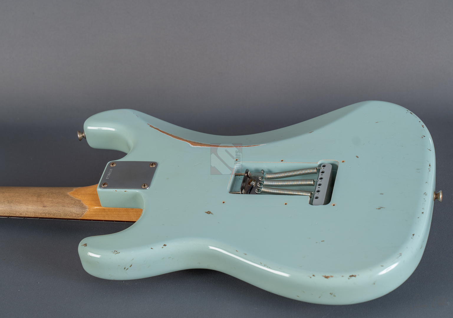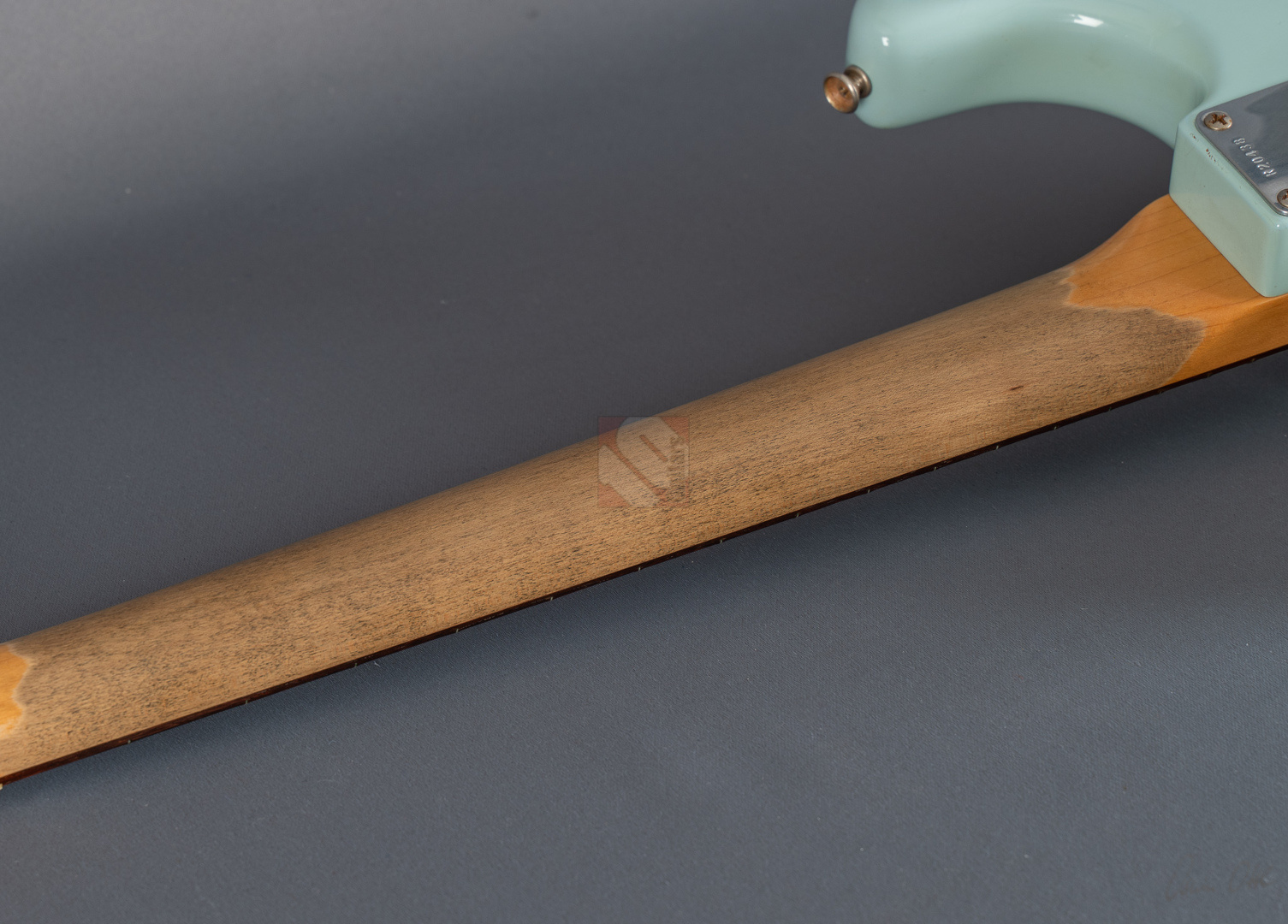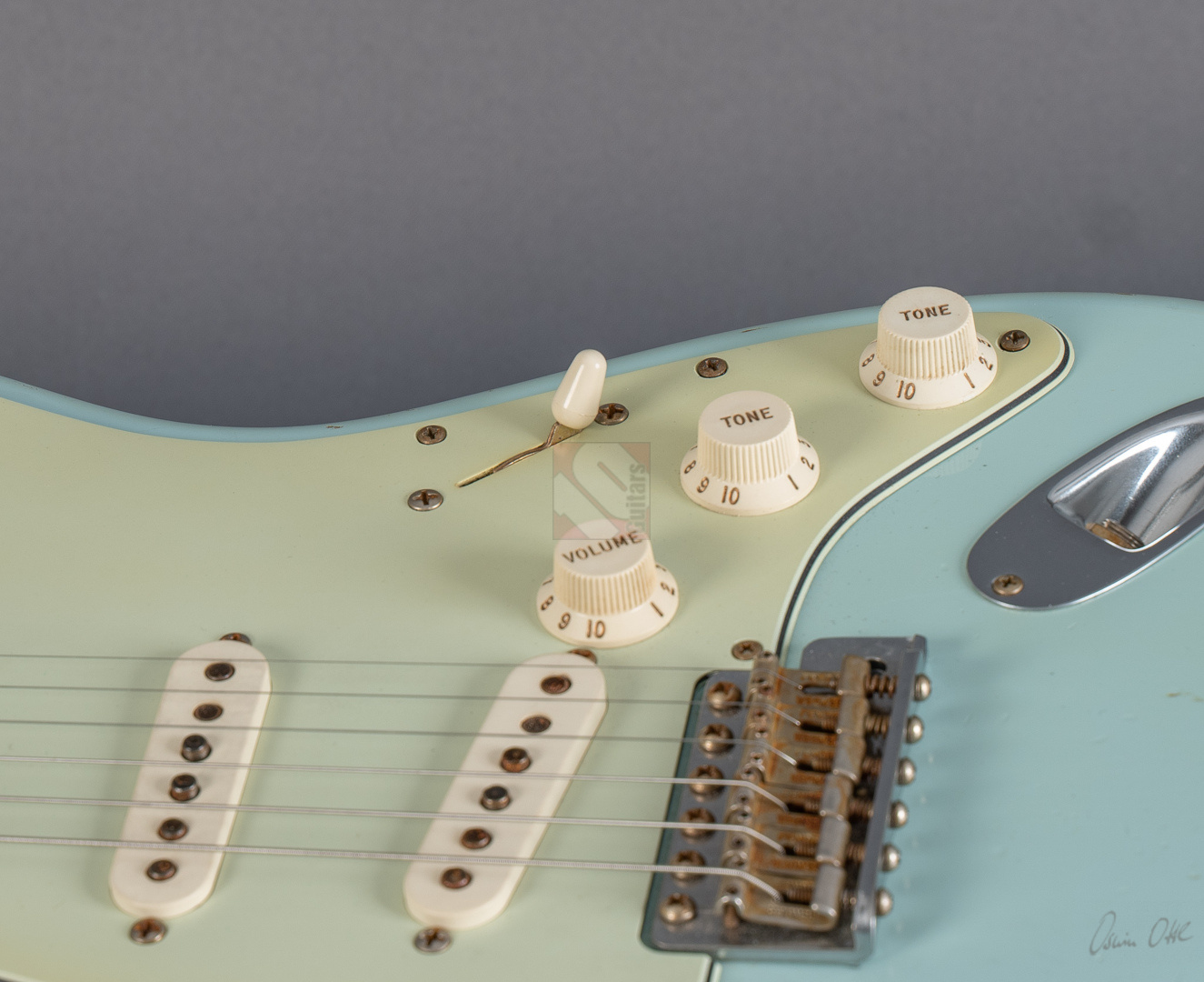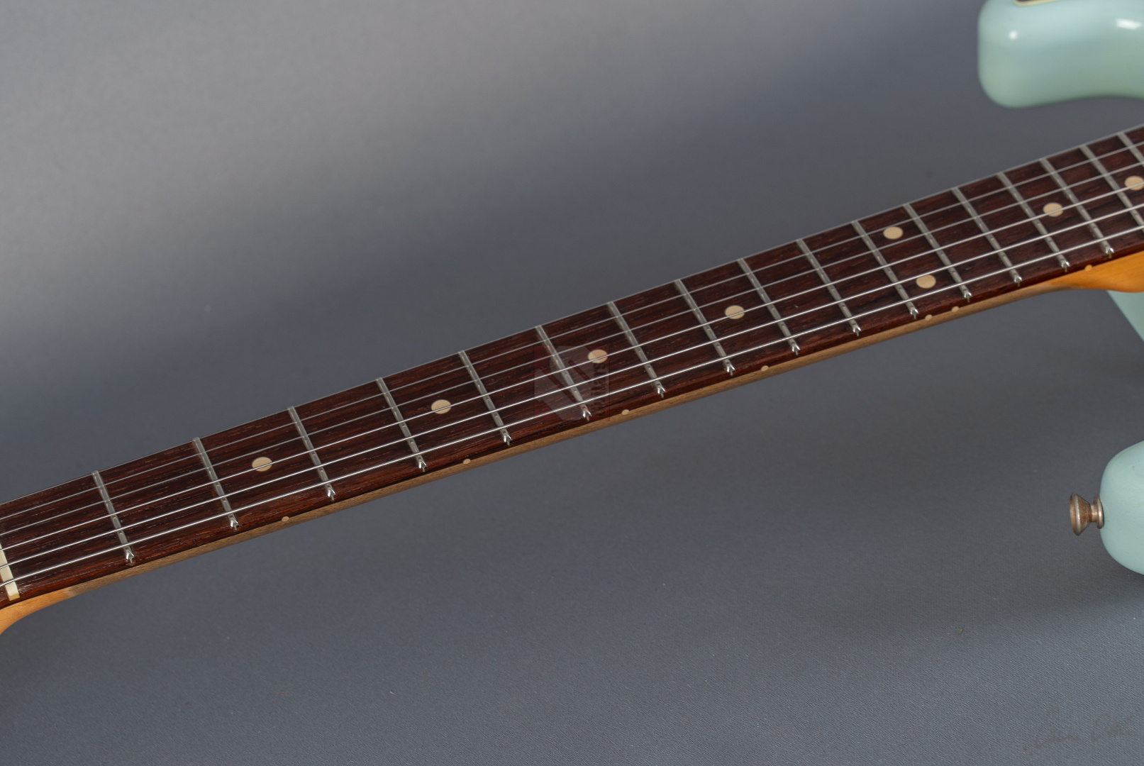 Es gibt Gitarren, die nimmt man in die Hand, fühlt sich sofort wohl und will nicht mehr aufhören zu spielen. Diese 60er Strat mit einem super authentischen "Heavy Relic"-Finish in der exklusiven Candy-Color "Sonic Blue" gehört genau zu dieser Art von Gitarren. Der Hals mit seinem komfortablen "60 Style Oval C"-Profil (.850-.930''), den bewährten 6105-Bünden und einem 9,5"-Griffbrettradius liegt hervorragend in der Hand und fühlt sich mit seiner lackfreien Rückseite an, wie schon 20 Jahre gespielt. Grundsätzlich muss man hier sagen, dass die gesamte Haptik dieser Gitarre einer echten alten Strat doch sehr nahe kommt. Verstärkt wird dieser Eindruck natürlich noch durch die perfekte Optik. Sehr schönes, ausgeblichenes und super geagtes Sonic-Blue. Und auch im Sound setzt sich der Eindruck einer echten alten Vintage-Strat fort. Mit ausreichend Schwungmasse ausgestattet wird der Klang dieser super resonanten Stratocaster von den "Fat 50s"-Pickups (Inklusive RWRP zur Unterdrückung von Störgeräuschen) in bester Manier an den Amp übertragen. Schön glockig und perlig sowie mit einer unglaublichen Wärme. Äußerst kernig und mittig, perfekt für Blues und Rock. Am Steg fett, schmatzend und dank ausgezeichneter Perkussivität und Knackigkeit auch meisterhaft für funky Singlenotes und Akkorde in den Zwischenstellungen mit einer Extraportion Durchsetzungsstärke. Die Gitarre befindet sich inklusive den Bünden in Top-Zustand. Dieses fantastische Instrument, bei dem Sound, Bespielbarkeit und Look eine grandiose Symbiose eingehen, sollte man sich vor allem als Player keineswegs entgehen lassen.