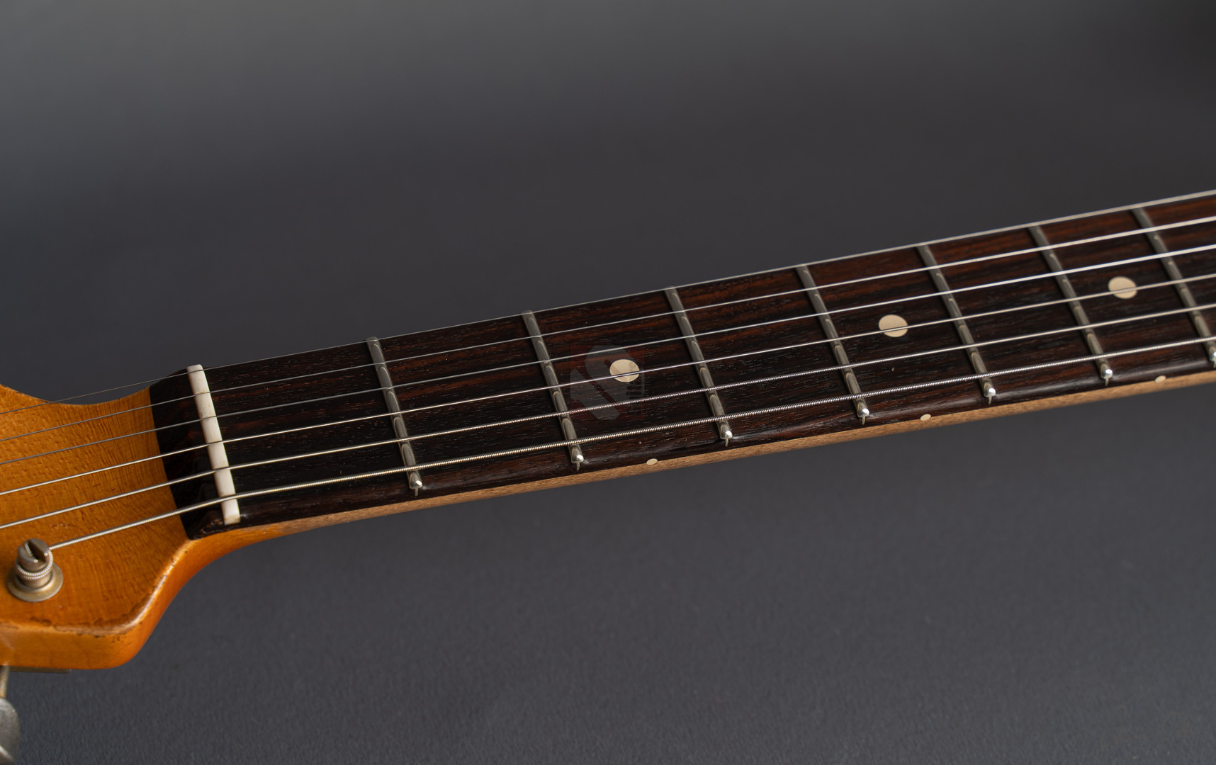 Vincent van Trigt – der legendäre Masterbuilder, der den Fender Custom Shop mittlerweile leider verlassen hat! Jedes Mal, wenn wir eine seiner äußerst rar werdenden Gitarren in die Hände bekommen, sind wir vom Detailreichtum seines Agings und der Klanggewalt seiner Instrumente fasziniert. So auch bei dieser 1961 Heavy-Relic-Strat, die man definitiv in der Kategorie "Trauminstrumente" einzuordnen hat. Schon wenn man den Koffer öffnet, strömt einem hier ein sagenhaftes Mojo entgegen! Das Finish in stark gerelictem "Bleached 3-Tone Sunburst", das Tortoise-Pickguard, die geagten Pickupkappen, das dunkle Griffbrett aus indischem Palisander, ...hier passt optisch einfach alles! Beim ersten Check fällt zunächst der unglaublich komfortable Hals auf, der sich mit seinem "Large C"-Profil, dem 10"-Griffbrettradius und den geilen 6100-Jumbo-Bünden in modernster Manier wie Butter spielt (.790-.930''). Schon beim ersten Anspielen erkennt man hier, wie resonant und laut die Gitarre ist. Als Pickups kommen die exklusiven "Handwound Master Designed LTD"-Pickups zum Einsatz, die als spezielle Entwicklung von Vincents frührerem Lehrer John Cruz schon clean äußerst glockig und rund daherkommen und sofort an die charakteristischen Klänge à la John Mayer erinnern: offen, transparent und trotzdem immer genügend Mitten und Wärme. Nicht nur, dass man damit alle klassischen Strat-Klänge in Bestform abdecken kann, sondern hier wird für satteste, warme, aber trotzdem immer transparente und glockige Vintage-60s-Klänge par excellence gesorgt. Besser kann man den Sound einer Rosewood-Strat nicht hinbekommen! Insgesamt eine fantastische Mischung aus bestem Vintage-Tone und topmodernem Handling, wie man es von van Trigt kennt und liebt. Egal auf welcher Position, die Gitarre hat ungemein viel Substanz im Ton. Zusammen mit dem spritzigen und schwingungsfreudigen Grundcharakter des Instruments bekommt man hier einen Stratsound vom Allerfeinsten! So freuen wir uns, Euch diese rundum perfekte Stratocaster in Top-Zustand anbieten zu können.