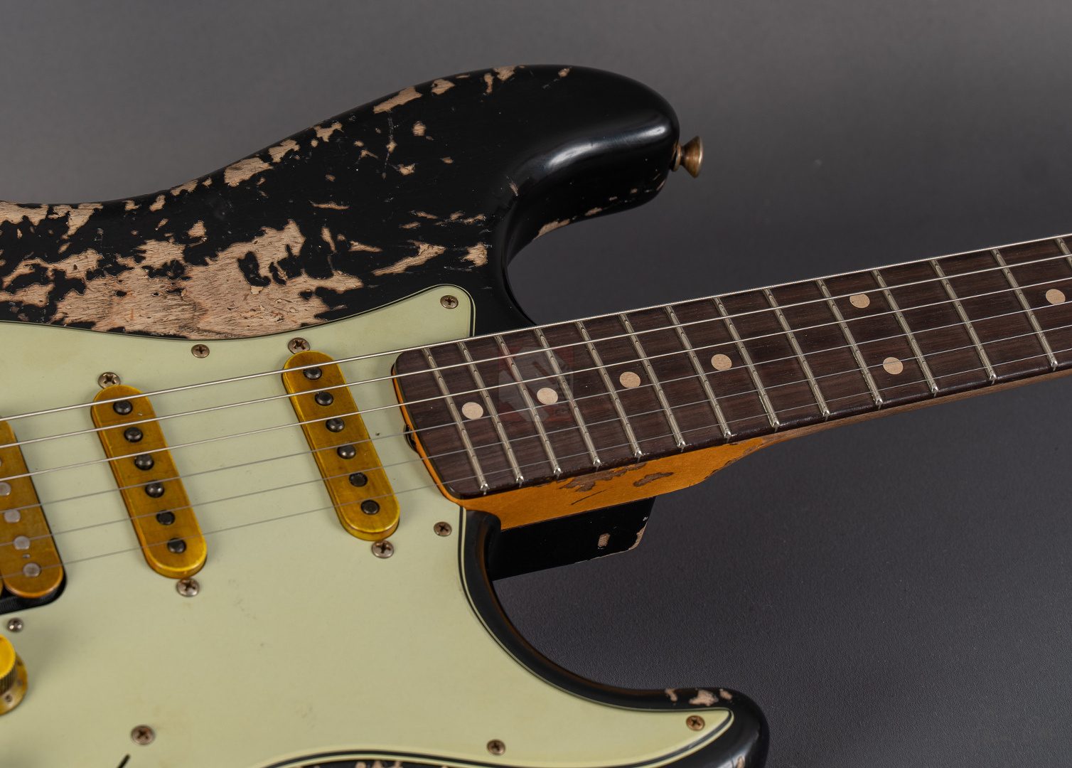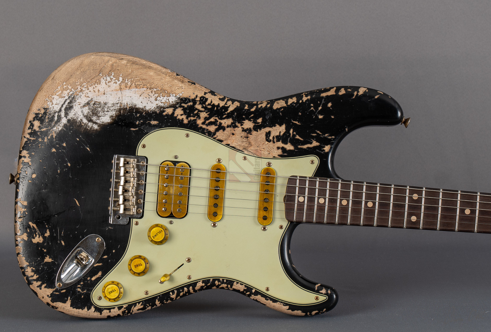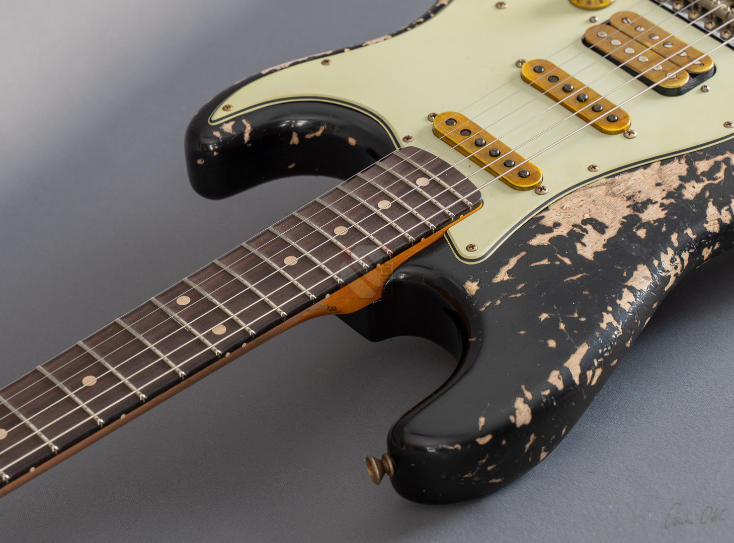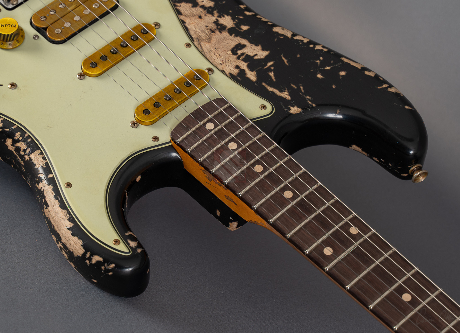Immer wenn Jörg Hermann in enger Zusammenarbeit mit dem Fender Custom Shop eine sogenannte MBD-Strat in Auftrag gibt, weiß man definitiv, dass es sich beim Resultat um ein ganz besonderes Meisterwerk handeln muss. So auch bei dieser 62er Super-Strat, die ein wunderbar gelungenes Bravourstück darstellt, das vor allem in Sachen Aging und Spec-Zusammenstellung auf ganzer Linie fasziniert. Allerbeste Qualität auf Masterbuilt-Level zum Teambuilt-Preis! Das fabelhafte Finish in eindrucksvoll super-heavy gerelictem "Super Faded/Aged Black" mit unzähligen größeren und kleineren Macken, erheblichem Lackabrieb und artifiziell vergilbten Stellen verleiht der Gitarre eine phänomenale Vintage-Patina. Man braucht sich nur die bräunlich-gelben Pickup-Kappen und Potiknöpfe ansehen, um den Grad an Detailversessenheit zu erkennen, mit dem dieses Prachtstück gefertigt wurde. Veredelt mit einer Palette an fantastischen Specs, die man in dieser Kombination nur schwer finden kann. So wurden hier als Singlecoils am Hals und in der Mitte "Handwound Fat 60s"-Pickups verbaut, die clean wunderbar glockig und rund daherkommen, sich offen und transparent zeigen, aber trotzdem immer mit genügend Mitten und Wärme. Der Seymour Duncan "Pearly Gates"-Humbucker am Steg hingegen liefert verzerrt allerfeinste, fette Rockbretter, dass man sofort im siebten Soundhimmel schwebt. Satt, schmatzend und tight, dass es eine wahre Freude ist. Und nun wurde das Ganze noch kombiniert mit einer RWRP-Option am Mittel-Pickup zur Unterdrückung von Störgeräuschen sowie "Tone Saver Treble Bleed" und "Grease Bucket Tone Control", um den Verlust hoher Frequenzen und matschige Töne bei geringerer Lautstärke zu verhindern. Als wäre das nicht genug, wurde diese exklusive Strat noch mit einem super angenehmen "60 Style Oval C"-Profil, 9,5''-Griffbrettradius und den bewährten Narrow/Tall-Bünden ausgestattet, um gerade auch modernen Player-Ansprüchen zu genügen. So ist wirklich jede Facette dieser phänomenalen Stratocaster, die wir Euch in neuwertigem Zustand anbieten können, absolute Oberliga und wir möchten schon jetzt den zukünftigen Besitzer zu diesem ganz besonderen Juwel beglückwünschen.