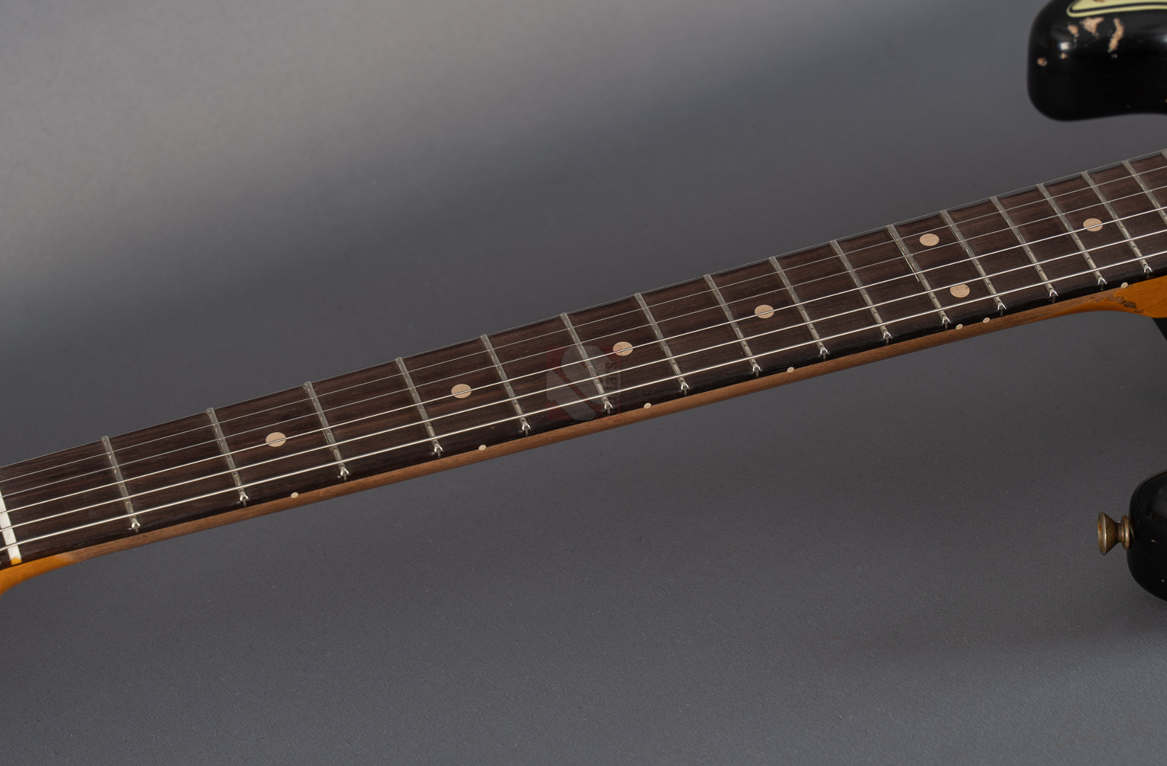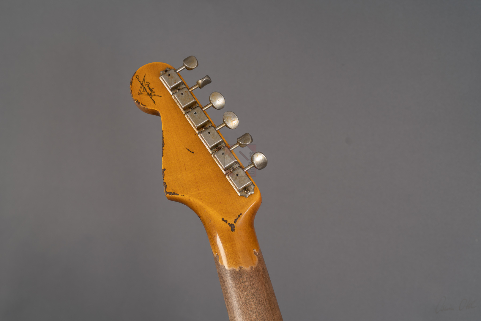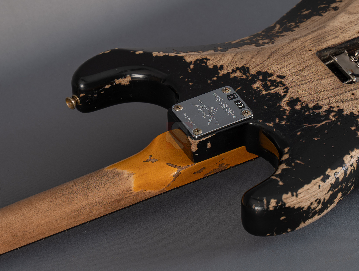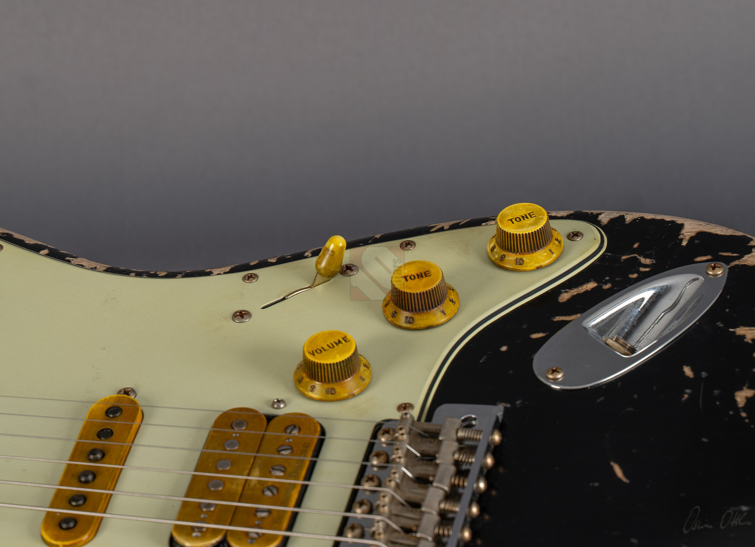 Immer wenn Jörg Hermann in enger Zusammenarbeit mit dem Fender Custom Shop eine sogenannte MBD-Strat in Auftrag gibt, weiß man definitiv, dass es sich beim Resultat um ein ganz besonderes Meisterwerk handeln muss. So auch bei dieser 62er Super-Strat, die ein wunderbar gelungenes Bravourstück darstellt, das vor allem in Sachen Aging und Spec-Zusammenstellung auf ganzer Linie fasziniert. Allerbeste Qualität auf Masterbuilt-Level zum Teambuilt-Preis! Das fabelhafte Finish in eindrucksvoll super-heavy gerelictem "Super Faded/Aged Black" mit unzähligen größeren und kleineren Macken, erheblichem Lackabrieb und artifiziell vergilbten Stellen verleiht der Gitarre eine phänomenale Vintage-Patina. Man braucht sich nur die bräunlich-gelben Pickup-Kappen und Potiknöpfe ansehen, um den Grad an Detailversessenheit zu erkennen, mit dem dieses Prachtstück gefertigt wurde. Veredelt mit einer Palette an fantastischen Specs, die man in dieser Kombination nur schwer finden kann. So wurden hier als Singlecoils am Hals und in der Mitte "Handwound Fat 60s"-Pickups verbaut, die clean wunderbar glockig und rund daherkommen, sich offen und transparent zeigen, aber trotzdem immer mit genügend Mitten und Wärme. Der Seymour Duncan "Pearly Gates"-Humbucker am Steg hingegen liefert verzerrt allerfeinste, fette Rockbretter, dass man sofort im siebten Soundhimmel schwebt. Satt, schmatzend und tight, dass es eine wahre Freude ist. Und nun wurde das Ganze noch kombiniert mit einer RWRP-Option am Mittel-Pickup zur Unterdrückung von Störgeräuschen sowie "Tone Saver Treble Bleed" und "Grease Bucket Tone Control", um den Verlust hoher Frequenzen und matschige Töne bei geringerer Lautstärke zu verhindern. Als wäre das nicht genug, wurde diese exklusive Strat noch mit einem super angenehmen "60 Style Oval C"-Profil, 9,5''-Griffbrettradius und den bewährten Narrow/Tall-Bünden ausgestattet, um gerade auch modernen Player-Ansprüchen zu genügen. So ist wirklich jede Facette dieser phänomenalen Stratocaster, die wir Euch in neuwertigem Zustand anbieten können, absolute Oberliga und wir möchten schon jetzt den zukünftigen Besitzer zu diesem ganz besonderen Juwel beglückwünschen.