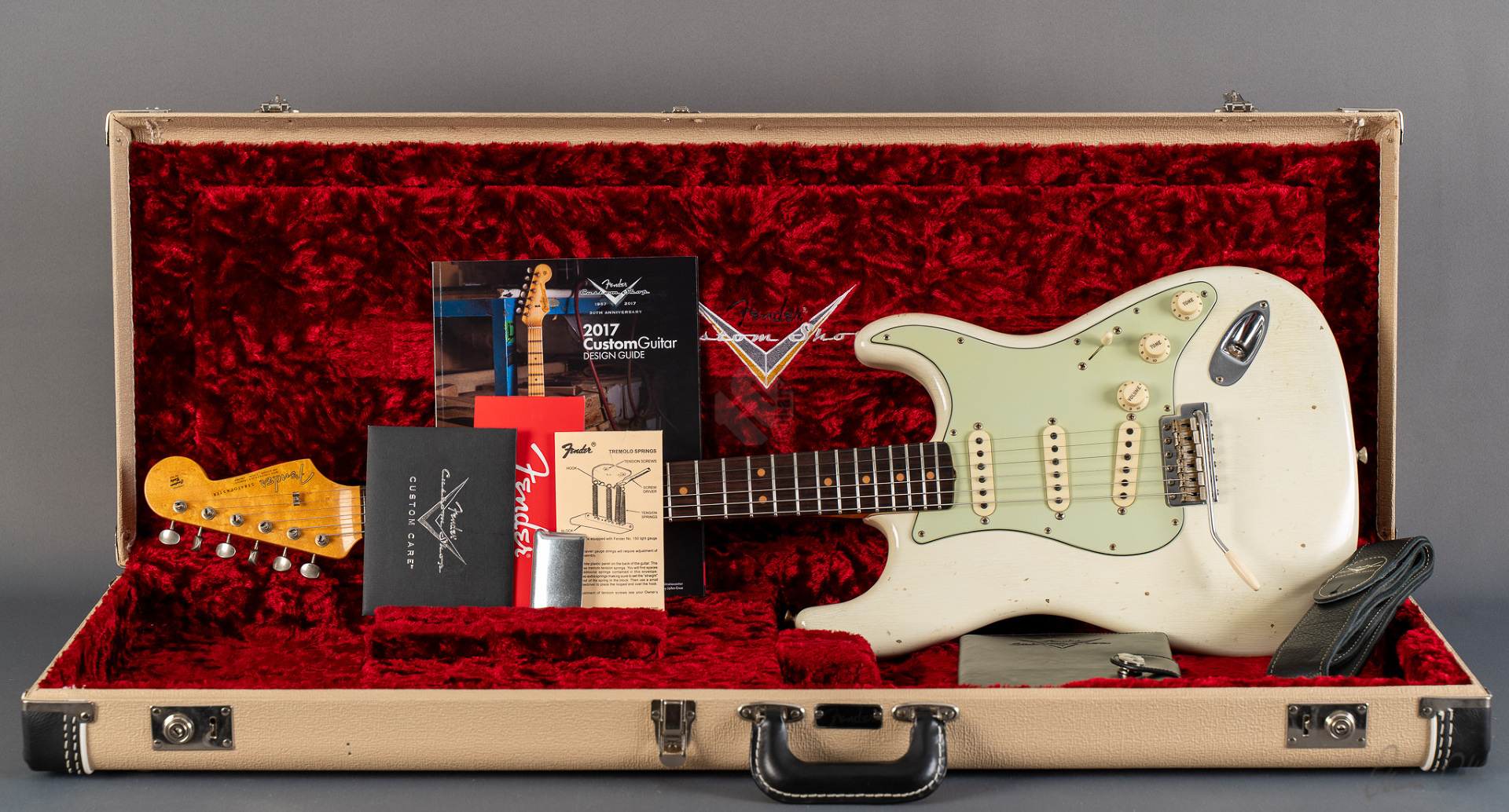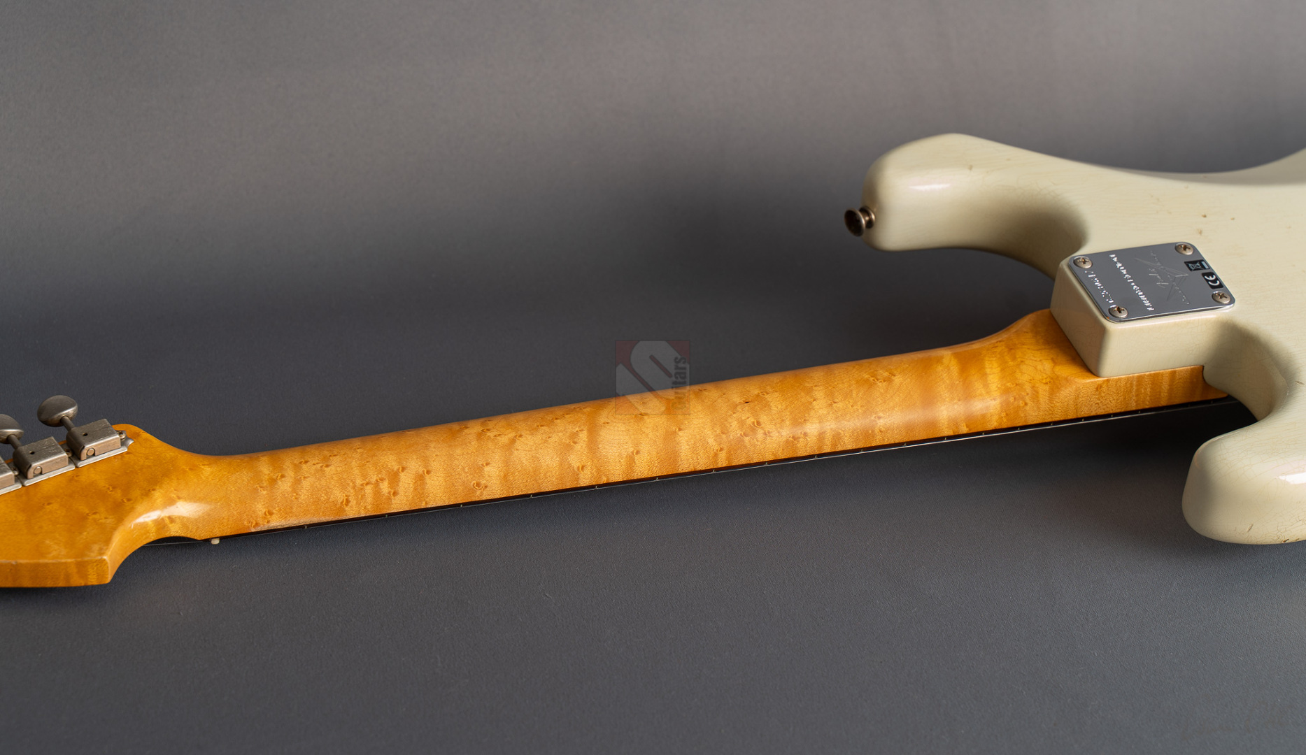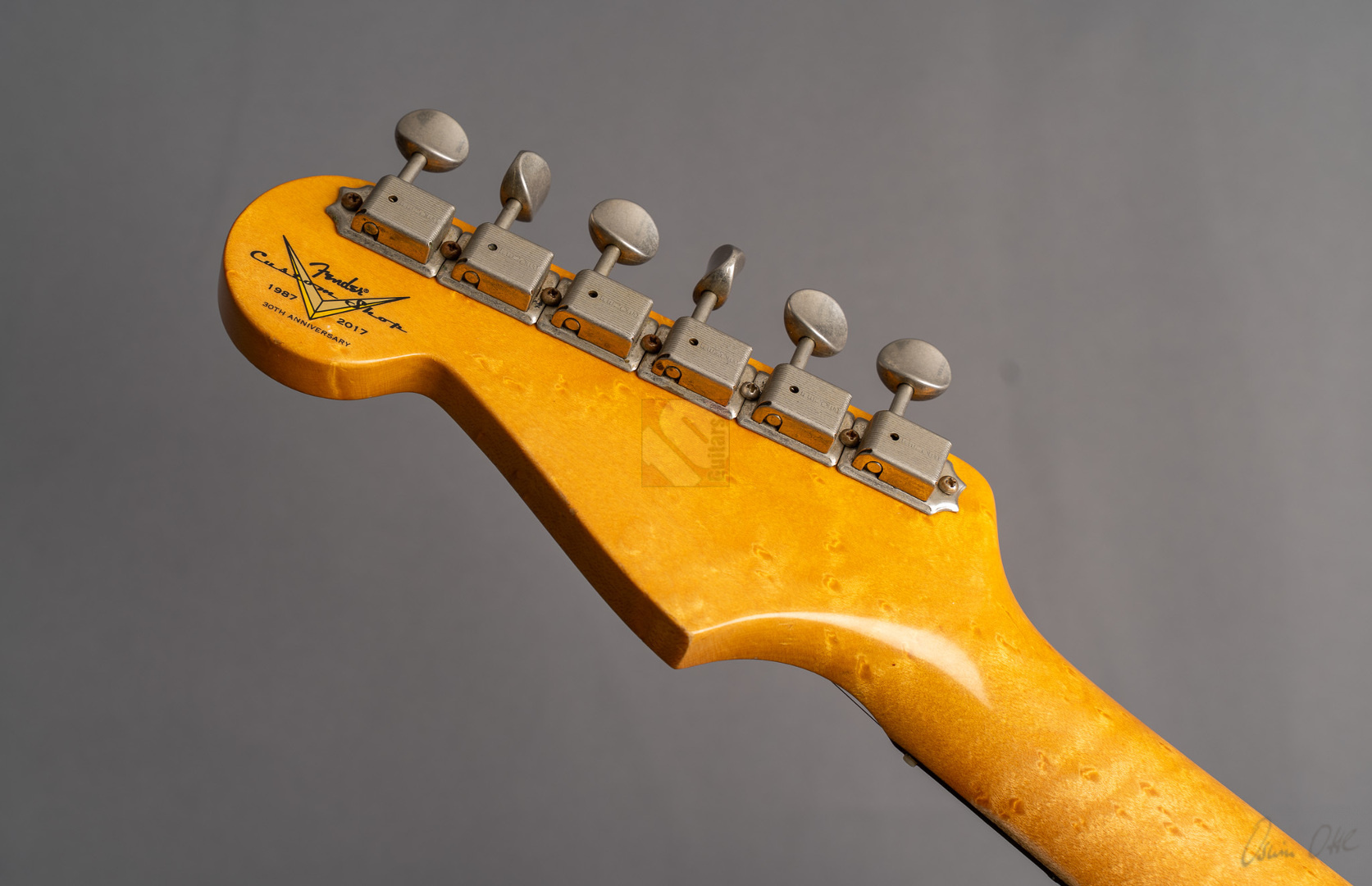 Diese Strat wurde speziell für die NAMM 2017 gebaut und da haben sich die Jungs des Fender Custom Shop wieder richtig ins Zeug gelegt. Kein Wunder, denn wie man schon an der Kopfplattenrückseite der Gitarre sehen kann, handelt es sich hier um ein "30th Anniversary"-Modell, das anlässlich des 30-jährigen Bestehens des Fender Custom Shop gefertigt wurde. ...und was für eine geile Stratocaster wir hier in Händen haben dürfen! Schon allein das super authentische Journeyman-Relicing des klasse vergilbten "Aged Olympic White"-Finish ist eine Augenweide. Wunderbar subtil mit zahlreichen Haarrissen und nur wenigen kleineren Macken wird hier eine phänomenale Vintage-Patina geschaffen. Passend dazu das äragerechte Greenguard und die geagten Pickup-Kappen und Poti-Knöpfe. Doch den optischen Höhepunkt bildet hier der wunderbar satinierte Neck aus fantastisch gemasertem AA-Birdseye-Maple. Nicht nur schön anzusehen, sondern auch ein haptisches Erlebnis, sodass man die Strat gar nicht mehr aus der Hand legen möchte. Dazu tragen natürlich auch der moderne 9,5''-Griffbrettradius, die bewährten 6105-Bünde und das komfortable "60 Style Oval C"-Halsprofil bei. Soundmäßig spielt man mit diesem Instrument in der absoluten Oberliga. Die "Handwound 60/63"-Pickups sorgen für genau den Stratocaster-Sound, den man kennt und liebt: glockig, sowohl clean wie auch mit Zerre richtig saftig, gerne auch schmatzig und kräftig, aber auch transparent und sehr definiert. Echter Vintage-Sound: rund, sehr ausgeglichen und auch ganz leicht komprimiert. So freuen wir uns, Euch dieses soundmächtige Prachtstück inklusive den Bünden in Top-Zustand anbieten zu können.