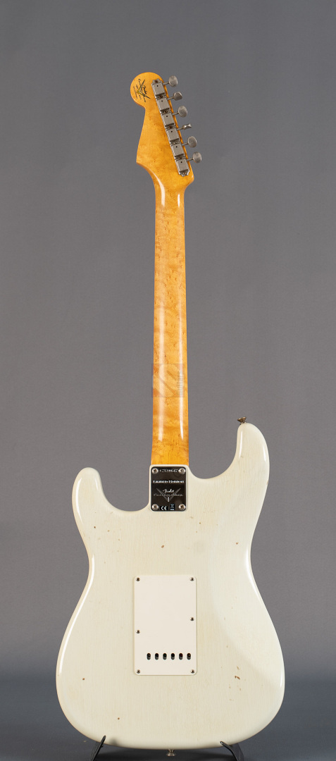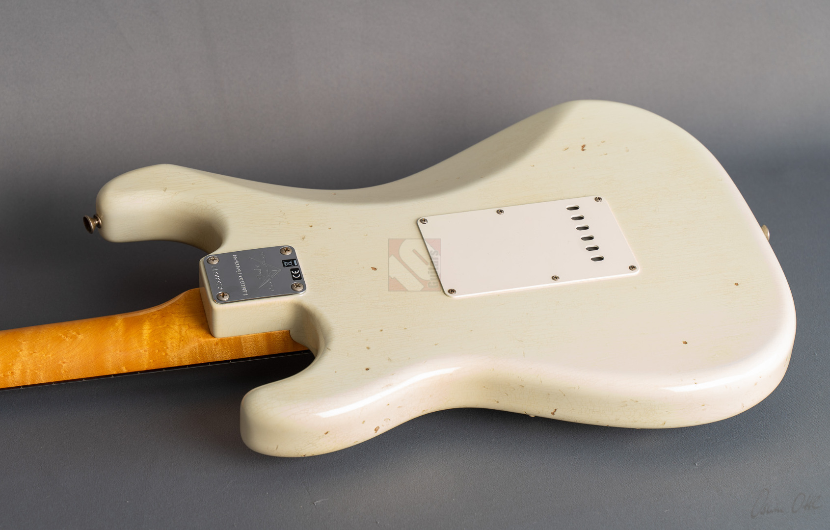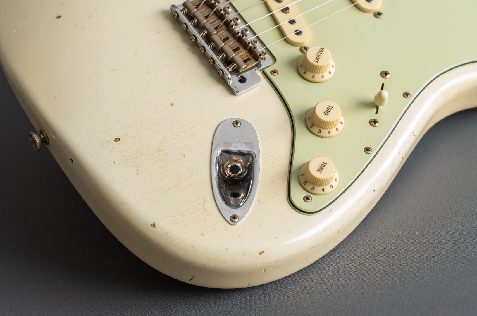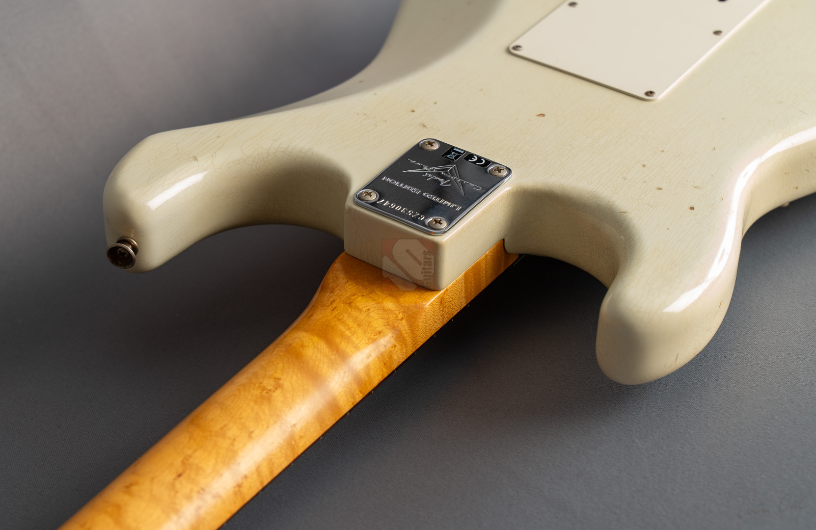 Diese Strat wurde speziell für die NAMM 2017 gebaut und da haben sich die Jungs des Fender Custom Shop wieder richtig ins Zeug gelegt. Kein Wunder, denn wie man schon an der Kopfplattenrückseite der Gitarre sehen kann, handelt es sich hier um ein "30th Anniversary"-Modell, das anlässlich des 30-jährigen Bestehens des Fender Custom Shop gefertigt wurde. ...und was für eine geile Stratocaster wir hier in Händen haben dürfen! Schon allein das super authentische Journeyman-Relicing des klasse vergilbten "Aged Olympic White"-Finish ist eine Augenweide. Wunderbar subtil mit zahlreichen Haarrissen und nur wenigen kleineren Macken wird hier eine phänomenale Vintage-Patina geschaffen. Passend dazu das äragerechte Greenguard und die geagten Pickup-Kappen und Poti-Knöpfe. Doch den optischen Höhepunkt bildet hier der wunderbar satinierte Neck aus fantastisch gemasertem AA-Birdseye-Maple. Nicht nur schön anzusehen, sondern auch ein haptisches Erlebnis, sodass man die Strat gar nicht mehr aus der Hand legen möchte. Dazu tragen natürlich auch der moderne 9,5''-Griffbrettradius, die bewährten 6105-Bünde und das komfortable "60 Style Oval C"-Halsprofil bei. Soundmäßig spielt man mit diesem Instrument in der absoluten Oberliga. Die "Handwound 60/63"-Pickups sorgen für genau den Stratocaster-Sound, den man kennt und liebt: glockig, sowohl clean wie auch mit Zerre richtig saftig, gerne auch schmatzig und kräftig, aber auch transparent und sehr definiert. Echter Vintage-Sound: rund, sehr ausgeglichen und auch ganz leicht komprimiert. So freuen wir uns, Euch dieses soundmächtige Prachtstück inklusive den Bünden in Top-Zustand anbieten zu können.