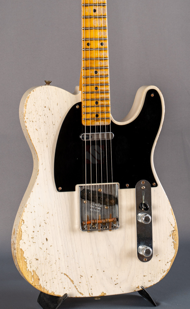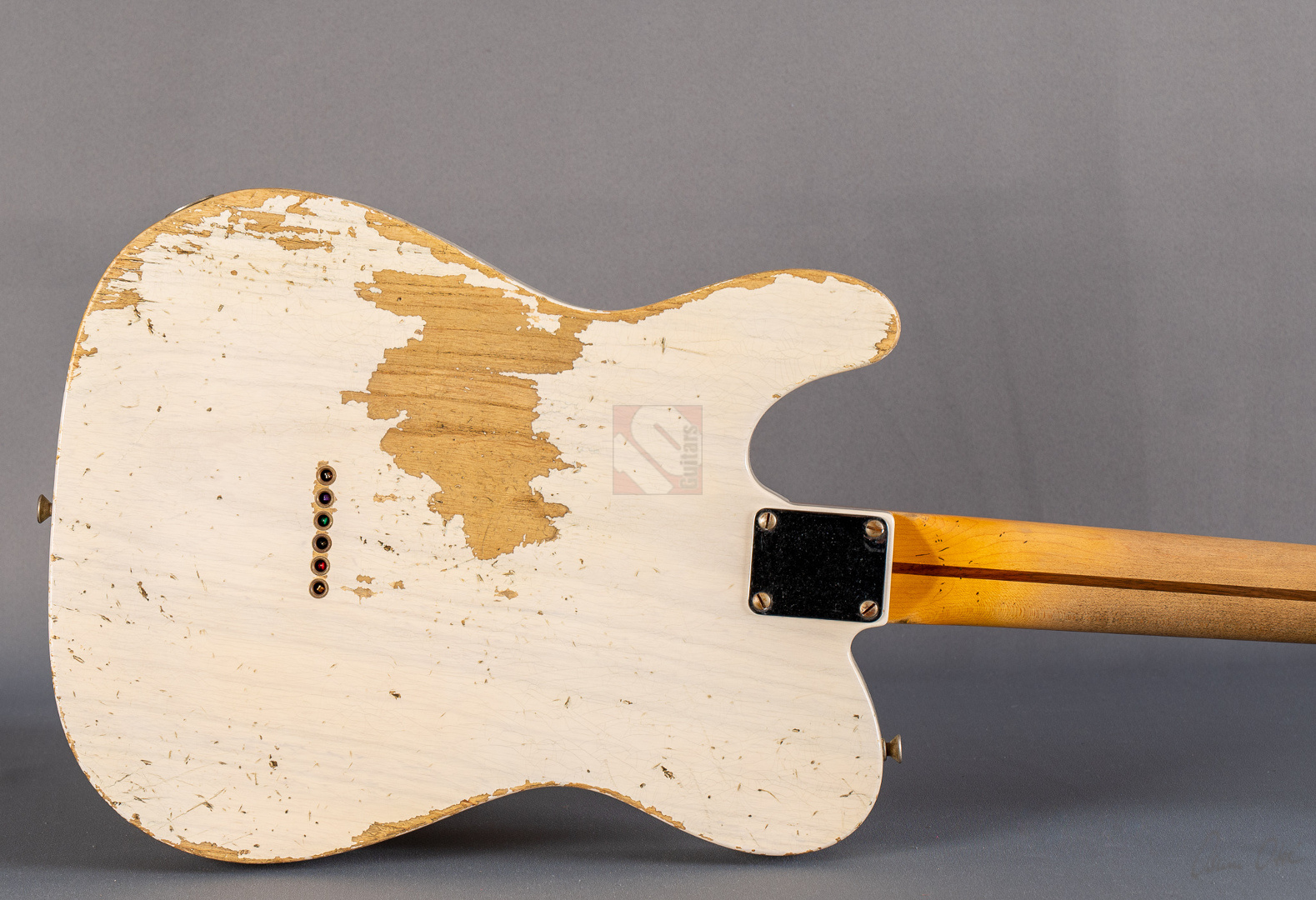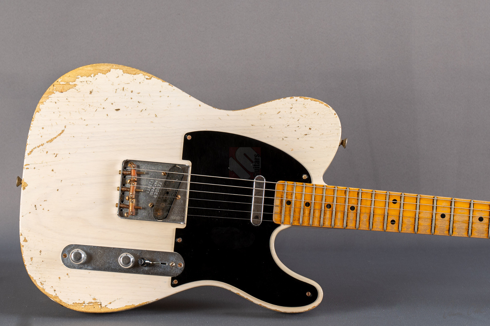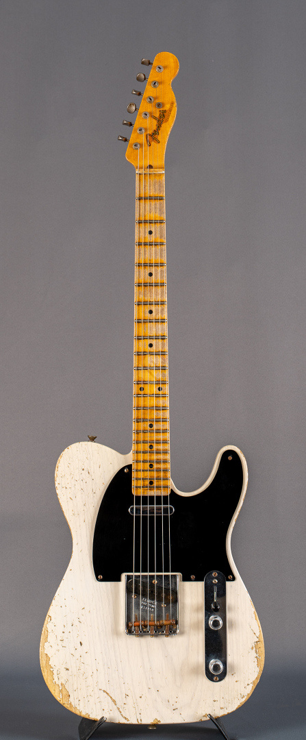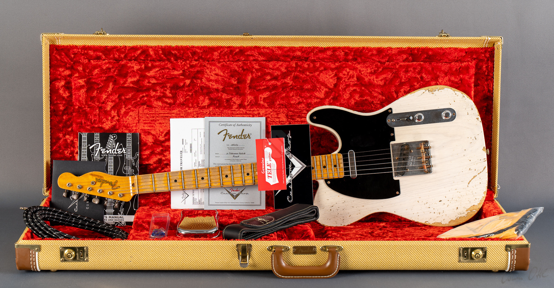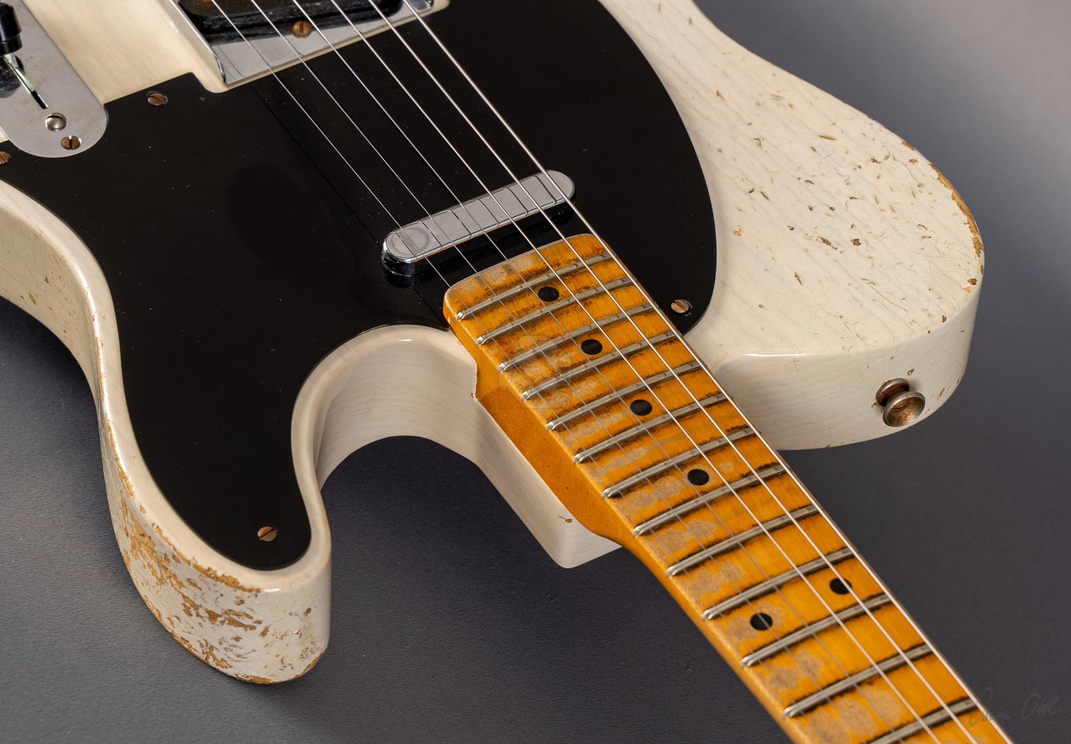 Wie viel Mojo kann eine Gitarre haben? Bei der vorliegenden 1952 Telecaster in "Heavy Relic White Blonde" kommen einem bei dieser Frage nur Superlative in den Sinn. Hier ist alles dabei, was eine Traum-Tele ausmacht. Der interessante Look des besonderen Finish in Verbindung mit dem schwarzen Pickguard und dem Maple-Neck lässt den Rock'n'Roll bereits aus dem Koffer strömen. Und wenn man sie in die Hand nimmt, über den hauchdünnen Nitrolack des Bodys und die entlackte Halsrückseite des Ahornhalses streicht, ahnt man, dass die Optik nicht zu viel verspricht. Tatsächlich schwingt die Gitarre mit dem Idealgewicht von 3230 Gramm und dem komfortablen "Nocaster U"-Halsprofil ab dem ersten Akkord, als wäre sie wirklich schon 70 Jahre alt. Klasse Resonanzverhalten, laut, ausgewogen und mit genau den richtigen Bässen und Mitten. Der 9,5"-Griffbrettradius sorgt darüber hinaus in Verbindung mit den bewährten 6105-Bünden für ein klasse Handling und besten Spielkomfort. Am Amp einfach Tele at its Best! Warm und bluesy kommt der "Twisted Tele"-Pickup am Hals daher, der "51 Nocaster"-Tonabnehmer am Steg liefert kräftigsten Twang, setzt sich klasse durch und klingt nie dünn oder zu nasal. Gerade bei angezerrten und verzerrten Sounds ein super Frequenzspektrum. Diese Tele macht einfach nur Spaß! So freuen wir uns, Euch dieses Spitzeninstrument inklusive den Bünden in Top-Zustand anbieten zu können.