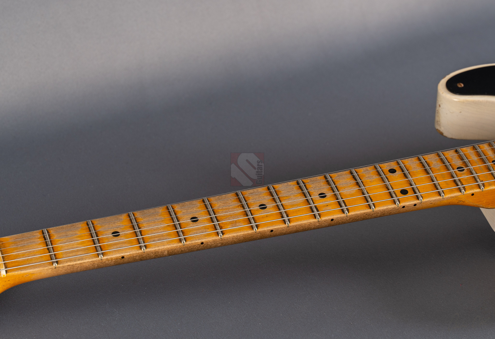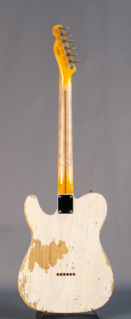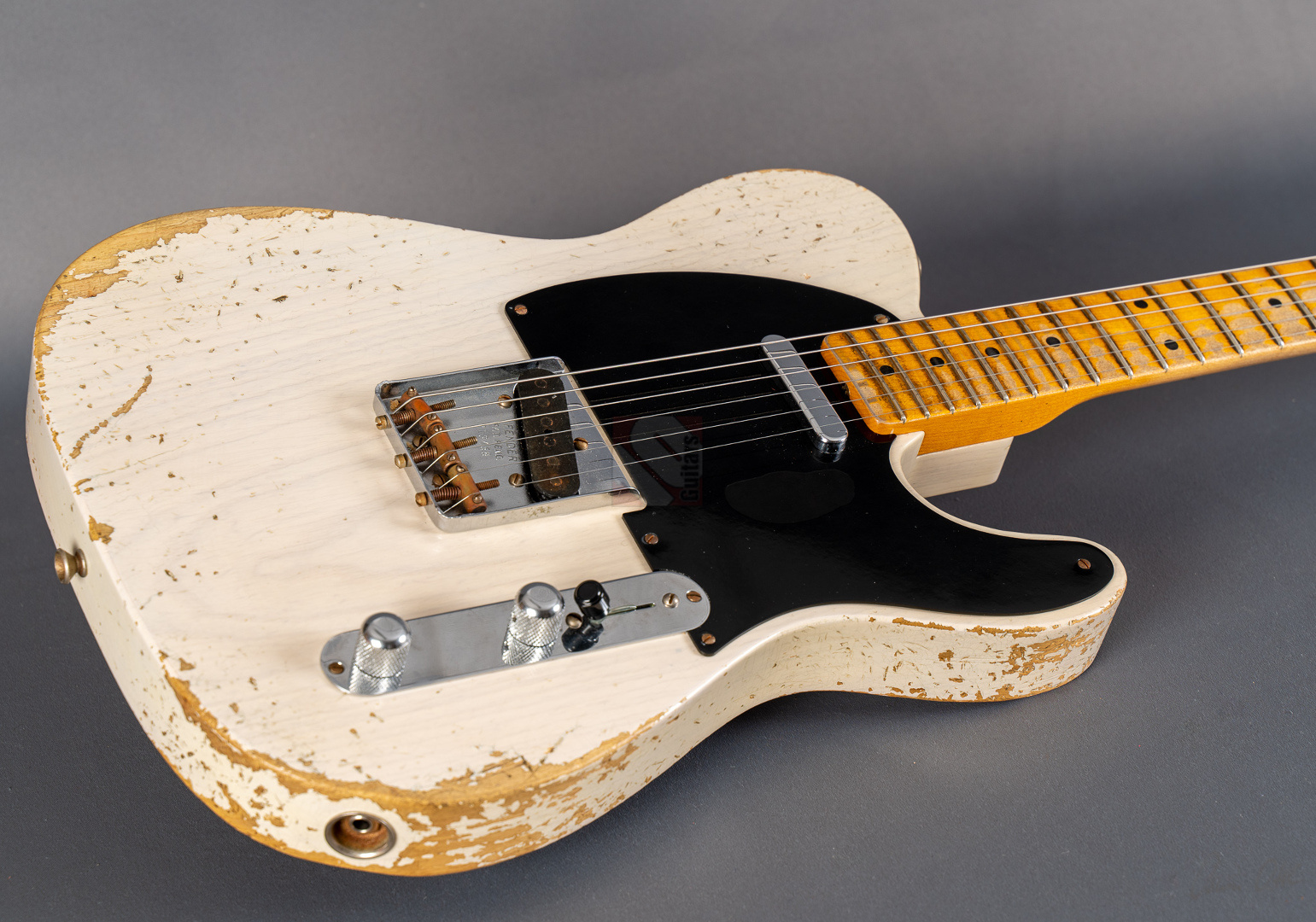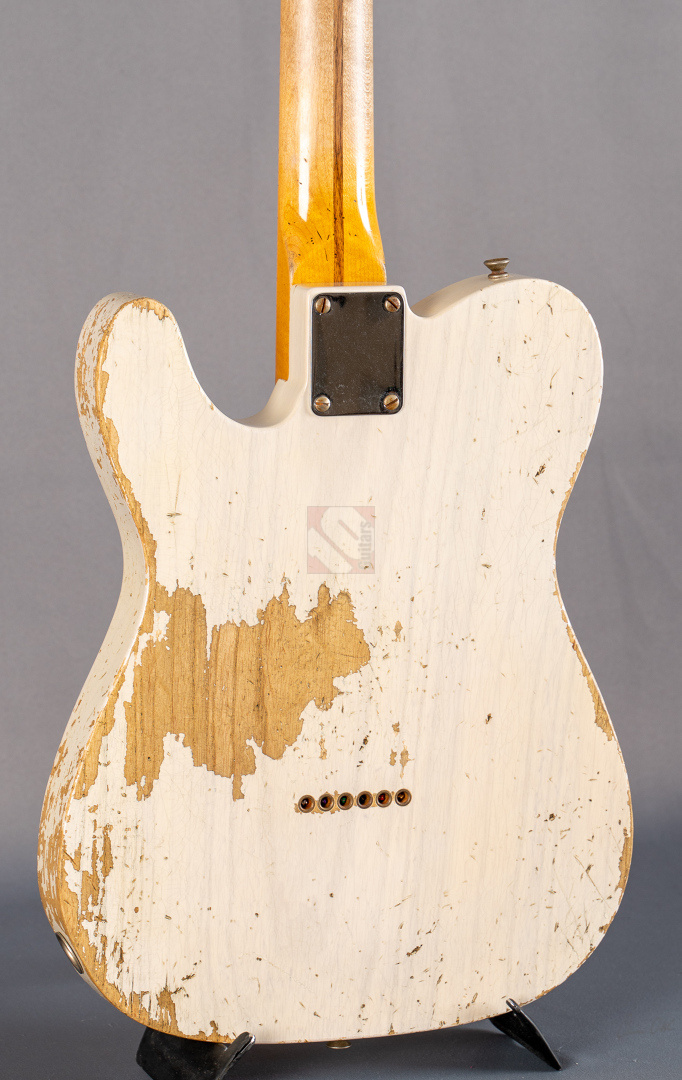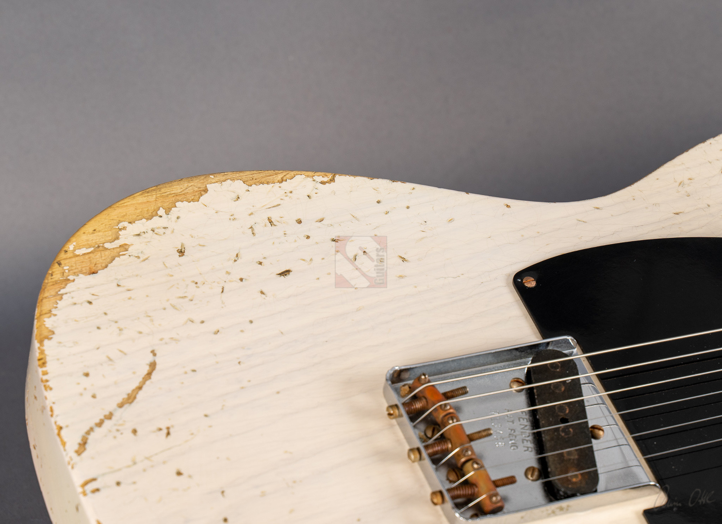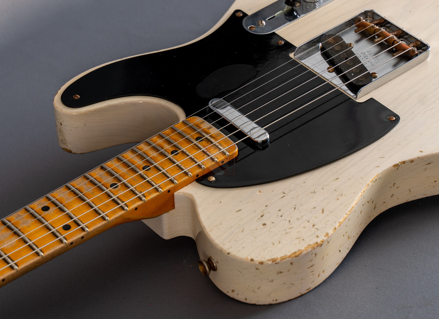 Wie viel Mojo kann eine Gitarre haben? Bei der vorliegenden 1952 Telecaster in "Heavy Relic White Blonde" kommen einem bei dieser Frage nur Superlative in den Sinn. Hier ist alles dabei, was eine Traum-Tele ausmacht. Der interessante Look des besonderen Finish in Verbindung mit dem schwarzen Pickguard und dem Maple-Neck lässt den Rock'n'Roll bereits aus dem Koffer strömen. Und wenn man sie in die Hand nimmt, über den hauchdünnen Nitrolack des Bodys und die entlackte Halsrückseite des Ahornhalses streicht, ahnt man, dass die Optik nicht zu viel verspricht. Tatsächlich schwingt die Gitarre mit dem Idealgewicht von 3230 Gramm und dem komfortablen "Nocaster U"-Halsprofil ab dem ersten Akkord, als wäre sie wirklich schon 70 Jahre alt. Klasse Resonanzverhalten, laut, ausgewogen und mit genau den richtigen Bässen und Mitten. Der 9,5"-Griffbrettradius sorgt darüber hinaus in Verbindung mit den bewährten 6105-Bünden für ein klasse Handling und besten Spielkomfort. Am Amp einfach Tele at its Best! Warm und bluesy kommt der "Twisted Tele"-Pickup am Hals daher, der "51 Nocaster"-Tonabnehmer am Steg liefert kräftigsten Twang, setzt sich klasse durch und klingt nie dünn oder zu nasal. Gerade bei angezerrten und verzerrten Sounds ein super Frequenzspektrum. Diese Tele macht einfach nur Spaß! So freuen wir uns, Euch dieses Spitzeninstrument inklusive den Bünden in Top-Zustand anbieten zu können.