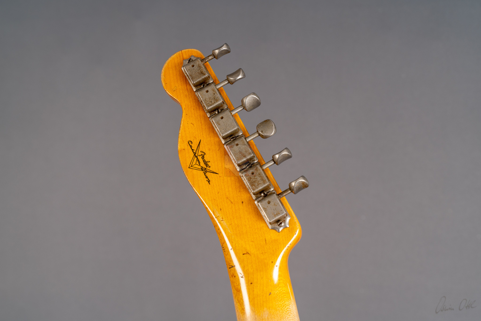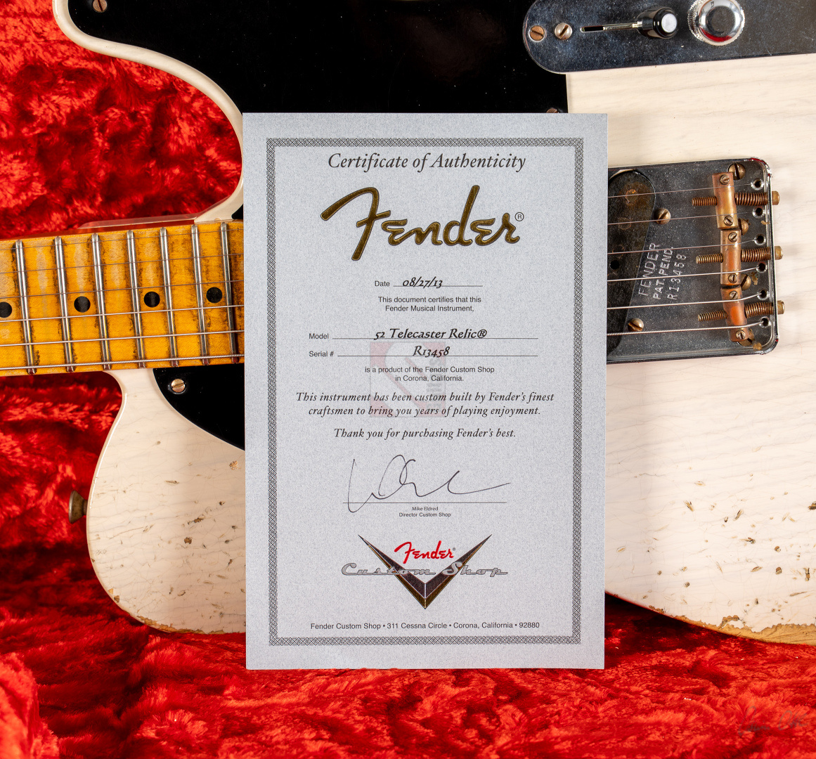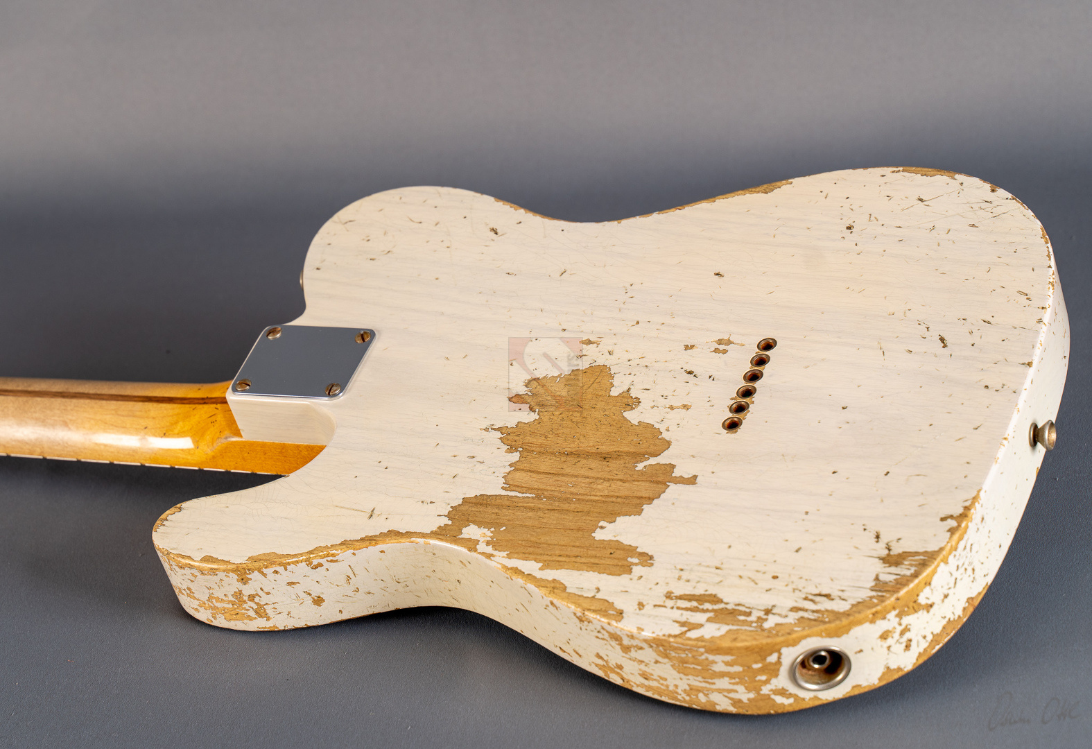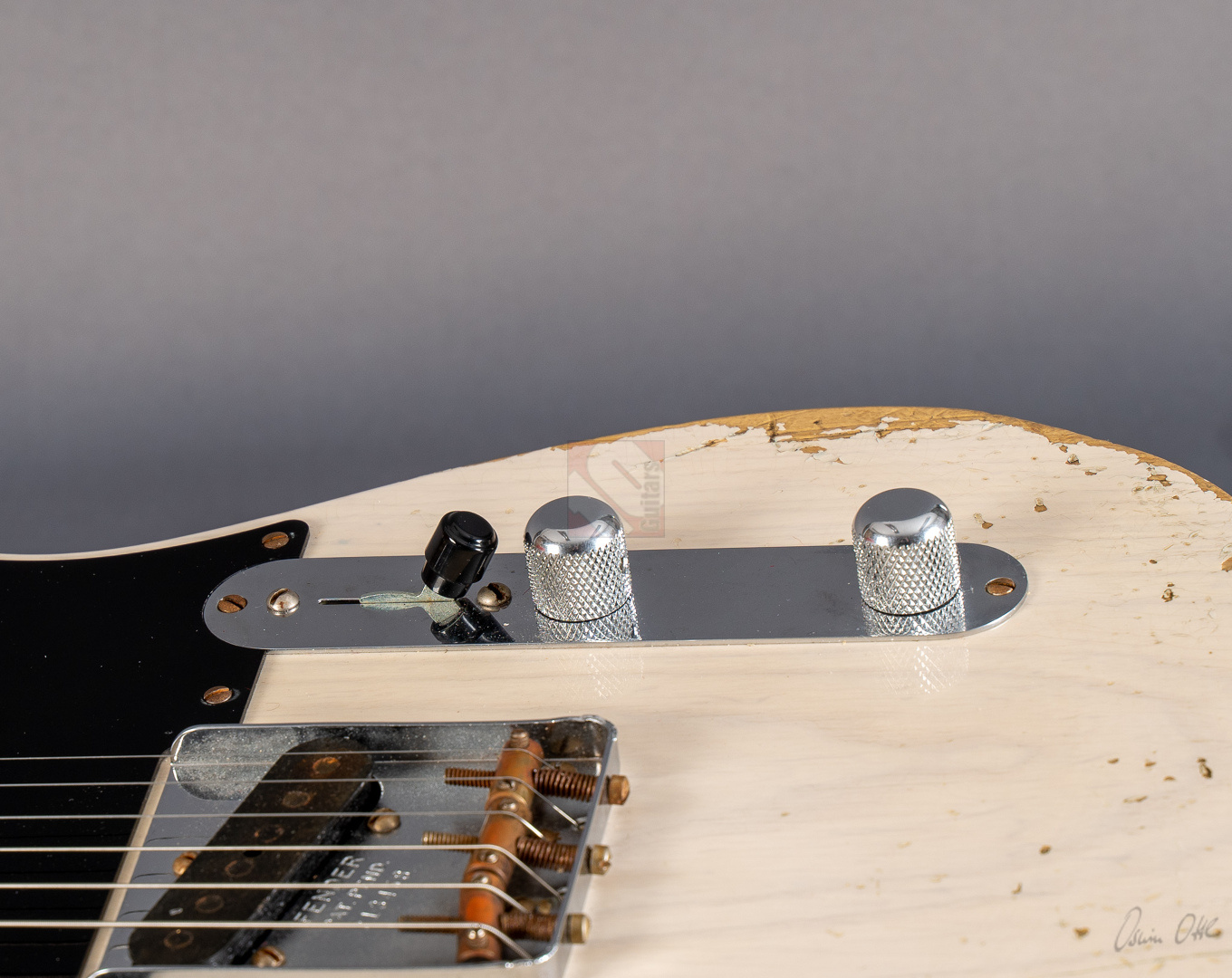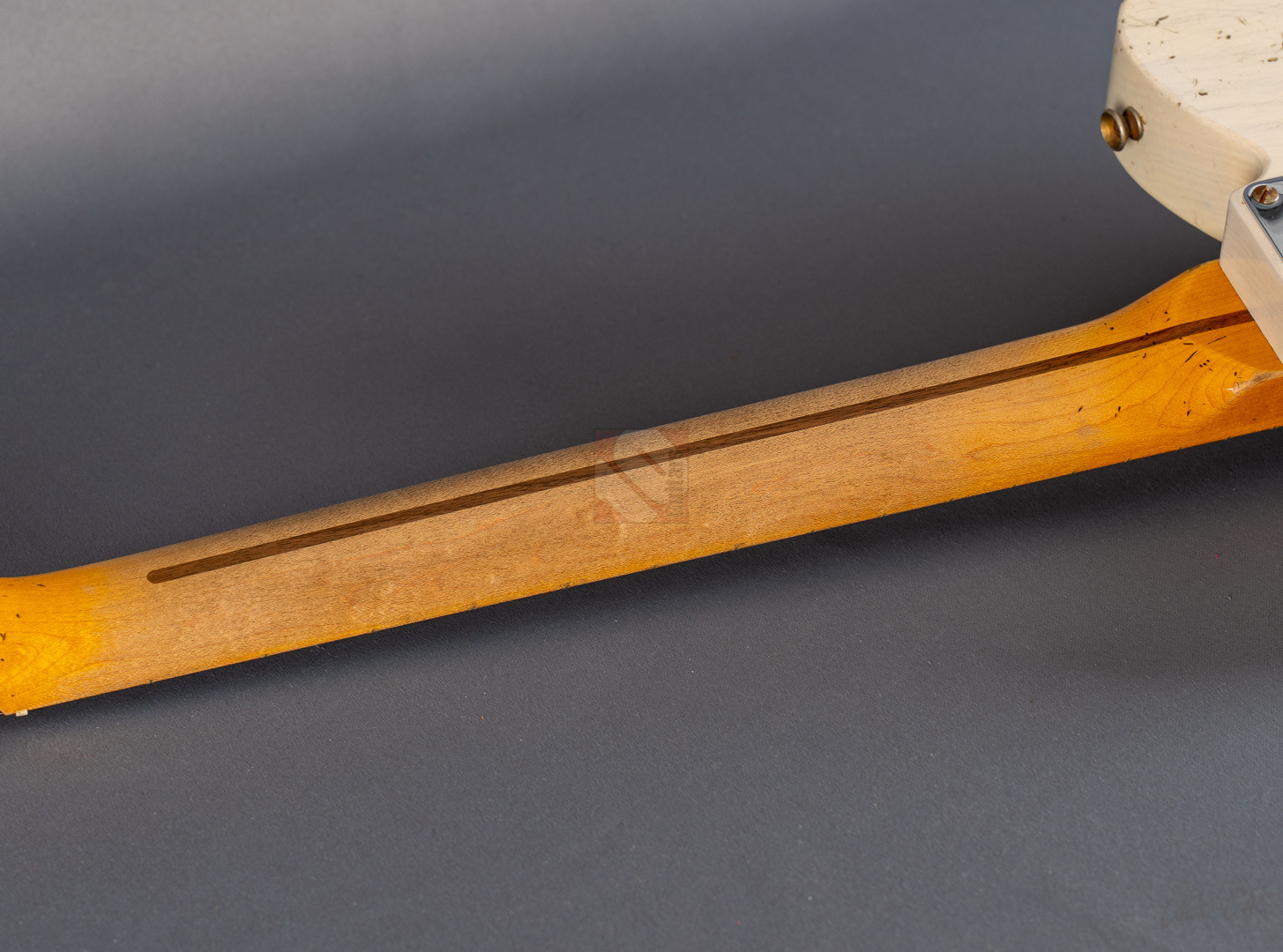 Wie viel Mojo kann eine Gitarre haben? Bei der vorliegenden 1952 Telecaster in "Heavy Relic White Blonde" kommen einem bei dieser Frage nur Superlative in den Sinn. Hier ist alles dabei, was eine Traum-Tele ausmacht. Der interessante Look des besonderen Finish in Verbindung mit dem schwarzen Pickguard und dem Maple-Neck lässt den Rock'n'Roll bereits aus dem Koffer strömen. Und wenn man sie in die Hand nimmt, über den hauchdünnen Nitrolack des Bodys und die entlackte Halsrückseite des Ahornhalses streicht, ahnt man, dass die Optik nicht zu viel verspricht. Tatsächlich schwingt die Gitarre mit dem Idealgewicht von 3230 Gramm und dem komfortablen "Nocaster U"-Halsprofil ab dem ersten Akkord, als wäre sie wirklich schon 70 Jahre alt. Klasse Resonanzverhalten, laut, ausgewogen und mit genau den richtigen Bässen und Mitten. Der 9,5"-Griffbrettradius sorgt darüber hinaus in Verbindung mit den bewährten 6105-Bünden für ein klasse Handling und besten Spielkomfort. Am Amp einfach Tele at its Best! Warm und bluesy kommt der "Twisted Tele"-Pickup am Hals daher, der "51 Nocaster"-Tonabnehmer am Steg liefert kräftigsten Twang, setzt sich klasse durch und klingt nie dünn oder zu nasal. Gerade bei angezerrten und verzerrten Sounds ein super Frequenzspektrum. Diese Tele macht einfach nur Spaß! So freuen wir uns, Euch dieses Spitzeninstrument inklusive den Bünden in Top-Zustand anbieten zu können.