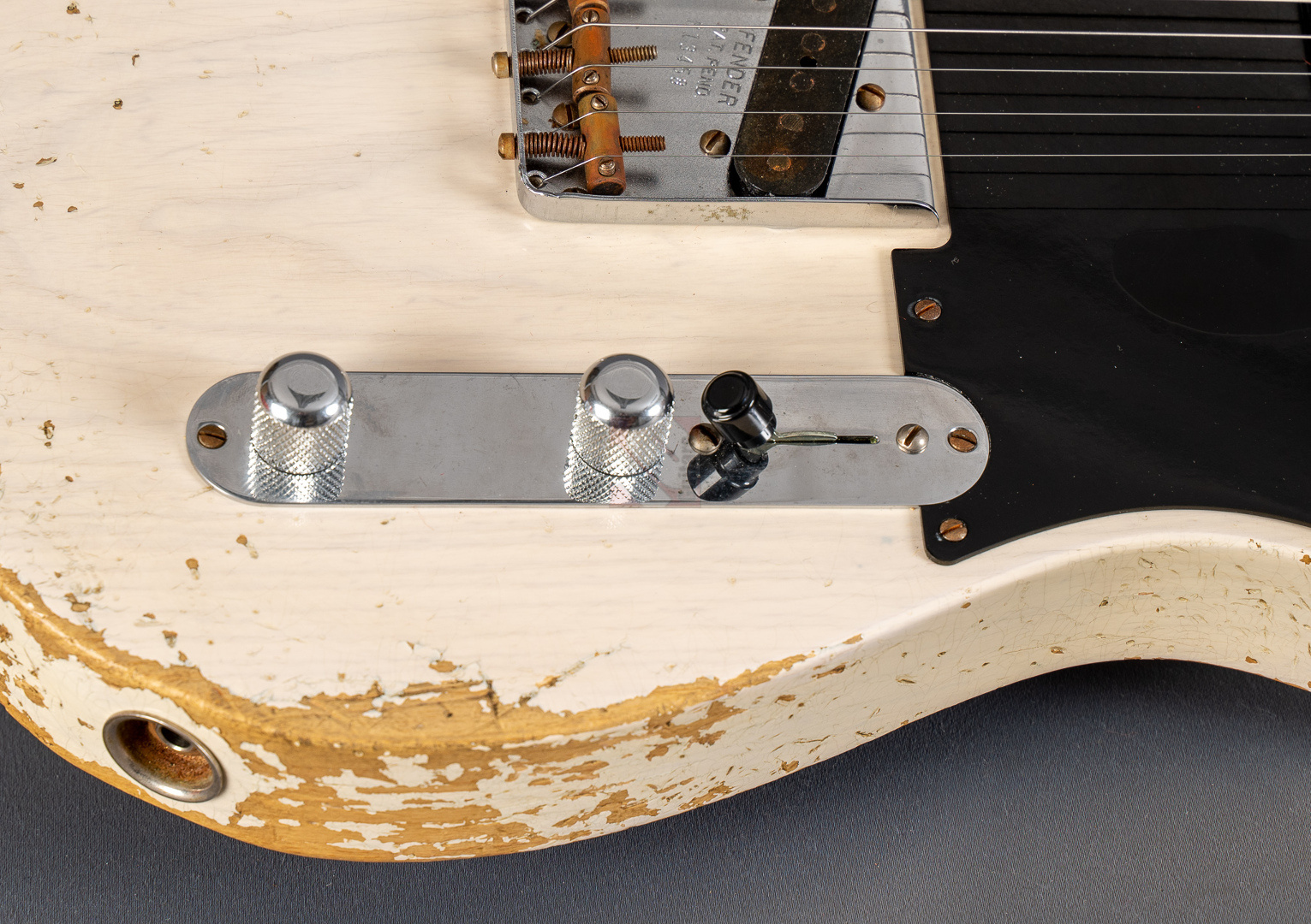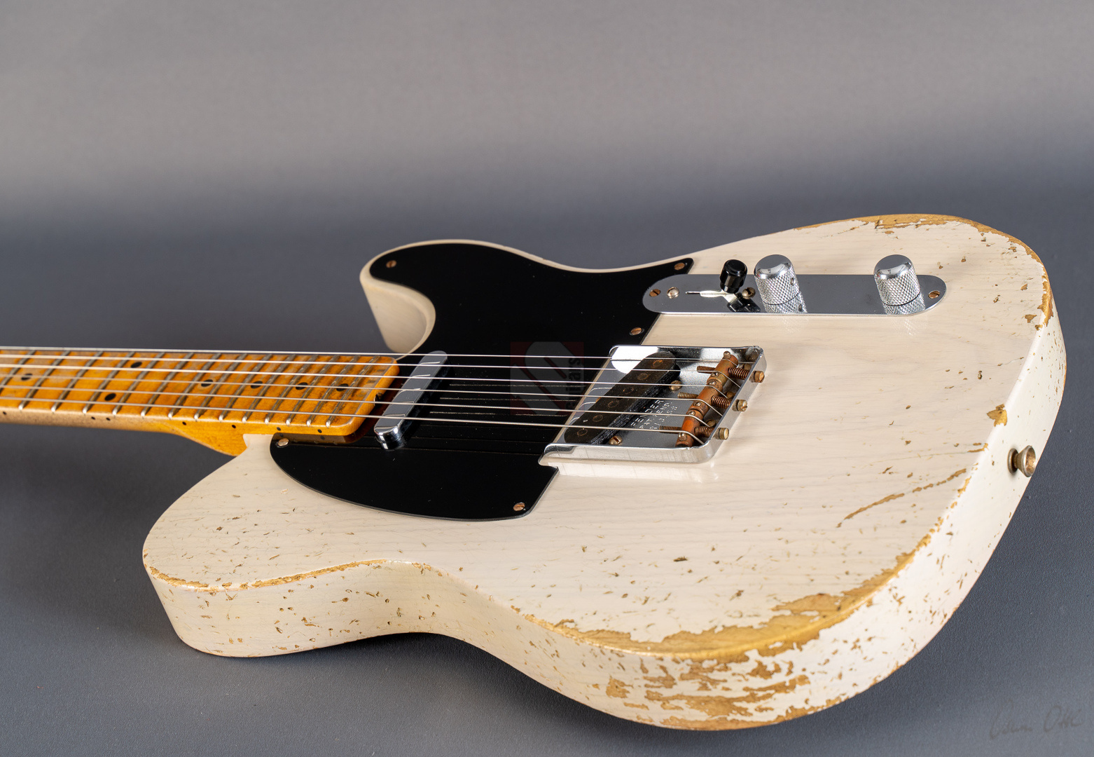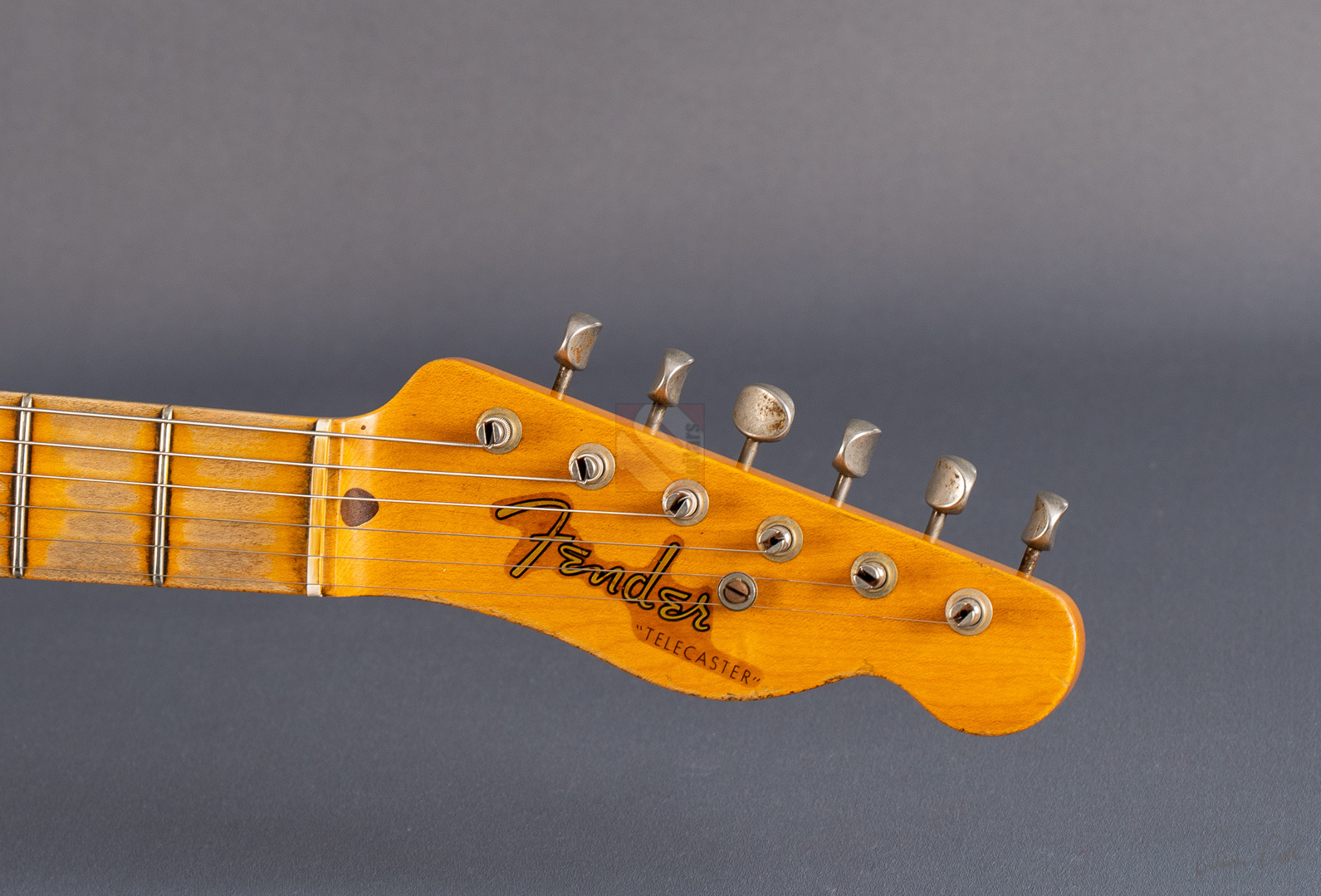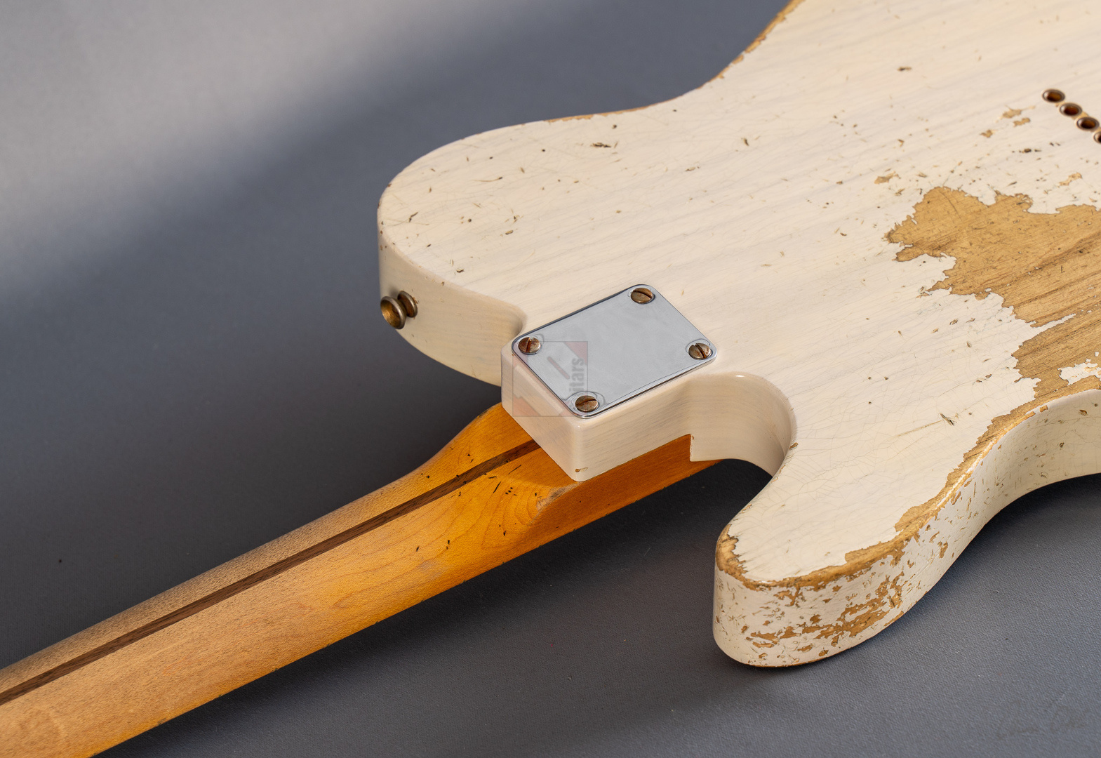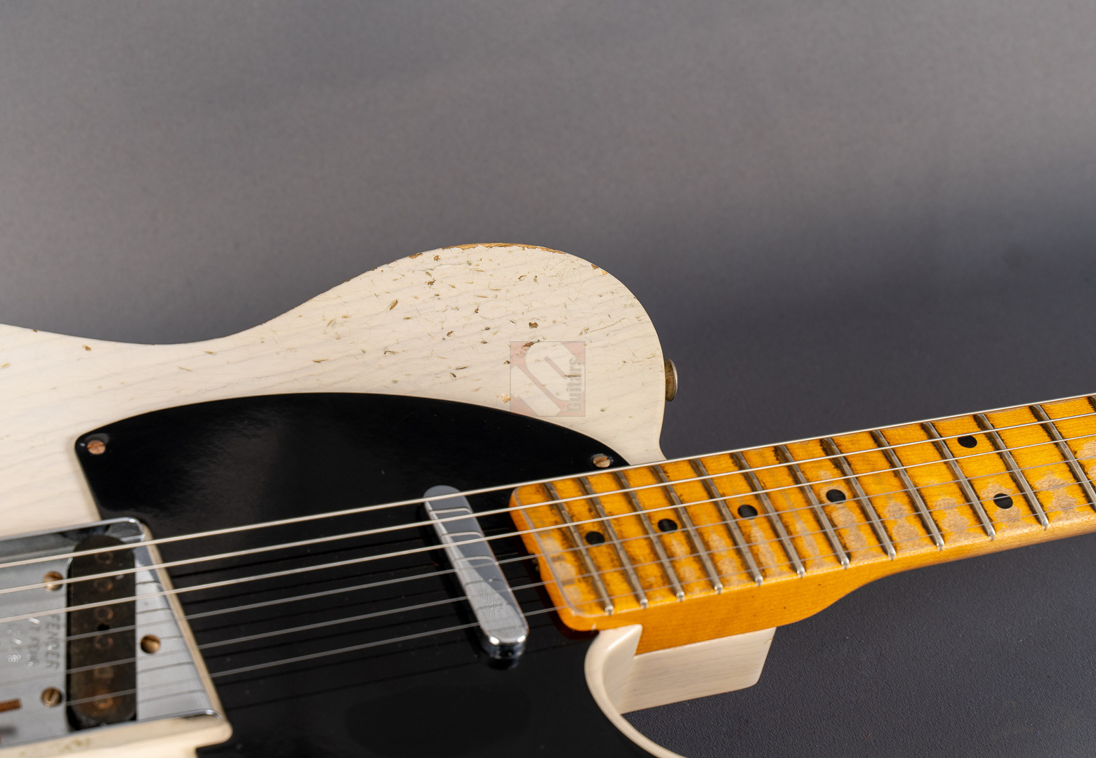 Wie viel Mojo kann eine Gitarre haben? Bei der vorliegenden 1952 Telecaster in "Heavy Relic White Blonde" kommen einem bei dieser Frage nur Superlative in den Sinn. Hier ist alles dabei, was eine Traum-Tele ausmacht. Der interessante Look des besonderen Finish in Verbindung mit dem schwarzen Pickguard und dem Maple-Neck lässt den Rock'n'Roll bereits aus dem Koffer strömen. Und wenn man sie in die Hand nimmt, über den hauchdünnen Nitrolack des Bodys und die entlackte Halsrückseite des Ahornhalses streicht, ahnt man, dass die Optik nicht zu viel verspricht. Tatsächlich schwingt die Gitarre mit dem Idealgewicht von 3230 Gramm und dem komfortablen "Nocaster U"-Halsprofil ab dem ersten Akkord, als wäre sie wirklich schon 70 Jahre alt. Klasse Resonanzverhalten, laut, ausgewogen und mit genau den richtigen Bässen und Mitten. Der 9,5"-Griffbrettradius sorgt darüber hinaus in Verbindung mit den bewährten 6105-Bünden für ein klasse Handling und besten Spielkomfort. Am Amp einfach Tele at its Best! Warm und bluesy kommt der "Twisted Tele"-Pickup am Hals daher, der "51 Nocaster"-Tonabnehmer am Steg liefert kräftigsten Twang, setzt sich klasse durch und klingt nie dünn oder zu nasal. Gerade bei angezerrten und verzerrten Sounds ein super Frequenzspektrum. Diese Tele macht einfach nur Spaß! So freuen wir uns, Euch dieses Spitzeninstrument inklusive den Bünden in Top-Zustand anbieten zu können.