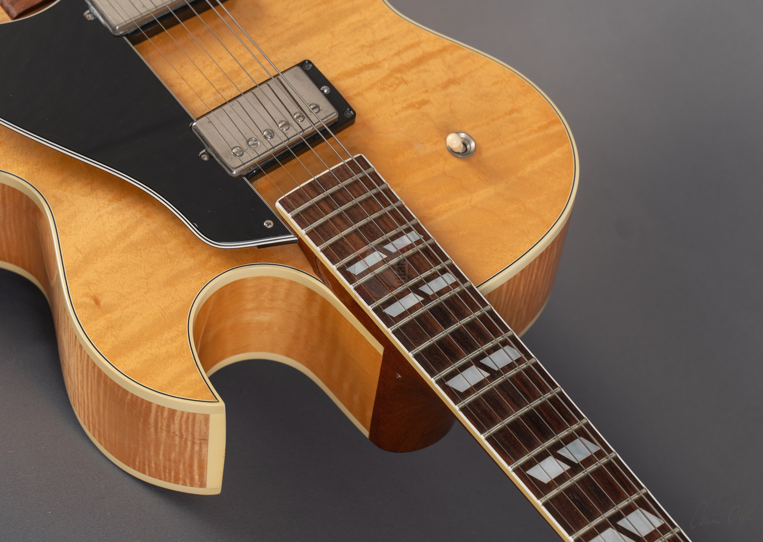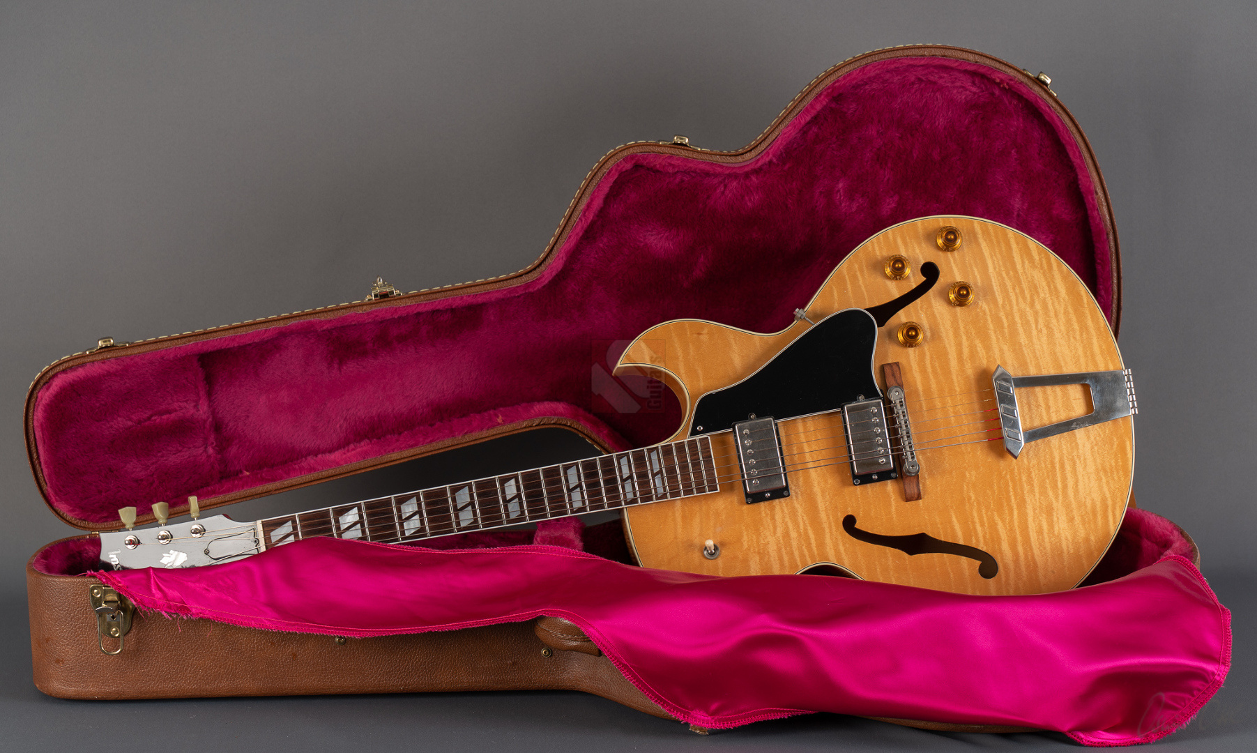 Was für eine unglaubliche Gibson ES-175! Beim ersten Blick in den Koffer kann man gar nicht glauben, dass diese Gitarre fast 30 Jahre alt ist. Super Zustand, eine wunderschöne Decke, intensiv geriegelte Zargen und Boden. Der Hals ist perfekt gerade und die etwas höheren Bünde sind in Top-Zustand. Traumhafte Bespielbarkeit und am Amp einfach Jazz pur! Der Hals-Pickup ist angenehm warm, ohne dabei dumpf zu wirken. Schön differenziert mit einem enorm schönen Ton. Hier will man jeden Ton auskosten. Die Gitarre ist wunderbar eingespielt und am Ton merkt man ihr die fast 30 Jahre im positiven Sinne an. Dazu kommt, dass sie auch schon etwas nachgedunkelt ist, was die Optik nochmals verbessert. 100-Punkte Jazz- und Blues-Halbakustik, bei der Spielfreude pur aufkommt. Bis auf ein paar kleinere Gürtelschnallenkratzer auf der Rückseite befindet sie sich in Traumzustand.