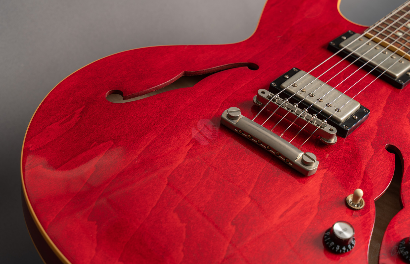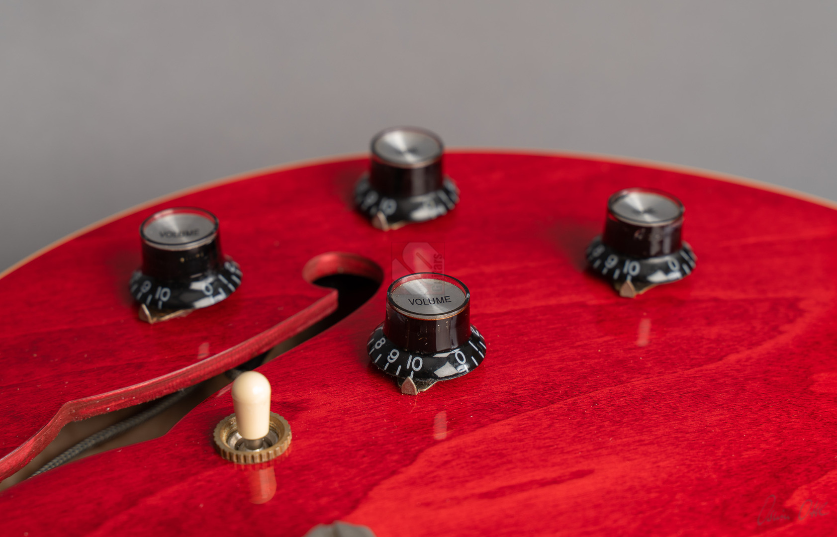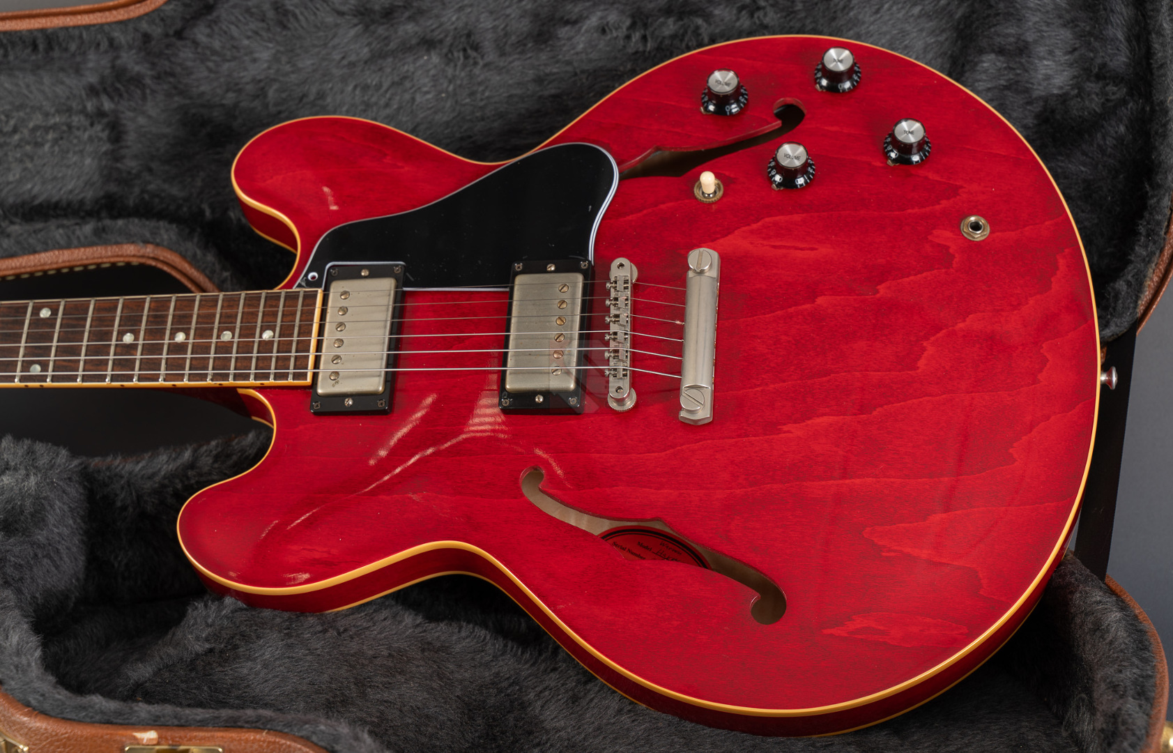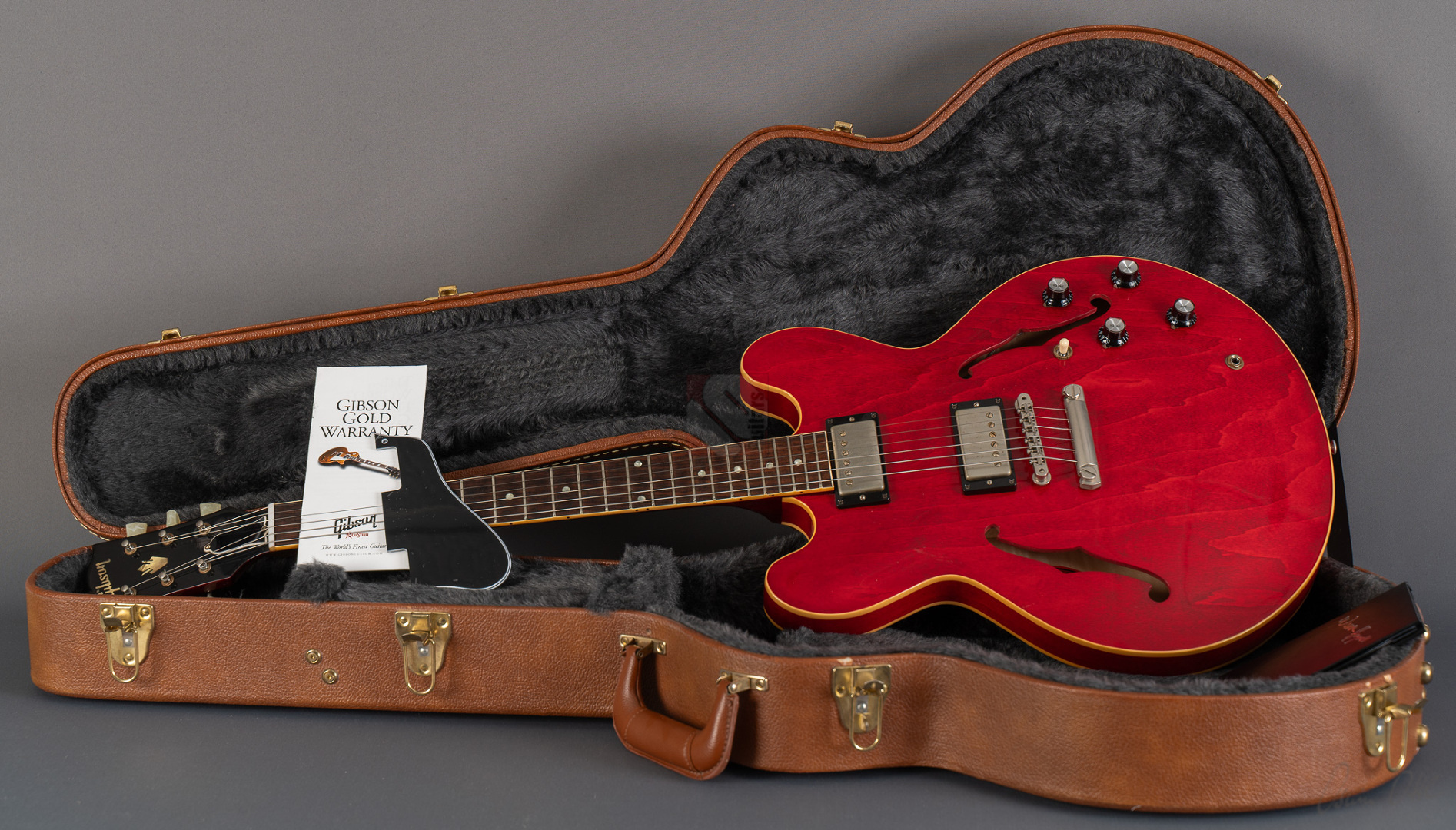 Heute dürfen wir Euch ein Exemplar der äußerst begehrten, limitierten Warren Haynes ES-335 Signature-Modelle anbieten. Schon beim ersten Blick verliebt man sich in die unterschiedlichen Facetten des traumhaften "Faded Cherry"-Finish und in die spektakuläre Maserung. Letzterem ist es auch geschuldet, dass hier zwar ein Pickguard beiliegend ist, die entsprechenden Löcher aber nicht gebohrt wurden. Das macht Gibson nur bei besonders schön gemaserten Gitarren, indem sie die perfekte Optik nicht einmal durch zwei kleine Bohrungen stören wollen. Top! Unser Exemplar trägt die Seriennummer 36 von insgesamt lediglich 500 gefertigten Haynes-Signatures weltweit. Eine 61er Reissue in Perfektion und zudem durch die charmante Farbe mit dem gewissen Etwas ausgestattet, das Herzen schneller schlagen lässt. Gibson hat sich hier strikt an das Original von Warren Haynes gehalten und dabei auf besonders leichte Hölzer geachtet. Gerade für den Hals und Body wurde "Lightweight Mahagony" selektiert und für den Center-Block hat Gibson selektiertes Ahorn verwendet. Das Ergebnis ist ein überaus resonantes Schwingungsmonster mit zahlreichen tonalen Facetten. Diese ES-335 mit zwei Burstbuckers klingt überragend, keinerlei überbetonte Frequenzen. Klasse Dynamik, super Sustain, gepaart mit einem druckvollen aber stets holzigen Hollowbody-Charakter! Auch das medium "Custom '61 Haynes"-Halsprofil liegt perfekt in der Hand und lädt zu stundenlangem Spielspaß ein. Ein solch fantastisches Gesamtpaket, das darüber hinaus auch noch besten Werterhalt gewährleistet, dürfte in dieser Form vermutlich nicht nochmals zu einem solch absoluten Vorzugspreis zu finden sein. Daher freut es uns außerordentlich, Euch diese besondere Semi-Hollow in Top-Zustand anbieten zu können.