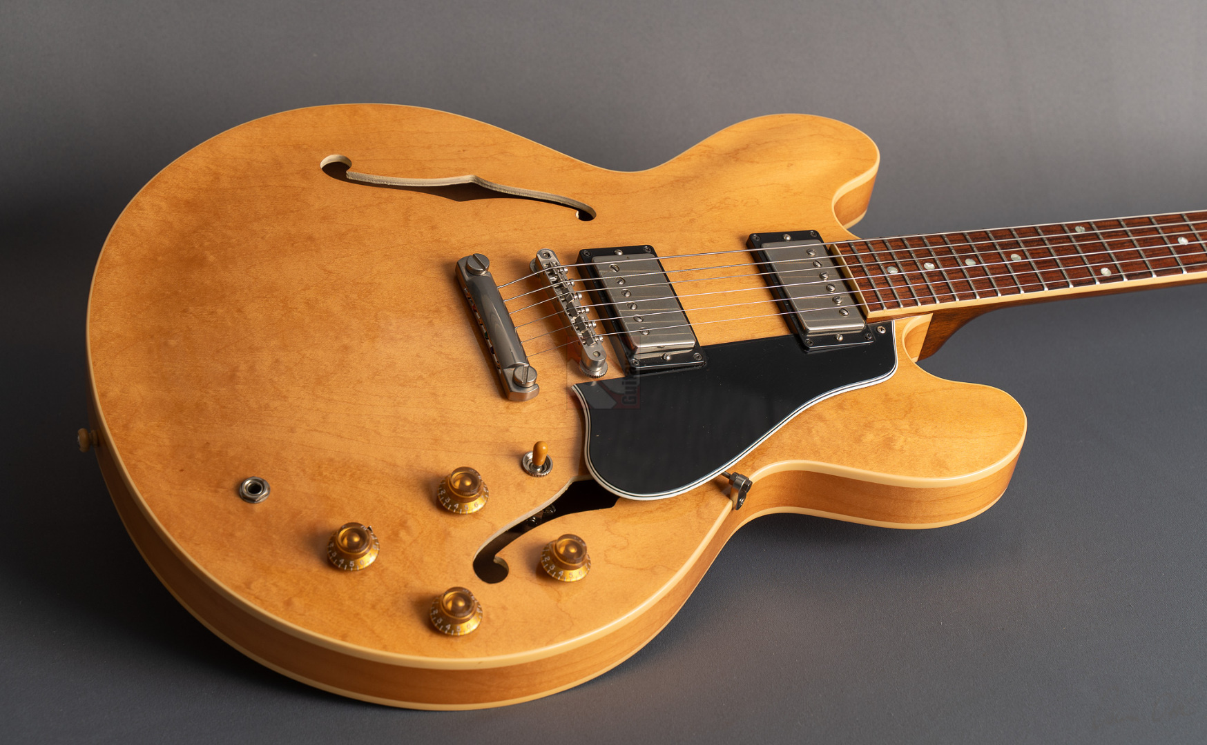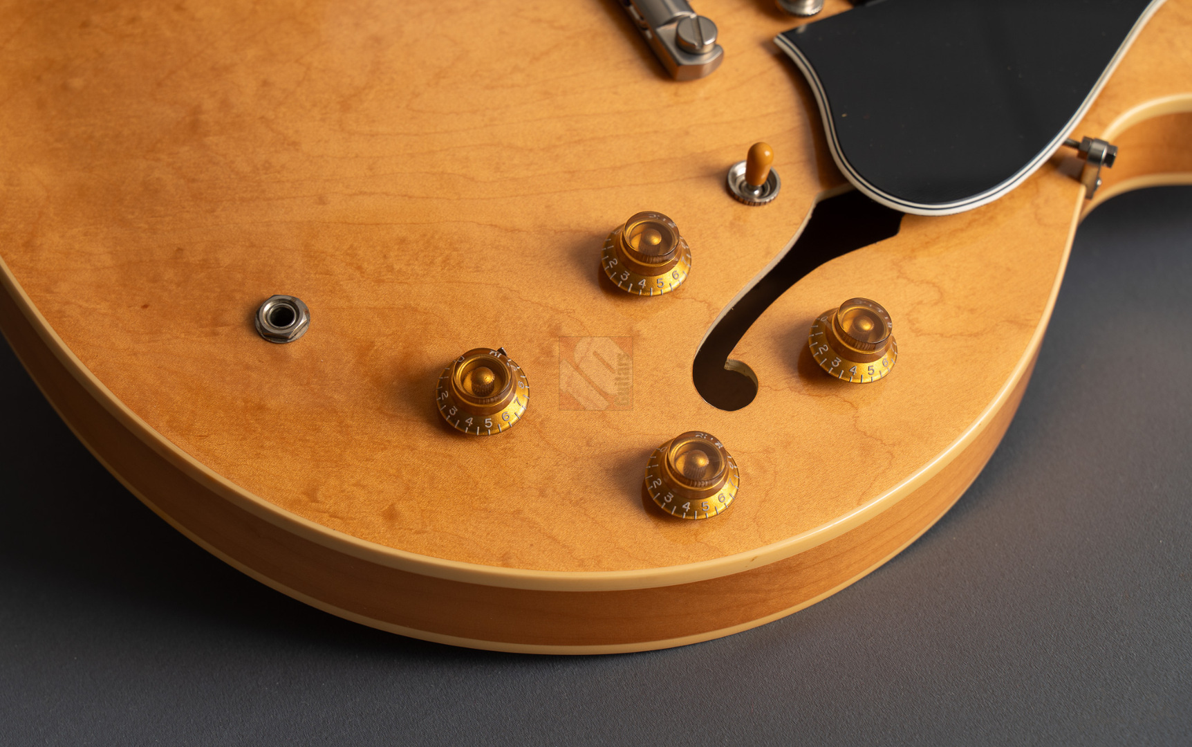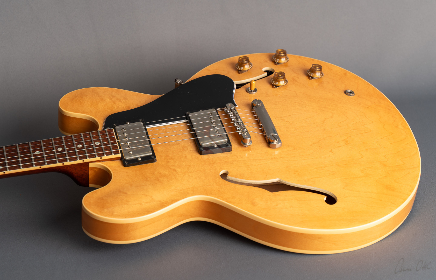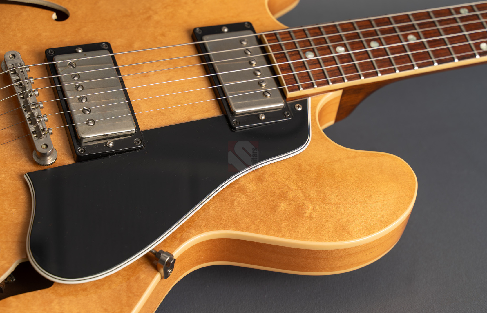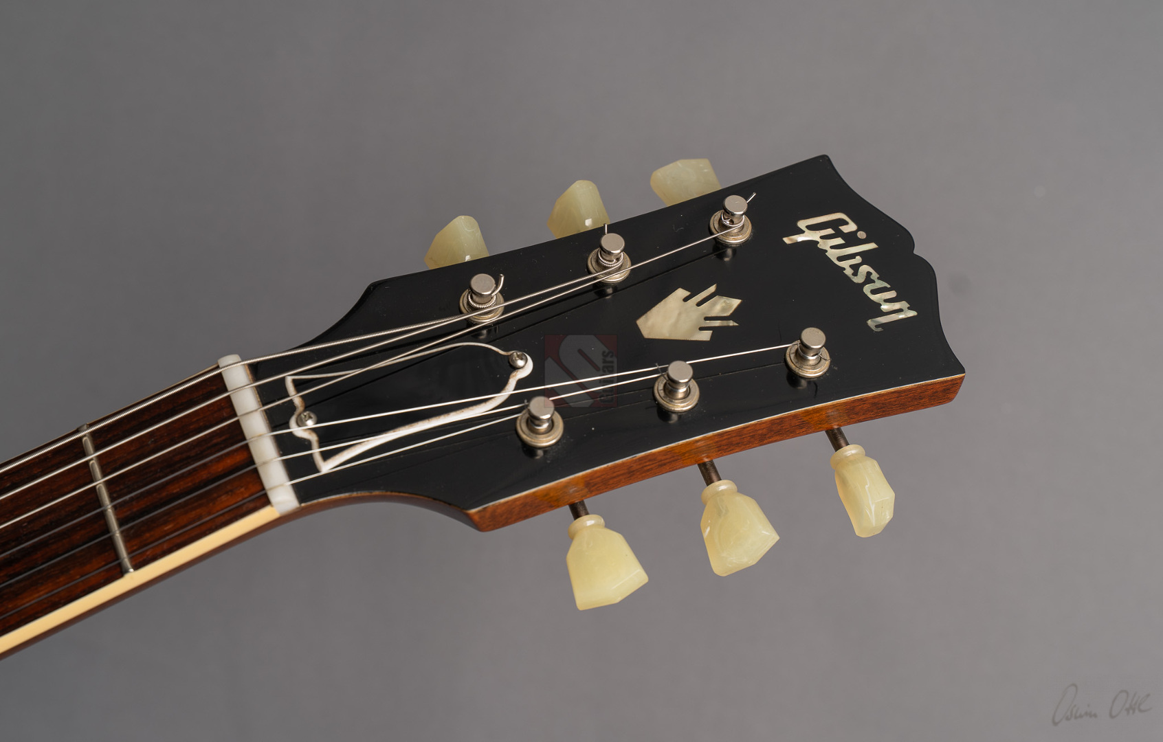 Hier haben wir ein ganz besonderes Highlite für alle 335-Freunde, die den etwas kräftigeren '59-Neck und Vintage-Sound pur suchen. Auch der Look kann hier voll überzeugen. Mickey-Mouse-Ears, "Vintage Natural"-Finish, schon ganz leicht nachgedunkelt und mit einer wunderschönen Decke mit einer leichten Birds-Eye-Maserung. Ausgesuchte Hölzer und natürlich haben wir hier auch die neuen Features wie Historic-Truss-Rod, Rolled-Neck-Binding, "One Piece"-Mahagoni-Neck und Hide-Glue. Um den Sound noch zu optimieren hat der Vorbesitzer die MHS-Humbucker gegen OX-4-Pickups, underwound Alnico-4 Double-Cream, ausgetauscht. Die OX-4-Pickups zählen mit zu den besten Vintage-Replikas, die man zur Zeit bekommen kann. Mark Knopfler, Johnny Marr, Noel Gallagher, Larry Carlton und viele mehr spielen diese Pickups. Und am Amp zeigt sich dann auch, warum sie so beliebt sind. Jede Soundnuance und Anschlagsdynamik wird hier bestens übertragen. Man kann hier super mit dem Ton arbeiten und das langsame Spielen wird zum Genuss. Sehr dynamisch mit einem breiten Frequenzspektrum und dem klassischen alten PAF-Sound, ...muss man gehört haben. Die originalen Pickups sind mit dabei. Traumhafte ES-335, bis auf ein paar kleinere Spielspuren in einem sehr guten Zustand. Die Bünde haben so gut wie keine Spielspuren.