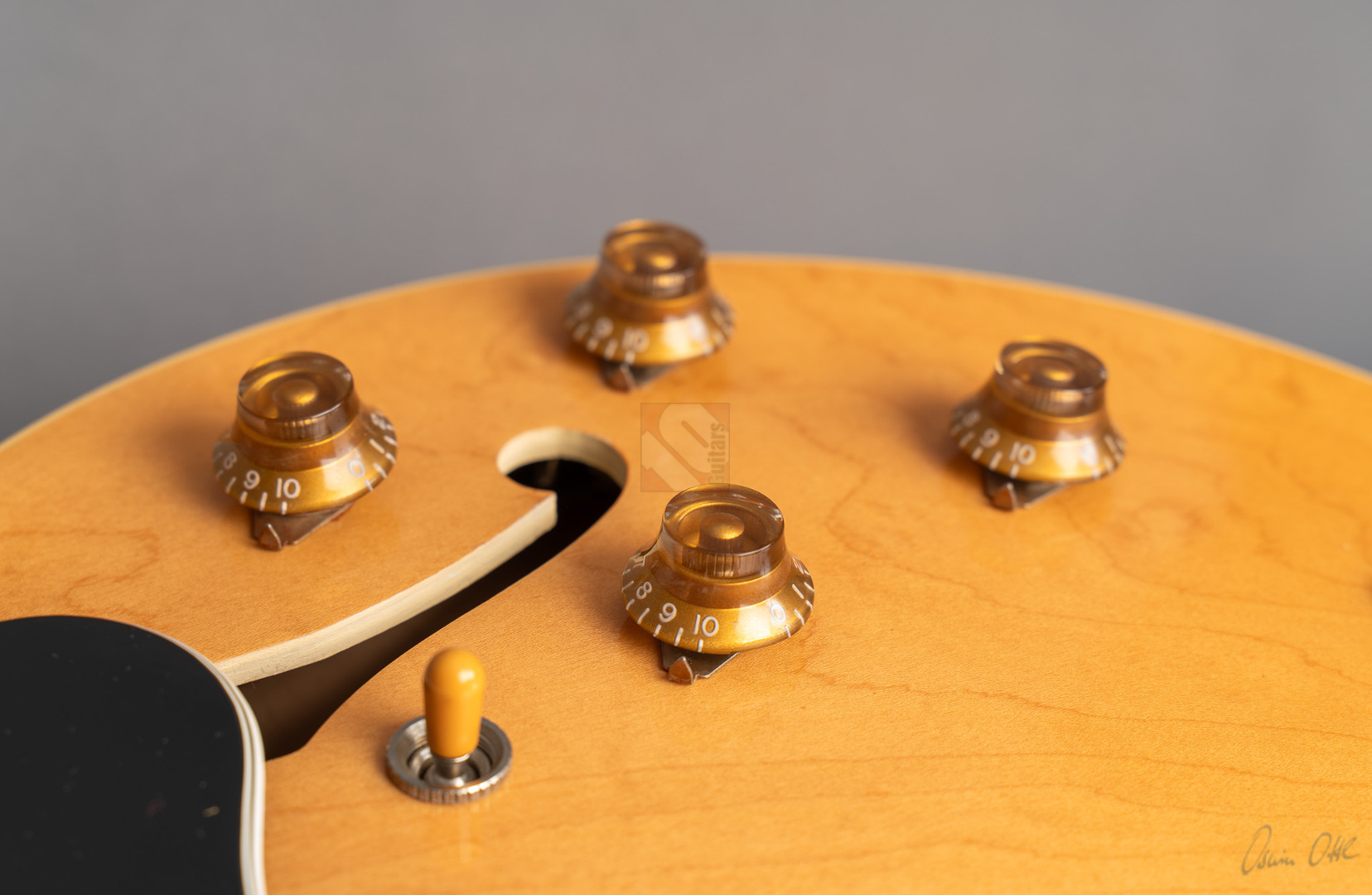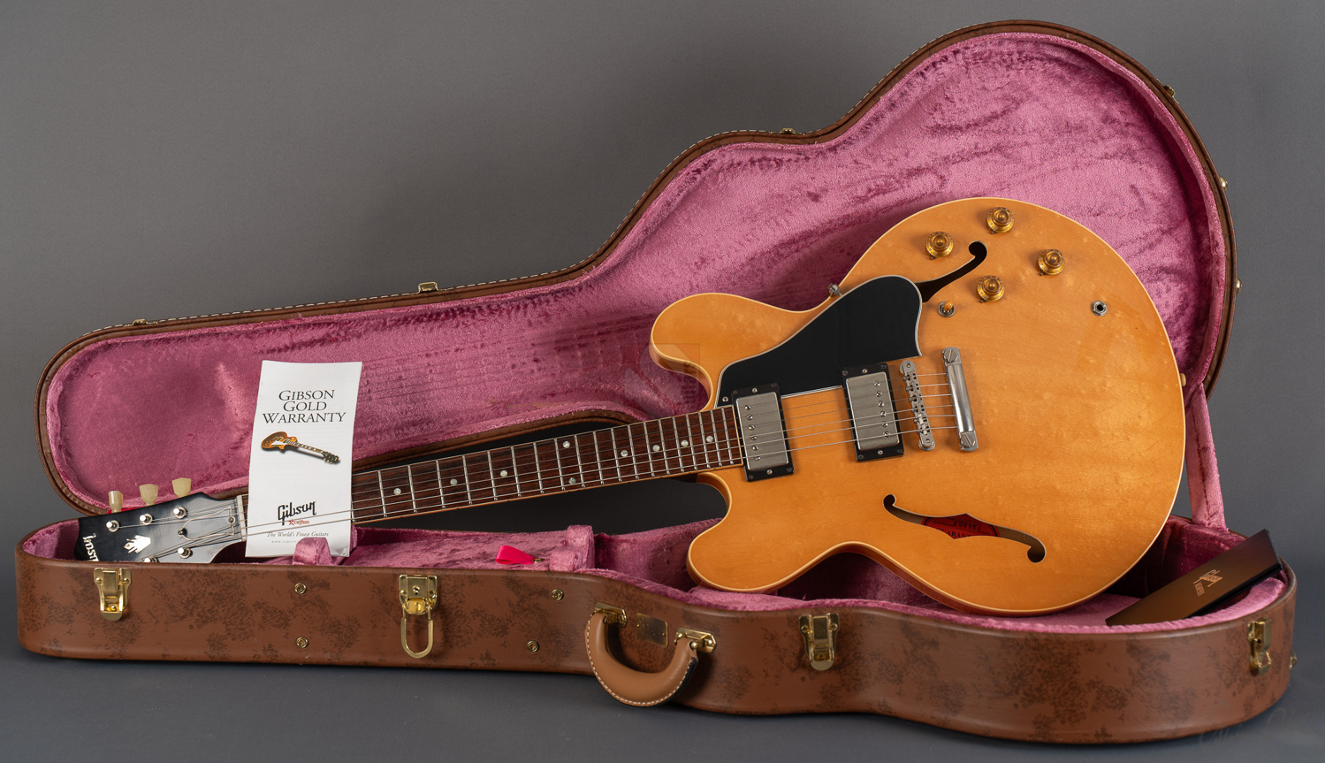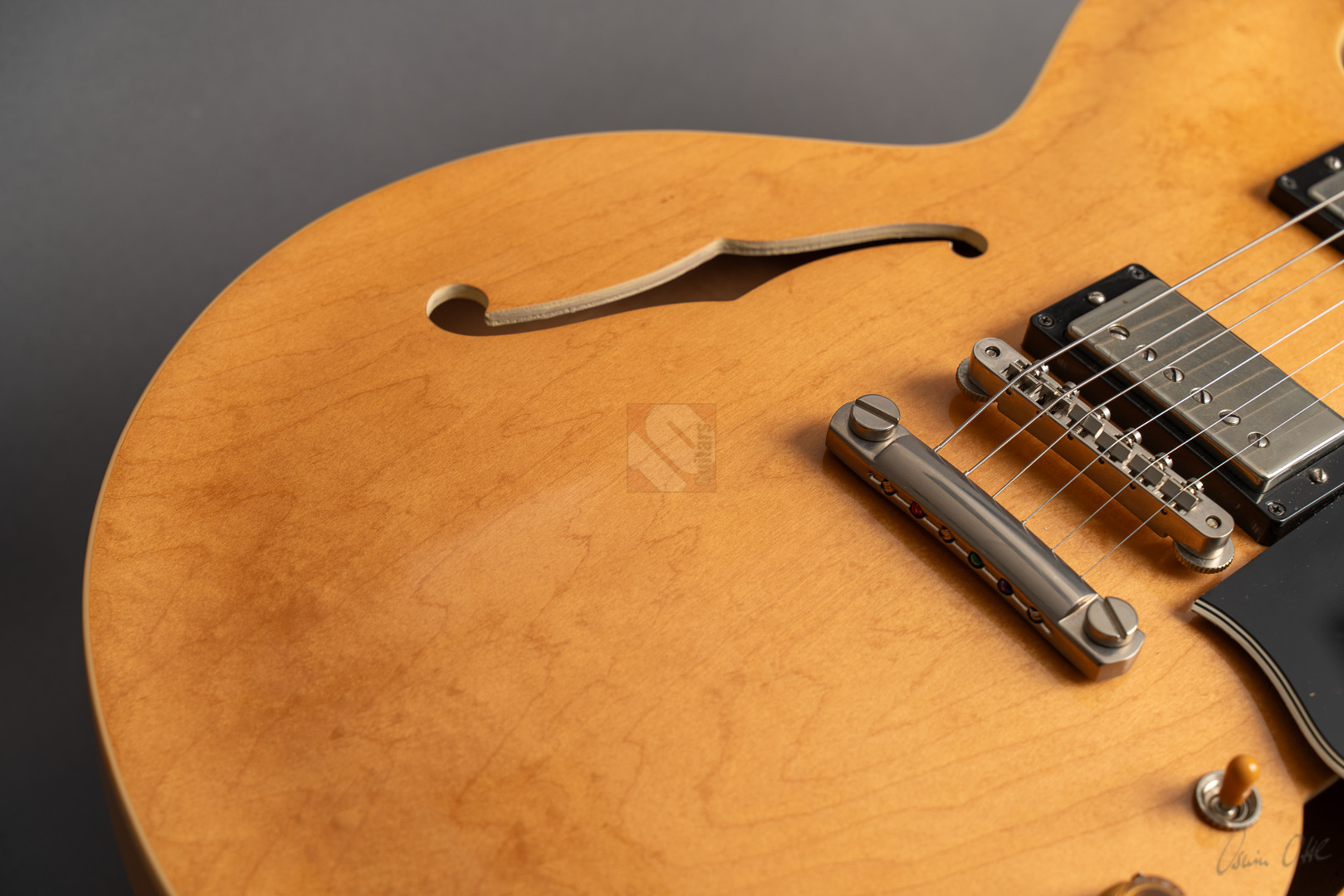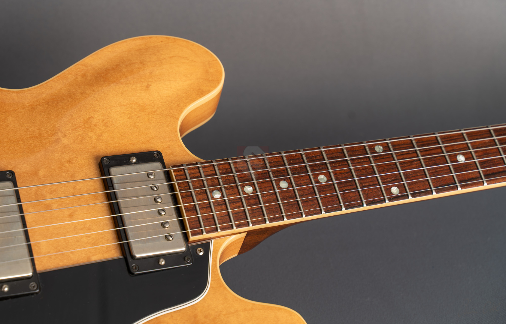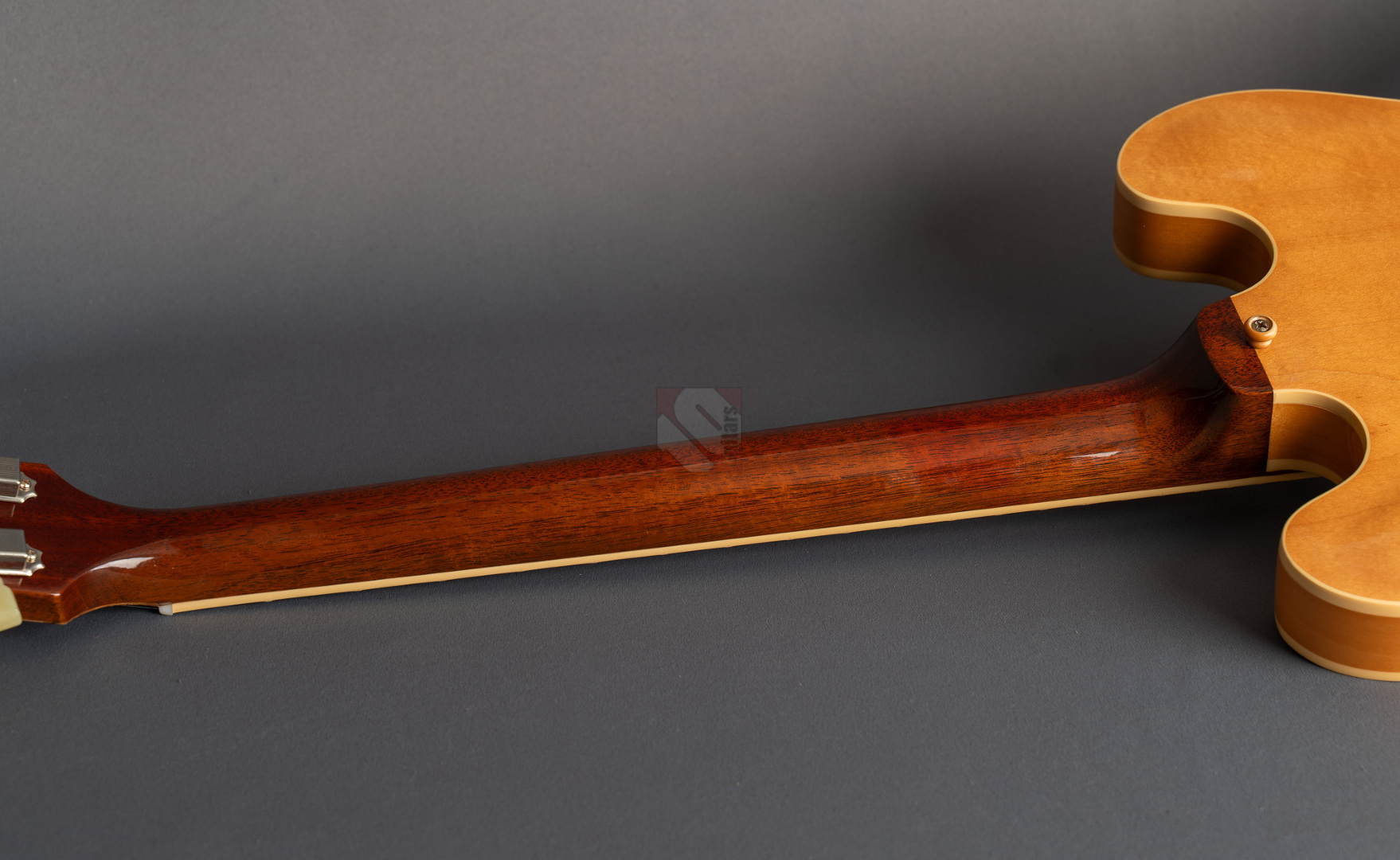 Hier haben wir ein ganz besonderes Highlite für alle 335-Freunde, die den etwas kräftigeren '59-Neck und Vintage-Sound pur suchen. Auch der Look kann hier voll überzeugen. Mickey-Mouse-Ears, "Vintage Natural"-Finish, schon ganz leicht nachgedunkelt und mit einer wunderschönen Decke mit einer leichten Birds-Eye-Maserung. Ausgesuchte Hölzer und natürlich haben wir hier auch die neuen Features wie Historic-Truss-Rod, Rolled-Neck-Binding, "One Piece"-Mahagoni-Neck und Hide-Glue. Um den Sound noch zu optimieren hat der Vorbesitzer die MHS-Humbucker gegen OX-4-Pickups, underwound Alnico-4 Double-Cream, ausgetauscht. Die OX-4-Pickups zählen mit zu den besten Vintage-Replikas, die man zur Zeit bekommen kann. Mark Knopfler, Johnny Marr, Noel Gallagher, Larry Carlton und viele mehr spielen diese Pickups. Und am Amp zeigt sich dann auch, warum sie so beliebt sind. Jede Soundnuance und Anschlagsdynamik wird hier bestens übertragen. Man kann hier super mit dem Ton arbeiten und das langsame Spielen wird zum Genuss. Sehr dynamisch mit einem breiten Frequenzspektrum und dem klassischen alten PAF-Sound, ...muss man gehört haben. Die originalen Pickups sind mit dabei. Traumhafte ES-335, bis auf ein paar kleinere Spielspuren in einem sehr guten Zustand. Die Bünde haben so gut wie keine Spielspuren.