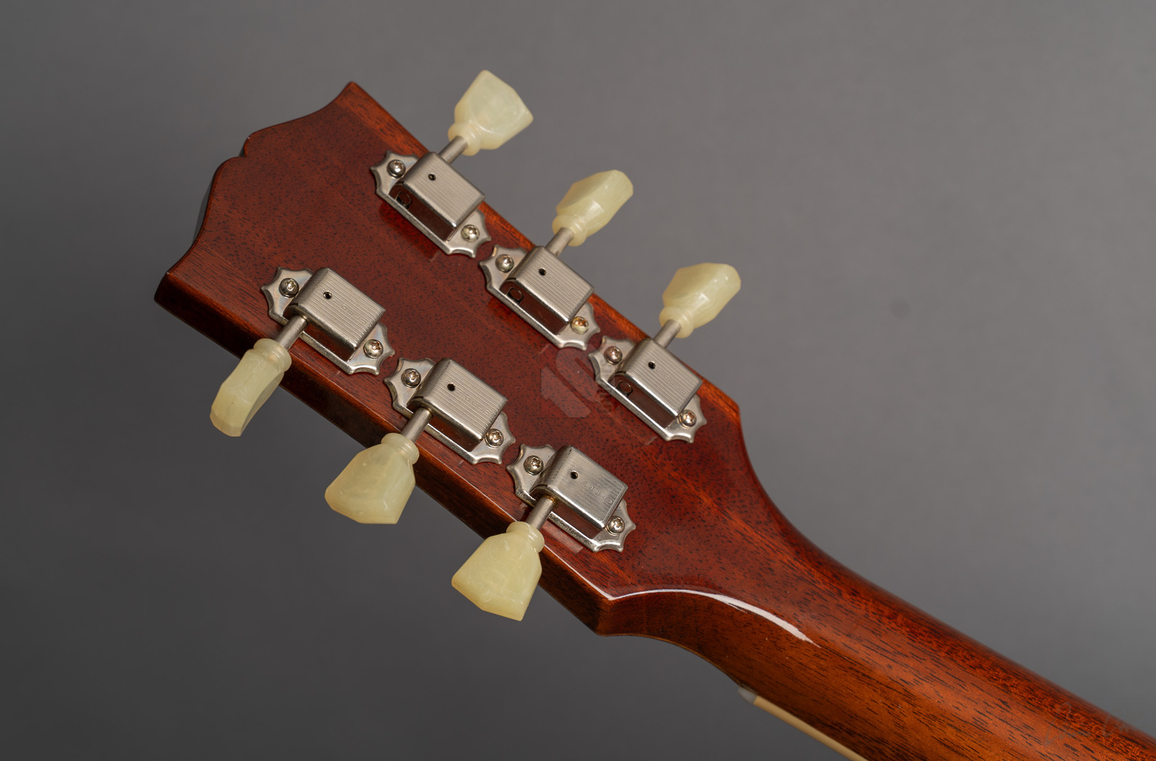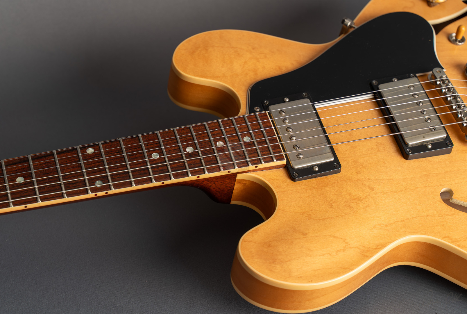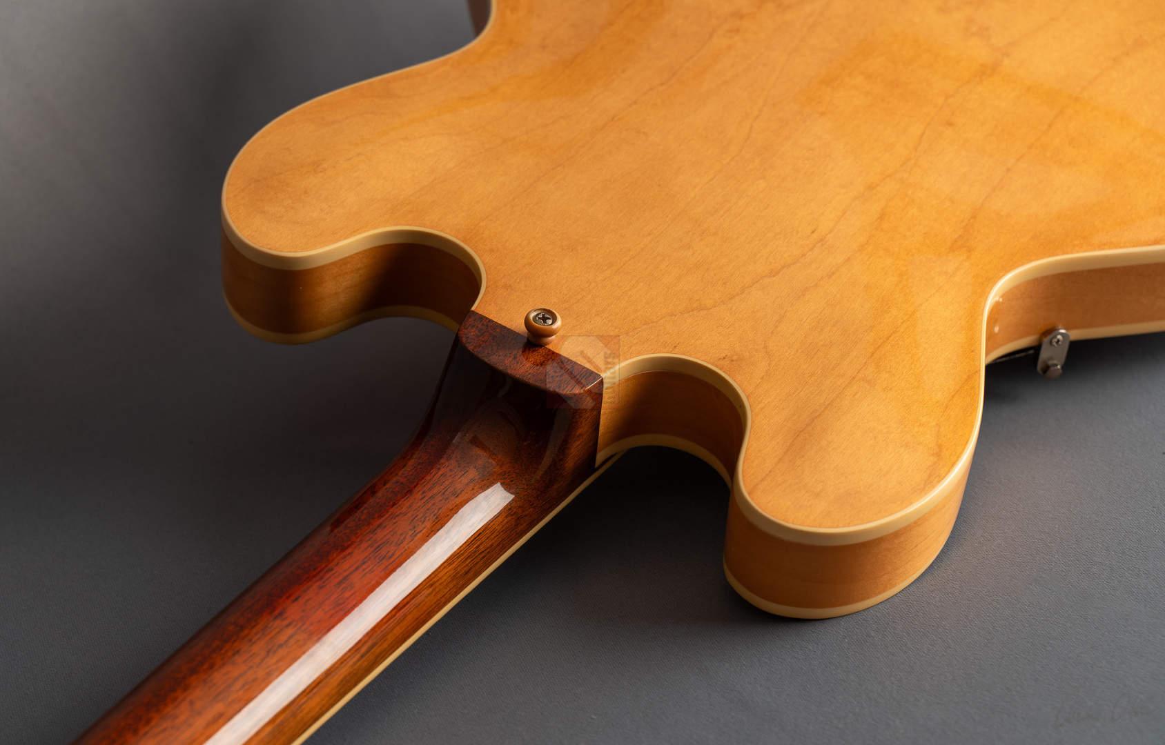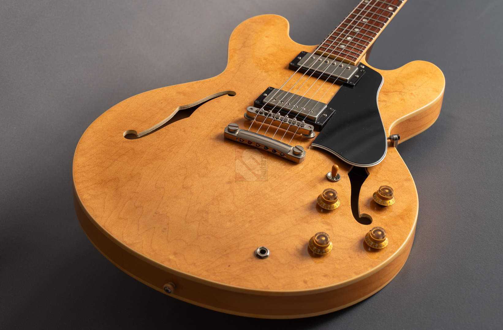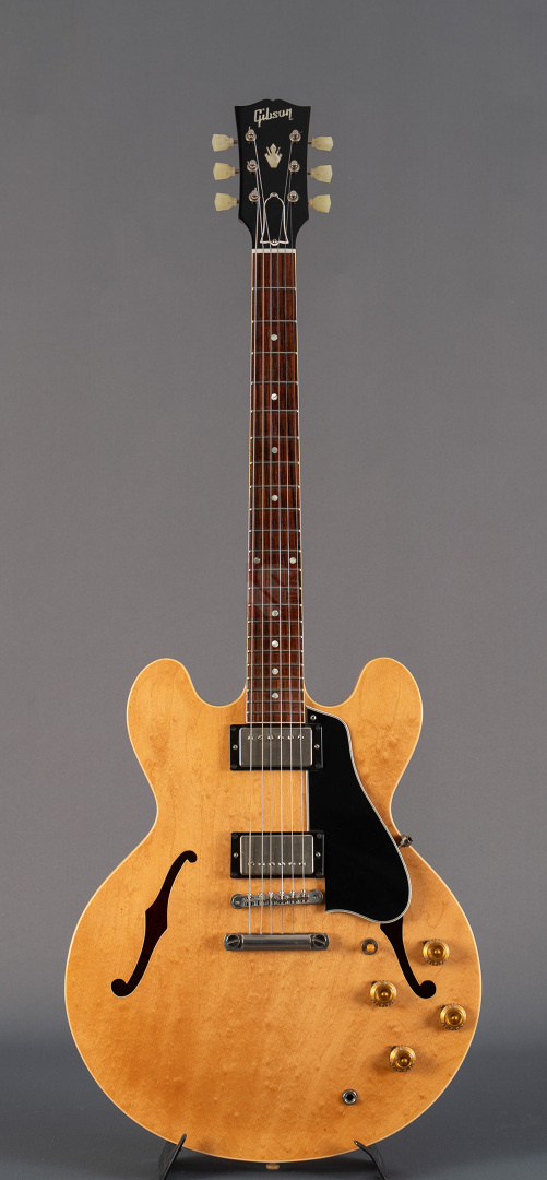 Hier haben wir ein ganz besonderes Highlite für alle 335-Freunde, die den etwas kräftigeren '59-Neck und Vintage-Sound pur suchen. Auch der Look kann hier voll überzeugen. Mickey-Mouse-Ears, "Vintage Natural"-Finish, schon ganz leicht nachgedunkelt und mit einer wunderschönen Decke mit einer leichten Birds-Eye-Maserung. Ausgesuchte Hölzer und natürlich haben wir hier auch die neuen Features wie Historic-Truss-Rod, Rolled-Neck-Binding, "One Piece"-Mahagoni-Neck und Hide-Glue. Um den Sound noch zu optimieren hat der Vorbesitzer die MHS-Humbucker gegen OX-4-Pickups, underwound Alnico-4 Double-Cream, ausgetauscht. Die OX-4-Pickups zählen mit zu den besten Vintage-Replikas, die man zur Zeit bekommen kann. Mark Knopfler, Johnny Marr, Noel Gallagher, Larry Carlton und viele mehr spielen diese Pickups. Und am Amp zeigt sich dann auch, warum sie so beliebt sind. Jede Soundnuance und Anschlagsdynamik wird hier bestens übertragen. Man kann hier super mit dem Ton arbeiten und das langsame Spielen wird zum Genuss. Sehr dynamisch mit einem breiten Frequenzspektrum und dem klassischen alten PAF-Sound, ...muss man gehört haben. Die originalen Pickups sind mit dabei. Traumhafte ES-335, bis auf ein paar kleinere Spielspuren in einem sehr guten Zustand. Die Bünde haben so gut wie keine Spielspuren.