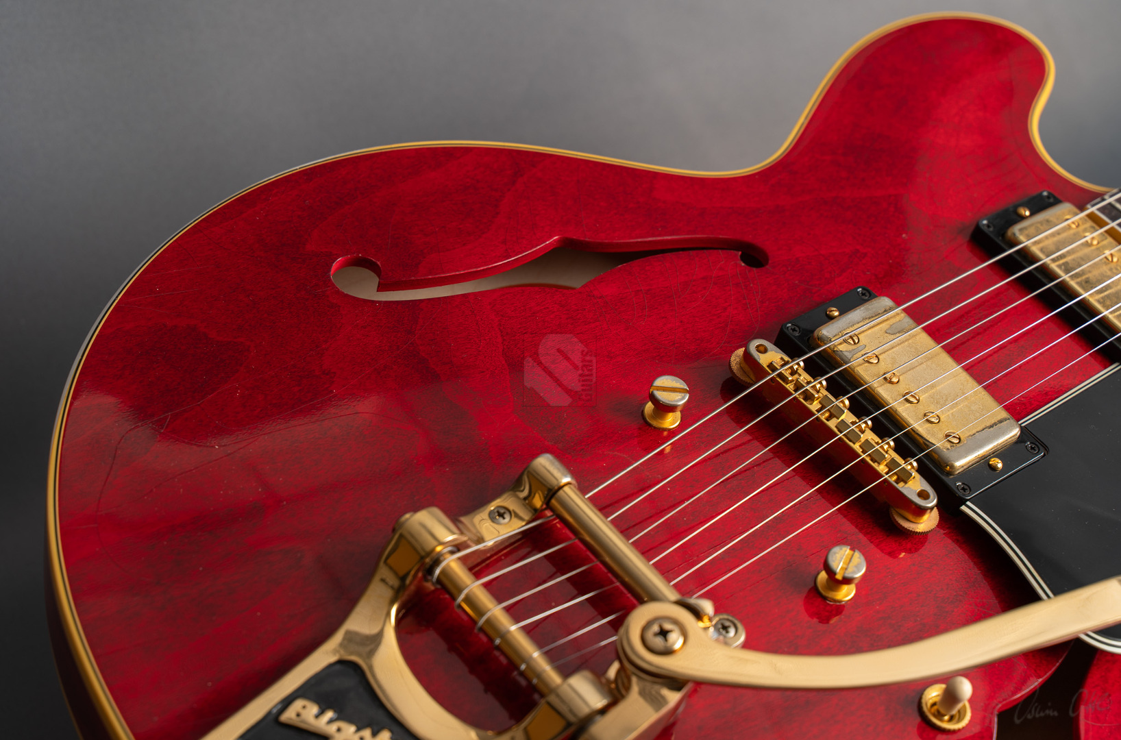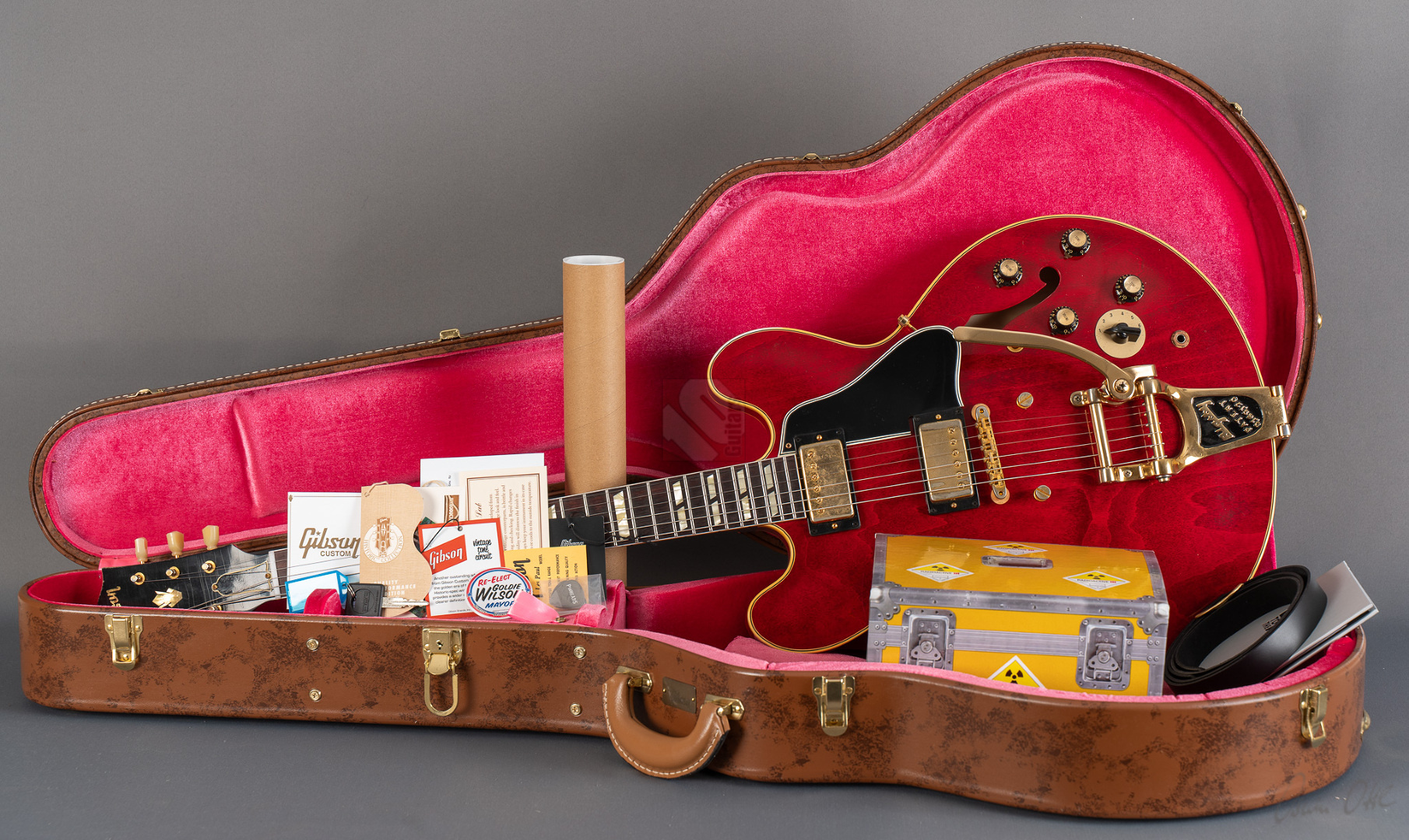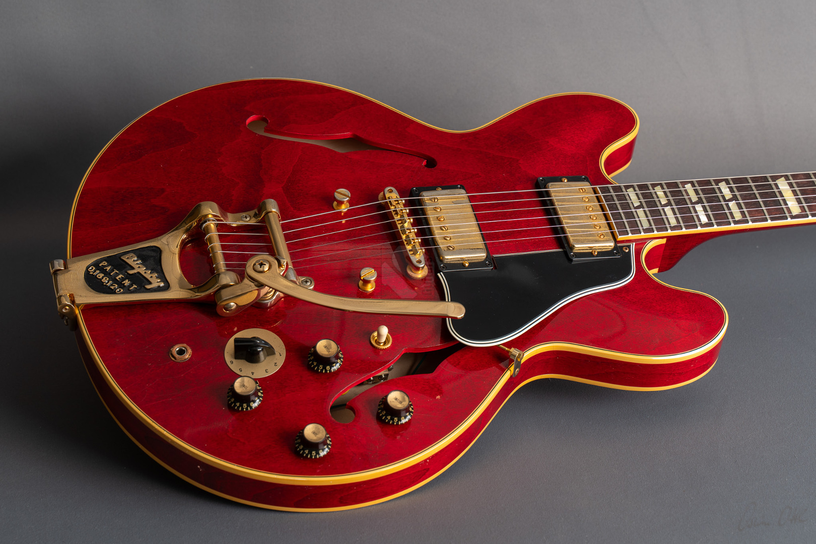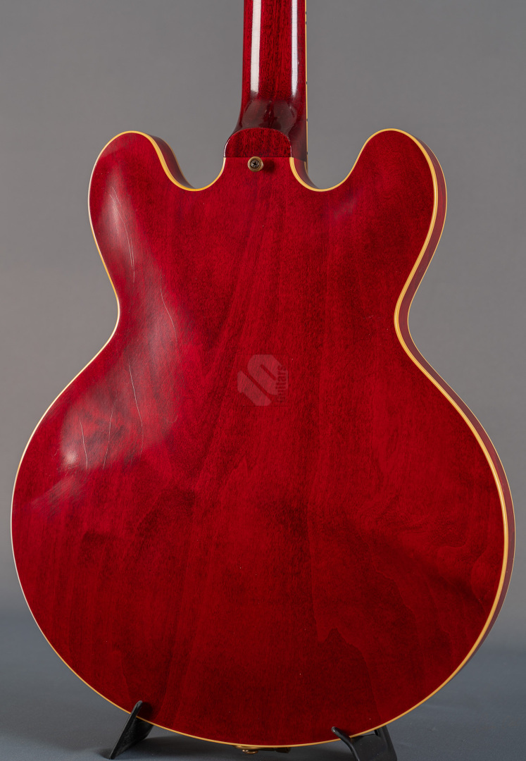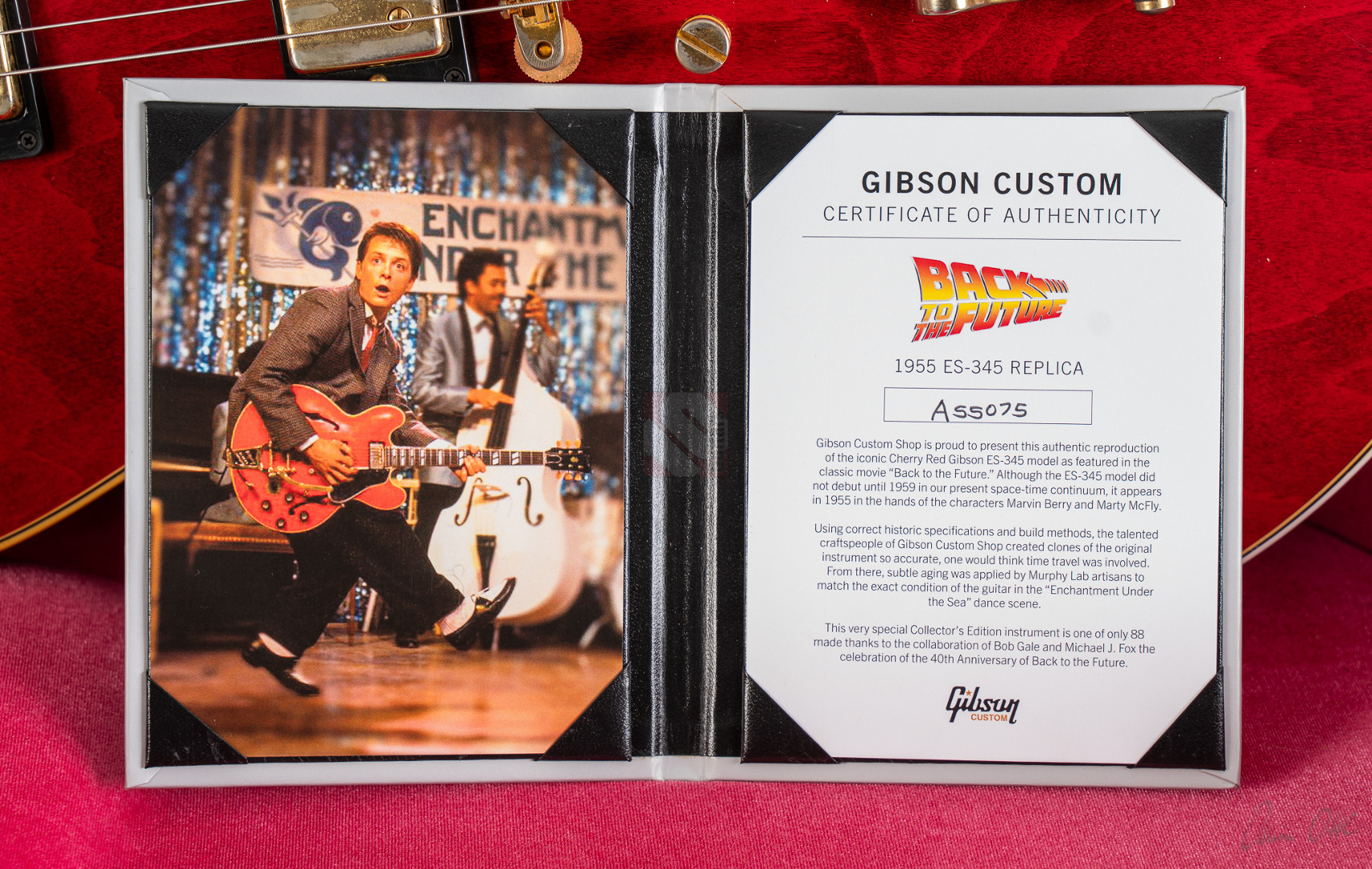 Bei einem High-School-Ball im Jahre 1995 war eine Gibson-Gitarre daran beteiligt, den Kurs der Musikgeschichte zu ändern. Ja, die Geschichte in einem unvergesslichen cineastischen Moment sogar neu zu schreiben. Die Gibson ES-345, die im Film "Back to the Future" zum Einsatz kam, wurde zu einer Legende und verband Vergangenheit, Gegenwart und Zukunft auf eine Weise, wie allein ein grandioses Instrument es vermag. Im Jahre 1959 erblickte die erste ES-345 das Licht der Welt und Norman Harris von „Norman‘s Rare Guitars“, der die Gitarre für den teils im Jahre 1955 spielenden Film zur Verfügung stellte, wies die Filmemacher darauf hin, dass dieses Modell zu dieser Zeit noch gar nicht existierte. Doch die Produzenten entschieden sich für künstlerische Freiheit, indem sie – ungeachtet der historischen Fakten – die Gitarre in den Szenen zum Schulball „Enchantment Under the Sea“ eine prominente Rolle spielen ließen. Basierend auf dieser vielseitigen Historie präsentierte der Gibson Custom Shop in Nashville im vergangenen Jahr die "Back to the Future 1955 ES-345 Collector’s Edition", eine gelungene Hommage an eine klassische Gitarre, die die Grenzen der Zeit auflöst. Die Gitarre hat einen Thinline-Korpus aus 3-lagigem Ahorn/Pappel/Ahorn-Schichtholz mit einem massiven Ahornblock für mehr Sustain und Rückkopplungsfreiheit. Der Mahagoni-Hals mit Long-Tenon ist natürlich mittels Hide-Glue befestigt. Er hat ein "1961 Authentic Thin D-Shape"-Profil, das super komfortabel in der Hand liegt, und ist mit einem tiefdunklen Palisander-Griffbrett und 22 "Medium Jumbo"-Bünden sowie Split-Parallelogramm-Inlays ausgestattet. In Anlehnung an die Originalgitarre, das einzige bekannte Exemplar aus der Zeit mit einem einzelnen Parallelogramm-Inlay am 12. Bund, trägt natürlich auch die "Back to the Future" dieses seltene Merkmal. ...und um das cineastische Erlebnis zu vervollkommnen, wurde auch das "Hill Valley Music"-Logo auf der Kopfplattenrückseite angebracht. Edles Finish in traditionellem "Cherry Red" mit goldfarben-geagter Hardware und verstimmungsfreien Bigsby B7. Das "Light Aging" des Murphy Lab rundet den geilen Look perfekt ab, indem es sich eher subtil auf unzählige Lackrisse und nur kleinere Macken beschränkt. Soundmäßig hat man es hier mit einem wunderbar ausgewogen Klang zu tun, stark angelehnt an die legendären PAFs. Mit den verbauten unpotted Custombuckers mit Alnico-III-Magneten liegt einem eine wahre Soundwelt zu Füßen. gerade auch, da die Semi-Hollow mit einem Mono-Varitone-Schalter ausgestattet ist, der die klangliche Vielseitigkeit des Instruments noch erweitert. Egal ob klassischer Blues, funky Soul und R n´B oder auch fette, rockige Sounds – das alles ist in bester Manier möglich mit dieser ES! Darüber hinaus kommt die Gitarre, die wir Euch in neuwertigem Zustand anbieten können, mit einem Lifton-Hartschalenkoffer mit „Marvin Berry and the Starlighters“-Motiv sowie verschiedenen famosen Case-Candies, die jedes Samnmlerherz höher schlagen lassen. All das macht die Collector’s Edition zu einer legendären Gitarre, die die Grenzen der Zeit auflöst!