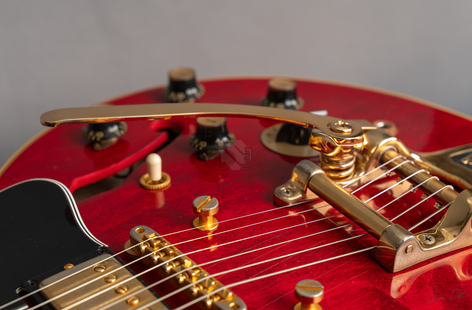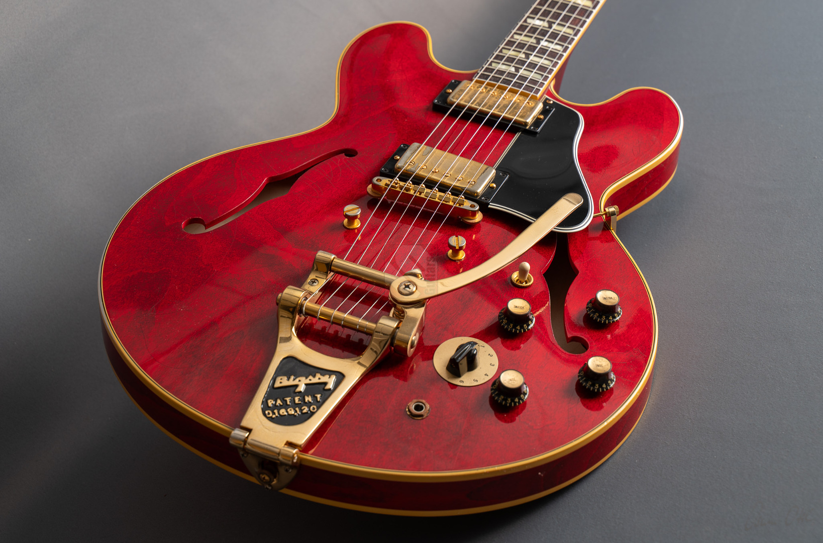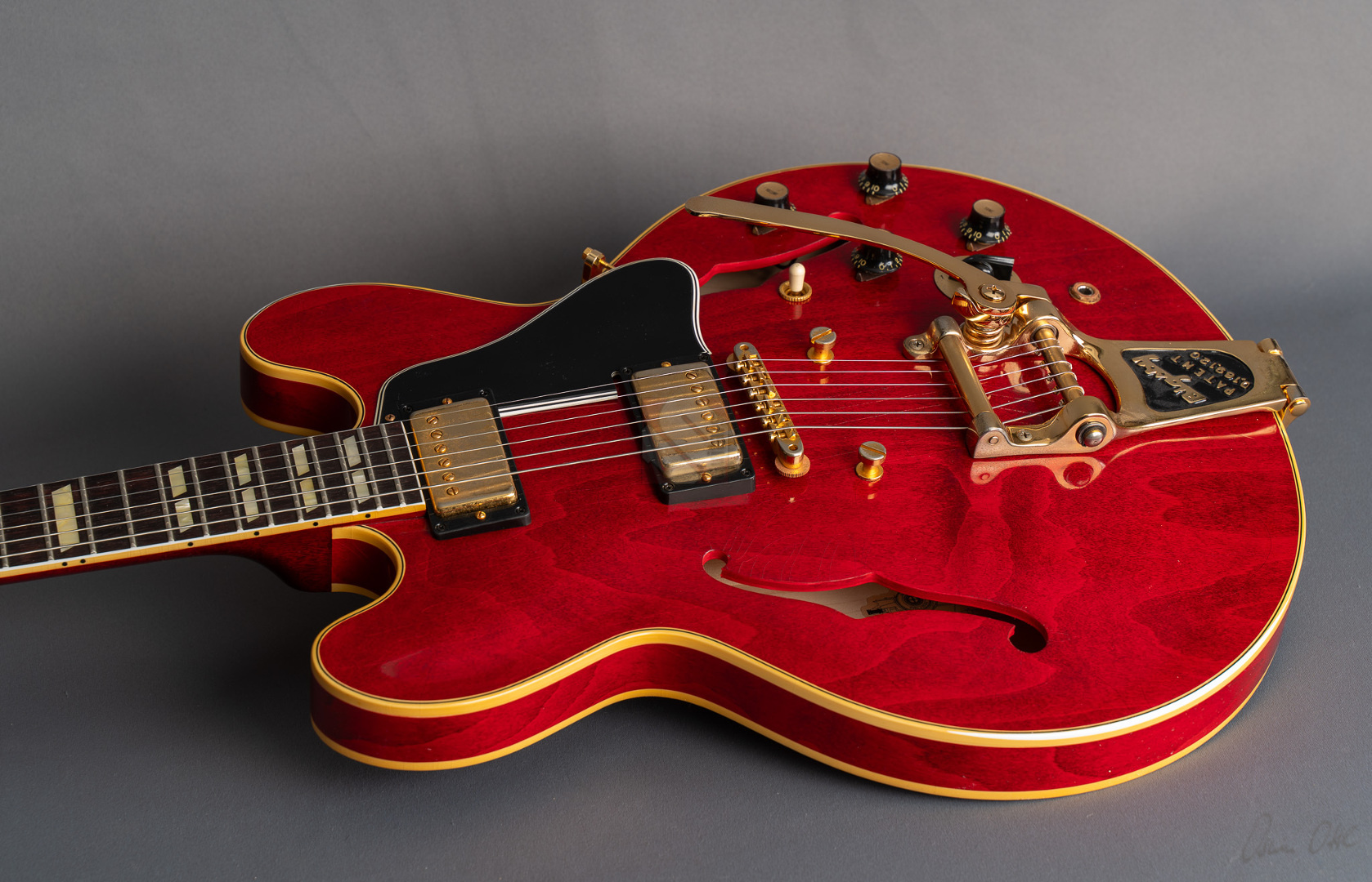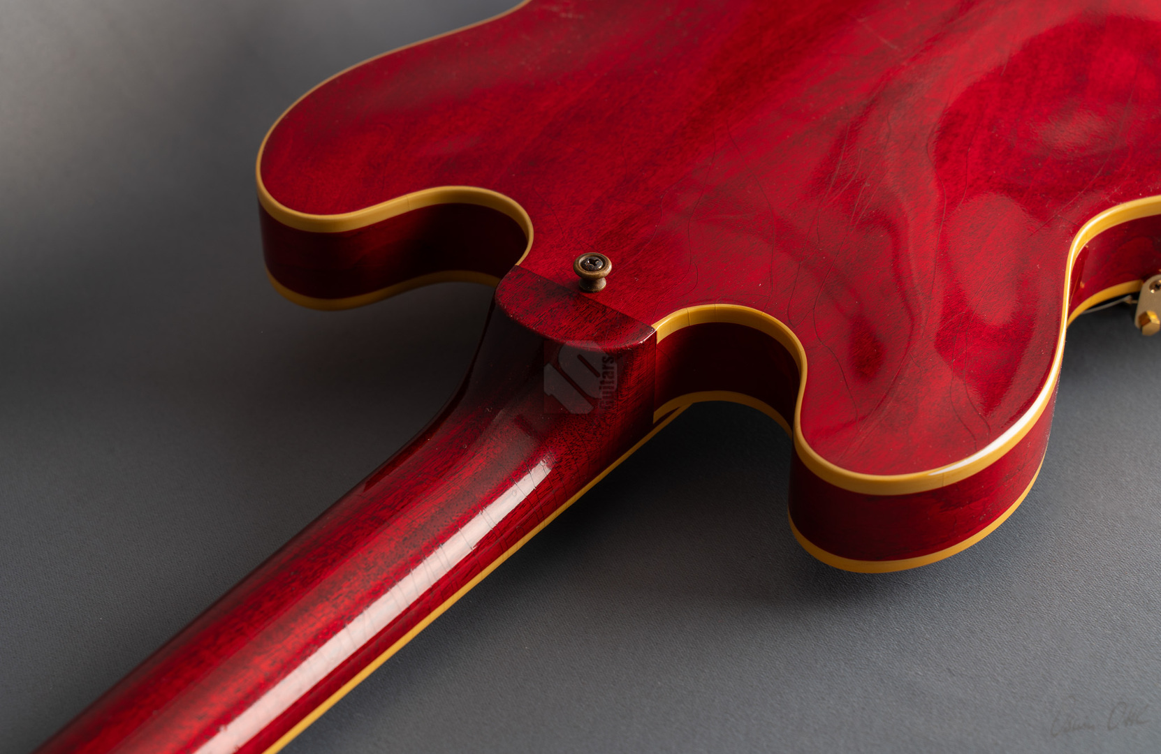 Bei einem High-School-Ball im Jahre 1995 war eine Gibson-Gitarre daran beteiligt, den Kurs der Musikgeschichte zu ändern. Ja, die Geschichte in einem unvergesslichen cineastischen Moment sogar neu zu schreiben. Die Gibson ES-345, die im Film "Back to the Future" zum Einsatz kam, wurde zu einer Legende und verband Vergangenheit, Gegenwart und Zukunft auf eine Weise, wie allein ein grandioses Instrument es vermag. Im Jahre 1959 erblickte die erste ES-345 das Licht der Welt und Norman Harris von „Norman‘s Rare Guitars“, der die Gitarre für den teils im Jahre 1955 spielenden Film zur Verfügung stellte, wies die Filmemacher darauf hin, dass dieses Modell zu dieser Zeit noch gar nicht existierte. Doch die Produzenten entschieden sich für künstlerische Freiheit, indem sie – ungeachtet der historischen Fakten – die Gitarre in den Szenen zum Schulball „Enchantment Under the Sea“ eine prominente Rolle spielen ließen. Basierend auf dieser vielseitigen Historie präsentierte der Gibson Custom Shop in Nashville im vergangenen Jahr die "Back to the Future 1955 ES-345 Collector’s Edition", eine gelungene Hommage an eine klassische Gitarre, die die Grenzen der Zeit auflöst. Die Gitarre hat einen Thinline-Korpus aus 3-lagigem Ahorn/Pappel/Ahorn-Schichtholz mit einem massiven Ahornblock für mehr Sustain und Rückkopplungsfreiheit. Der Mahagoni-Hals mit Long-Tenon ist natürlich mittels Hide-Glue befestigt. Er hat ein "1961 Authentic Thin D-Shape"-Profil, das super komfortabel in der Hand liegt, und ist mit einem tiefdunklen Palisander-Griffbrett und 22 "Medium Jumbo"-Bünden sowie Split-Parallelogramm-Inlays ausgestattet. In Anlehnung an die Originalgitarre, das einzige bekannte Exemplar aus der Zeit mit einem einzelnen Parallelogramm-Inlay am 12. Bund, trägt natürlich auch die "Back to the Future" dieses seltene Merkmal. ...und um das cineastische Erlebnis zu vervollkommnen, wurde auch das "Hill Valley Music"-Logo auf der Kopfplattenrückseite angebracht. Edles Finish in traditionellem "Cherry Red" mit goldfarben-geagter Hardware und verstimmungsfreien Bigsby B7. Das "Light Aging" des Murphy Lab rundet den geilen Look perfekt ab, indem es sich eher subtil auf unzählige Lackrisse und nur kleinere Macken beschränkt. Soundmäßig hat man es hier mit einem wunderbar ausgewogen Klang zu tun, stark angelehnt an die legendären PAFs. Mit den verbauten unpotted Custombuckers mit Alnico-III-Magneten liegt einem eine wahre Soundwelt zu Füßen. gerade auch, da die Semi-Hollow mit einem Mono-Varitone-Schalter ausgestattet ist, der die klangliche Vielseitigkeit des Instruments noch erweitert. Egal ob klassischer Blues, funky Soul und R n´B oder auch fette, rockige Sounds – das alles ist in bester Manier möglich mit dieser ES! Darüber hinaus kommt die Gitarre, die wir Euch in neuwertigem Zustand anbieten können, mit einem Lifton-Hartschalenkoffer mit „Marvin Berry and the Starlighters“-Motiv sowie verschiedenen famosen Case-Candies, die jedes Samnmlerherz höher schlagen lassen. All das macht die Collector’s Edition zu einer legendären Gitarre, die die Grenzen der Zeit auflöst!