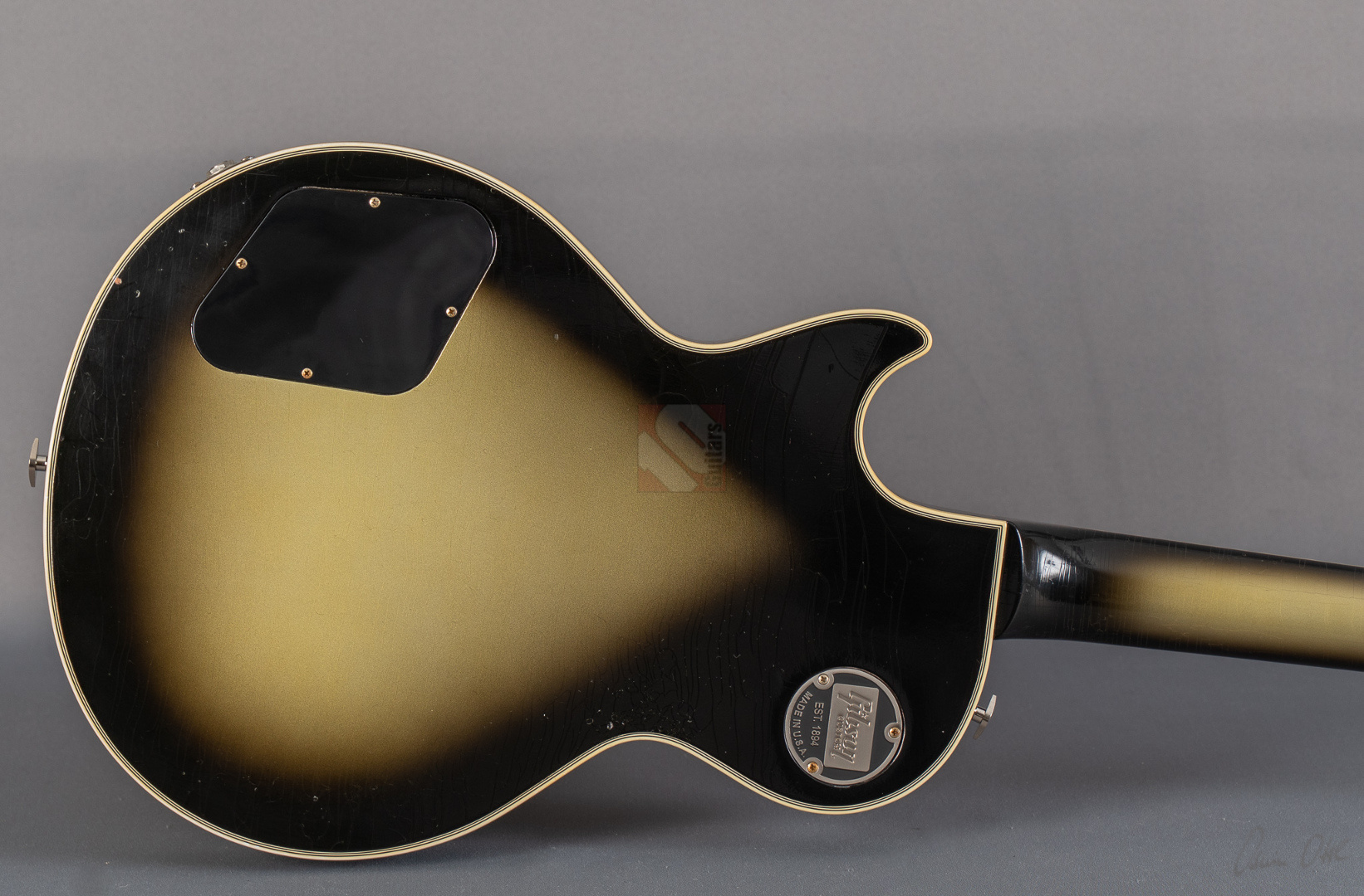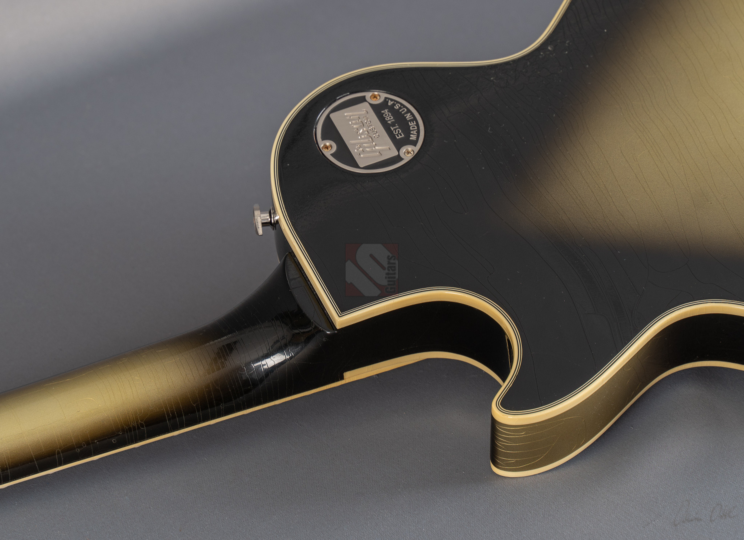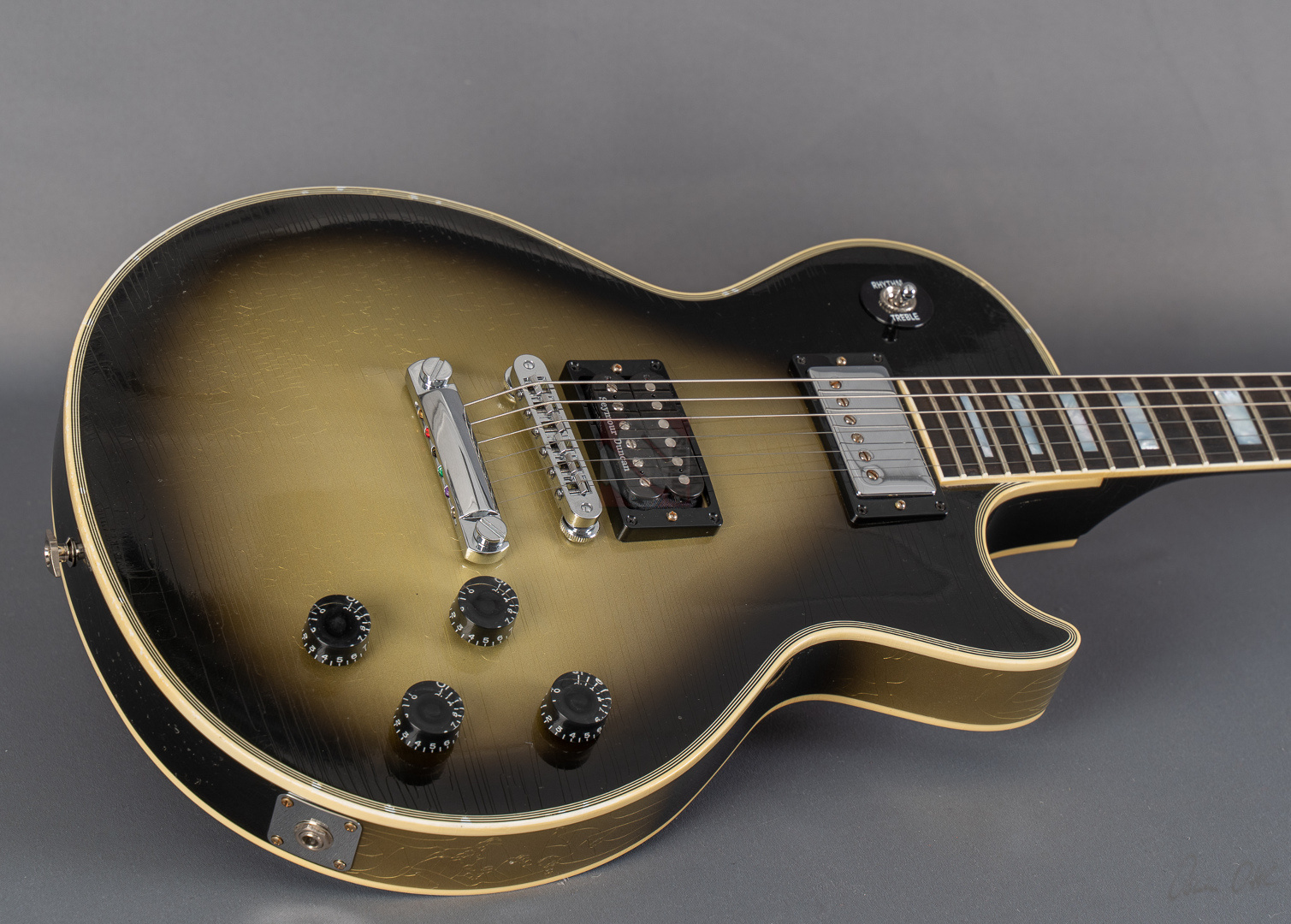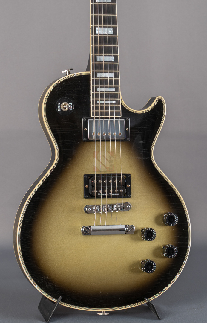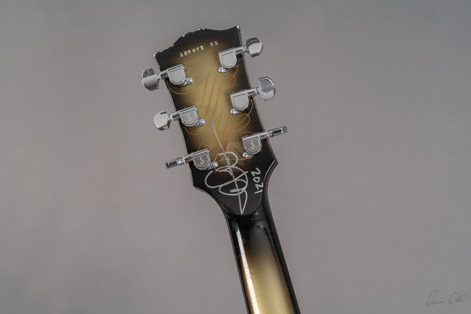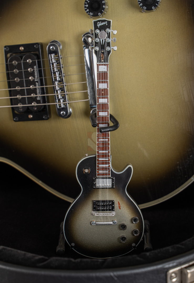 Adam Jones, phänomenaler Gitarrist der Band Tool, ist bekannt für seine fetten Klänge, die er auf wegweisenden Alben wie "Lateralus", "10000 Days" oder "Fear Inoculum" verewigte. Für diesen Sound zeichnet vor allem seine 1979 Les Paul Custom verantwortlich, die er facettenreich modifizierte. Basierend auf dieser legendären Silverburst fertigte der Gibson Custom Shop verschiedene Repliken an: im Jahre 2020 die V1- und VOS-Replika sowie 2021 die V2-Version. Letztere, deren Auflage auf lediglich 79 Exemplare limtiert ist, dürfen wir Euch heute mit großer Freude anbieten. Dem Original entsprechend zeigt die Les Paul Custom dabei einen wunderbar authentischen, grünlich-gealterten Farbton des Silverburst und das fantastische Light-Aging des Murphy Lab tut sein Übriges, um der Gitarre eine schöne und vor allem authentische Vintage-Patina mit allerlei Haarrissen und nur kleineren Macken zu verschaffen. Passend dazu das edle Ebenholzgriffbrett mit Block-Inlays, das von Adams Ehefrau entworfene Design auf der Kopfplattenrückseite und die chromefarbene Hardware, die bis hin zum Knob des Toggle-Switches und den klassischen Sperzel-Tuners reicht. ...und natürlich wurde das Prachtstück von Adam Jones auf der Kopfplattenrückseite auch handsigniert! Diese Paula ist in jedem Detail umwerfend gut verarbeitet, fühlt sich mit dem vergleichsweise etwas flacheren "Custom C"-Profil des Halses fantastisch an und bläst einem am Amp einfach die Ohren weg. Das vielfältige Klangspektrum der Gitarre wird von einem umgekehrt montierten Custombucker am Hals und einem Custom-gewickelten Seymour Duncan DDJ am Steg geliefert. Schmatzend, fett und wuchtig, wie man es von Adam Jones gewohnt ist. Dabei aber immer schön differenziert und transparent. Hier fließen einem Songs wie "Pneuma", "Stinkfist" und "The Grudge" nur so aus den Fingern. Wer also auf der Suche nach einer Gitarre ist, die nicht nur als wertbeständiges, streng limitiertes Sammlerstück erste Wahl ist, sondern auch mit ihrer fantastischen Klangmächtigkeit überzeugen kann, ist hier genau richtig. Um die Detailverliebtheit letztendlich auf die Spitze zu treiben, hat der Gibson Custom Shop auch noch einen Jones-typischen Spiegel für die Kopfplatte beigelegt, mit dem sich das endgültige Tool-Erlebnis vervollkommnen lässt. Aber auch der Vorbesitzer blieb nicht untätig und optimierte das Gesamtpaket, indem er ihm noch eine Miniaturreplika von Axmann hinzufügte. Der zugehörige Koffer zeigt minimalste Gebrauchsspuren, was für Kenner der "Adam Jones"-Reihe aus dem Custom Shop sicherlich nicht verwunderlich sein dürfte, da dies bekannterweise unvermeidlich ist. Da die Les Paul Custom aber aus Sammlerhand kommt, befindet sich das Instrument in neuwertigem, praktisch ungespieltem Zustand.