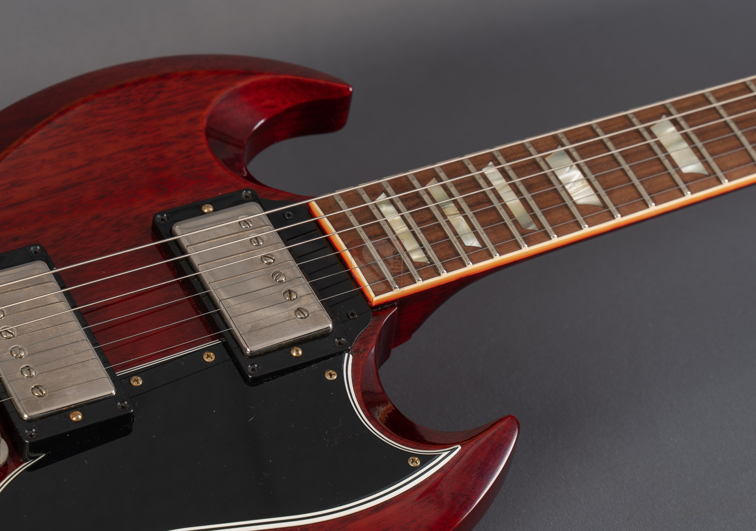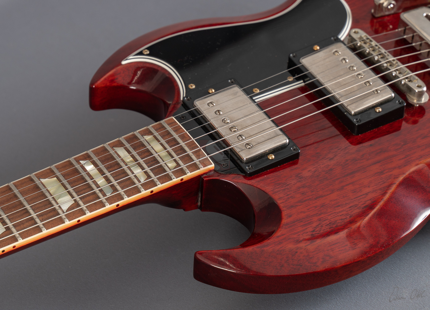 Kaum zu glauben, aber mittlerweile hat die Gibson SG schon ihr 60. Jubiläum hinter sich. Dennoch sieht sie so gut aus wie eh und je. Die erste Version des legendären Modells kam 1961 auf den Markt und trug zunächst noch den Namen Les Paul auf der Kopfplatte. Genau dieses Instrument wurde 2021 im Rahmen der 60th-Anniversary-Reihe des Gibson Custom Shop gewürdigt und noch einmal neu aufgelegt. Und was sollen wir sagen: hier haben sich die Jungs aus Nashville wieder einmal selbst übertroffen! Die Gitarre liegt erstmal klasse in der Hand, denn der Hals hat nicht das ultradünne Slim-Taper-Profil vieler späterer Versionen. Eben etwas griffiger, aber trotzdem slinky entspricht es vielmehr einem angenehmen 59er Medium-Profil. Und der Sound der Custombucker ist der Oberhammer! Wie man es von einer SG erwartet, ist ihr Klang ein bisschen schlanker und präsenter als bei einer Les Paul. Clean bekommt man so jede Menge Transparenz und keinerlei Mulm. Verzerrt geht dann die Party richtig los: angezerrte Riffs blasen einem hier mit einer Bissigkeit und einem Attack entgegen, dass man gar nicht mehr aufhören will, über das attraktive Palisandergriffbrett zu flitzen. Trotzdem hat man zu jedem Zeitpunkt ausreichend Wärme, um auch singende Leadsounds abzufeuern. Die Gitarre klingt niemals schrill oder zu dünn, sondern einfach perfekt ausbalanciert. Auch wenn diese SG als Anniversary-Modell natürlich jedes Sammlerherz höher schlagen lässt, raten wir Euch dringend, Euch dieses Instrument, das darüber hinaus mit einem historisch korrekten und leichtgängigen Sideways-Vibrola ausgestattet ist, als Player-Gitarre anzuschaffen. Einfach ein richtig geiles Teil, das mit der traditionellen Cherry-Lackierung, VOS-Finish und in Top-Zustand kommt, soundmächtig und mit besten Playereigenschaften.