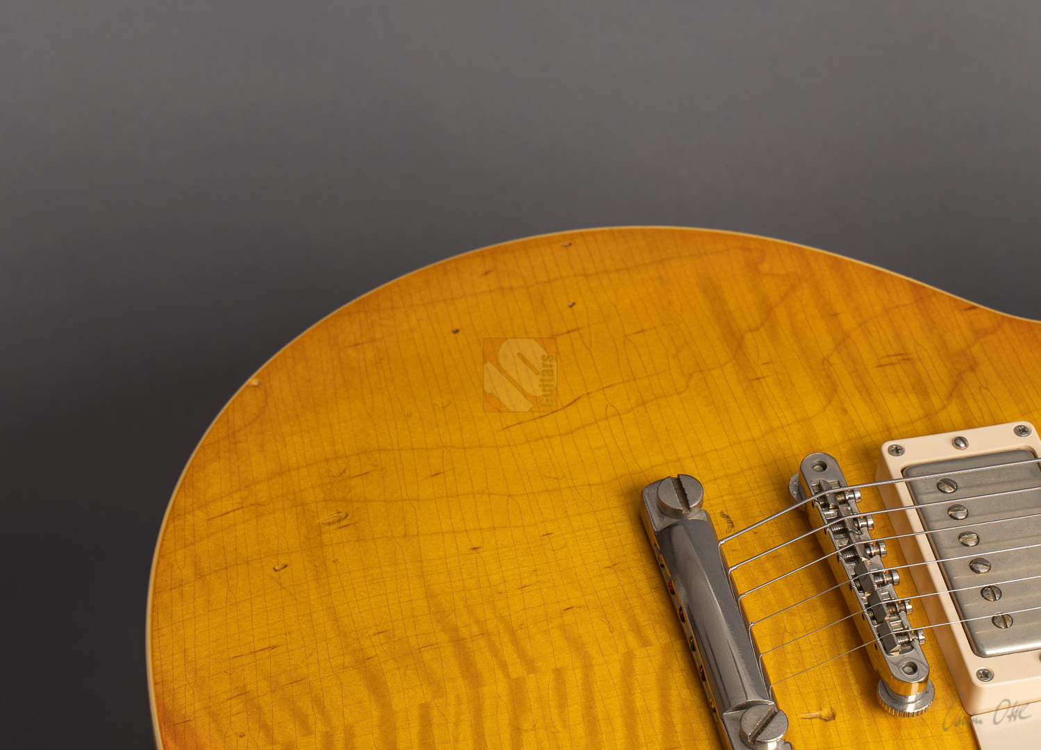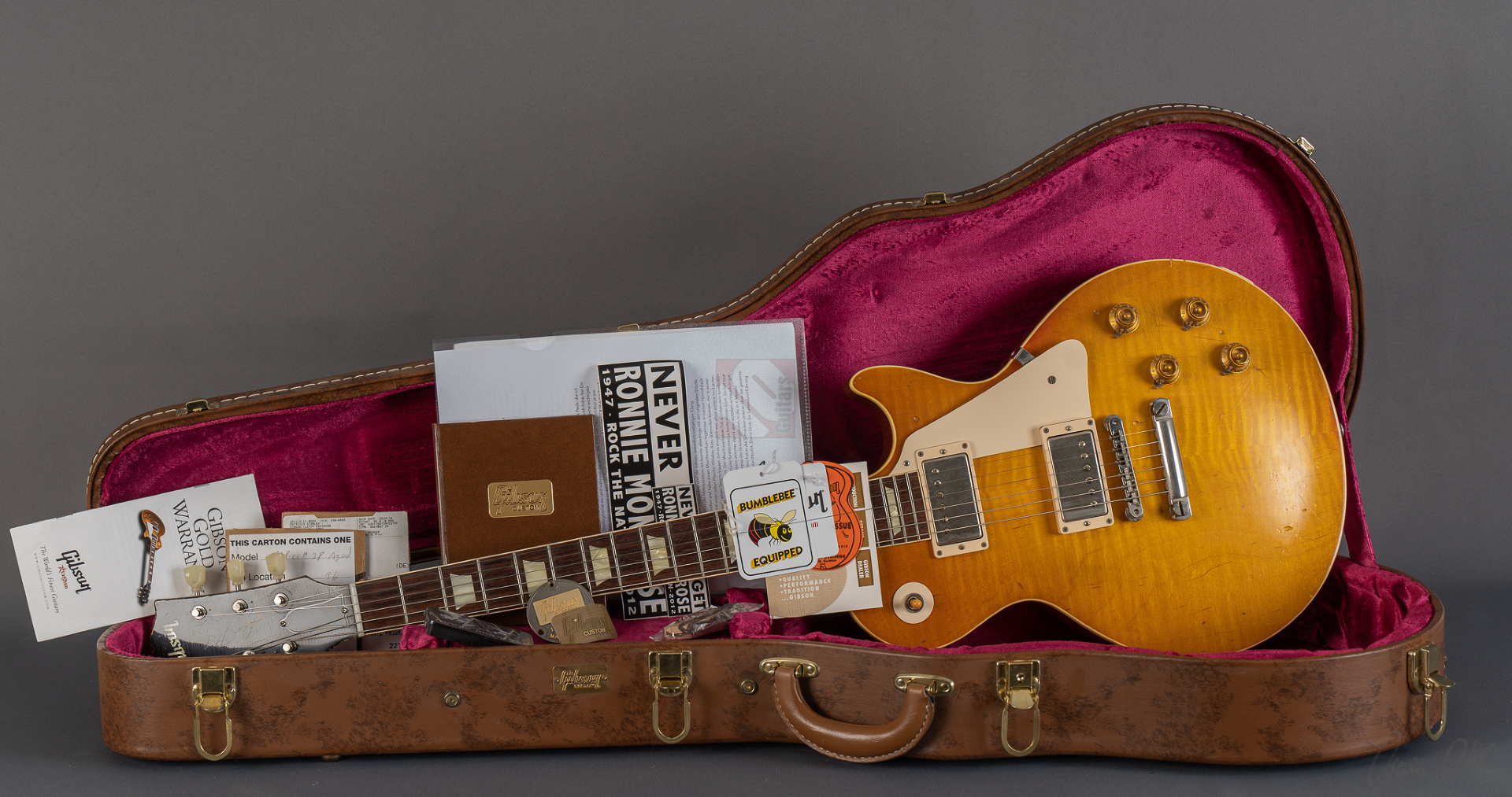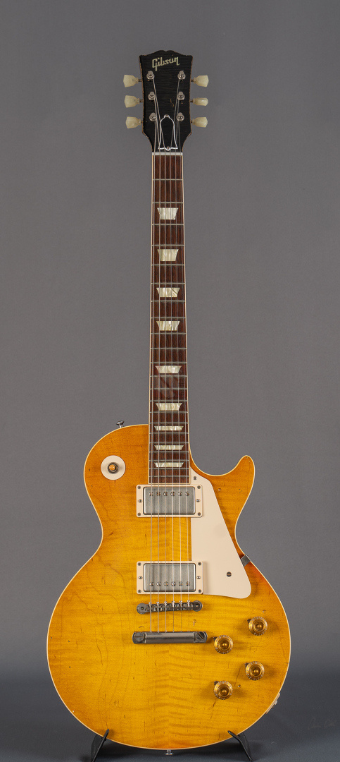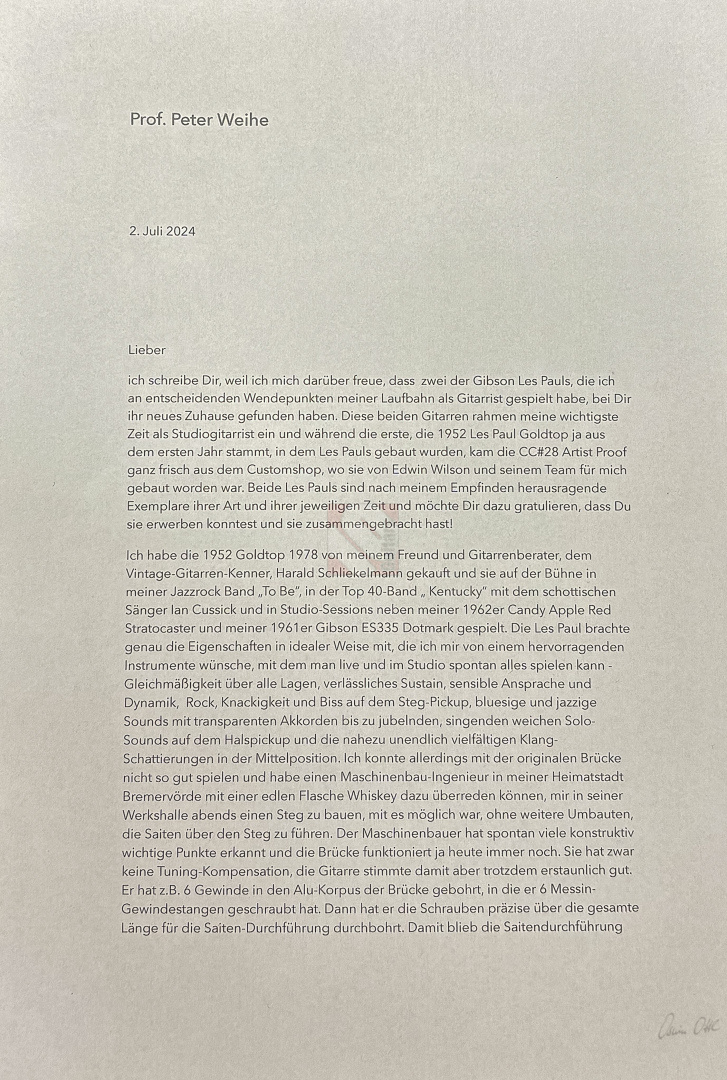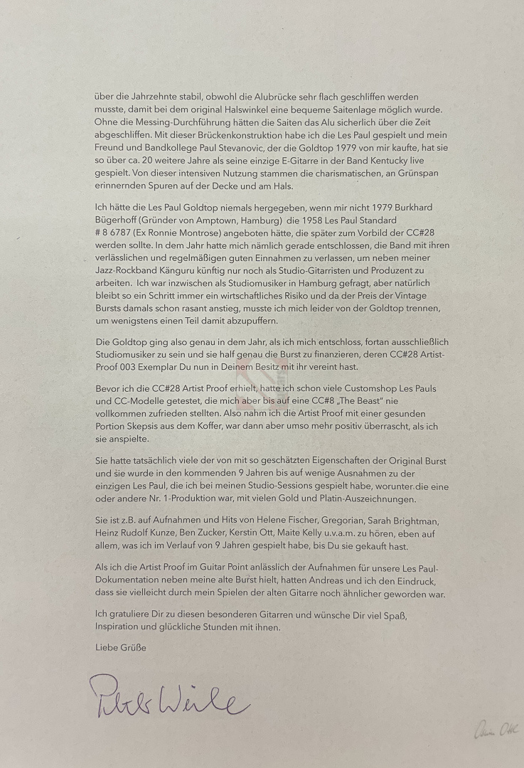 Die 58er Gibson Les Paul mit der Seriennummer 8 6787 hat eine lange Geschichte, die neben Ronnie Montrose auch mit einem weiteren Namen unmittelbar verbunden ist: Professor Peter Weihe, Deutschlands vermutlich bekanntester Studiogitarrist und Dozent an der Hochschule für Musik und Theater in Hamburg. Er hat diese legendäre 58er Paula über viele Jahre hinweg besessen. Deshalb ist sie – zumindest hier in Deutschland – auch eher als "Peter Weihe Les Paul“ bekannt als mit ihrem ursprünglichen Namen "Montrose STP Burst“. Zuvor erlangte diese Les Paul Berühmtheit in Händen des legendären Rockgitarristen Ronnie Montrose, der die Gitarre auf seiner letzten Tour mit Edgar Winter sowie auf den ersten beiden Montrose-Alben (Montrose und Paper Money) verwendet hatte. Ronnie selbst nannte seine Paula "STP ", weil Jahre vor dem Kauf ein STP-Aufkleber auf ihr angebracht worden war und nach dessen Entfernung nur noch eine rote Silhouette auf der verblichenen "Cherry Sunburst"-Lackierung verblieb. Im Jahre 2015 erfuhr Ronnie eine posthume Ehrung, indem der Gibson Custom Shop basierend auf dem Original die Collectors Choice CC#28 Montrose STP Burst in einer auf 300 Exemplare limitierten Auflage herausbrachte. Hierbei arbeitete Gibson mittels einer umfassenden Analyse und Entwicklung mit dem damaligen Besitzer der Originalgitarre zusammen: Peter Weihe! Jedes noch so kleine Detail des Originals wurde akribischst reproduziert und natürlich erhielt Peter verschiedene "Artist Proof"-Gitarren zur Begutachtung, wovon wir hier Nummer 003 anbieten können. Über diese Gitarre sagt Peter Weihe: "Sie hatte tatsächlich viele der von mir so geschätzten Eigenschaften der Original-Burst und sie wurde in den kommenden 9 Jahren bis auf wenige Ausnahmen zu der einzigen Les Paul, die ich bei meinen Studio-Sessions gespielt habe, worunter die eine oder andere Nr.1-Produktion war, mit vielen Gold- und Platin-Auszeichnungen. Sie ist z.B. auf Aufnahmen und Hits von Helene Fischer, Gregorian, Sarah Brightman, Heinz Rudolf Kunze, Ben Zucker, Kerstin Ott, Maite Kelly u.v.a.m. zu hören, eben auf allem, was ich im Verlauf von 9 Jahren gespielt habe." Weiterhin führt er aus, dass er diese Montrose Artist-Proof dem Gitarrenbauer Stefan Zander und dem Tonabnehmerhersteller Andreas Kloppmann zeigte, die beide die originale 58er Burst sehr gut kannten. Beide teilten seinen Eindruck und waren der Meinung, dass diese Artist-Proof die am besten klingende neue Les Paul sei, die sie je gehört hatten. "Meine beiden Gitarren, meine CC#8 und meine CC#28, sind gleichermaßen großartig und erfüllen alle meine Erwartungen an eine großartige Les Paul, die mich auch in kritischen Sessions nicht im Stich lässt. Meine CC#28 klingt in meinen Ohren charismatischer und hat auf der H- und E-Saite noch mehr Sustain. Der Bassbereich wird nicht matschig, die Mitten sind farbenfroh und transparent und die hohen Töne haben Biss, ohne schrill zu sein, mit genügend Grundton, um sie satt und singend klingen zu lassen. Die Jungs vom Custom Shop haben die Halsform perfekt getroffen und das Gewicht von 4 kg ist genau richtig. Wenn ich den Hals spiele und die drei kleinen Punkte am Cutaway sehe, fühlt sich das fast unheimlich an. Die Gitarre ist einfach großartig." Auch wir könnten Peters Lob nichts mehr hinzufügen; man hat es hier einfach mit einer phänomenalen Les Paul mit einem super authentischen Look sowie besten Player- und Klangeigenschaften zu tun. Dass es sich darüber hinaus um ein absolutes Einzelstück handelt, mit dem legendäre Musikgeschichte geschrieben wurde, macht das Gesamtpaket nur noch interessanter.