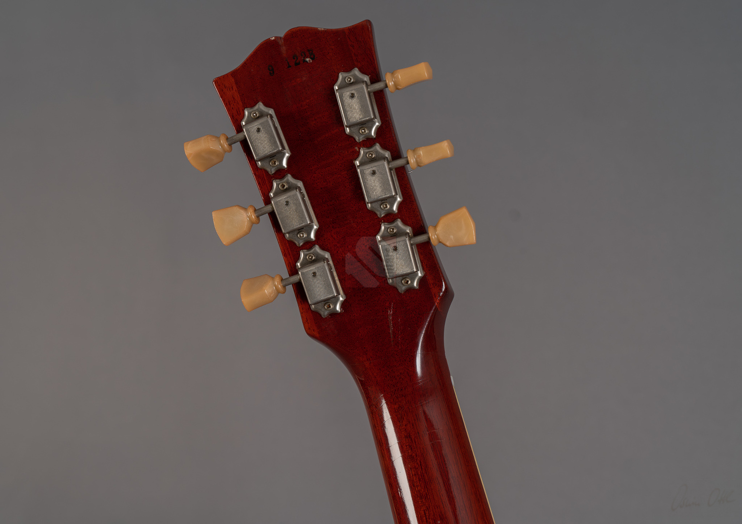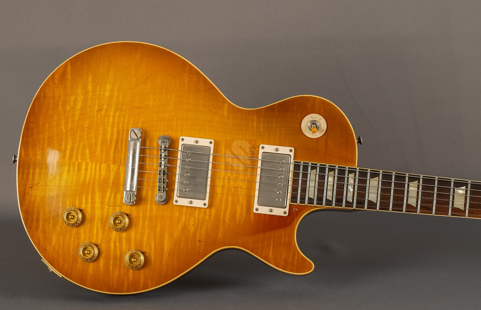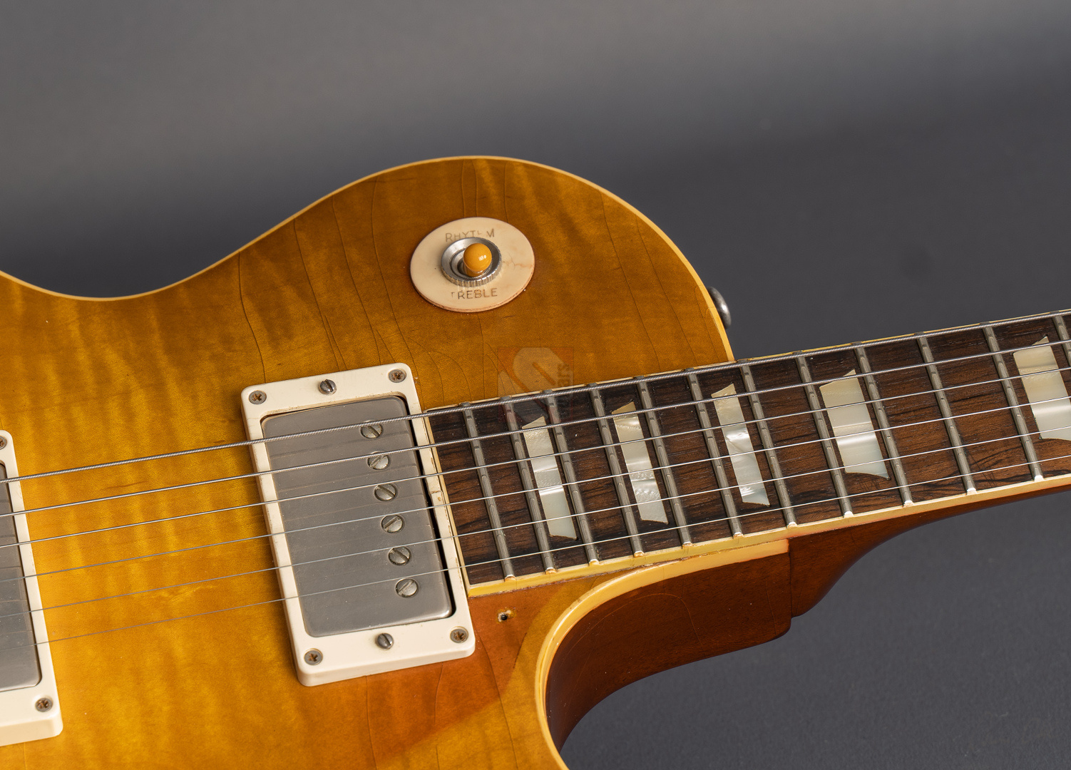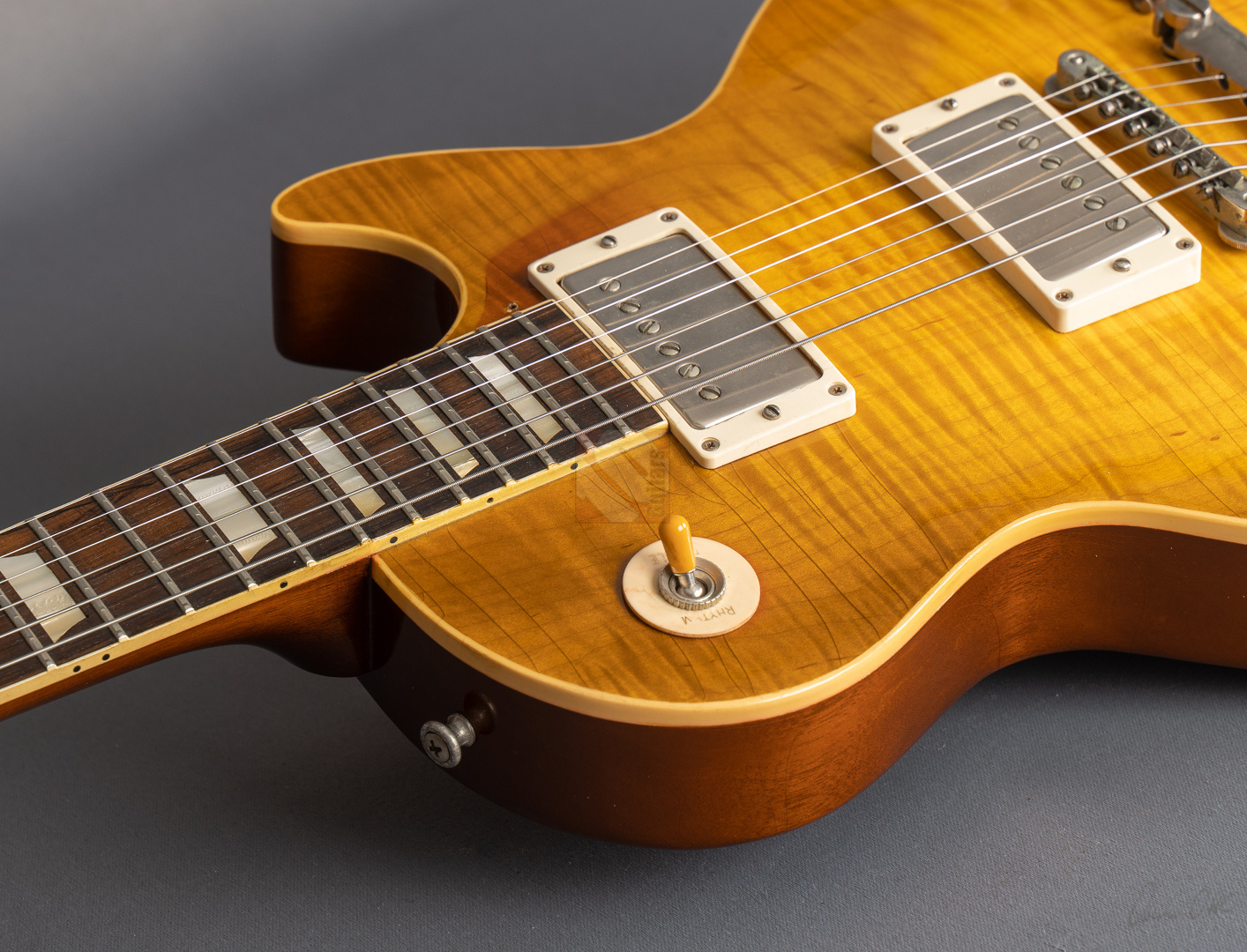 Heute dürfen wir Euch mit großer Freude eine überaus besondere Gitarre anbieten. Dabei handelt es sich um ein absolutes Einzelstück, das es in dieser Form sicherlich weltweit kein zweites Mal gibt. Hier wurde eine Collectors Choice CC#4 "Sandy" an keinen Geringeren als Florian Jäger übergeben, um sie mit einem Bavarian Makeover II zu überarbeiten. Dabei entfernte er das ursprüngliche Finish, füllte die Mahagoniporen der Rückseite mit historisch korrektem Anilinfüller, lackierte die Gitarre sodann mit Jäger-Nitrocelluloselack unter Verwendung der authentischen Anilinfarbstoffe, brachte eine speckig-glänzende Vintage-Patina auf, rundete die Griffbrettkanten (rolled binding edges) ab für das unnachahmliche Spielgefühl alter, eingespielter Instrumente und bearbeitete den Hals, sodass er ein "echtes" 59er Profil aufweist. Doch damit nicht genug! Weiterhin unterzog er die Deckenwölbung einer Nachbearbeitung auf vintage-korrekte Konturen, nahm ein wunderschönes Recurve vor, setzte authentische "Mazzucchelli Cellulose-Nitrat"-Inlays ein und druckte das Les-Paul-Logo mit der historisch korrekten Goldfarbe auf. Doch drei einzigartige Punkte verdienen hier gesonderter Erwähnung: so ersetzte Jäger auch das originale Griffbrett mit Rio-Palisanderholz (natürlich mit der notwendigen CITES-Bescheinigung), stempelte sogar die tatsächliche Seriennummer der Original-Sandy (# 9 1228) mit der authentischen Zahlentype auf und lackierte die Gitarre im legendären Farbton "Pearly Gates Burst". Dass diese Les Paul mit ihrer ausgeprägten Deckenmaserung famos aussieht, ist nach all diesen Fakten sicherlich nicht verwunderlich. Man braucht sich hier nur das fantastische Aging anzusehen, um Jägers Detailversessenheit und Akribie vollends verstehen zu können. Darüber hinaus wurde hier auch noch die Hardware mit "Aged DMC"-Parts upgegraded, um den Vintage-Look zu vervollkommnen. ...und die Gitarre spielt sich auch richtig gut dank des bereits erwähnten "echten" 59er Halsprofils und eines Traumgewichts von lediglich 3690 Gramm. Soundmäßig erfüllt dieses Prachtstück definitiv jeden Wunsch, den man bei einer 59er Les Paul haben könnte! Schon trocken angespielt erkennt man sofort, wie resonant die Paula ist und welches extrem lange Sustain sie besitzt. Verstärkt rockt sie so richtig ab und ist dabei äußerst differenziert und ausgeglichen mit jeder Menge eigenem Charakter und einem sehr schnellen Attack. Dies hat natürlich vor allem mit den phänomenalen Throbak-Pickups (PG-102 MXV) zu tun, die der Vorbesitzer hinzugefügt hat, um die Les Paul auch klanglich zu veredeln. Ein solch exklusives, unwiederbringliches Trauminstrument, das wir Euch bis auf die minimale Spur eines Gitarrenständers auf der Rückseite in Top-Zustand anbieten können, sollte man sich keinesfalls entgehen lassen. Vor allem, wenn man bedenkt, dass allein die hier durchgeführte Veredelung durch Florian Jäger mit knapp EUR 5.000,- zu Buche schlägt.