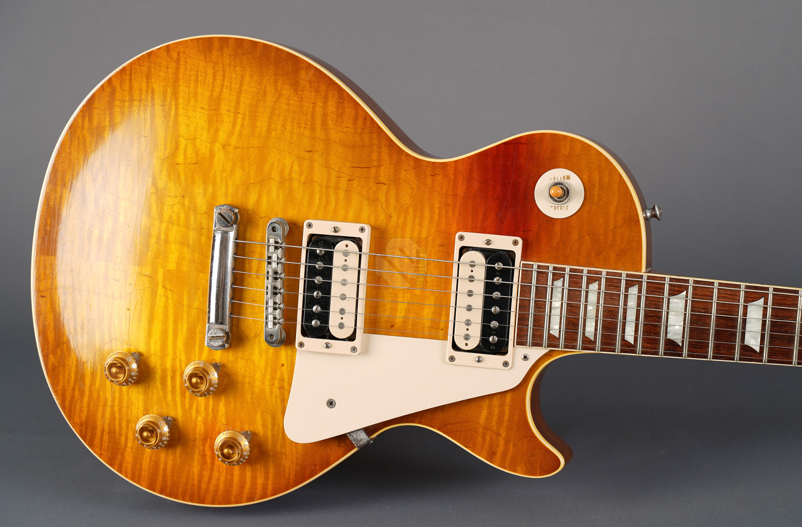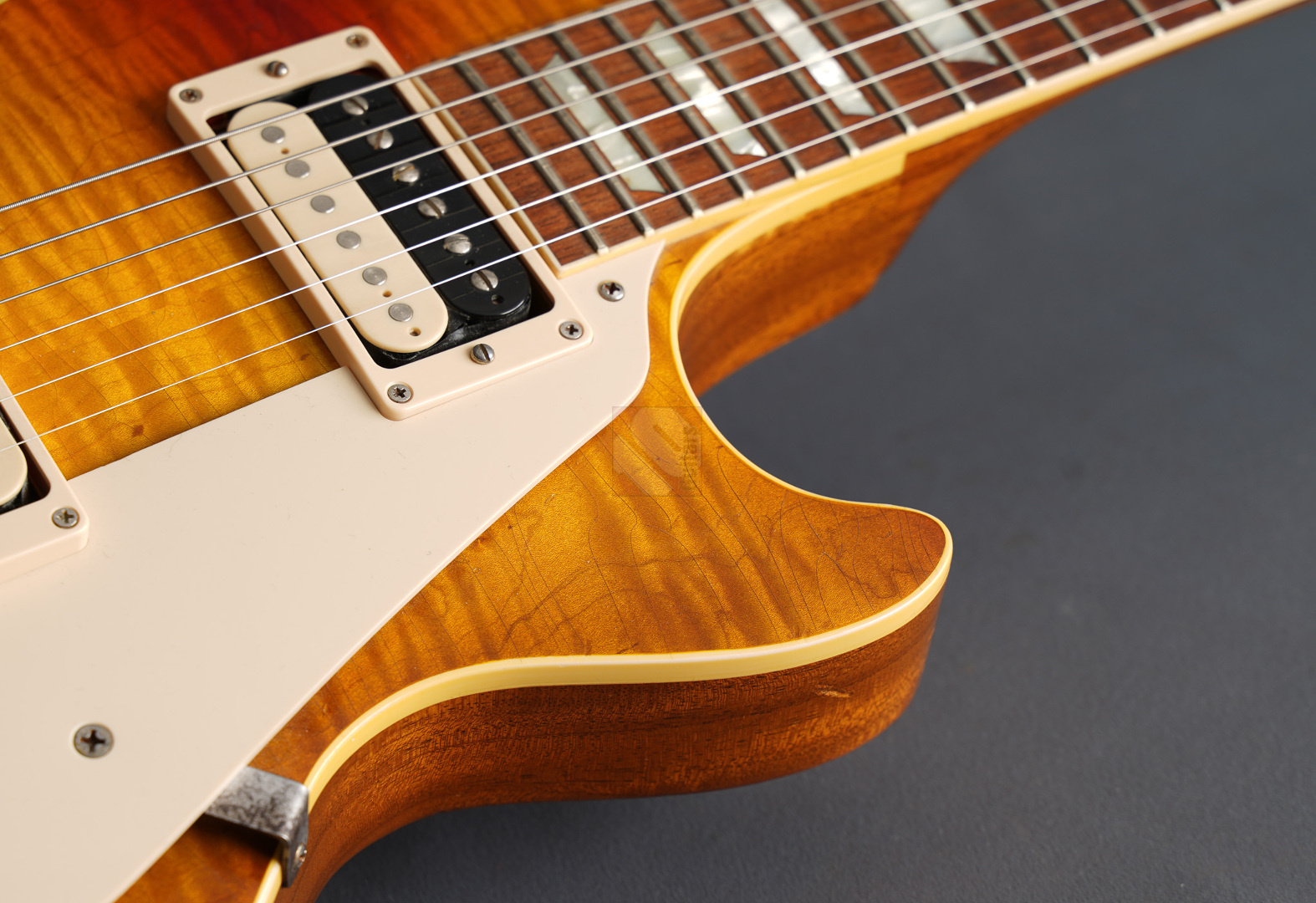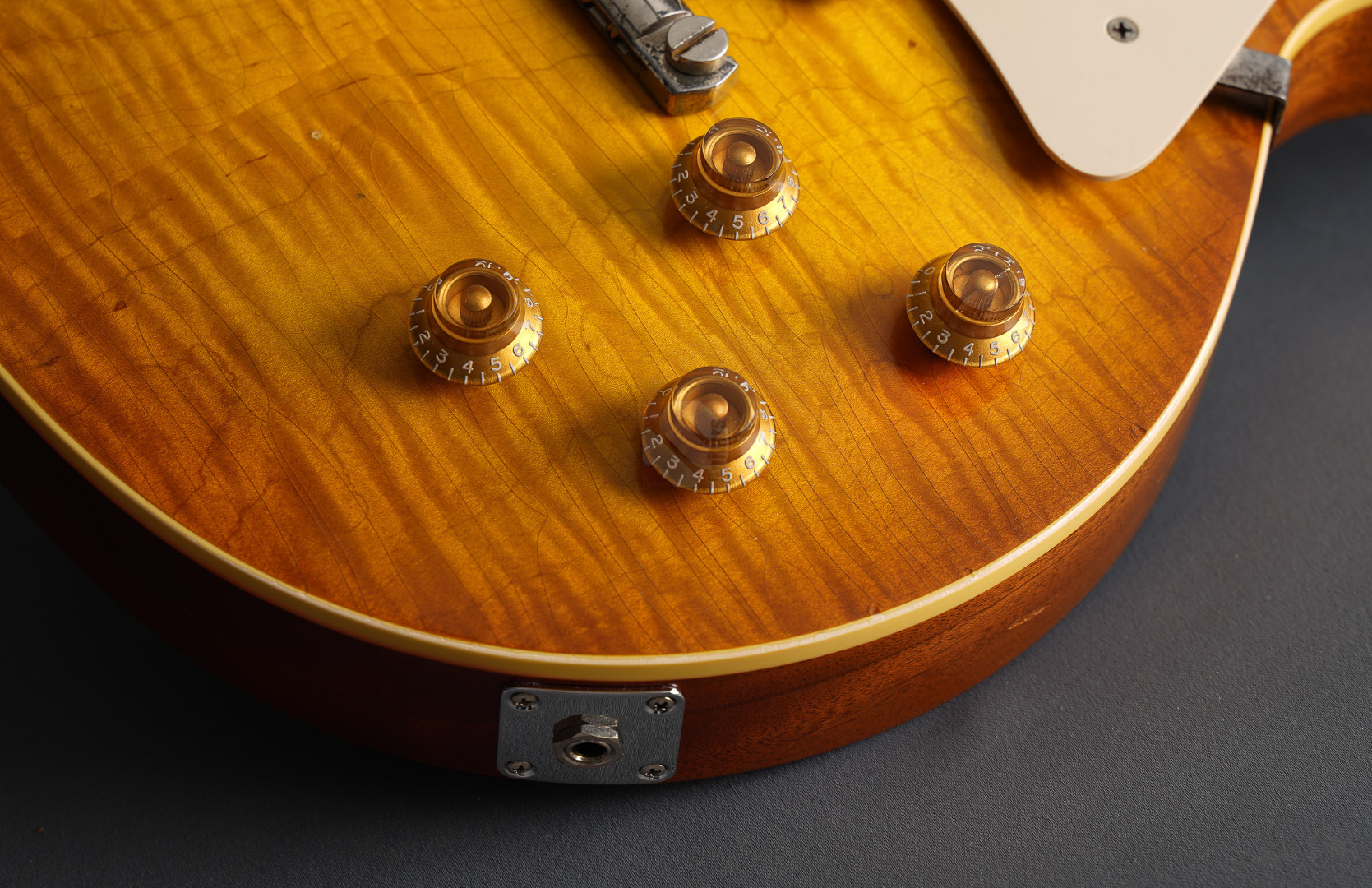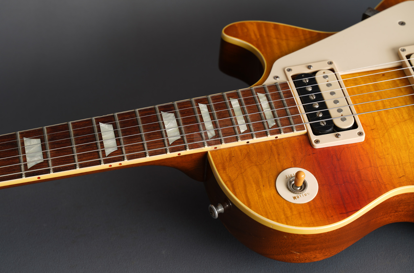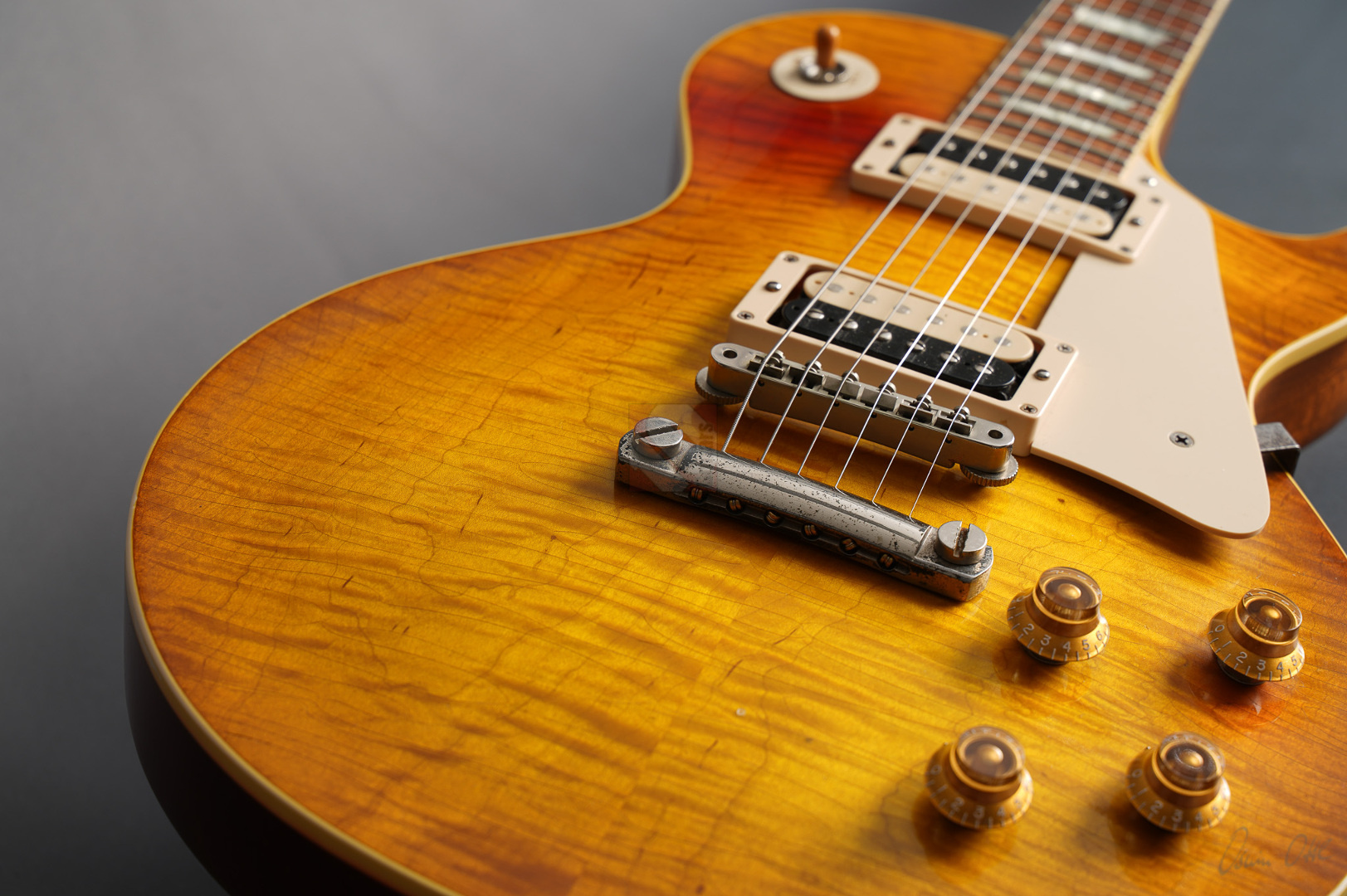 Was für eine unglaublich attraktive Les Paul! Wahnsinnsdecke mit einem tollen Farbverlauf, traumhafter Maserung, dezentem Aging und natürlich dem charakteristischen "Roten Auge", das als Namensgeber für die vorliegende Collectors-Choice fungiert. Akribisch wurde hier das 59er Original von Ed King – unter anderem ehemaliger Gitarrist von Lynyrd Skynyrd – repliziert, wodurch diese Paula einen super authentischen Look zeigt, der das Erscheinungsbild einer alten Burst perfekt nachempfindet. Dieser Eindruck wird sogar noch verstärkt, wenn man sich die Rückseite dieser Redeye ansieht, die bereits fantastisch "gefaded" ist, sodass das ursprüngliche Dunkelrot – wie bei den Originalen aus dem goldenen 59er Jahrgang – nur noch stellenweise zu sehen ist. Schon trocken angespielt schwingt die CC#16 überdurchschnittlich gut und klingt richtig voll, voluminös, resonant und ausgewogen. Am Amp bekommt man das Grinsen nicht mehr aus dem Gesicht. Die Redeye schmatzt, spricht, singt mit einer super Dynamik. Klanglich wirklich absolute Oberklasse! Darüber hinaus spielt sich dieses fantastische Instrument mit nur 3995 Gramm und seinem äußerst komfortablen 59er Medium-Hals einfach hervorragend, sodass man stundenlang über das attraktive Palisandergriffbrett flitzen möchte. Diese auf lediglich 300 Exemplare limitierte Paula, die als Collectors-Choice natürlich auch für besten Werterhalt sorgt, kommt bis auf kleinere Spielspuren auf den ersten Bünden in Top-Zustand zu ihrem zukünftigen Besitzer, dem wir zum Erwerb dieses Prachtstücks schon jetzt beglückwünschen möchten.