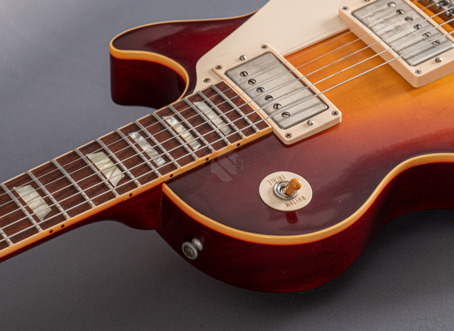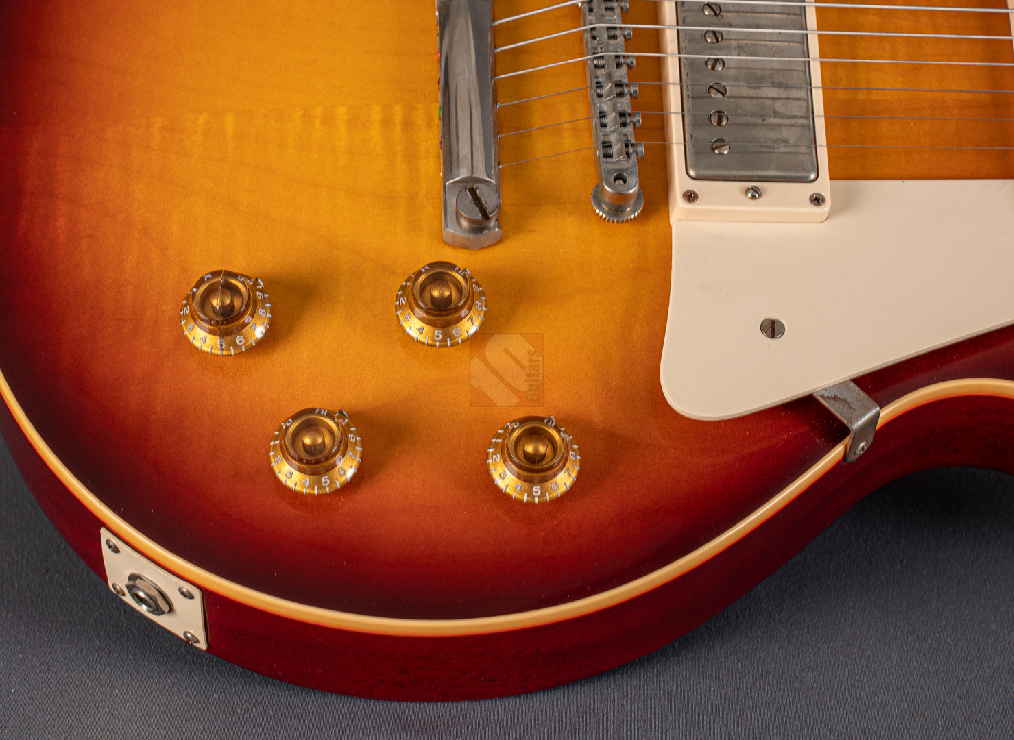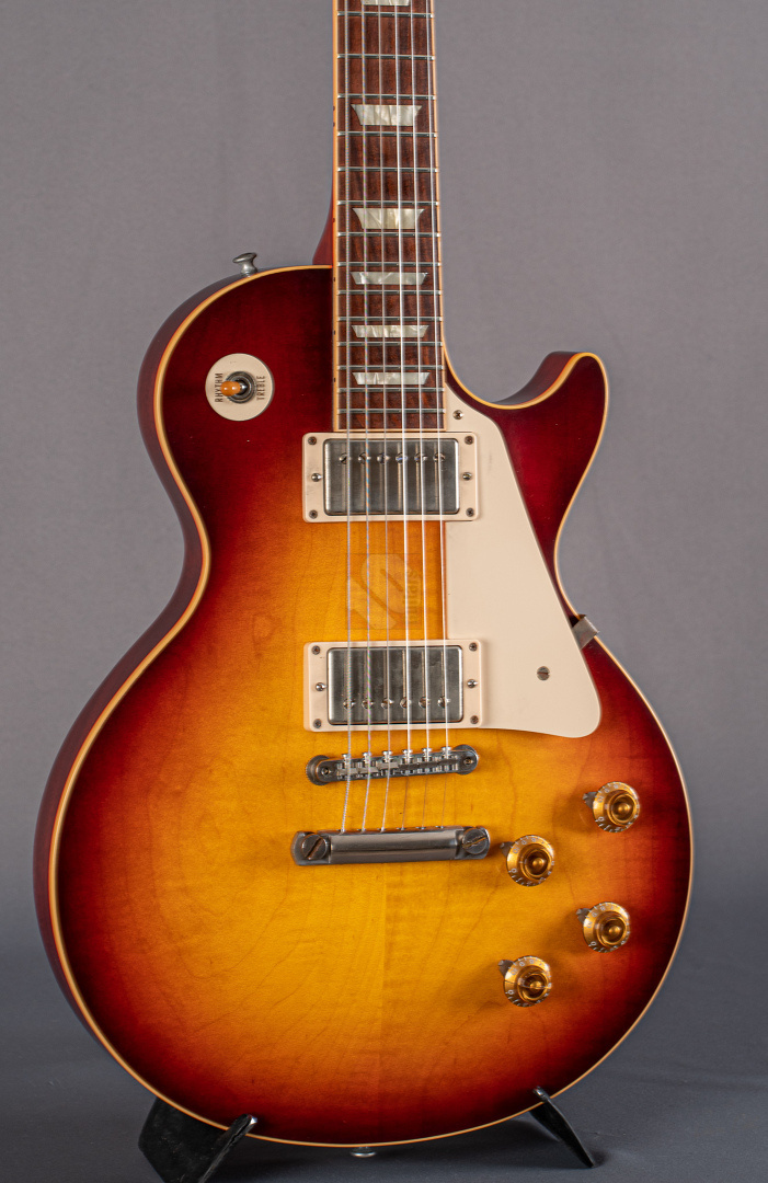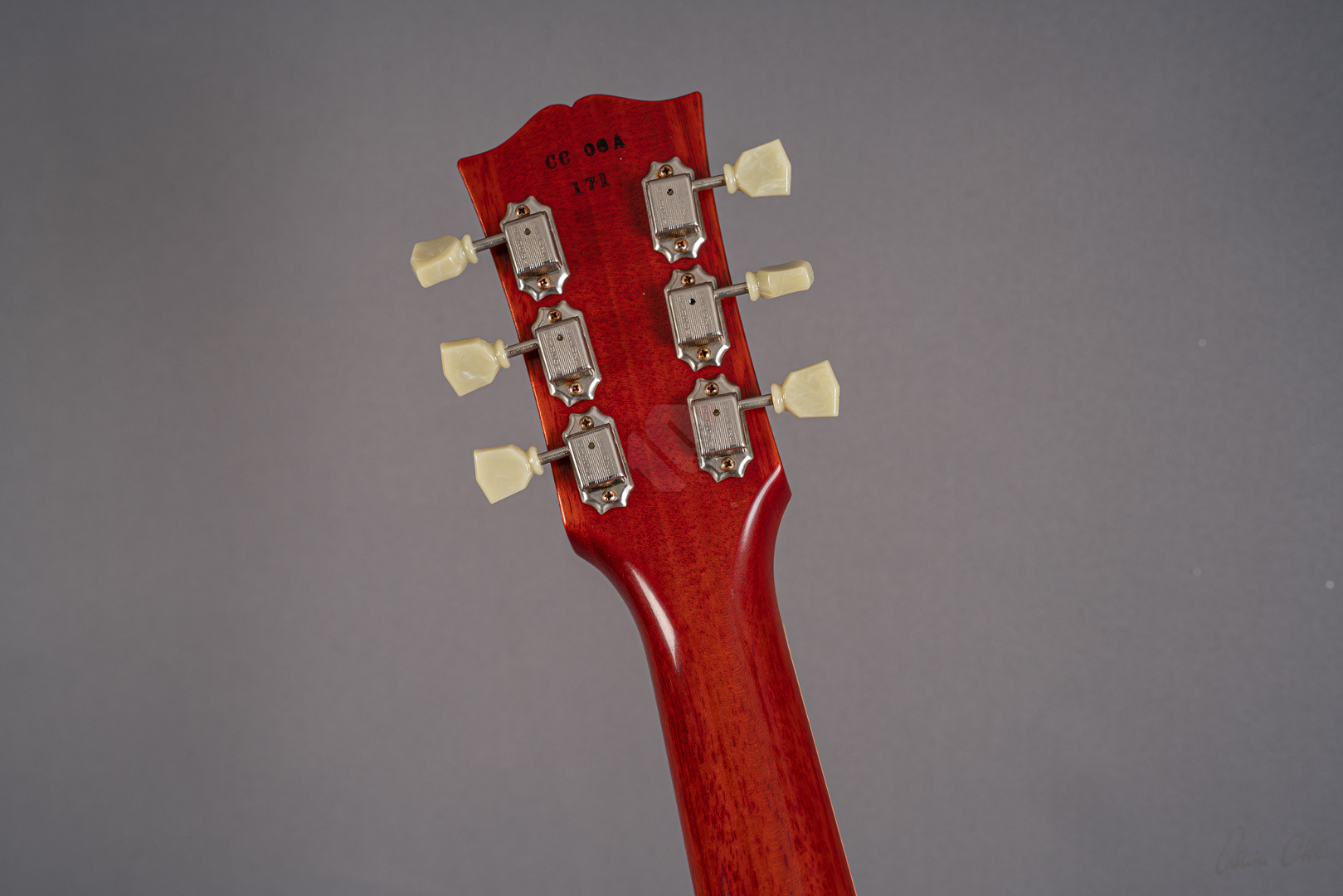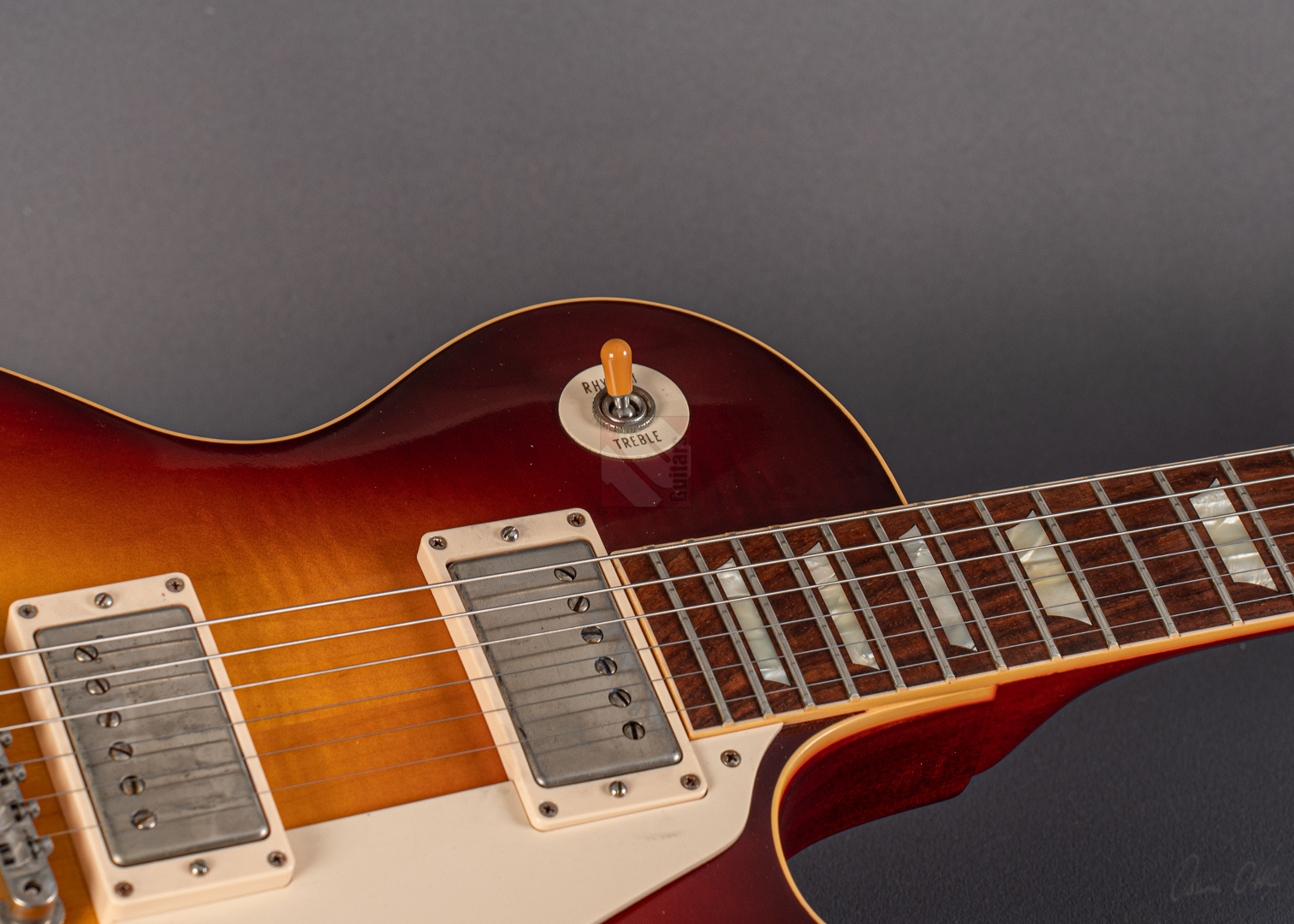 Wer auf der Suche nach einer Collectors-Choice mit bestem Preis-Leistungsverhältnis ist, kommt an der CC#6 "Number One" nicht vorbei. Diese besondere Les Paul ist eine exakte Replika der 59er Paula von Mike Slubowski, auch als "Number One" bekannt. Das Original gehört zu den wohl best erhaltensten Les Pauls aus dem goldenen Jahr 1959, weshalb auch das Aging der Replika relativ dezent ausfällt, um den Top-Zustand des Originals widerzuspiegeln. Weiterhin zeigt dieses Exemplar wunderschön dezente Ghost-Flames, wodurch es aus manchen Winkeln wie eine Plain-Top erscheint, und bezaubert mit seinem attraktiven "Non-Filtered Tobacco Burst". Überaus authentisch! Der Hals ist vergleichsweise etwas dicker als bei den meisten anderen CCs, annähernd wie ein 58er Hals. Aber schon aufgrund der Rounded-Shoulders keinesfalls zu fett und spielt sich super in Verbindung mit einem Idealgewicht von 3970 Gramm. Und der kräftigere Neck beeinflusst natürlich auch das fantastische Schwingungsverhalten der Gitarre! Am Amp zeigen die beiden Custombucker, wo der Hammer hängt. Schmatziger und mittiger Rocksound, bratend und kompromisslos! Hier bringt man sämtliche Röhren zum Glühen. Genauso stellt man sich die optimale Rock-Paula vor! ...und das Ganze noch aus Sammlerhand, sodass wir Euch dieses Prachtstück in absolutem Top-Zustand anbieten können.