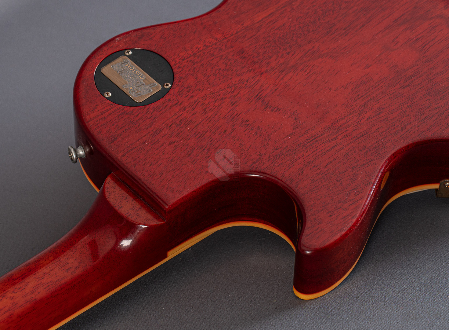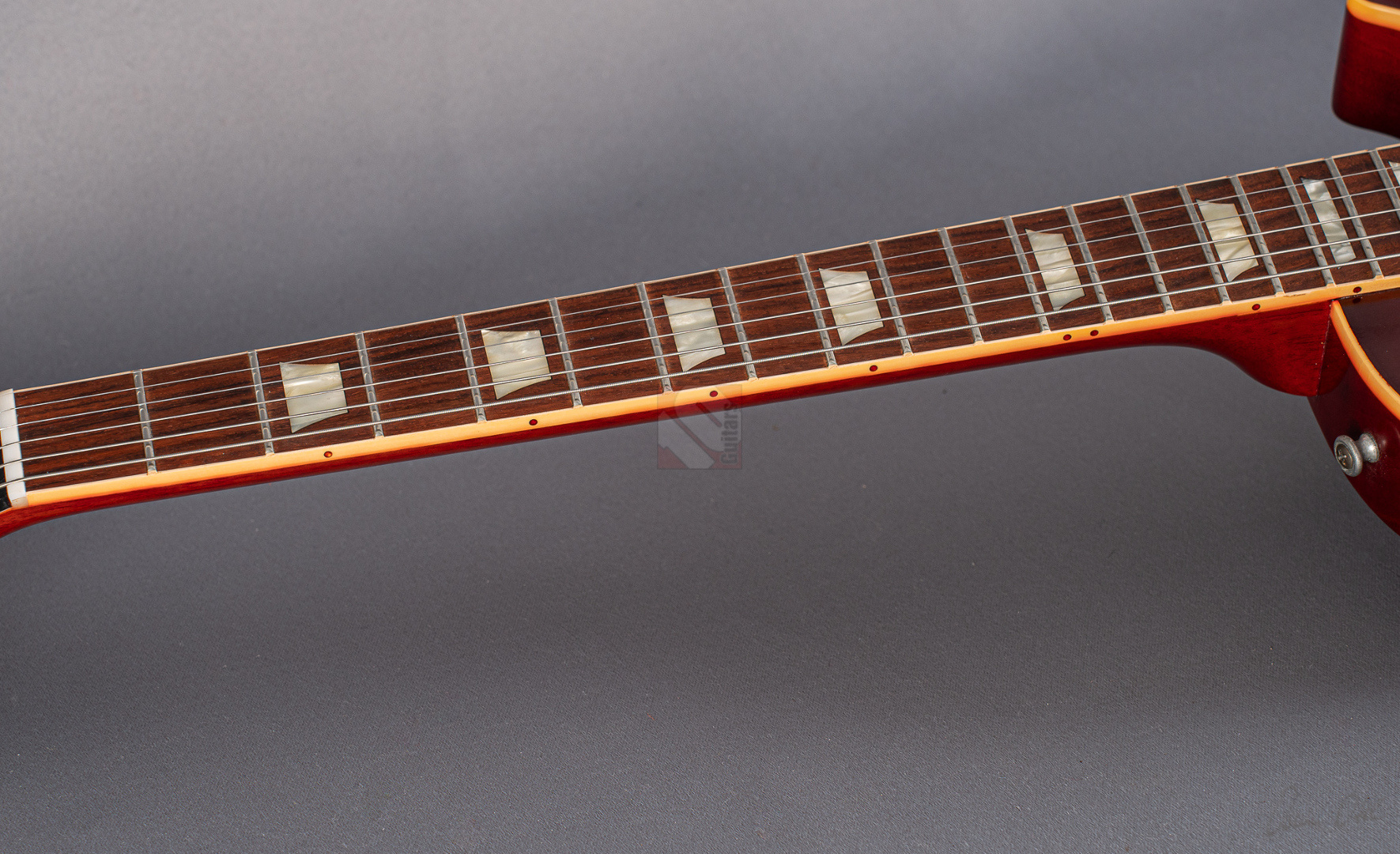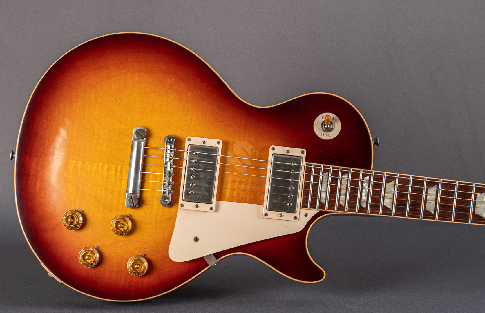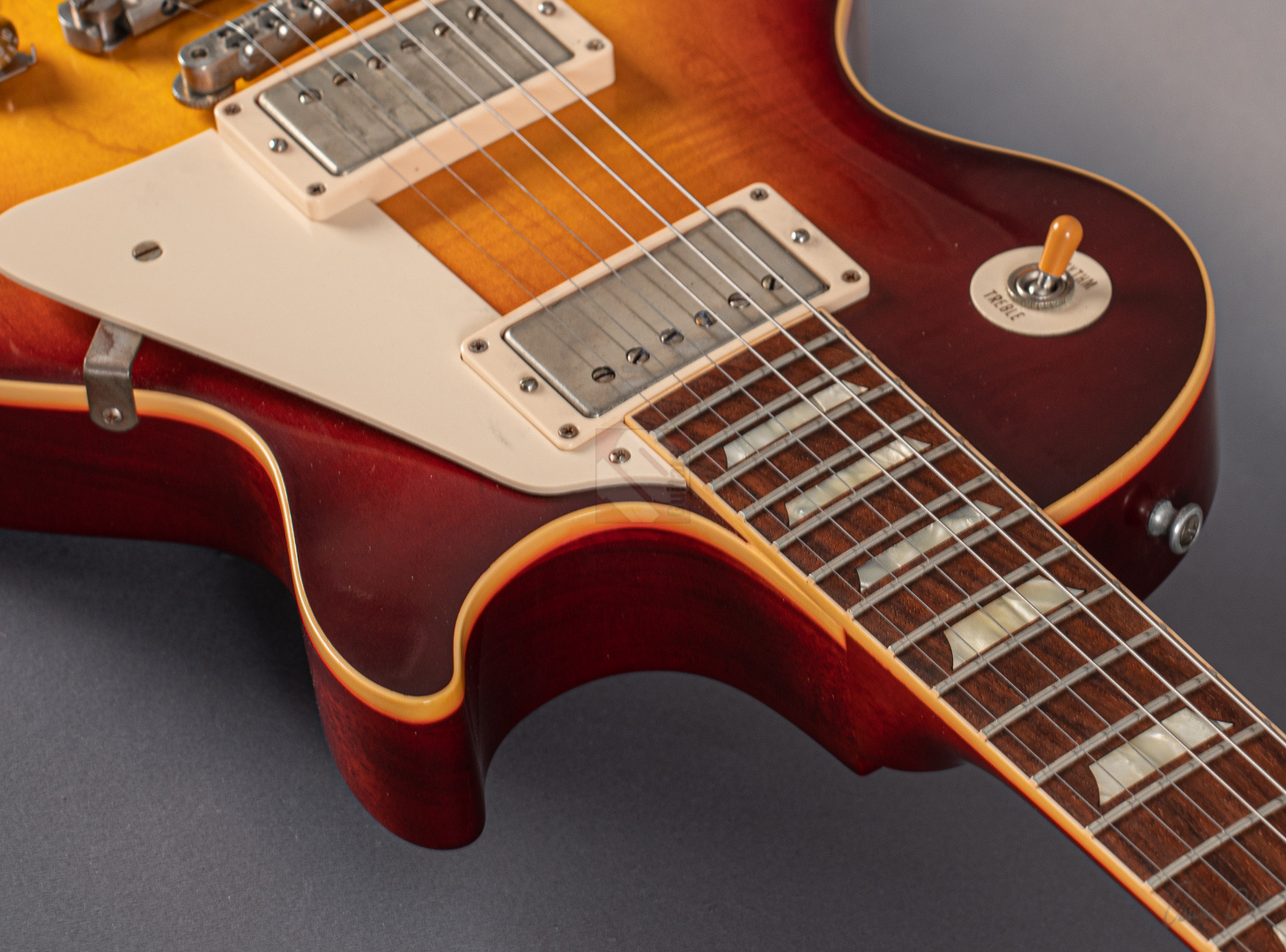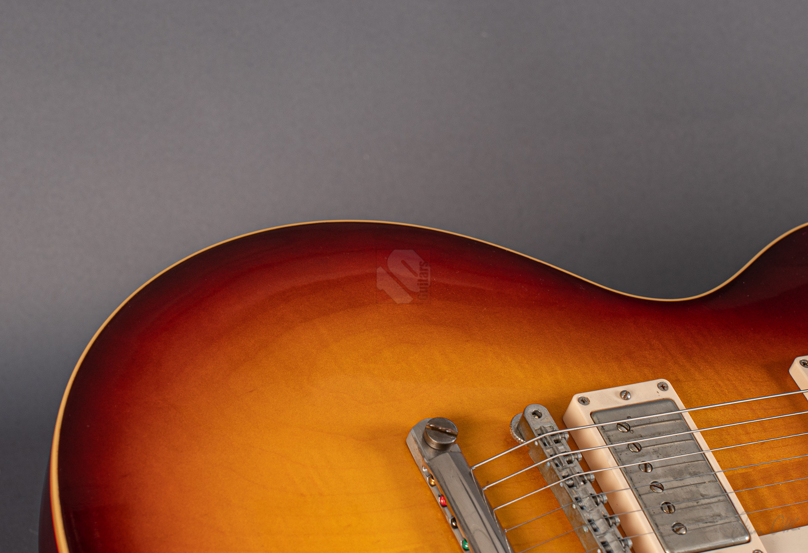 Wer auf der Suche nach einer Collectors-Choice mit bestem Preis-Leistungsverhältnis ist, kommt an der CC#6 "Number One" nicht vorbei. Diese besondere Les Paul ist eine exakte Replika der 59er Paula von Mike Slubowski, auch als "Number One" bekannt. Das Original gehört zu den wohl best erhaltensten Les Pauls aus dem goldenen Jahr 1959, weshalb auch das Aging der Replika relativ dezent ausfällt, um den Top-Zustand des Originals widerzuspiegeln. Weiterhin zeigt dieses Exemplar wunderschön dezente Ghost-Flames, wodurch es aus manchen Winkeln wie eine Plain-Top erscheint, und bezaubert mit seinem attraktiven "Non-Filtered Tobacco Burst". Überaus authentisch! Der Hals ist vergleichsweise etwas dicker als bei den meisten anderen CCs, annähernd wie ein 58er Hals. Aber schon aufgrund der Rounded-Shoulders keinesfalls zu fett und spielt sich super in Verbindung mit einem Idealgewicht von 3970 Gramm. Und der kräftigere Neck beeinflusst natürlich auch das fantastische Schwingungsverhalten der Gitarre! Am Amp zeigen die beiden Custombucker, wo der Hammer hängt. Schmatziger und mittiger Rocksound, bratend und kompromisslos! Hier bringt man sämtliche Röhren zum Glühen. Genauso stellt man sich die optimale Rock-Paula vor! ...und das Ganze noch aus Sammlerhand, sodass wir Euch dieses Prachtstück in absolutem Top-Zustand anbieten können.