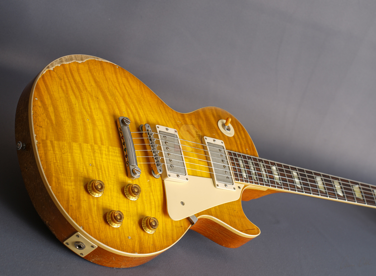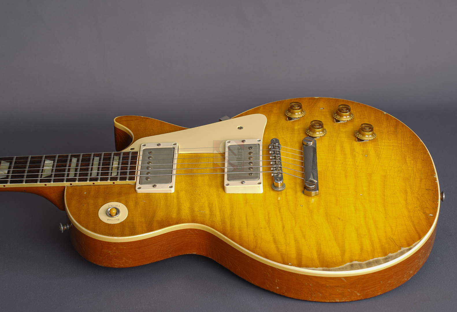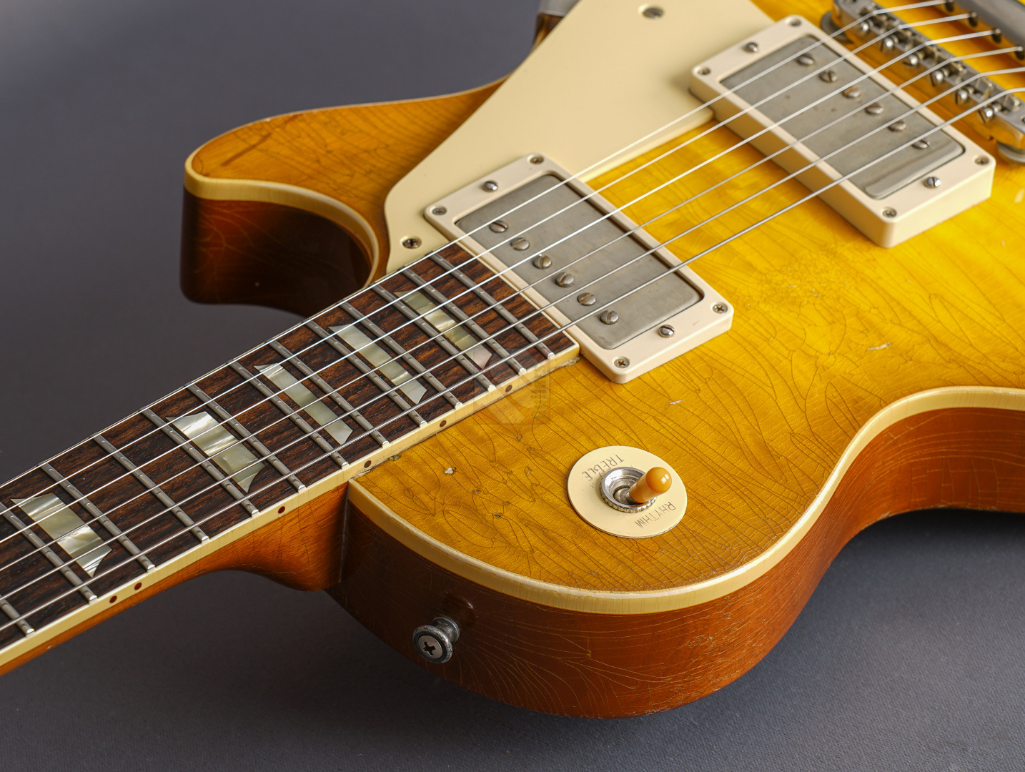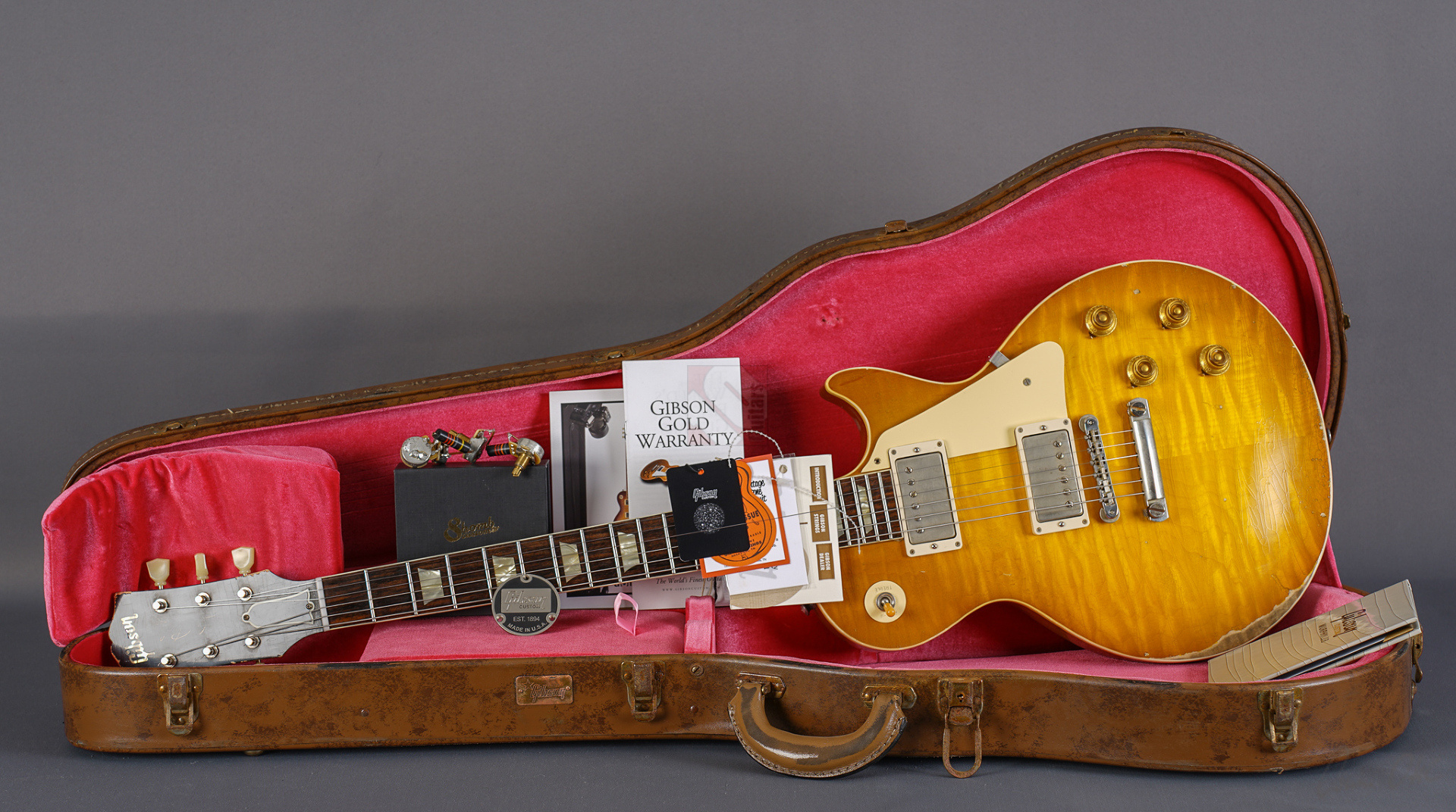Boom! Manchmal bekommt man eine Gitarre in die Hand, die schon richtig geil war, als sie ursprünglich die Gibson-Factory verlassen hatte. Wenn sie dann aber noch durch stimmige, soundmächtige und leider auch teure Upgrades veredelt wurde, hält man letztendlich ein prächtiges Einzelstück in Händen, das perfekt optimiert wurde. Um genau so ein Schmuckstück handelt es sich hier! Schon werksseitig mit einer phänomenal gemaserten Decke und einem super authentischen Lemon-Burst-Finish ausgestattet, bei dem aus wirklich jedem Blickwinkel eine neue, interessante Nuance erkennbar ist. Darüber hinaus ein detailliertes Ultra-Heavy-Aging mit unzähligen Dings, Dongs, Haarrissen und lackfreien Stellen, das ein Erscheinungsbild einer viel gespielten Vintage-Paula erzeugt. Schließlich ein Hals, der ein super komfortables 59er Medium-Profil zeigt, das in Verbindung mit einem Traumgewicht von lediglich 3780 Gramm allerbesten Spielkomfort gewährleistet. Liegt spitzenmäßig in der Hand und bietet stundenlange, ermüdungsfreie Spielfreude. Und nun wurden hier noch die originalen Custombucker und die originale Elektronik (Potis und Bumble-Bees) durch Bauteile aus der Edelschmiede 8bomb des Dr. Nitro Alex Dovnar ersetzt (Originalteile beiliegend). Was für ein fantastischer Upgrade! Die 8bomb '59 PAF Clones sind – wie der Name schon sagt – in akribischster Weise an originalen PAFs orientiert. Wie Dr. Nitro selbst ausführt: "Meine wichtigste Aufgabe war es, den Klang und die Klangfarbe des originalen PAF und seine unglaubliche Dynamik nachzubilden. Die meisten modernen Tonabnehmer besitzen diese Eigenschaften und Nuancen nicht. (...) In den folgenden Jahren experimentierte ich und lernte, die Abhängigkeit verschiedener Produktionsparameter zu verstehen und anzupassen, um diesen unverwechselbaren PAF-Sound zu erzielen. Dafür musste ich eigene Bauteile entwickeln, die für den richtigen Klang verantwortlich sind. Heute fertige ich Bauteile an und bestelle sie direkt beim Hersteller, sodass sie exakt meinen Anforderungen entsprechen und den klaren und warmen PAF-Sound reproduzieren, den wir alle von unseren Lieblingsplatten kennen. Meine 8Bomb PAF-Klone sind Nachbildungen der originalen 'Patent Applied For'-Pickups von 1958, 1959 und 1961. Sie unterscheiden sich leicht in Dynamik und Klangnuancen, haben aber alle denselben Charakter." Und seine Akribie, Leidenschaft und Detailversesseneheit zeigt sich auch im Klang der vorliegenden Les Paul: ungemein luftig, transparent mit genau den Mitten und perligen Höhen, die man mit alten PAFs in Verbindung bringt. Super dynamischer, offener Sound mit einem klasse Ton! Am Steg schmatzend und fett, am Hals singend, dass es eine wahre Freude ist. Egal, ob Jazz, Blues oder Hardrock – diese Les Paul ist überall bestens zuhause und bedient alle Musikrichtungen mit Bravour. So freuen wir uns, Euch diese exklusive Les Paul in neuwertigem Zustand anbieten zu können.