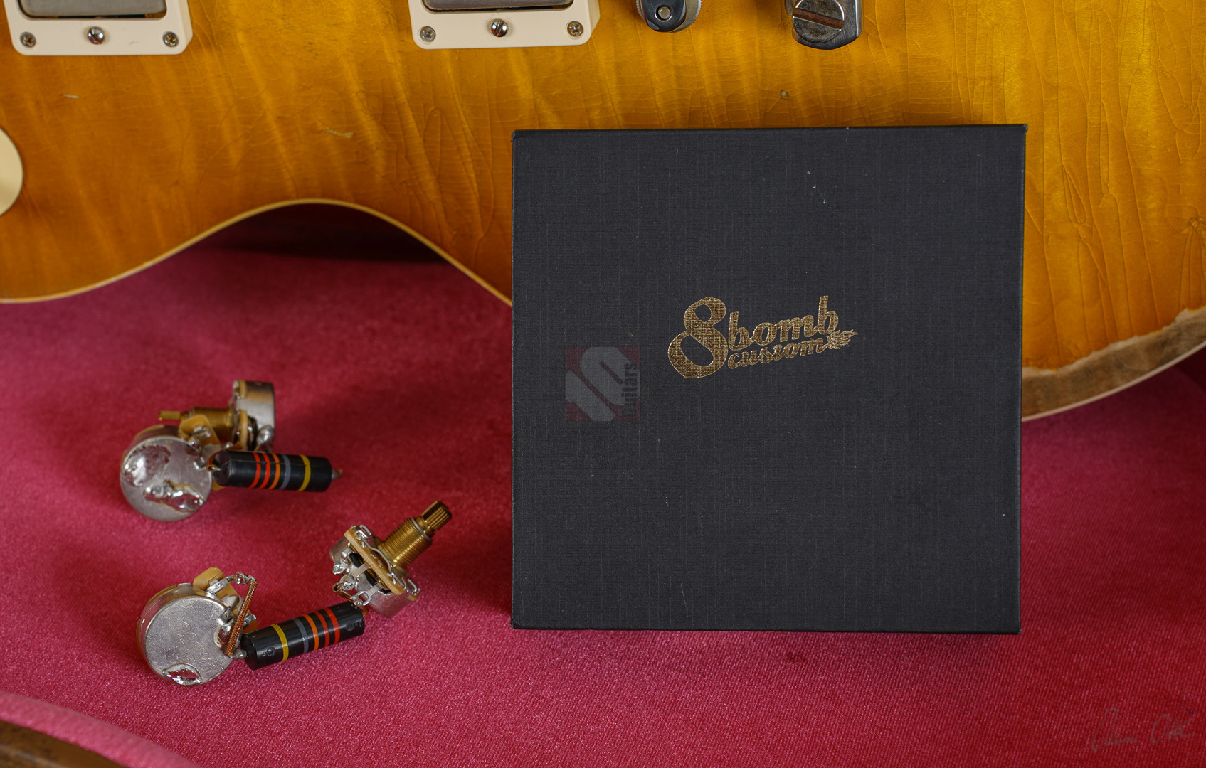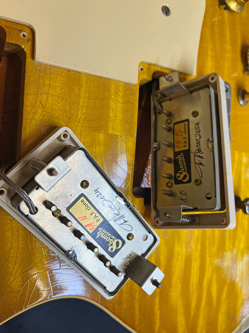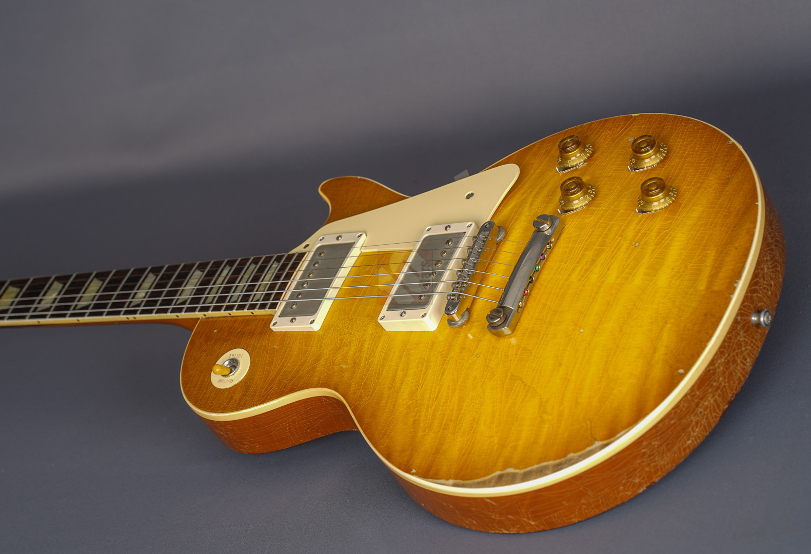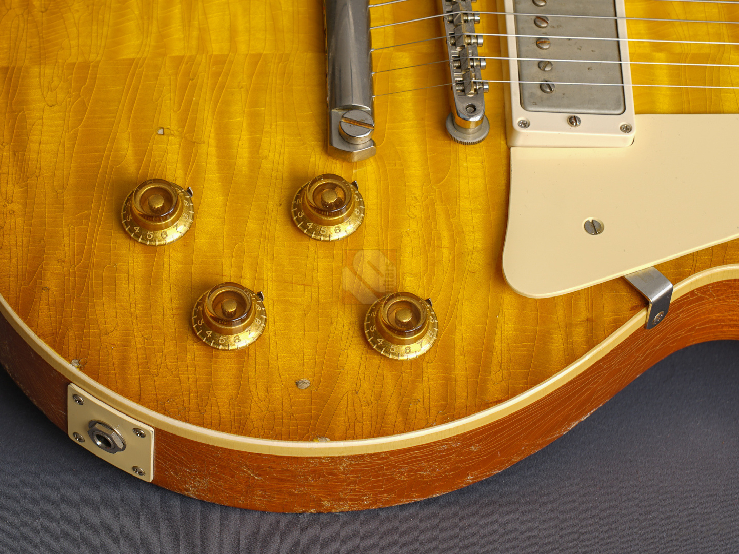 Boom! Manchmal bekommt man eine Gitarre in die Hand, die schon richtig geil war, als sie ursprünglich die Gibson-Factory verlassen hatte. Wenn sie dann aber noch durch stimmige, soundmächtige und leider auch teure Upgrades veredelt wurde, hält man letztendlich ein prächtiges Einzelstück in Händen, das perfekt optimiert wurde. Um genau so ein Schmuckstück handelt es sich hier! Schon werksseitig mit einer phänomenal gemaserten Decke und einem super authentischen Lemon-Burst-Finish ausgestattet, bei dem aus wirklich jedem Blickwinkel eine neue, interessante Nuance erkennbar ist. Darüber hinaus ein detailliertes Ultra-Heavy-Aging mit unzähligen Dings, Dongs, Haarrissen und lackfreien Stellen, das ein Erscheinungsbild einer viel gespielten Vintage-Paula erzeugt. Schließlich ein Hals, der ein super komfortables 59er Medium-Profil zeigt, das in Verbindung mit einem Traumgewicht von lediglich 3780 Gramm allerbesten Spielkomfort gewährleistet. Liegt spitzenmäßig in der Hand und bietet stundenlange, ermüdungsfreie Spielfreude. Und nun wurden hier noch die originalen Custombucker und die originale Elektronik (Potis und Bumble-Bees) durch Bauteile aus der Edelschmiede 8bomb des Dr. Nitro Alex Dovnar ersetzt (Originalteile beiliegend). Was für ein fantastischer Upgrade! Die 8bomb '59 PAF Clones sind – wie der Name schon sagt – in akribischster Weise an originalen PAFs orientiert. Wie Dr. Nitro selbst ausführt: "Meine wichtigste Aufgabe war es, den Klang und die Klangfarbe des originalen PAF und seine unglaubliche Dynamik nachzubilden. Die meisten modernen Tonabnehmer besitzen diese Eigenschaften und Nuancen nicht. (...) In den folgenden Jahren experimentierte ich und lernte, die Abhängigkeit verschiedener Produktionsparameter zu verstehen und anzupassen, um diesen unverwechselbaren PAF-Sound zu erzielen. Dafür musste ich eigene Bauteile entwickeln, die für den richtigen Klang verantwortlich sind. Heute fertige ich Bauteile an und bestelle sie direkt beim Hersteller, sodass sie exakt meinen Anforderungen entsprechen und den klaren und warmen PAF-Sound reproduzieren, den wir alle von unseren Lieblingsplatten kennen. Meine 8Bomb PAF-Klone sind Nachbildungen der originalen 'Patent Applied For'-Pickups von 1958, 1959 und 1961. Sie unterscheiden sich leicht in Dynamik und Klangnuancen, haben aber alle denselben Charakter." Und seine Akribie, Leidenschaft und Detailversesseneheit zeigt sich auch im Klang der vorliegenden Les Paul: ungemein luftig, transparent mit genau den Mitten und perligen Höhen, die man mit alten PAFs in Verbindung bringt. Super dynamischer, offener Sound mit einem klasse Ton! Am Steg schmatzend und fett, am Hals singend, dass es eine wahre Freude ist. Egal, ob Jazz, Blues oder Hardrock – diese Les Paul ist überall bestens zuhause und bedient alle Musikrichtungen mit Bravour. So freuen wir uns, Euch diese exklusive Les Paul in neuwertigem Zustand anbieten zu können.