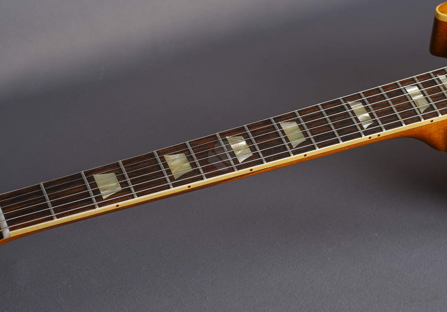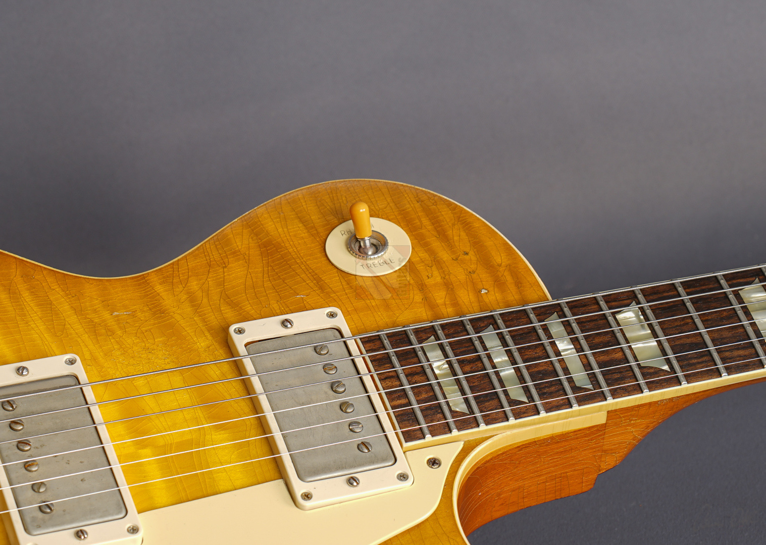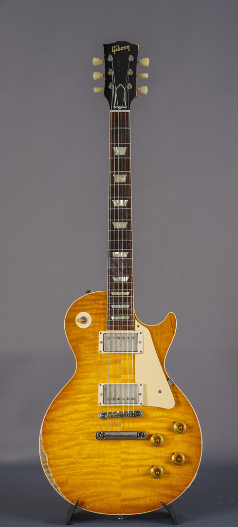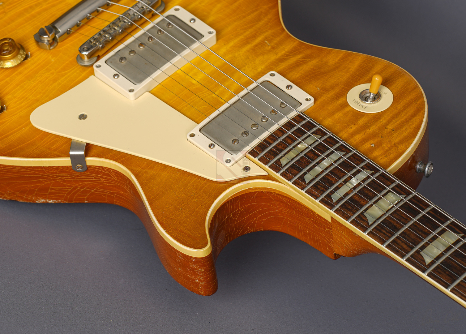 Boom! Manchmal bekommt man eine Gitarre in die Hand, die schon richtig geil war, als sie ursprünglich die Gibson-Factory verlassen hatte. Wenn sie dann aber noch durch stimmige, soundmächtige und leider auch teure Upgrades veredelt wurde, hält man letztendlich ein prächtiges Einzelstück in Händen, das perfekt optimiert wurde. Um genau so ein Schmuckstück handelt es sich hier! Schon werksseitig mit einer phänomenal gemaserten Decke und einem super authentischen Lemon-Burst-Finish ausgestattet, bei dem aus wirklich jedem Blickwinkel eine neue, interessante Nuance erkennbar ist. Darüber hinaus ein detailliertes Ultra-Heavy-Aging mit unzähligen Dings, Dongs, Haarrissen und lackfreien Stellen, das ein Erscheinungsbild einer viel gespielten Vintage-Paula erzeugt. Schließlich ein Hals, der ein super komfortables 59er Medium-Profil zeigt, das in Verbindung mit einem Traumgewicht von lediglich 3780 Gramm allerbesten Spielkomfort gewährleistet. Liegt spitzenmäßig in der Hand und bietet stundenlange, ermüdungsfreie Spielfreude. Und nun wurden hier noch die originalen Custombucker und die originale Elektronik (Potis und Bumble-Bees) durch Bauteile aus der Edelschmiede 8bomb des Dr. Nitro Alex Dovnar ersetzt (Originalteile beiliegend). Was für ein fantastischer Upgrade! Die 8bomb '59 PAF Clones sind – wie der Name schon sagt – in akribischster Weise an originalen PAFs orientiert. Wie Dr. Nitro selbst ausführt: "Meine wichtigste Aufgabe war es, den Klang und die Klangfarbe des originalen PAF und seine unglaubliche Dynamik nachzubilden. Die meisten modernen Tonabnehmer besitzen diese Eigenschaften und Nuancen nicht. (...) In den folgenden Jahren experimentierte ich und lernte, die Abhängigkeit verschiedener Produktionsparameter zu verstehen und anzupassen, um diesen unverwechselbaren PAF-Sound zu erzielen. Dafür musste ich eigene Bauteile entwickeln, die für den richtigen Klang verantwortlich sind. Heute fertige ich Bauteile an und bestelle sie direkt beim Hersteller, sodass sie exakt meinen Anforderungen entsprechen und den klaren und warmen PAF-Sound reproduzieren, den wir alle von unseren Lieblingsplatten kennen. Meine 8Bomb PAF-Klone sind Nachbildungen der originalen 'Patent Applied For'-Pickups von 1958, 1959 und 1961. Sie unterscheiden sich leicht in Dynamik und Klangnuancen, haben aber alle denselben Charakter." Und seine Akribie, Leidenschaft und Detailversesseneheit zeigt sich auch im Klang der vorliegenden Les Paul: ungemein luftig, transparent mit genau den Mitten und perligen Höhen, die man mit alten PAFs in Verbindung bringt. Super dynamischer, offener Sound mit einem klasse Ton! Am Steg schmatzend und fett, am Hals singend, dass es eine wahre Freude ist. Egal, ob Jazz, Blues oder Hardrock – diese Les Paul ist überall bestens zuhause und bedient alle Musikrichtungen mit Bravour. So freuen wir uns, Euch diese exklusive Les Paul in neuwertigem Zustand anbieten zu können.