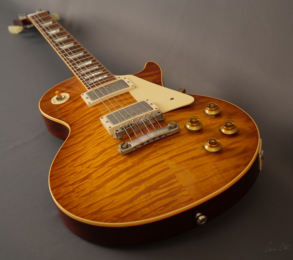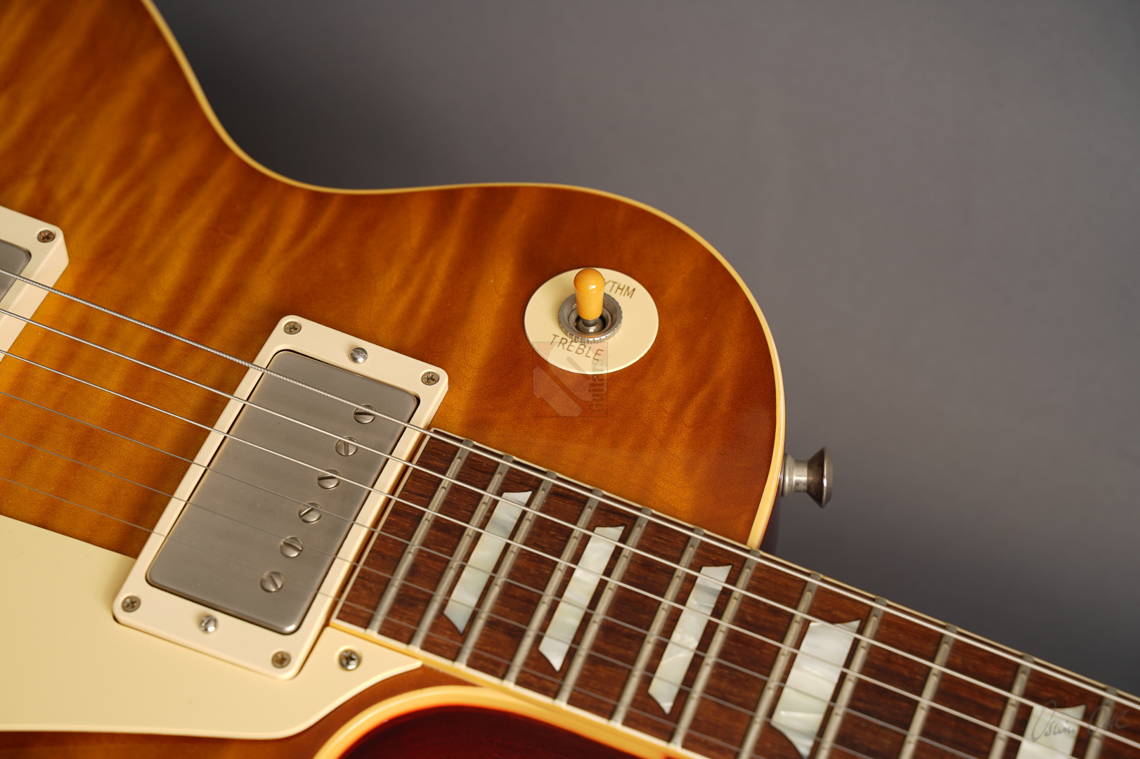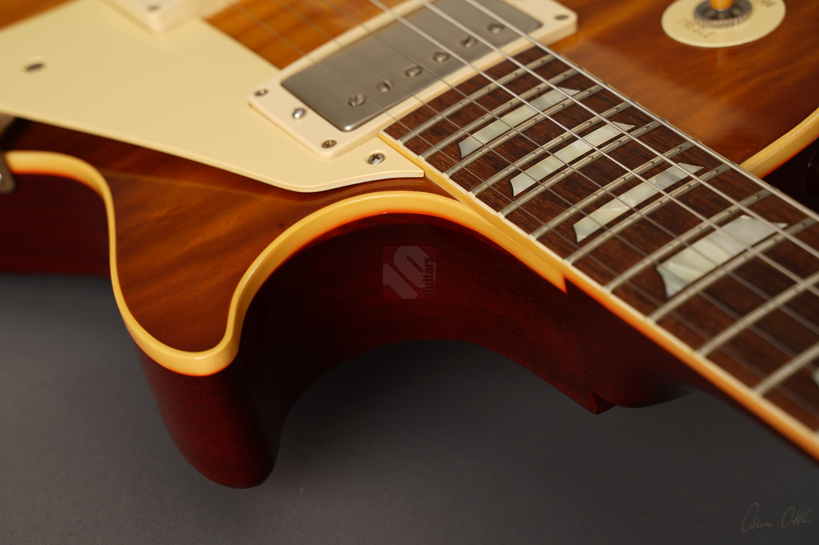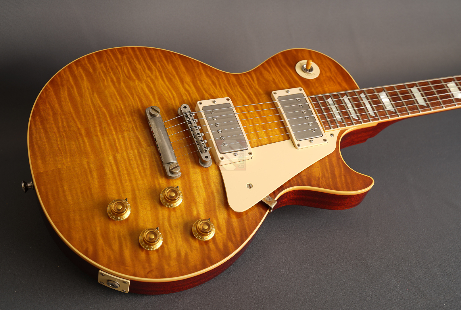 Diese Les Paul lässt sich tatsächlich nur in Superlativen beschreiben! Sie wurde als One-Off/Handselected für einen japanischen Händler gebaut. Allein die Decke ist optisch schon mal der Killer! Dazu kommt ein Gewicht von lediglich 3630 Gramm und eine wunderschöne "Iced Tea"-Lackierung, die es eigentlich bei den True-Historics so gar nicht gab. Wem die einzigartige Optik, das super Gewicht und das spitzenmäßige Handling und Schwingungsverhalten noch nicht genügen, der bekommt bei den Pickups gleich das nächste Highlite, indem der Vorbesitzer noch ein Pärchen der wohl meistgesuchtesten und gelobten PAF-Replikas von Tom Holmes in diese Les Paul eingebaut hat. "Tom Holmes"-Pickups werden mittlerweile mit Preisen über EUR 1.500,- gehandelt, wenn man überhaupt das Glück hat, welche zu bekommen. Hier wurden ein H450 sowie ein H455 verbaut und wenn man die Gitarre spielt, merkt man sofort, warum diese Pickups so begehrt sind. Näher kann man einer echten Burst nicht kommen; schmatzend, differenziert mit diesem leichten Strat-Anteil und der Offenheit, die die echten Bursts legendär machte. Die originalen Pickups sind natürlich beiliegend. Und um den Superlativ abzurunden, wurden auch noch zwei echte "50's Sprague Bumble Bee"-Capacitors verbaut. ...und natürlich sorgen das super komfortable 59er Medium-Halsprofil und ein Traumgewicht von unter 3,7 kg für allerbeste Playereigenschaften. Bis auf einen kleinen Ding neben der Buchse (siehe Bild) und minimale Spielspuren befindet sich diese ganz besondere Les Paul in Top-Zustand. So können wir dem zukünftigen Besitzer nur von ganzem Herzen zum Erwerb einer solch fantastischen Gitarre gratulieren.