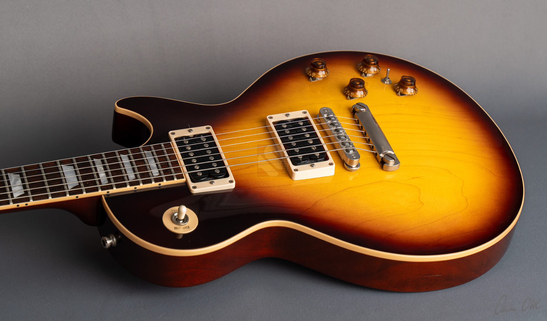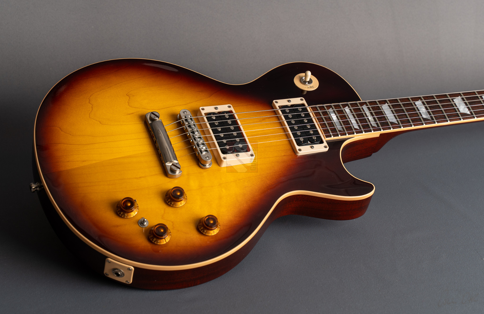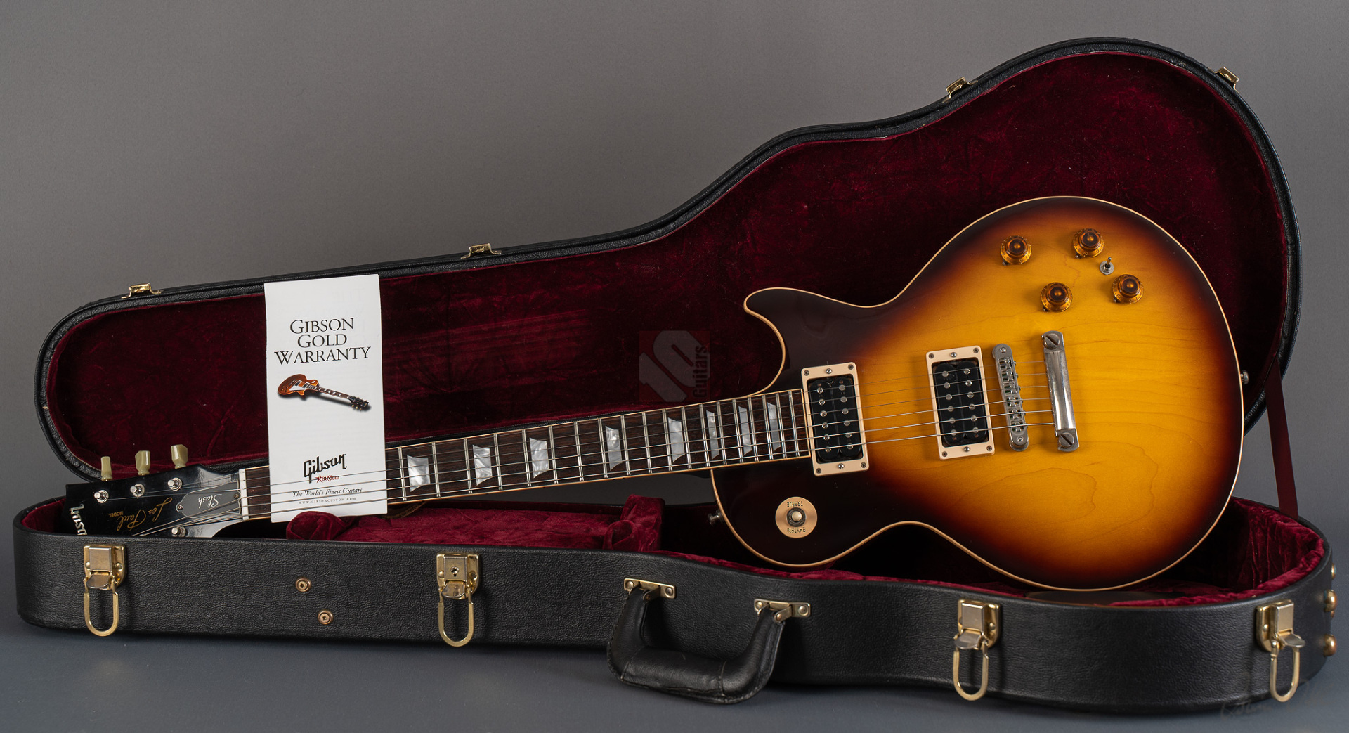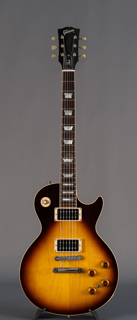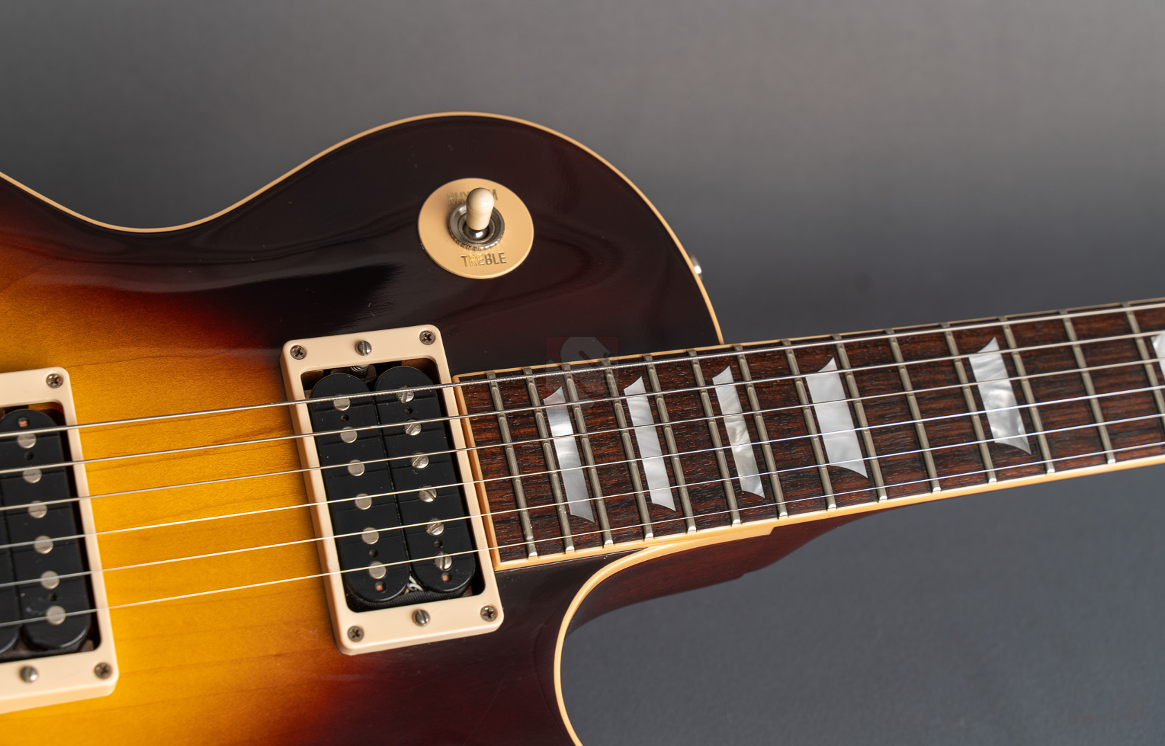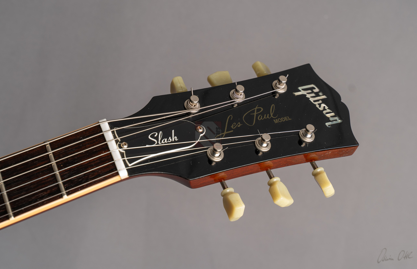 Slash aka Saul Hudson hat in seiner langjährigen Laufbahn viele Gibsons gespielt und dementsprechend gibt es auch vielerlei Signature-Reissues. Zu den interessantesten Gitarren aus dieser bunten Palette zählt für uns sicherlich die Gibson Les Paul Slash Signature Piezo. Eine Les Paul, die neben den fetten, schmatzigen und satten Tönen, für welche die verbauten Seymour Duncan "Alnico-II Pro"-Humbuckers verantwortlich zeichnen, auch noch über einen Piezo-Bridge-Tonabnehmer verfügt, der mittels Mini-Toggle-Switch geregelt wird und entweder alleine oder in Kombination mit dem Humbucker-Sound geschaltet werden kann. Und ganz ehrlich, dieser Piezo-Pickup ist wirklich eine Macht! Wir haben definitiv schon wesentlich schlechter klingende, echte Akustik-Gitarren gehört. Somit erhält man das Beste aus beiden Welten: den typischen, rockigen Slash-Sound und wunderbar sanfte, seidige Akustikklänge, sodass man außer für "Welcome in the Jungle" jederzeit auch für "One in a Million" bestens gerüstet ist. Weiterhin spielt sich der angenehme Medium-Neck mit den Rounded-Shoulders bestens. Dass darüber hinaus das dunkle Tobacco-Finish mit dem tollem Sunburst und sensationellem Farbverlauf so richtig gut aussieht, rundet das perfekte Gesamtpaket optimal ab. Wir können Euch die Gitarre bis auf minimale Spiel- und Gebrauchsspuren in Top-Zustand anbieten.