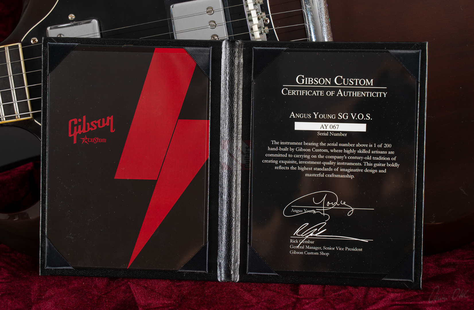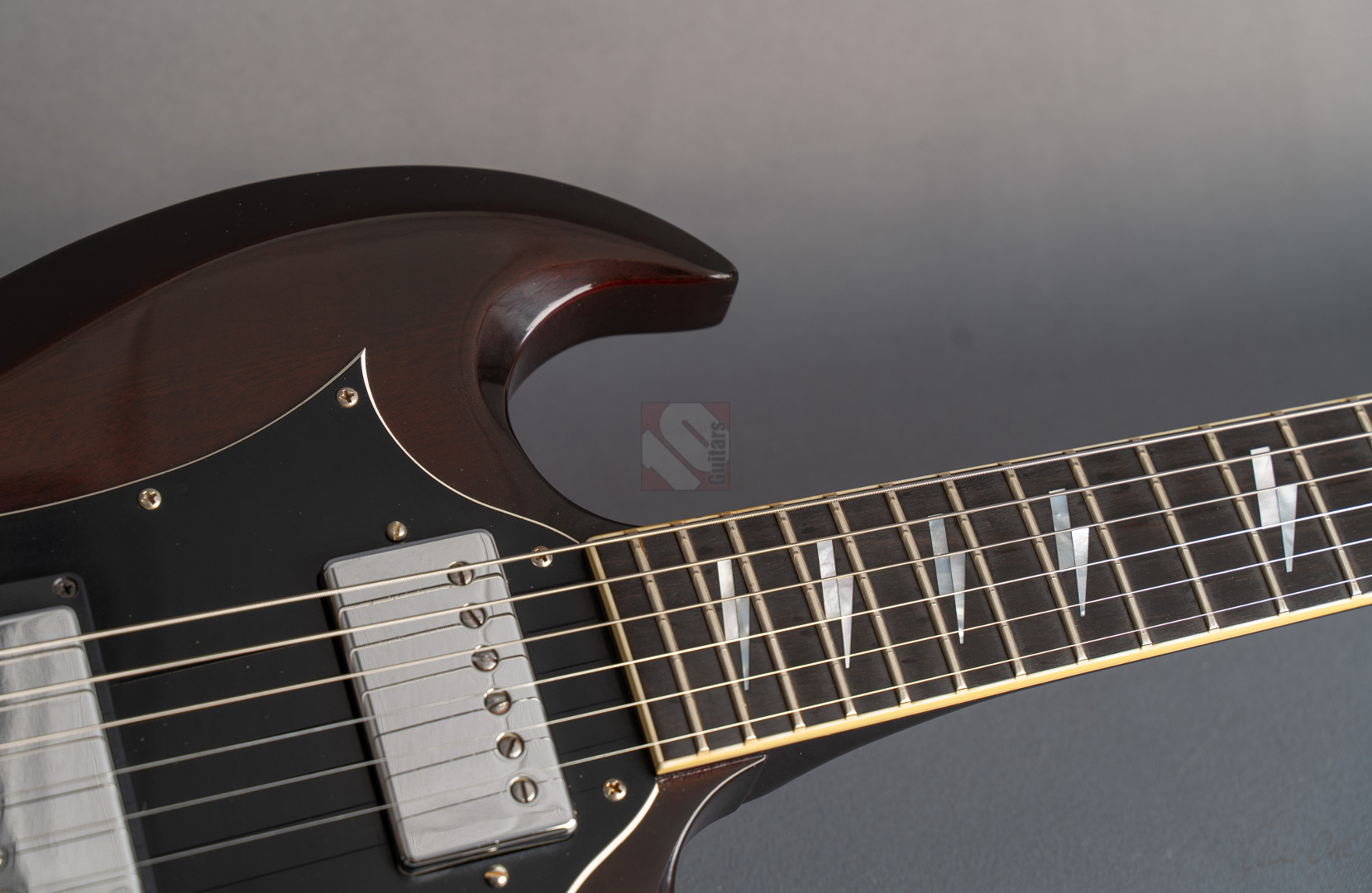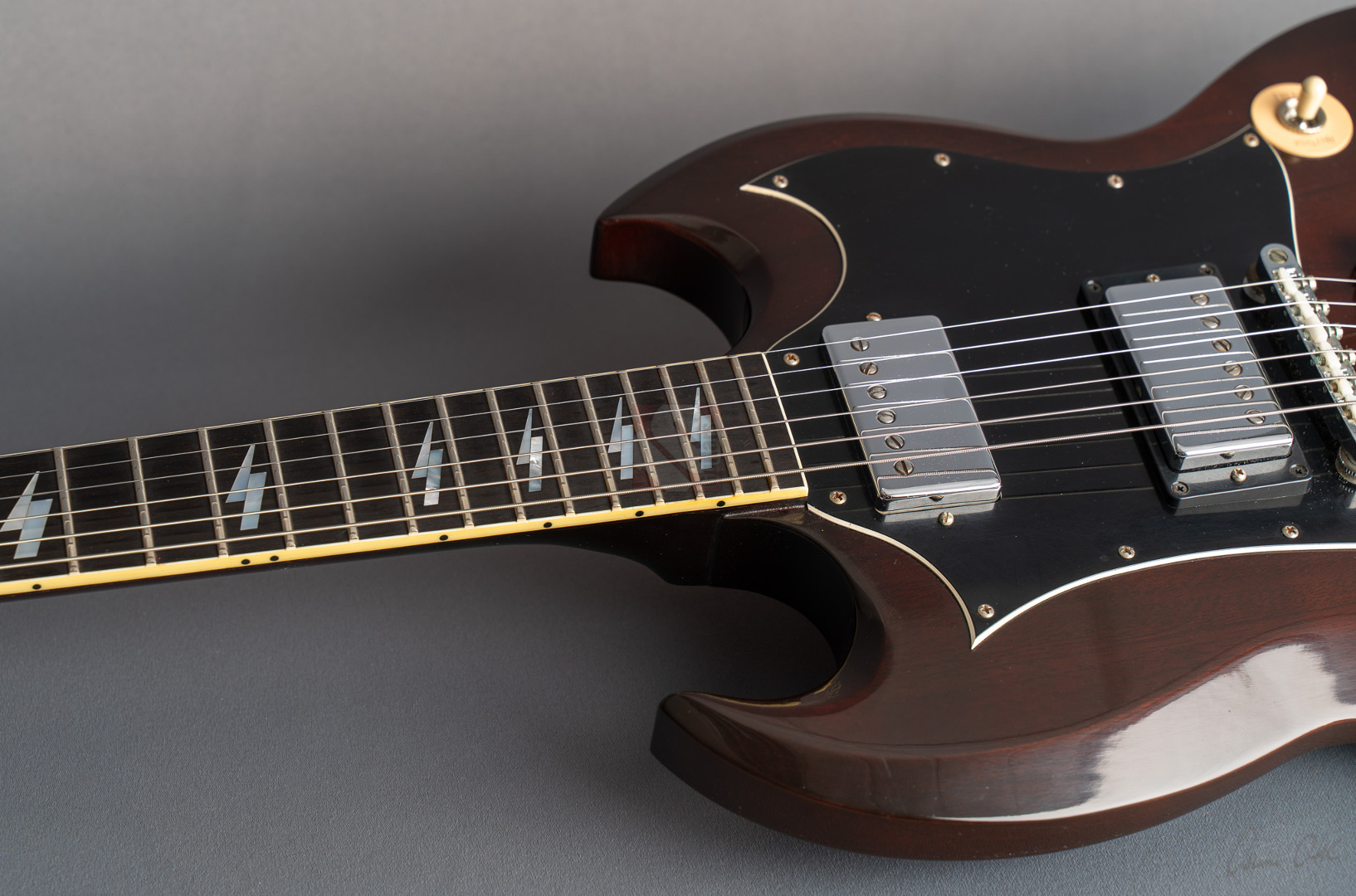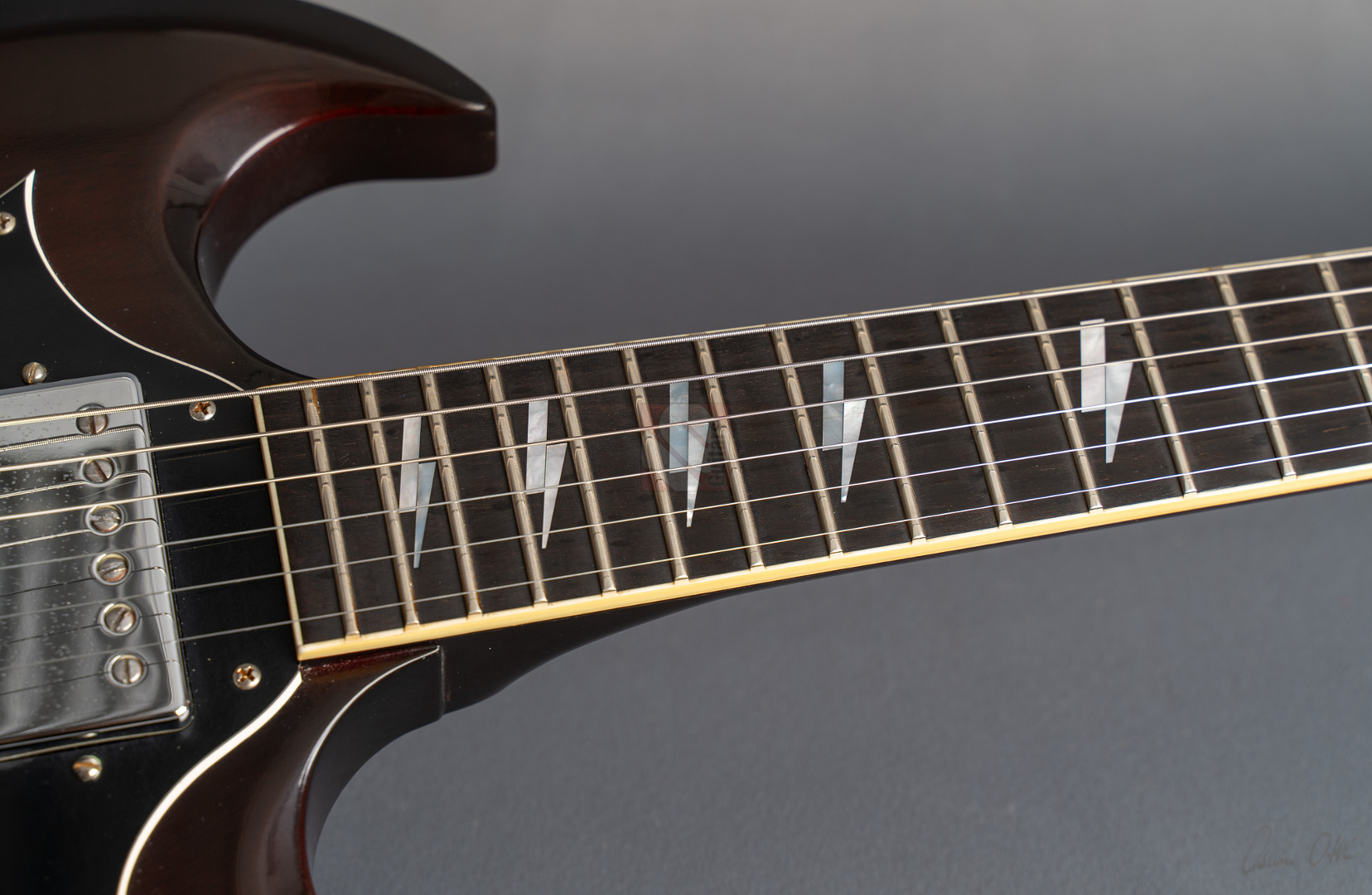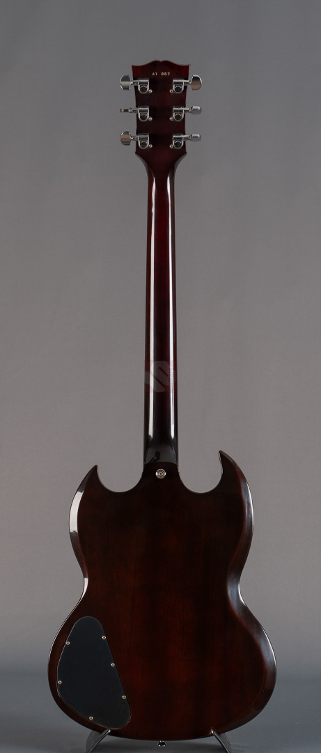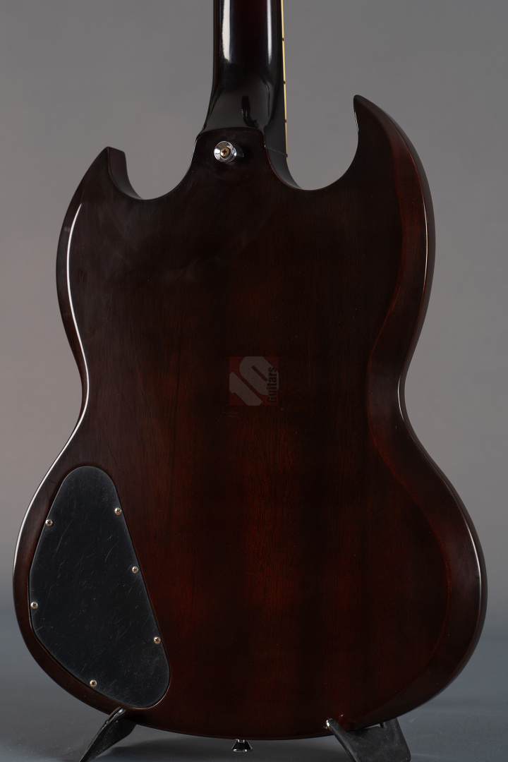 Was soll man zu dieser SG noch schreiben :-) ? Nur 200 Stück wurden von der AC/DC Thunderstruck Angus Young SG in der VOS Version gebaut. Das charakteristische daran sind die AC/DC lightning bolt inlays, das Slim Custom Angus Young neck profile, das Ebony Griffbrett und die beiden, nicht angeschlossenen Tone Potis, so wie der Meister sie auch live spielt. Die Pickups sind Pearly Gates Pickups, wobei der Steg-Pickup für Angus Young modifiziert wurde und mehr Output hat. Der Sound ist natürlich AC/DC pur! Die Gitarre stammt von einem Sammler und ist so gut wie ungespielt. Leider fiel dem Vorbesitzer etwas auf die Decke und dadurch hat sie die Macken auf der Decke. Diese Angus Young SG's sind so gut wie nicht zu finden und wenn, dann liegen sie zwischen 15.000,- und 20.000,- Euro. Wegen den kleinen Macken auf der Decke bieten wir euch diese Rarität zum Sonderpreis an. Die Bünde haben keinerlei Spielspuren.