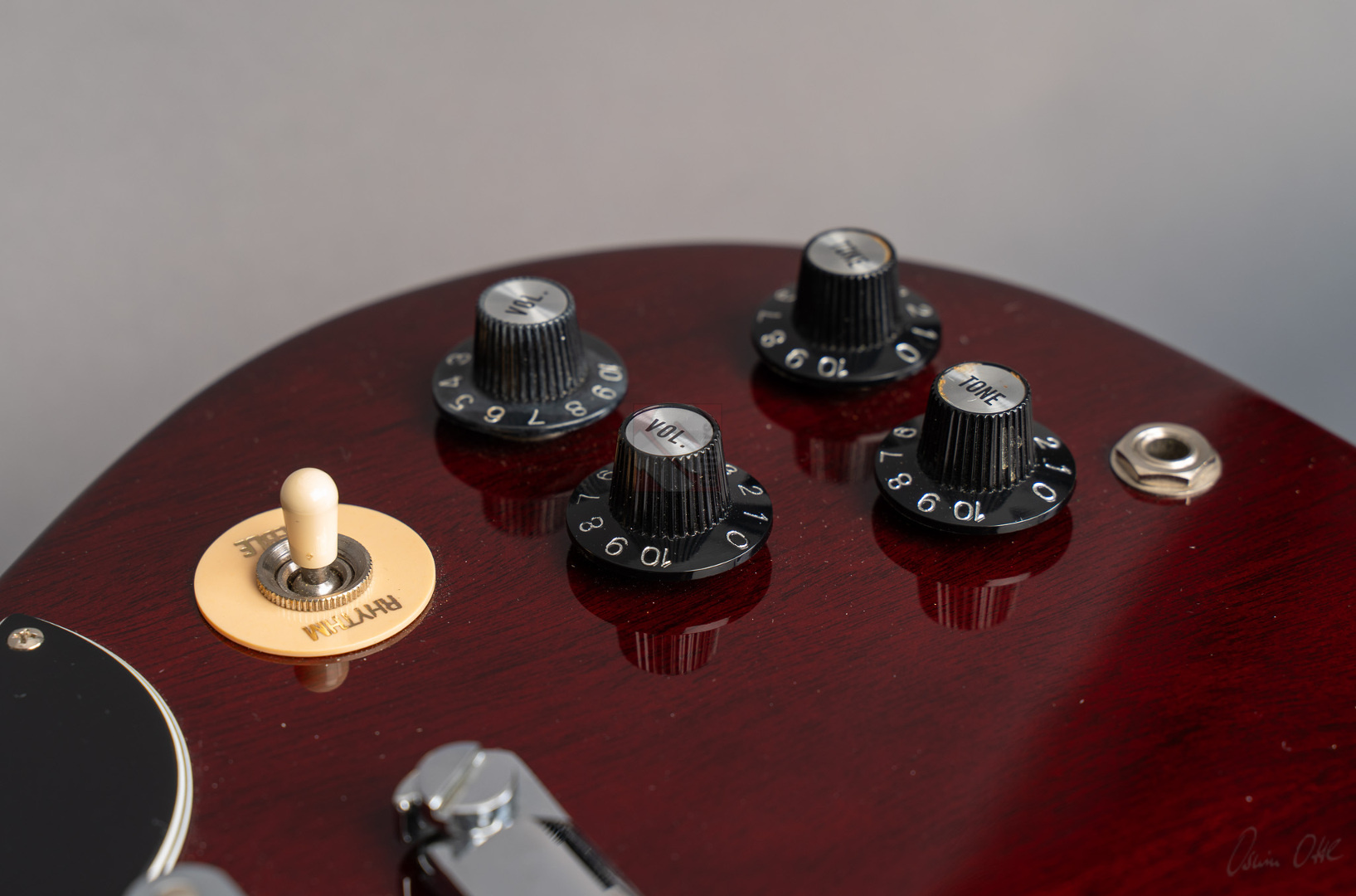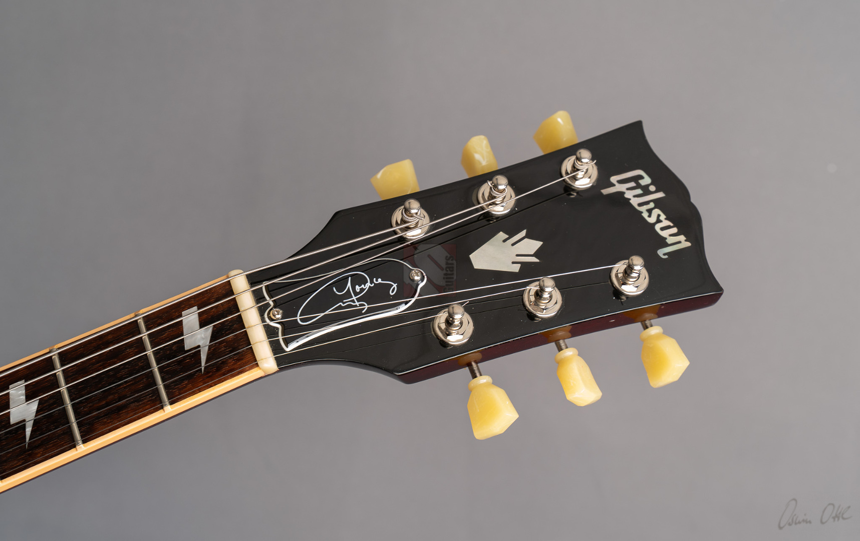 Mit außerordentlicher Freude dürfen wir Euch heute dieses Signature-Modell von Gibson USA anbieten: eine Gibson SG Thunderstruck Angus Young im charakteristischen Cherry-Finish. Die Gitarre wurde natürlich nach Angus' Vorgaben gefertigt mit von ihm zertifizierten Blitz-Inlays auf dem Palisandergriffbrett, eine mit seiner Unterschrift gravierte Truss-Rod-Abdeckung sowie einem Griffbrettbinding und einem Schalterring im kontrastierenden Farbton "Vintage Creme". Für den doppelt gewölbten Korpus wurde leichtes, extrem resonanzreiches Mahagoni ausgewählt und die Abmessungen des massiven Mahagoni-Halses wurden dem Original 1:1 nachempfunden. Das wunderbar komfortable "Slim Custom Angus Young"-Halsprofil liegt dabei perfekt in der Hand, lädt natürlich zum unbegrenzten Flitzen ein und eignet sich gleichermaßen für kraftvolle Power-Chord-Rhythmen als auch für rasante Soli. Um auch jeden Tropfen Klang aus dem Instrument herauszuholen, stattete Gibson USA es mit dem beliebten "57 Classic"-Humbucker am Hals und einem "Angus Young Signature"-Humbucker für zusätzlichen Punch und Sizzle am Steg aus. AC/DC pur! Der Sound des Gitarrengotts in Schuluniform mit lärmenden Powerchords und ohrenbetäubenden Soli haut einem hier definitiv aufs Trommelfell – just extremely "High Voltage"! Sicherlich kann man daher auch verstehen, dass diese Soundgranate viel und gerne gespielt wurde, was sich an der einen oder anderen leichten Spiel- und Gebrauchsspur zeigt. Auch kann man minimale Lagerungsspuren auf der Rückseite erkennen, was wir natürlich im Preis berücksichtigt haben. Ansonsten befindet sich diese musikalische Ikone in Top-Zustand. Hier sollte man keine Zeit verlieren...