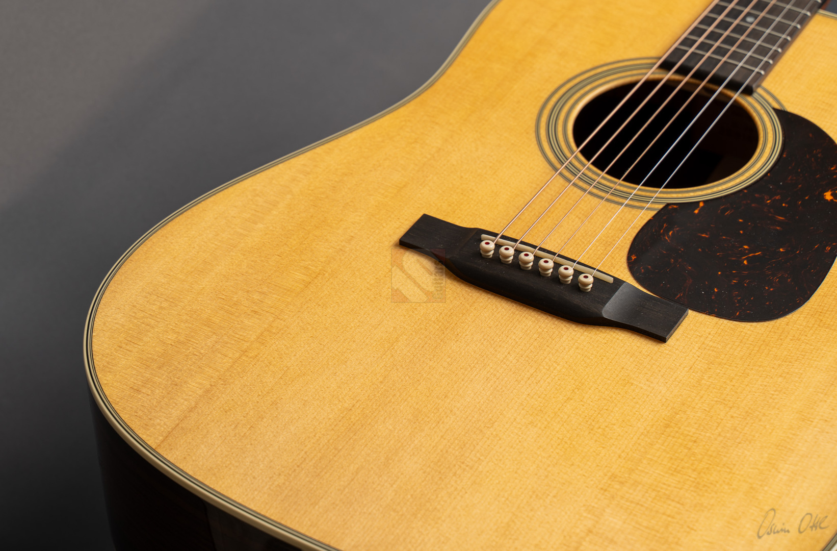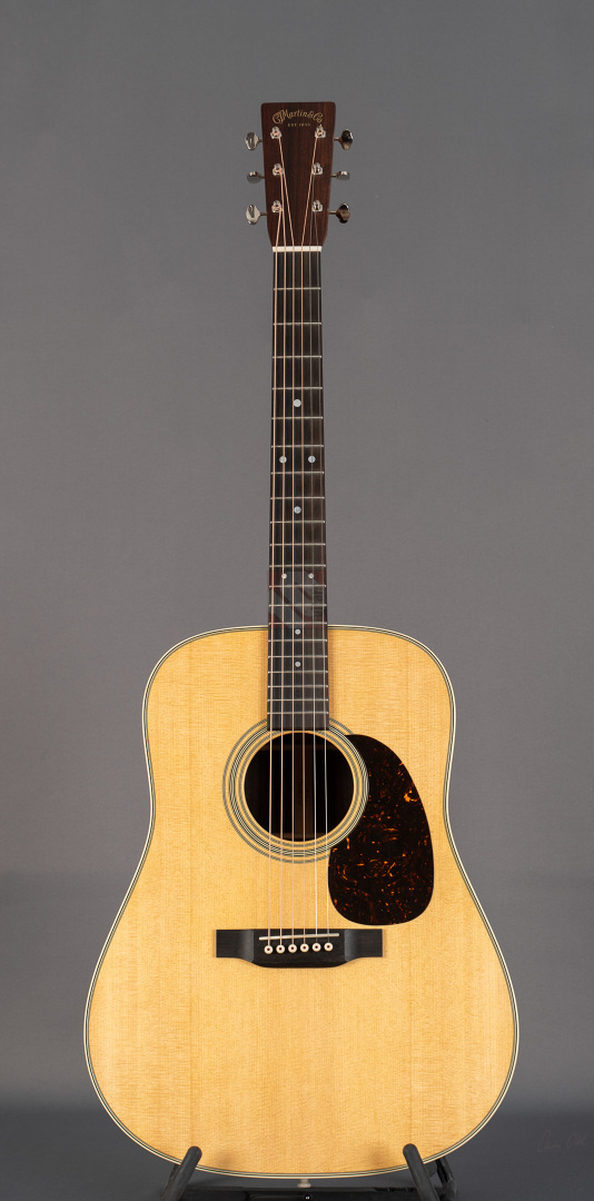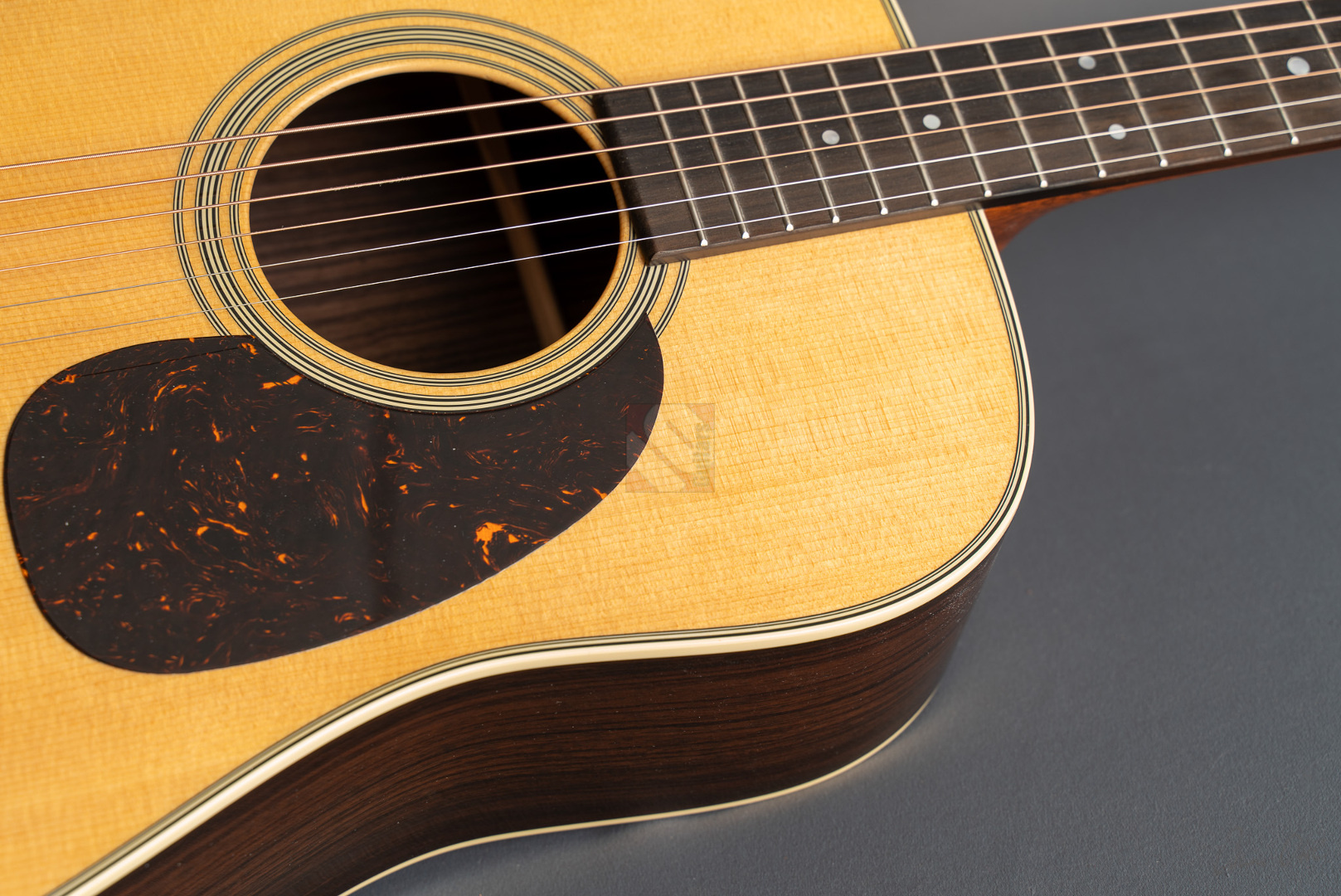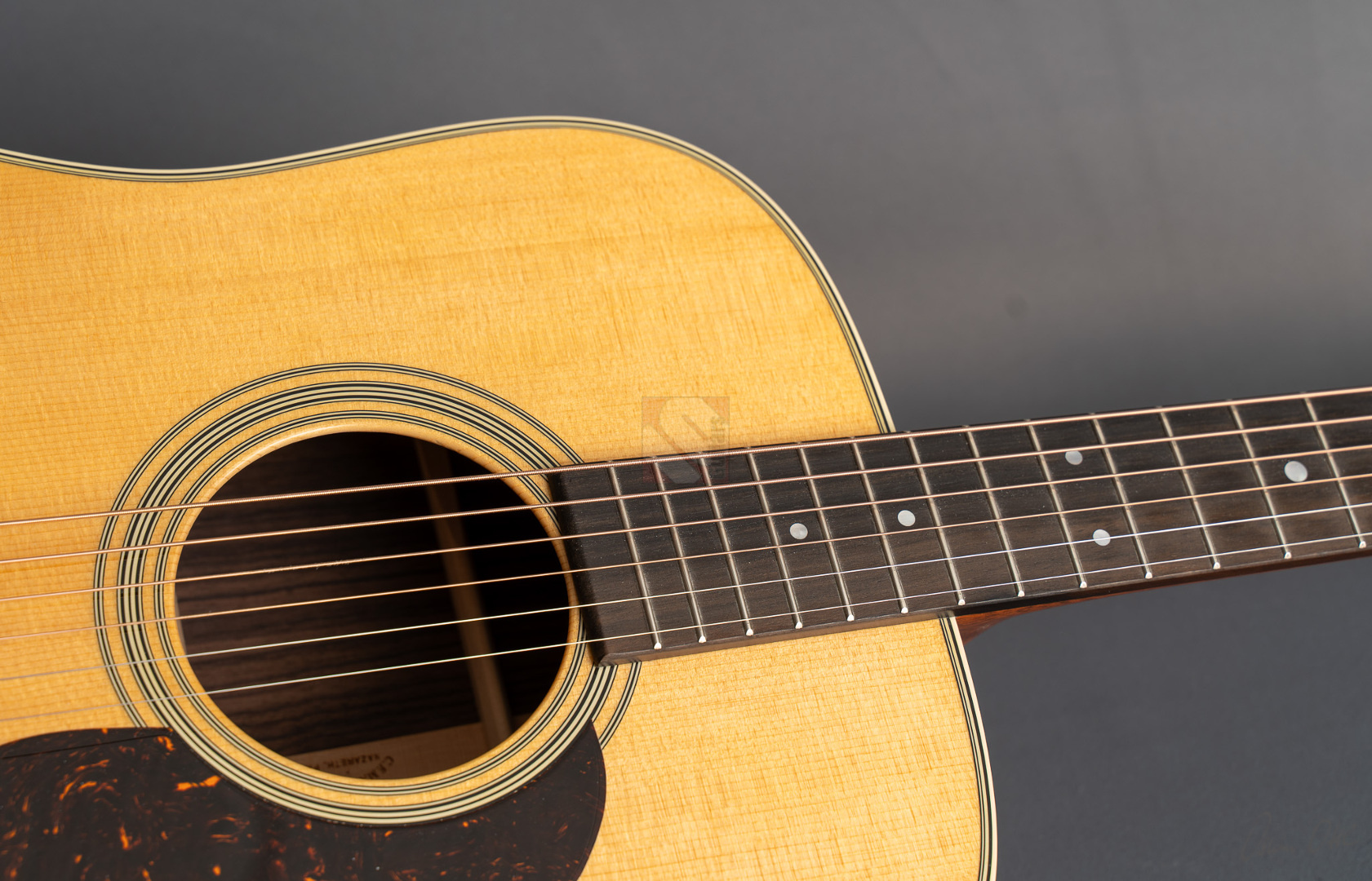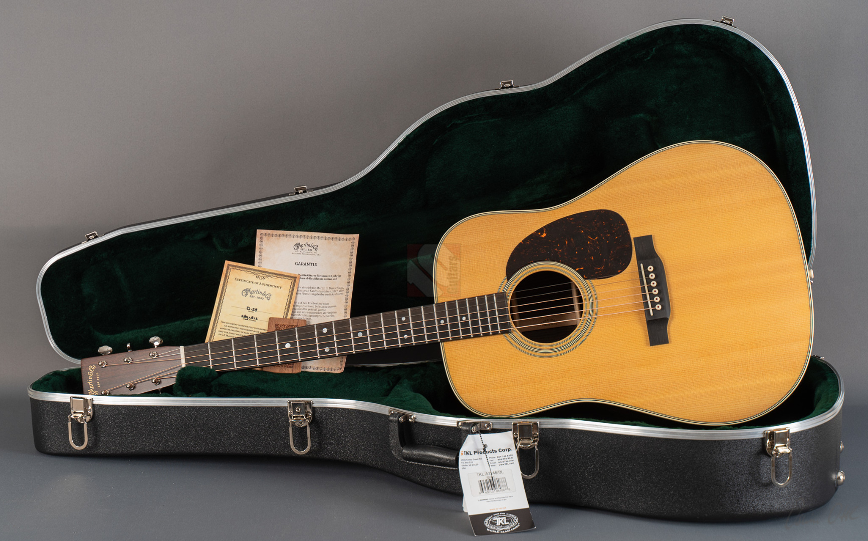 Mit einer Martin D-28 Reimagined holt man sich eine Dreadnought der höchsten Güteklasse ins Haus, die nicht nur Ohr und Hand, sondern auch das Auge auf klassisch-traditionelle Weise verwöhnen kann. Innovation steckt hier im Detail, indem diese im Jahre 2017 überarbeitete musikalische Ikone einige moderne Features erhielt. So blieben natürlich Elemente wie offene Mechaniken, eine getönte Decke und ein Pickguard aus künstlichem Schildpatt erhalten, doch zugunsten eines moderneren Gefühls erhielt die Gitarre ein neues Halsprofil sowie eine neue, klangmächtigere Deckenbeleistung. Die Konstruktion der Sitka-Fichtendecke besteht nunmehr aus einem "Forward Shifted X-Bracing", der Hals ist aus sortiertem Hardwood gefertigt und verfügt über eine matte Rückseite, das enorm komfortable "Low Oval"Profil und ein Griffbrett aus tiefdunklem Ebenholz. Sattel und Stegeinlage sind aus Knochen gefertigt, Boden und Zargen aus indischem Palisanderholz. Aber was uns natürlich immer am meisten interessiert, ist der Klang des Prachtstücks. Und hier schöpft man wirklich aus dem Vollen! Obwohl die Gitarre nicht viel gespielt wurde, entwickelt sie ein fantastisches Frequenzspektrum. Klassischer, ausgewogener und kraftvoller D-28-Sound. Diese Akustik ist laut und voluminös, doch trotz aller Durchsetzungskraft zeigt sie auch genügend Wärme, äußerst differenziert und präsent. Eignet sich sowohl für Fingerpicking als auch für Strumming. Wir freuen uns, Euch die Akustik in neuwertigem Zustand anbieten zu können.