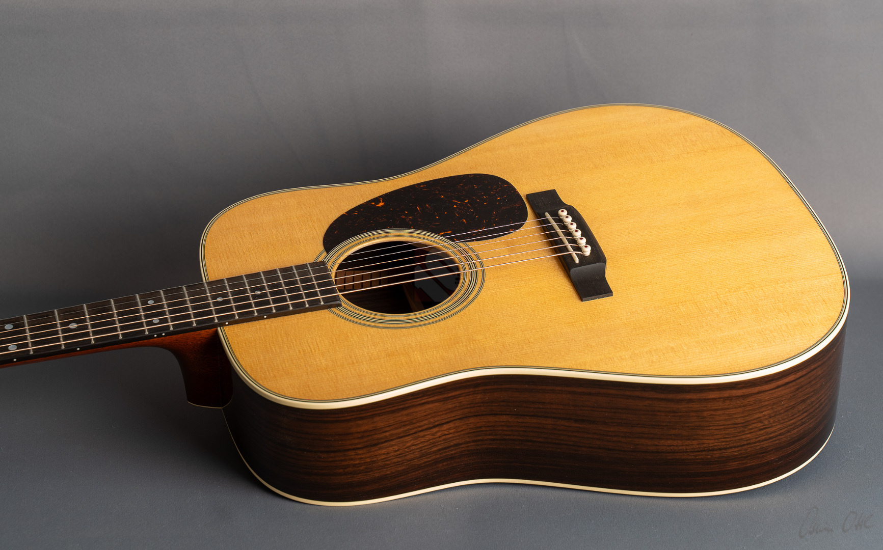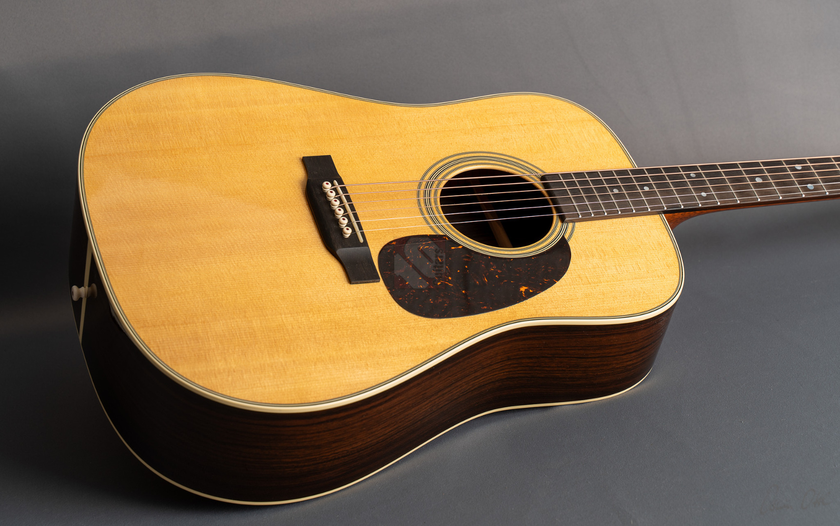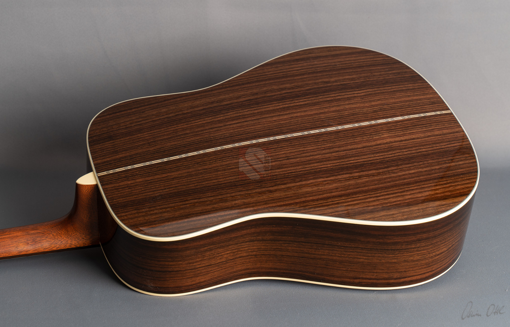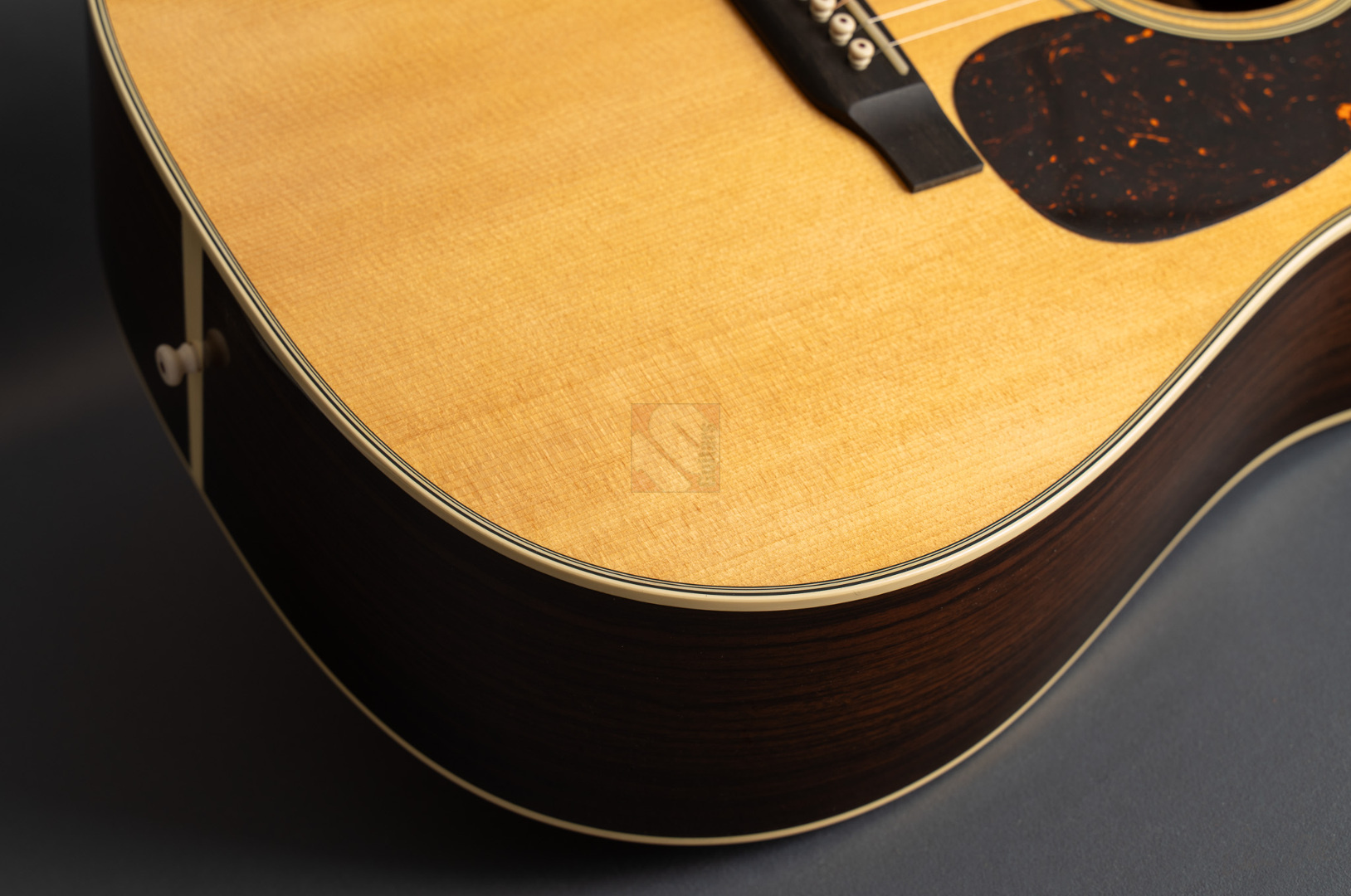 Mit einer Martin D-28 Reimagined holt man sich eine Dreadnought der höchsten Güteklasse ins Haus, die nicht nur Ohr und Hand, sondern auch das Auge auf klassisch-traditionelle Weise verwöhnen kann. Innovation steckt hier im Detail, indem diese im Jahre 2017 überarbeitete musikalische Ikone einige moderne Features erhielt. So blieben natürlich Elemente wie offene Mechaniken, eine getönte Decke und ein Pickguard aus künstlichem Schildpatt erhalten, doch zugunsten eines moderneren Gefühls erhielt die Gitarre ein neues Halsprofil sowie eine neue, klangmächtigere Deckenbeleistung. Die Konstruktion der Sitka-Fichtendecke besteht nunmehr aus einem "Forward Shifted X-Bracing", der Hals ist aus sortiertem Hardwood gefertigt und verfügt über eine matte Rückseite, das enorm komfortable "Low Oval"Profil und ein Griffbrett aus tiefdunklem Ebenholz. Sattel und Stegeinlage sind aus Knochen gefertigt, Boden und Zargen aus indischem Palisanderholz. Aber was uns natürlich immer am meisten interessiert, ist der Klang des Prachtstücks. Und hier schöpft man wirklich aus dem Vollen! Obwohl die Gitarre nicht viel gespielt wurde, entwickelt sie ein fantastisches Frequenzspektrum. Klassischer, ausgewogener und kraftvoller D-28-Sound. Diese Akustik ist laut und voluminös, doch trotz aller Durchsetzungskraft zeigt sie auch genügend Wärme, äußerst differenziert und präsent. Eignet sich sowohl für Fingerpicking als auch für Strumming. Wir freuen uns, Euch die Akustik in neuwertigem Zustand anbieten zu können.