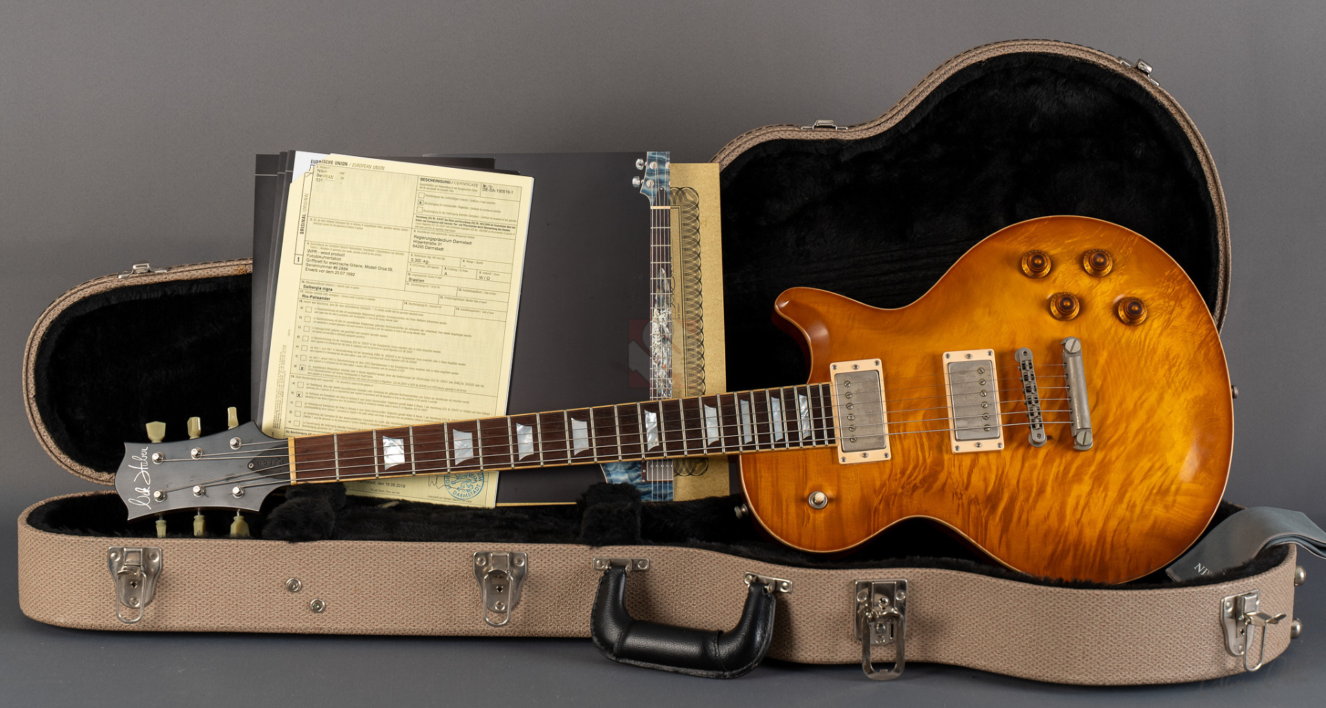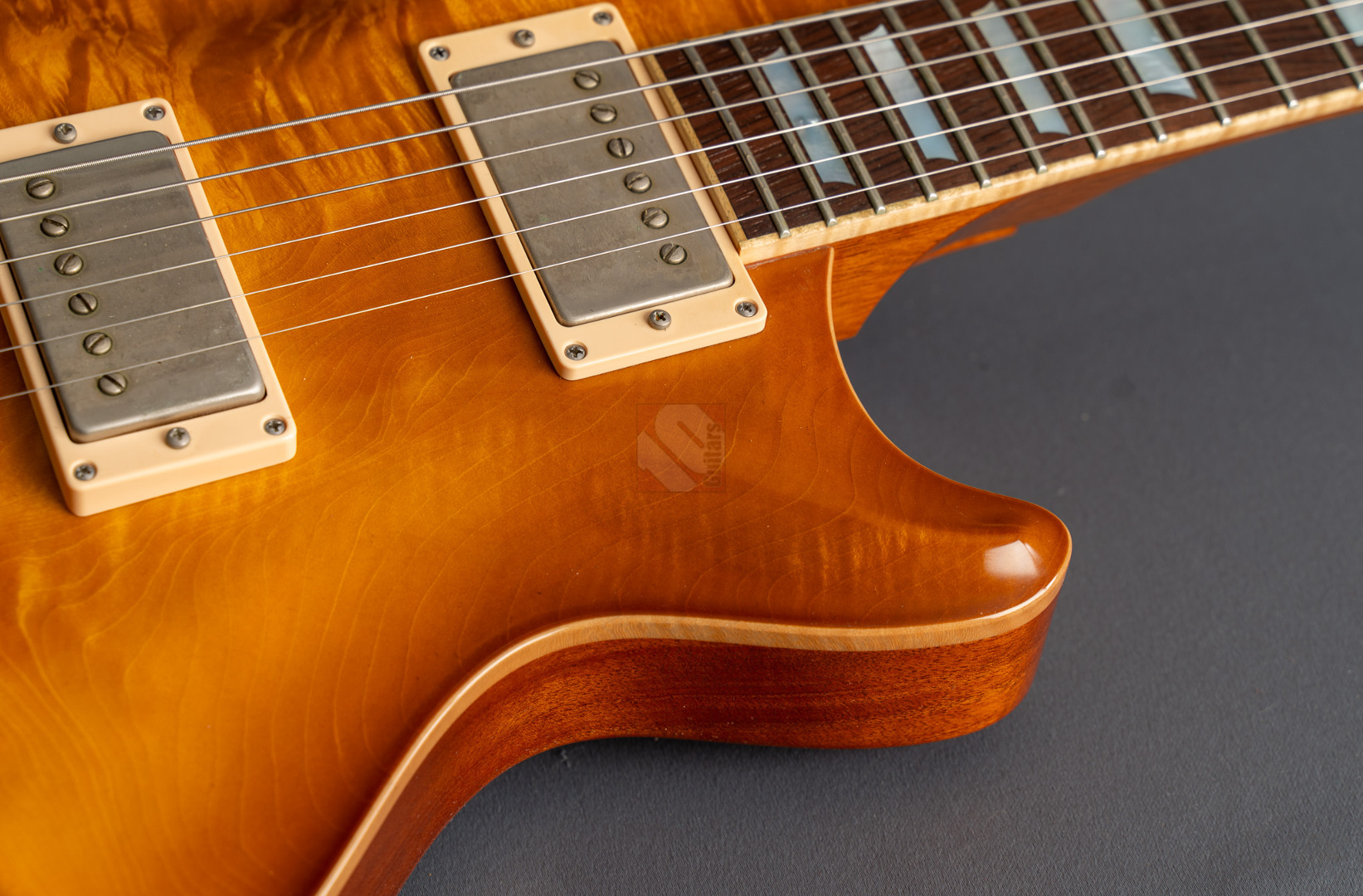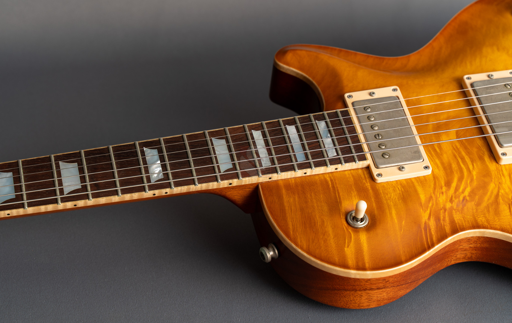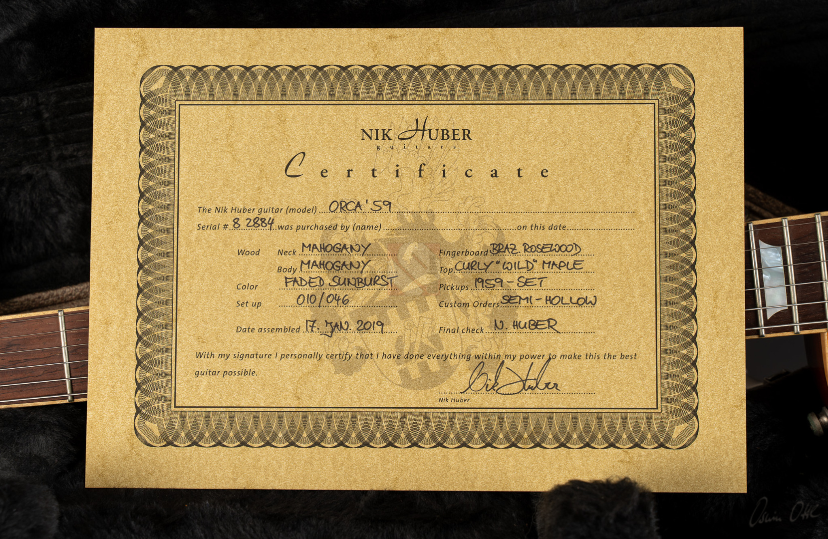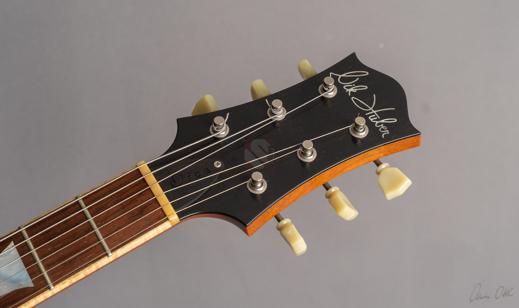 Diese Nik Huber Orca mit 59er Specs ist einfach ein Kunstwerk und das in jeglicher Hinsicht. Ein erstes Highlight ist hier sicherlich schon mal das wunderschöne Griffbrett aus Rio-Palisander (natürlich mit der notwendigen CITES-Bescheinigung). ...und dann diese phänomenale Decke, bei der es sich um ein One-Piece handelt! "Curly 'Wild' Maple"-Top mit einer sagenhaften Maserung und dem famosen, mattierten "Faded Sunburst"-Finish. Der Body der Gitarre besteht aus einteiligem Mahagoni mit Tonkammern und als Pickups kommen Nik-Huber-eigene Humbucker von Häussel zum Einsatz. Zusammen mit der Nik-Huber-typischen, astreinen Bespielbarkeit bekommt man hier einfach einen absoluten Spitzen-Player. Der Hals mit seinem etwas kräftigeren 59er Profil liegt super in der Hand und spielt sich in Verbindung mit dem Traumgewicht von 3410 Gramm erstklassig. Schon trocken zeigt sich die Orca erstaunlich laut und voll, am Amp unglaublich transparent und dreidimensional. Tonal tut sich hier eine ganze Welt auf und es macht unheimlich Spaß, mit unterschiedlichen Spieldynamiken zu arbeiten, da die Gitarre jede noch so kleine Nuance perfekt aufgreift. Die Pickups lassen sich mittels Push/Pull Poti splitten, sodass diese Gitarre vielfältigste Sounds bietet. Rockig mit gutem Attack, knorkig mit schön schmatzendem Ton und auch fast Strat-mäßige Klänge in der Splitvariante. Was soll man sagen? Rundherum ein optimiertes, schönes und klangmächtiges Instrument, das wir Euch in Top-Zustand anbieten können.