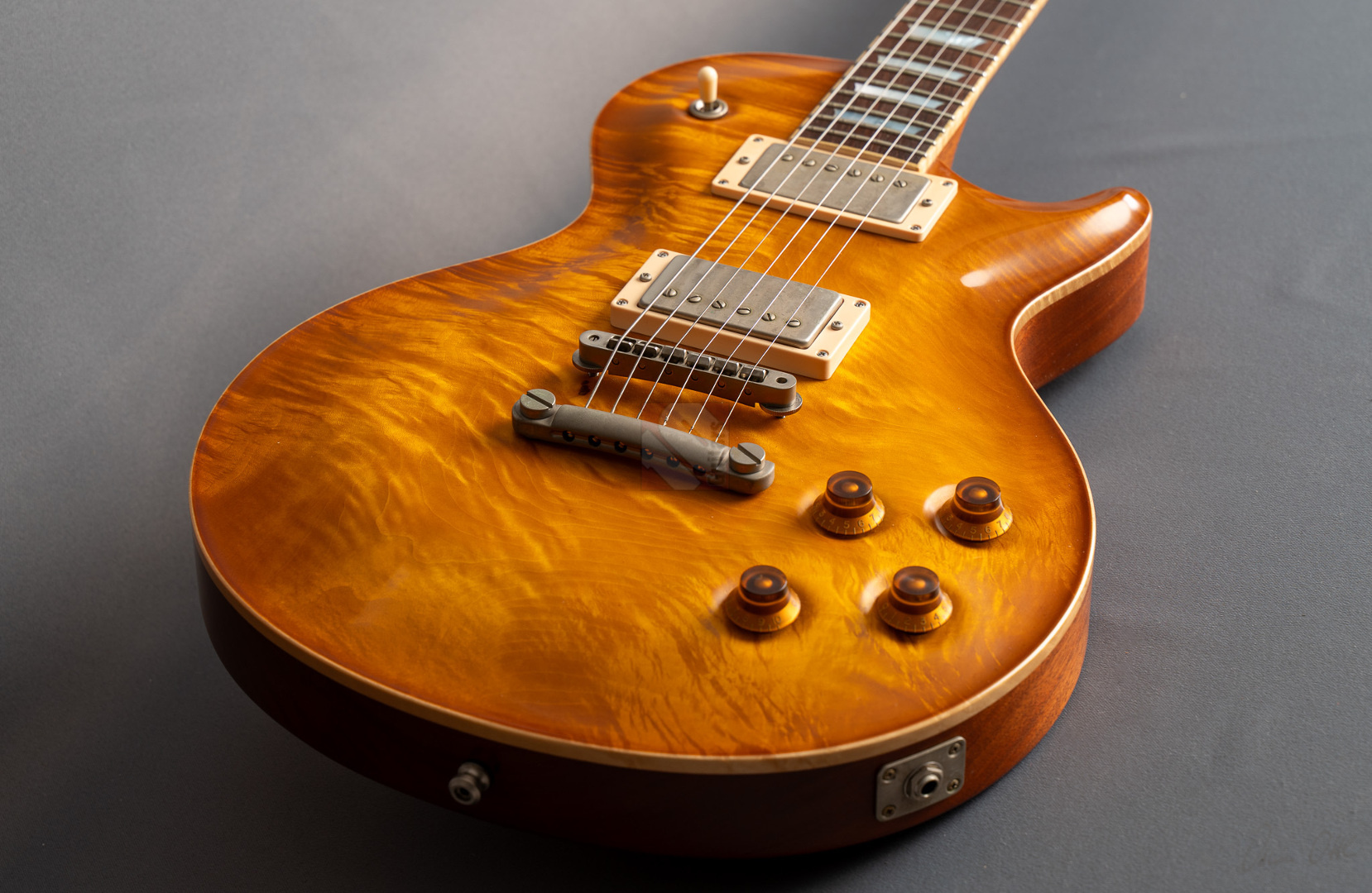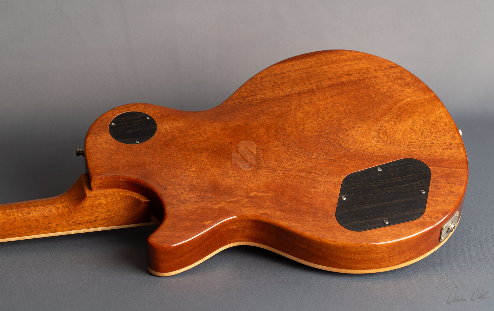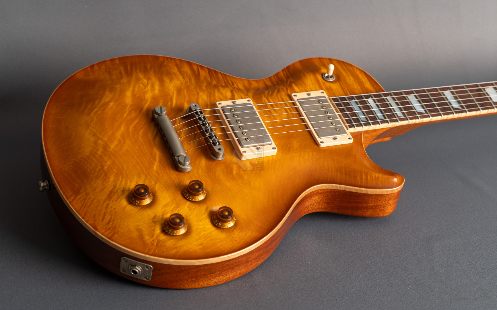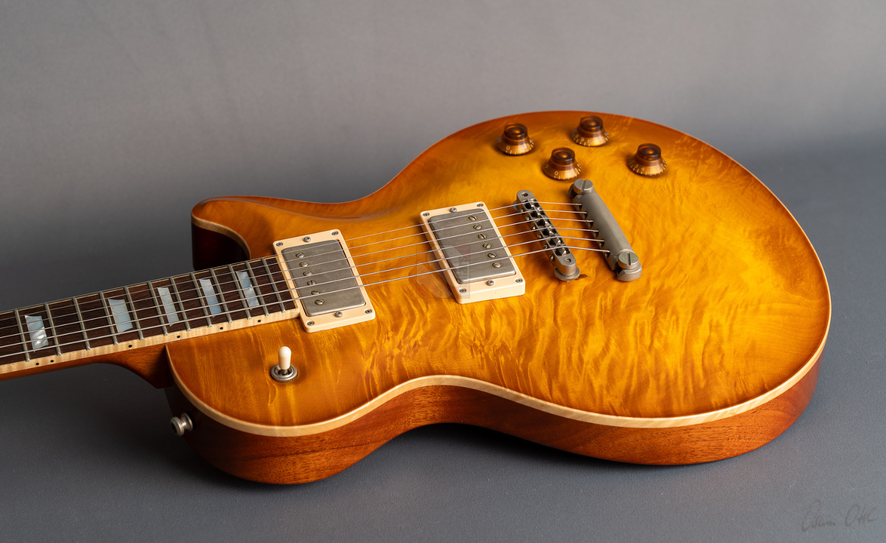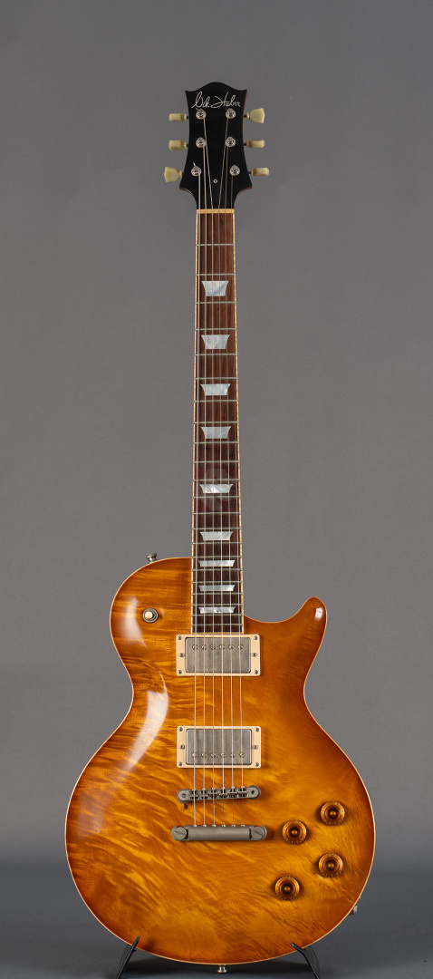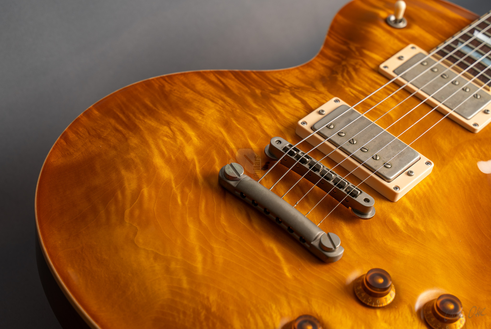 Diese Nik Huber Orca mit 59er Specs ist einfach ein Kunstwerk und das in jeglicher Hinsicht. Ein erstes Highlight ist hier sicherlich schon mal das wunderschöne Griffbrett aus Rio-Palisander (natürlich mit der notwendigen CITES-Bescheinigung). ...und dann diese phänomenale Decke, bei der es sich um ein One-Piece handelt! "Curly 'Wild' Maple"-Top mit einer sagenhaften Maserung und dem famosen, mattierten "Faded Sunburst"-Finish. Der Body der Gitarre besteht aus einteiligem Mahagoni mit Tonkammern und als Pickups kommen Nik-Huber-eigene Humbucker von Häussel zum Einsatz. Zusammen mit der Nik-Huber-typischen, astreinen Bespielbarkeit bekommt man hier einfach einen absoluten Spitzen-Player. Der Hals mit seinem etwas kräftigeren 59er Profil liegt super in der Hand und spielt sich in Verbindung mit dem Traumgewicht von 3410 Gramm erstklassig. Schon trocken zeigt sich die Orca erstaunlich laut und voll, am Amp unglaublich transparent und dreidimensional. Tonal tut sich hier eine ganze Welt auf und es macht unheimlich Spaß, mit unterschiedlichen Spieldynamiken zu arbeiten, da die Gitarre jede noch so kleine Nuance perfekt aufgreift. Die Pickups lassen sich mittels Push/Pull Poti splitten, sodass diese Gitarre vielfältigste Sounds bietet. Rockig mit gutem Attack, knorkig mit schön schmatzendem Ton und auch fast Strat-mäßige Klänge in der Splitvariante. Was soll man sagen? Rundherum ein optimiertes, schönes und klangmächtiges Instrument, das wir Euch in Top-Zustand anbieten können.