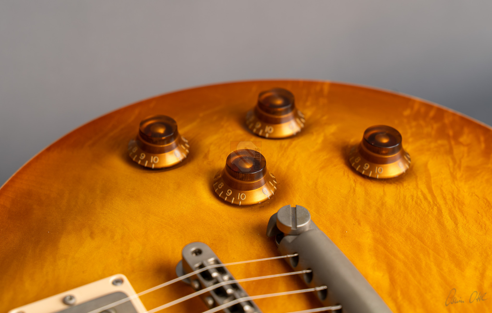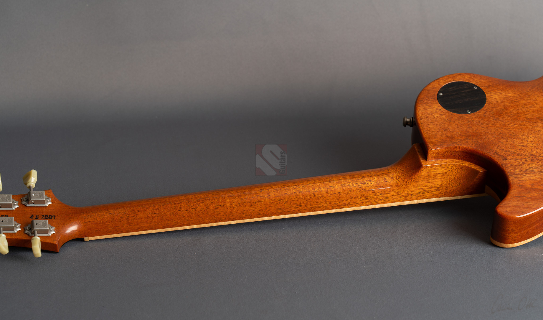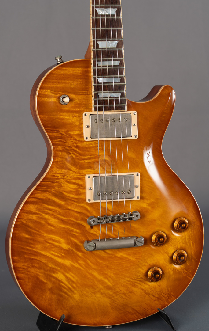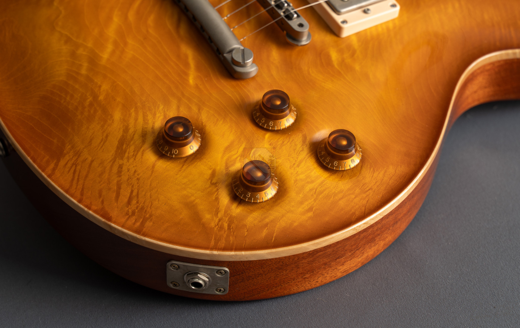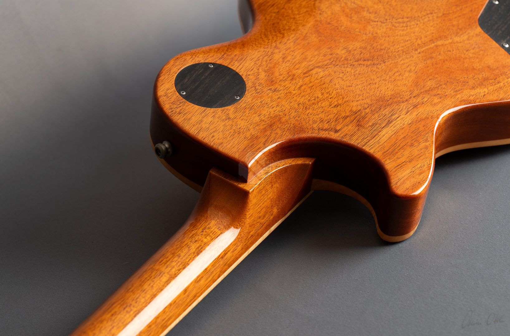 Diese Nik Huber Orca mit 59er Specs ist einfach ein Kunstwerk und das in jeglicher Hinsicht. Ein erstes Highlight ist hier sicherlich schon mal das wunderschöne Griffbrett aus Rio-Palisander (natürlich mit der notwendigen CITES-Bescheinigung). ...und dann diese phänomenale Decke, bei der es sich um ein One-Piece handelt! "Curly 'Wild' Maple"-Top mit einer sagenhaften Maserung und dem famosen, mattierten "Faded Sunburst"-Finish. Der Body der Gitarre besteht aus einteiligem Mahagoni mit Tonkammern und als Pickups kommen Nik-Huber-eigene Humbucker von Häussel zum Einsatz. Zusammen mit der Nik-Huber-typischen, astreinen Bespielbarkeit bekommt man hier einfach einen absoluten Spitzen-Player. Der Hals mit seinem etwas kräftigeren 59er Profil liegt super in der Hand und spielt sich in Verbindung mit dem Traumgewicht von 3410 Gramm erstklassig. Schon trocken zeigt sich die Orca erstaunlich laut und voll, am Amp unglaublich transparent und dreidimensional. Tonal tut sich hier eine ganze Welt auf und es macht unheimlich Spaß, mit unterschiedlichen Spieldynamiken zu arbeiten, da die Gitarre jede noch so kleine Nuance perfekt aufgreift. Die Pickups lassen sich mittels Push/Pull Poti splitten, sodass diese Gitarre vielfältigste Sounds bietet. Rockig mit gutem Attack, knorkig mit schön schmatzendem Ton und auch fast Strat-mäßige Klänge in der Splitvariante. Was soll man sagen? Rundherum ein optimiertes, schönes und klangmächtiges Instrument, das wir Euch in Top-Zustand anbieten können.