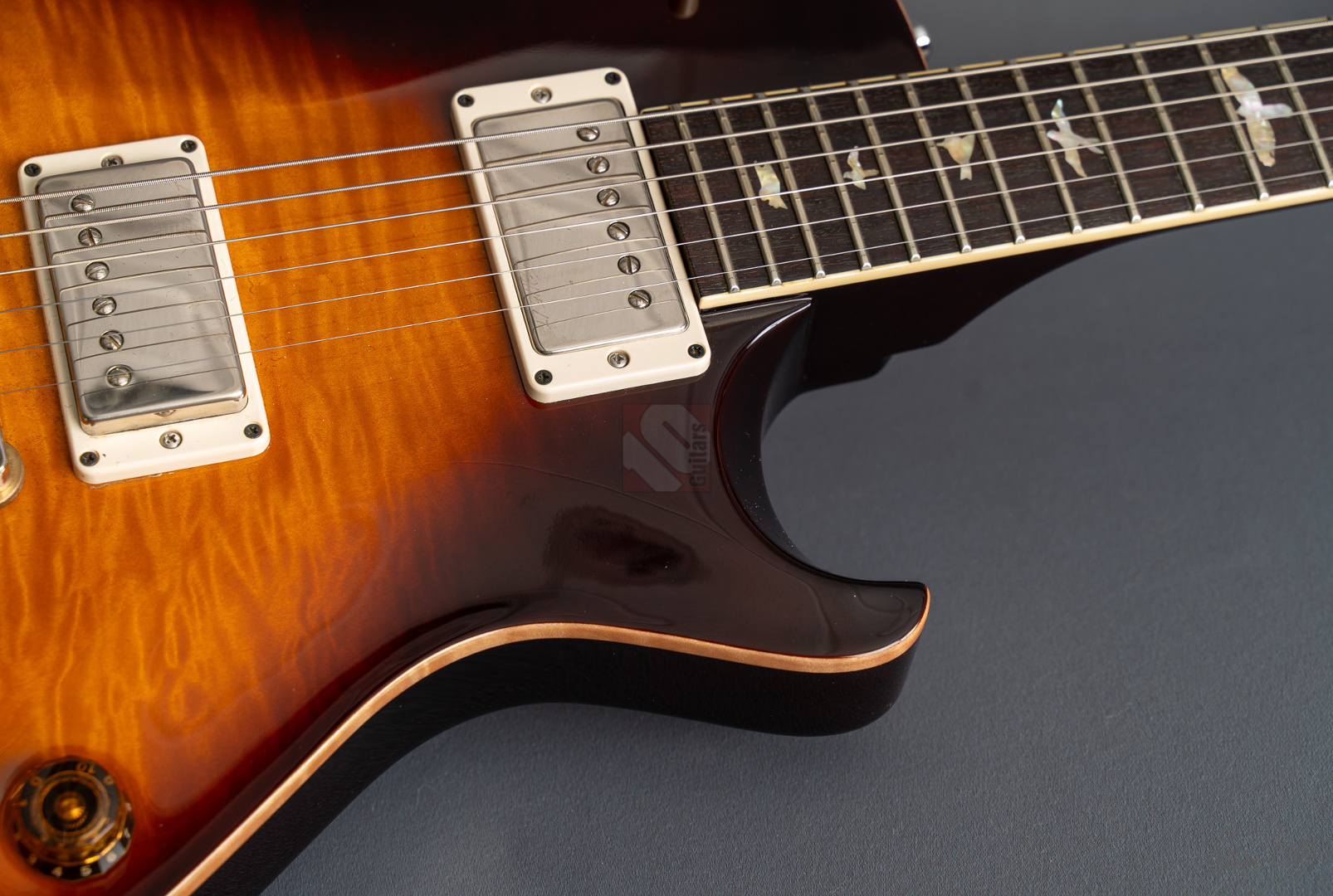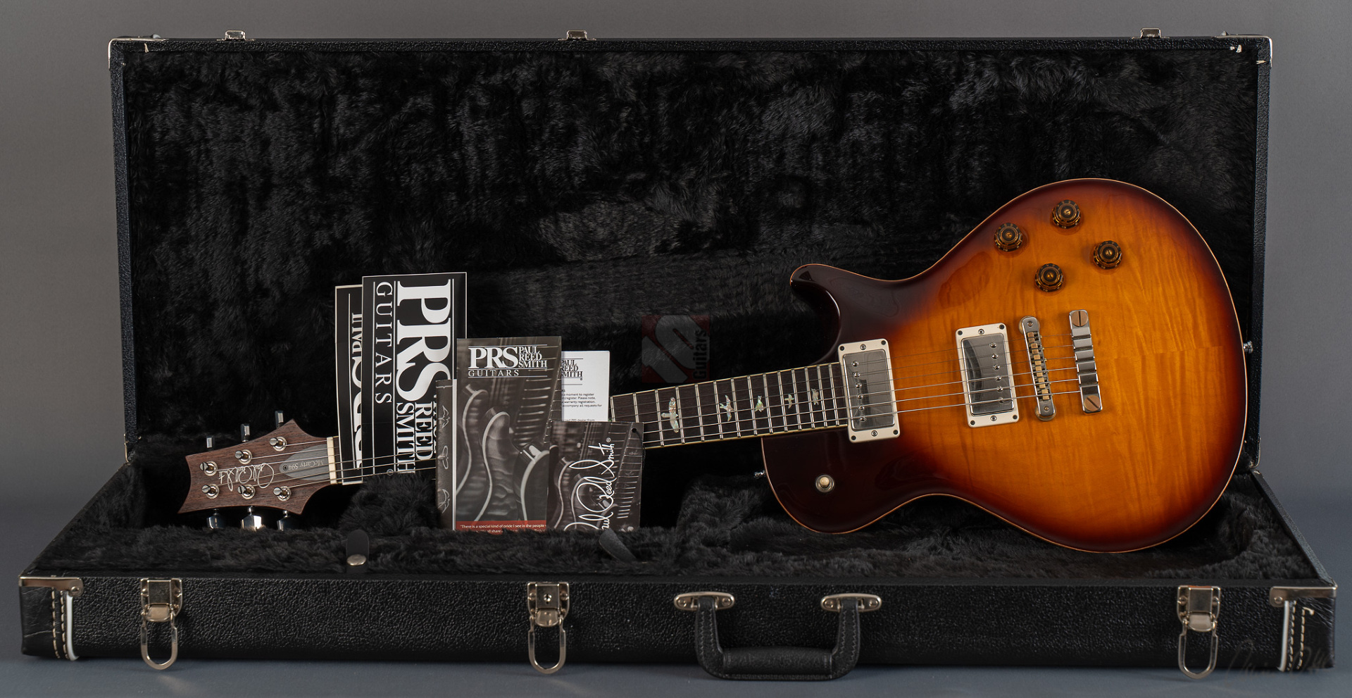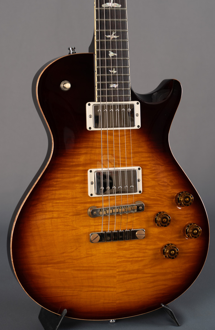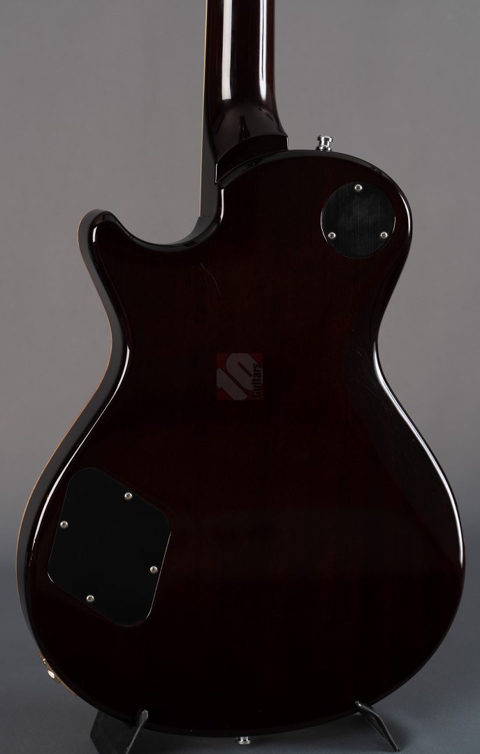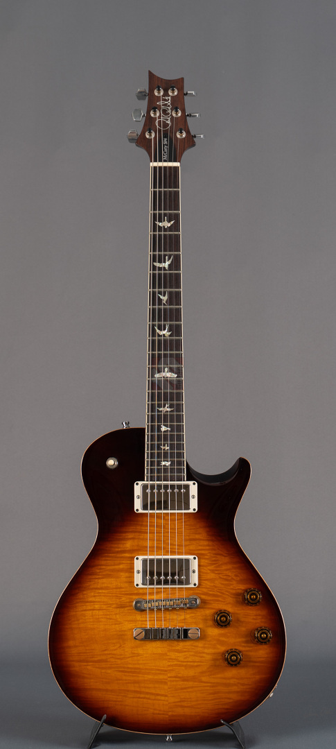 Das Singlecut-Modell der McCarty 594 verbindet authentische Vintage-Sounds und das vertraute Feeling klassischer Instrumente mit der Fertigungspräzision der Core-Serie von Paul Reed Smith. Das vom Private-Stock-Team entwickelte Design wurde nach seiner Mensur von 24,594" benannt und bietet die perfekte Balance zwischen Playability und Ansprache. So freuen wir uns, dass wir Euch hier eine besonders schöne McCarty 594 Singlecut anbieten dürfen, die durch ihr edles Gloss-Finish, der phänomenalen Deckenmaserung und einer edlen chrom-goldenen Hardware besticht. Der Mahagonihals im "Pattern Vintage"-Profil liegt prima in der Hand, kommt sowohl klassischen als auch modernen Spieltechniken entgegen und sorgt in Verbindung mit dem kräftigen Halsfuß für lange Schwingungsphasen und sustainreiche Sounds. Die beiden "58/15 LT"-Humbucker verfügen über eine vergleichsweise geringere Wicklungszahl, wodurch aufgrund des daraus resultierenden leichteren Outputs den Tonabnehmern ein weitaus größeres dynamisches Spielfeld und speziell in ruhigeren Settings enorme vokale Qualitäten verliehen wird. Wer aber den Gain-Regler gerne weiter aufdreht, wird mit einem breiten und saftigen, jedoch definierten Sound mit starken Tiefmitten belohnt. Beide Pickups können darüber hinaus mittels Push/Pull-Funktion der Tone-Potis in den Coil-Split-Modus für klare und luftige Singlecoil-Sounds geschaltet werden. So kann man hier alle Musikrichtungen von Rock, Blues bis hin zum Jazz erstklassig bedienen! Dieser perfekt eingeschwungene Spitzenplayer wurde gerne und viel gespielt, was man an leichten Spielspuren und geringfügigen Kratzern (hauptsächlich auf der Rückseite) sehen kann. Ansonsten befindet sich die Gitarre aber in Top-Zustand und auch die Bünde, die nur leichte Spielspuren aufweisen, versprechen noch viele Jahre purer Spielfreude.