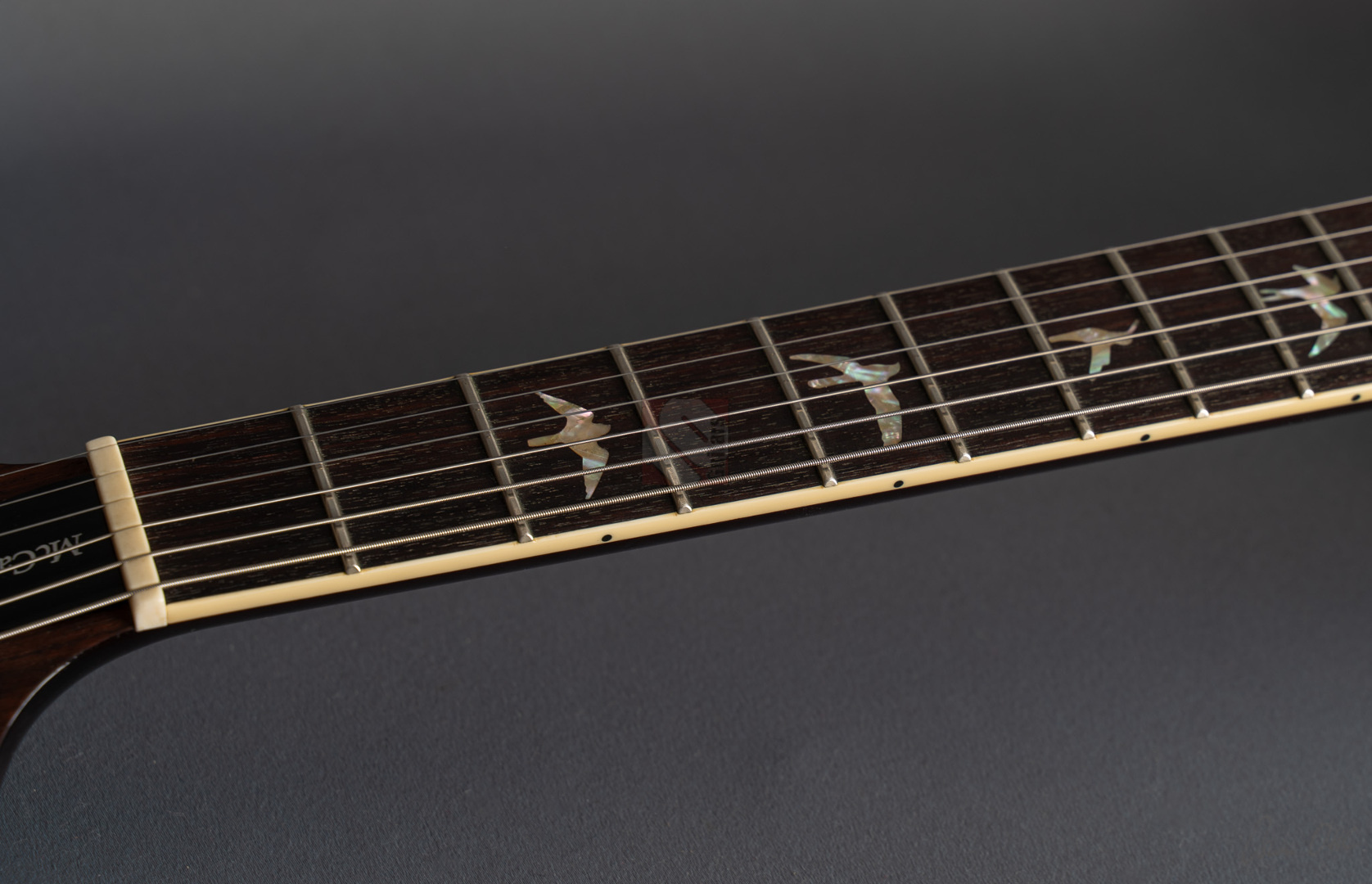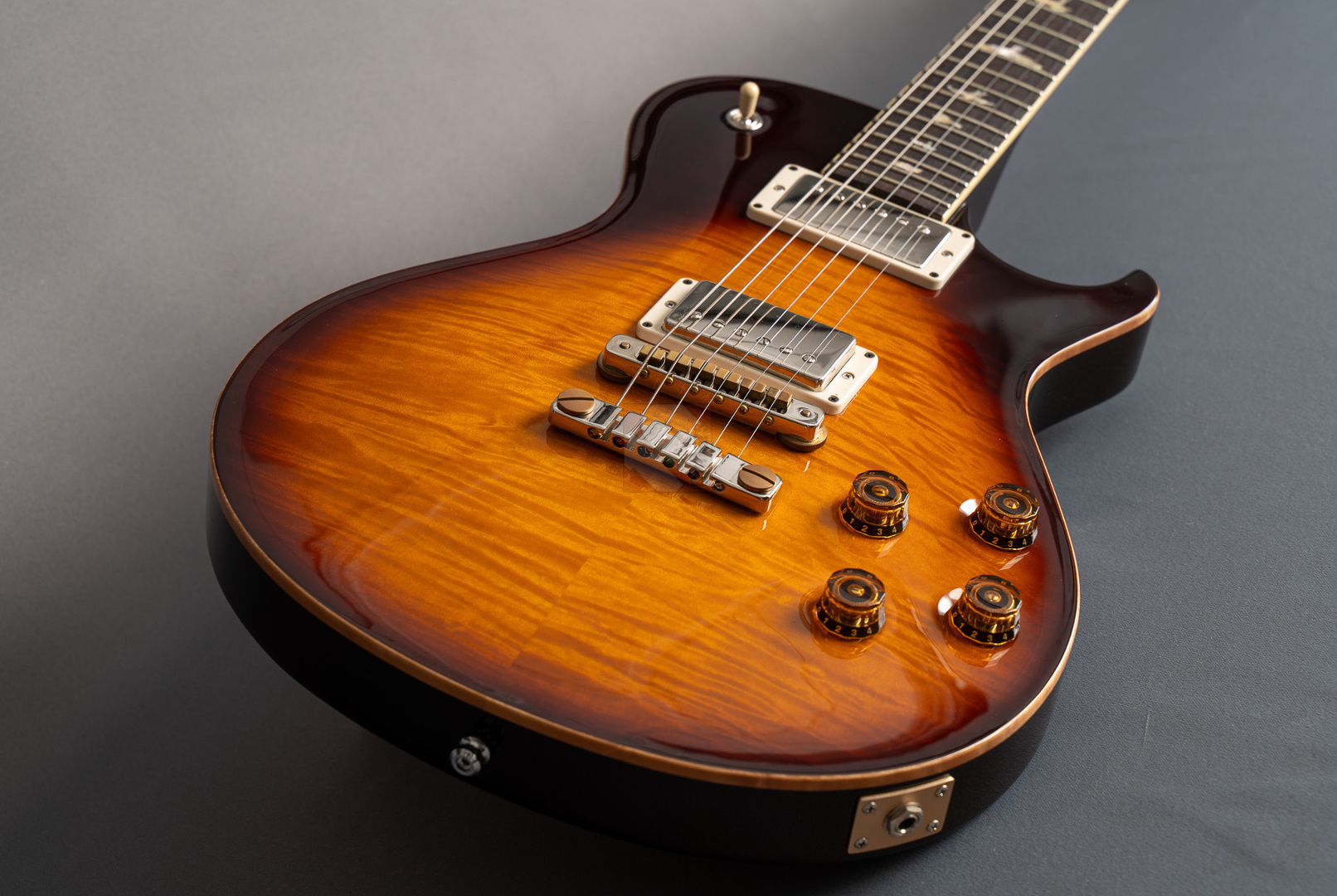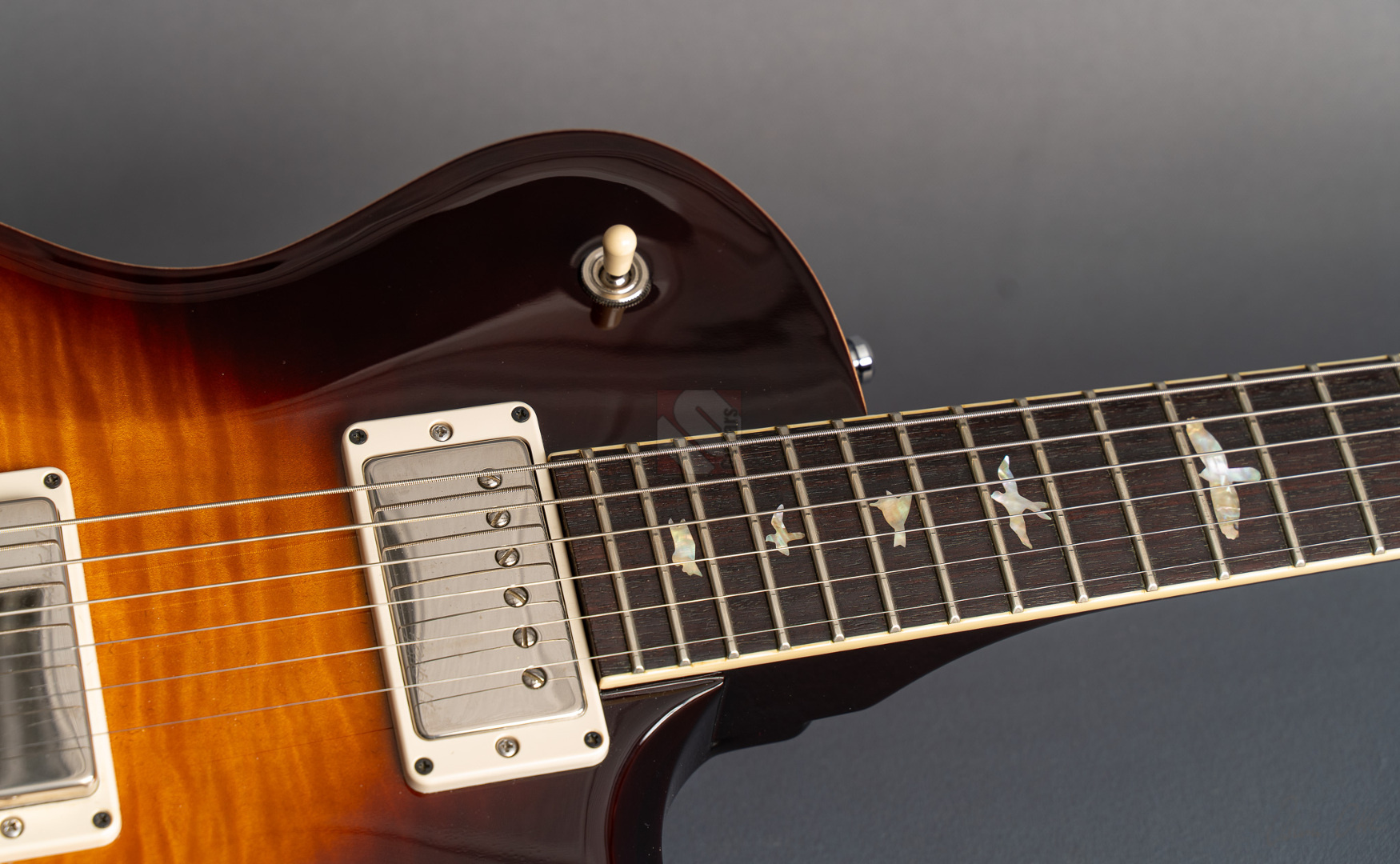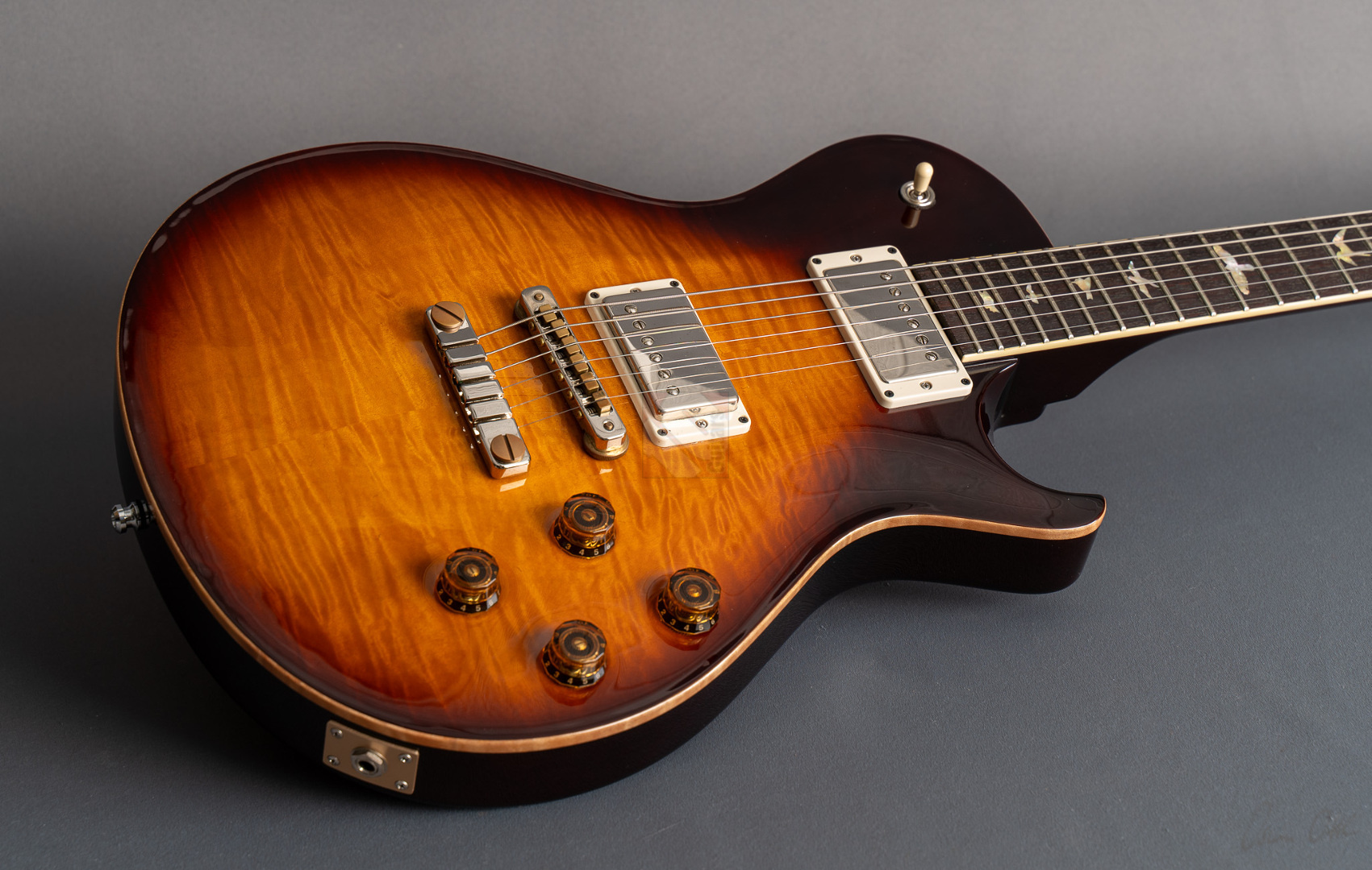 Das Singlecut-Modell der McCarty 594 verbindet authentische Vintage-Sounds und das vertraute Feeling klassischer Instrumente mit der Fertigungspräzision der Core-Serie von Paul Reed Smith. Das vom Private-Stock-Team entwickelte Design wurde nach seiner Mensur von 24,594" benannt und bietet die perfekte Balance zwischen Playability und Ansprache. So freuen wir uns, dass wir Euch hier eine besonders schöne McCarty 594 Singlecut anbieten dürfen, die durch ihr edles Gloss-Finish, der phänomenalen Deckenmaserung und einer edlen chrom-goldenen Hardware besticht. Der Mahagonihals im "Pattern Vintage"-Profil liegt prima in der Hand, kommt sowohl klassischen als auch modernen Spieltechniken entgegen und sorgt in Verbindung mit dem kräftigen Halsfuß für lange Schwingungsphasen und sustainreiche Sounds. Die beiden "58/15 LT"-Humbucker verfügen über eine vergleichsweise geringere Wicklungszahl, wodurch aufgrund des daraus resultierenden leichteren Outputs den Tonabnehmern ein weitaus größeres dynamisches Spielfeld und speziell in ruhigeren Settings enorme vokale Qualitäten verliehen wird. Wer aber den Gain-Regler gerne weiter aufdreht, wird mit einem breiten und saftigen, jedoch definierten Sound mit starken Tiefmitten belohnt. Beide Pickups können darüber hinaus mittels Push/Pull-Funktion der Tone-Potis in den Coil-Split-Modus für klare und luftige Singlecoil-Sounds geschaltet werden. So kann man hier alle Musikrichtungen von Rock, Blues bis hin zum Jazz erstklassig bedienen! Dieser perfekt eingeschwungene Spitzenplayer wurde gerne und viel gespielt, was man an leichten Spielspuren und geringfügigen Kratzern (hauptsächlich auf der Rückseite) sehen kann. Ansonsten befindet sich die Gitarre aber in Top-Zustand und auch die Bünde, die nur leichte Spielspuren aufweisen, versprechen noch viele Jahre purer Spielfreude.
